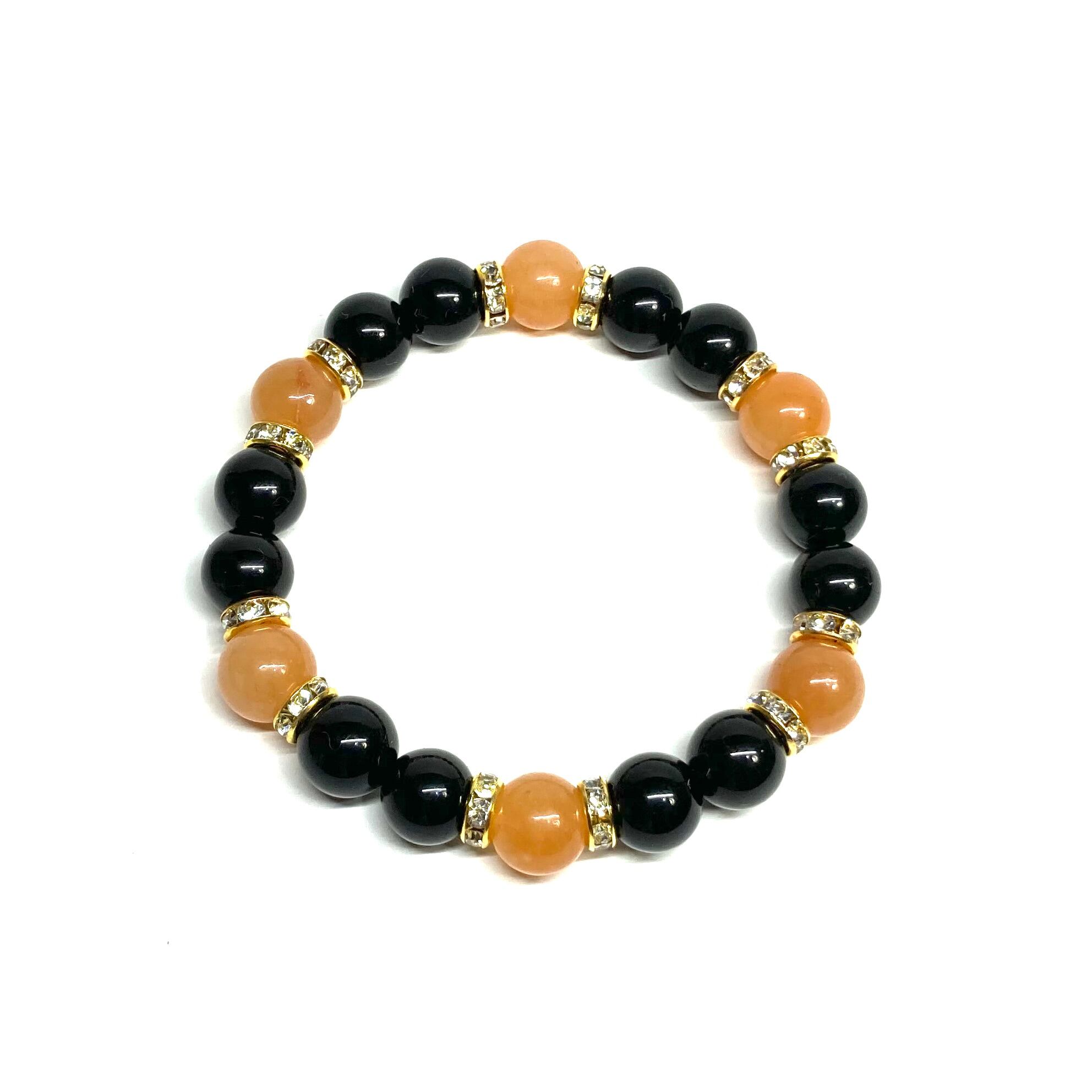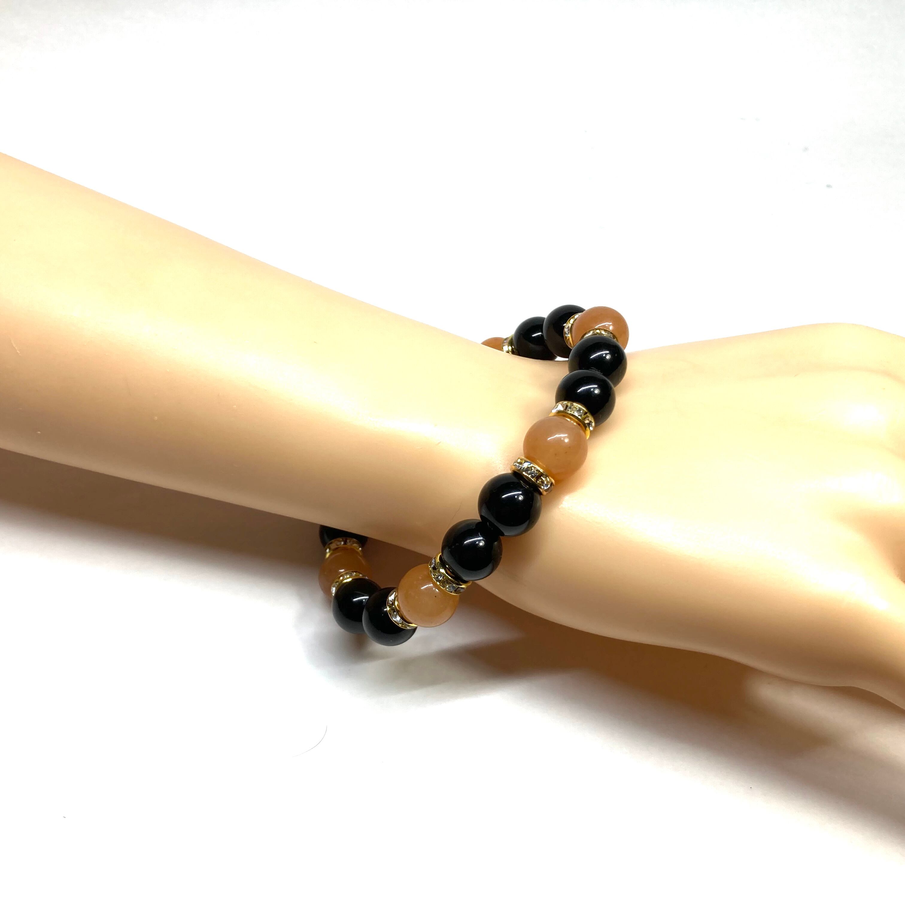 こちらは、モリオンとレッドアベンチュリンを組み合わせたパワーストーンブレスレットです。間にはロンデルを挟み高級感あるデザインに仕上げております。石大きさは腕にも馴染みやすいように10mm玉で内径約18cm(伸可能)です。 数に限りがございますので気になる方はお早めにどうぞ。