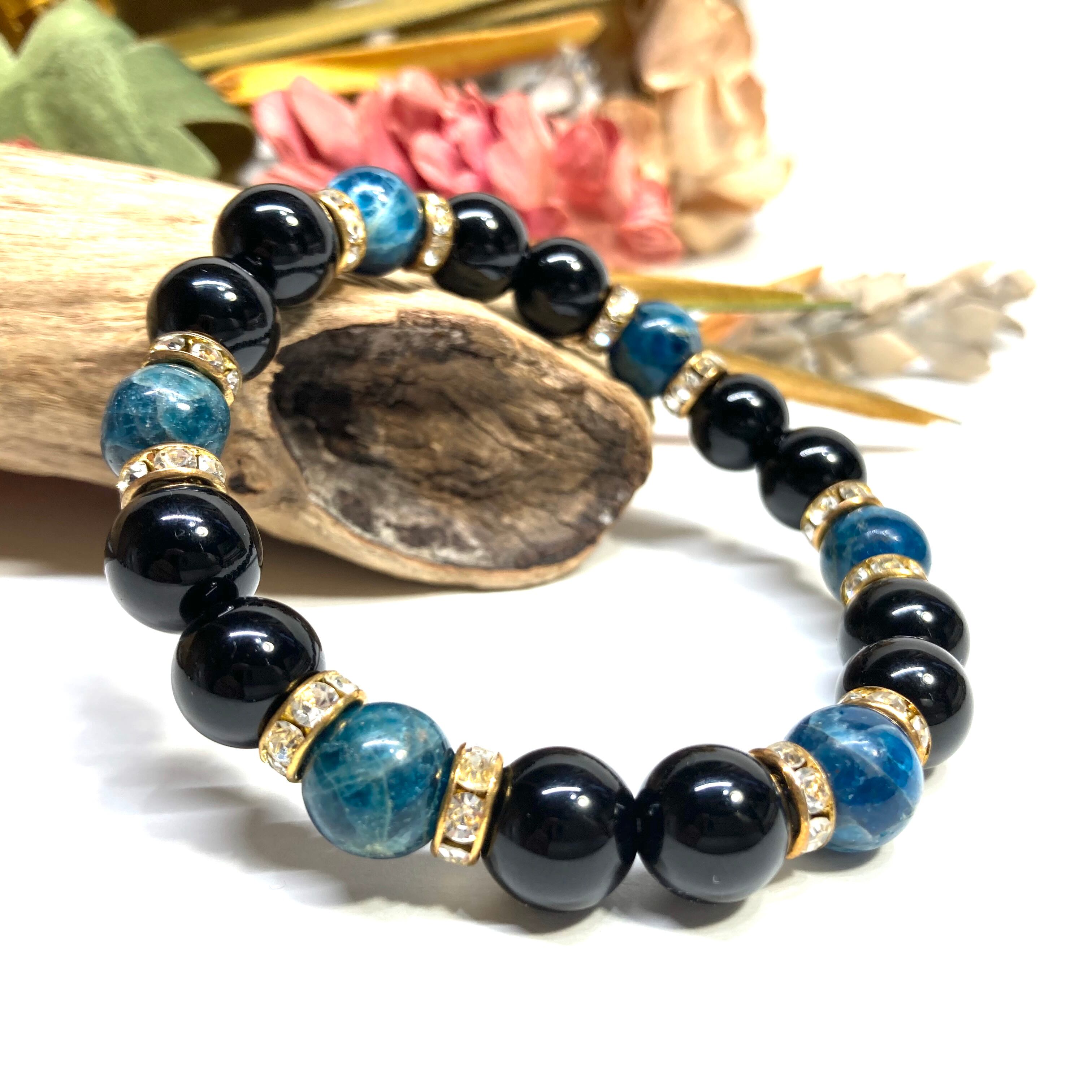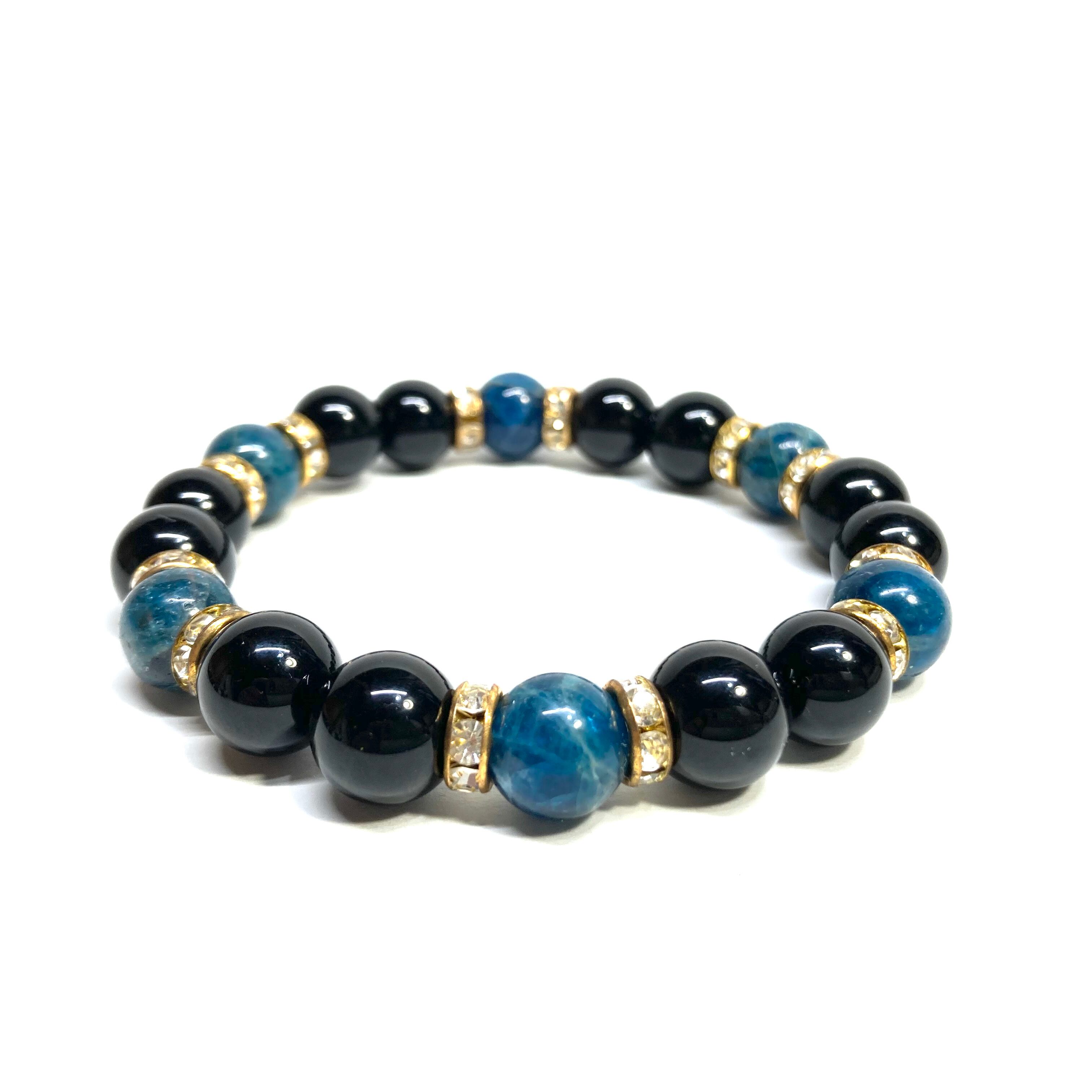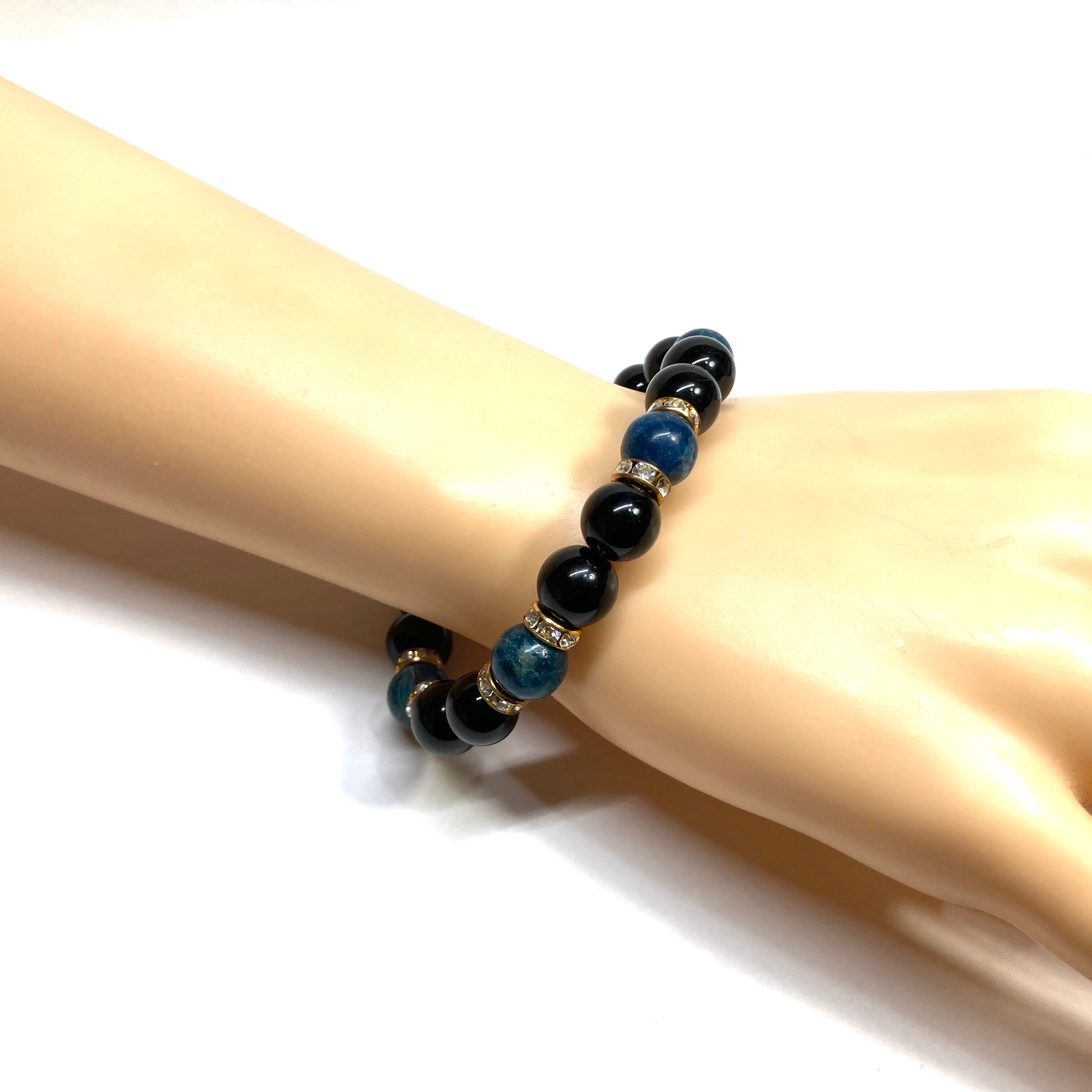 こちらは、モリオンとアパタイトを組み合わせたパワーストーンブレスレットです。間にはロンデルを挟み高級感あるデザインに仕上げております。石大きさは腕にも馴染みやすいように10mm玉で内径約18cm(伸可能)です。 数に限りがございますので気になる方はお早めにどうぞ。