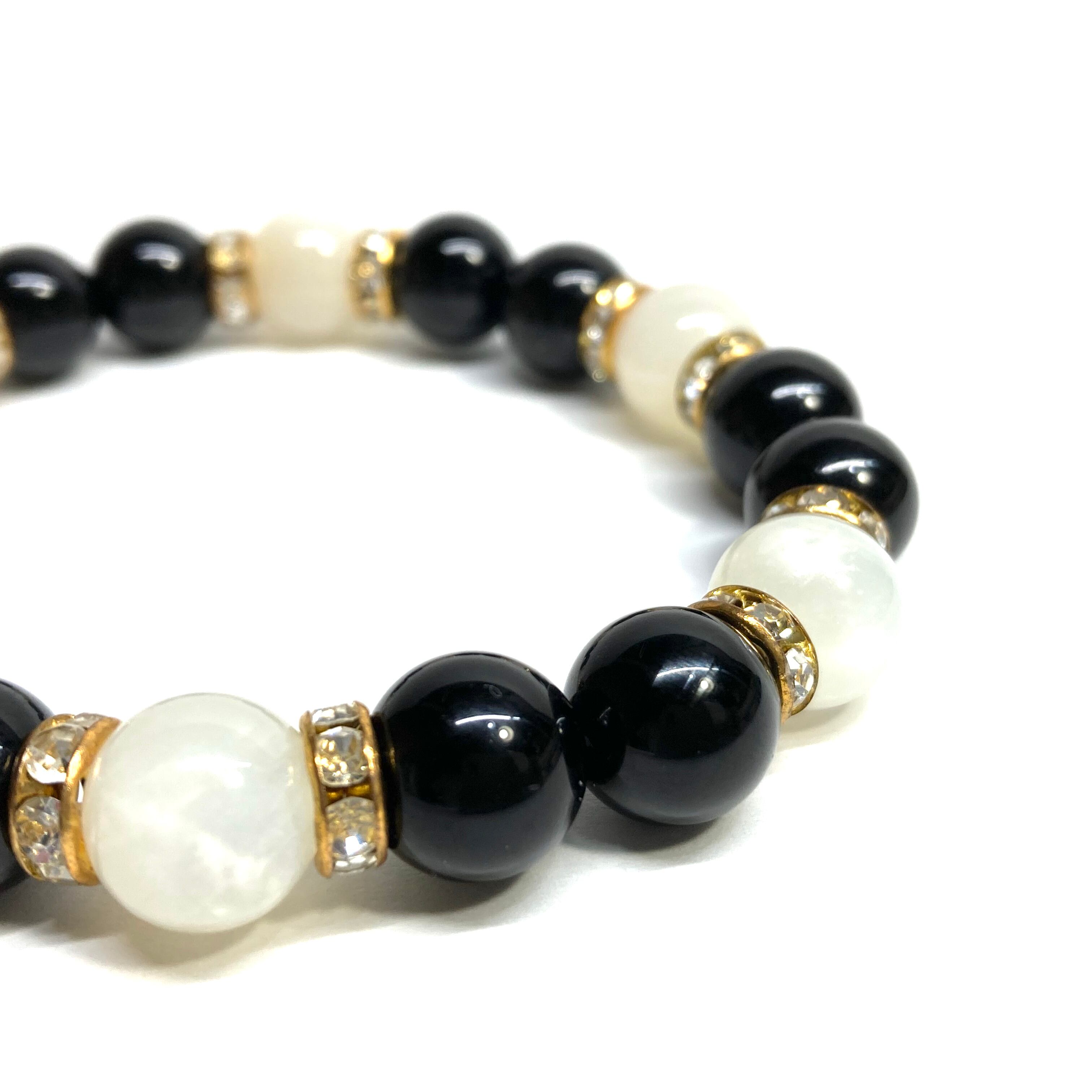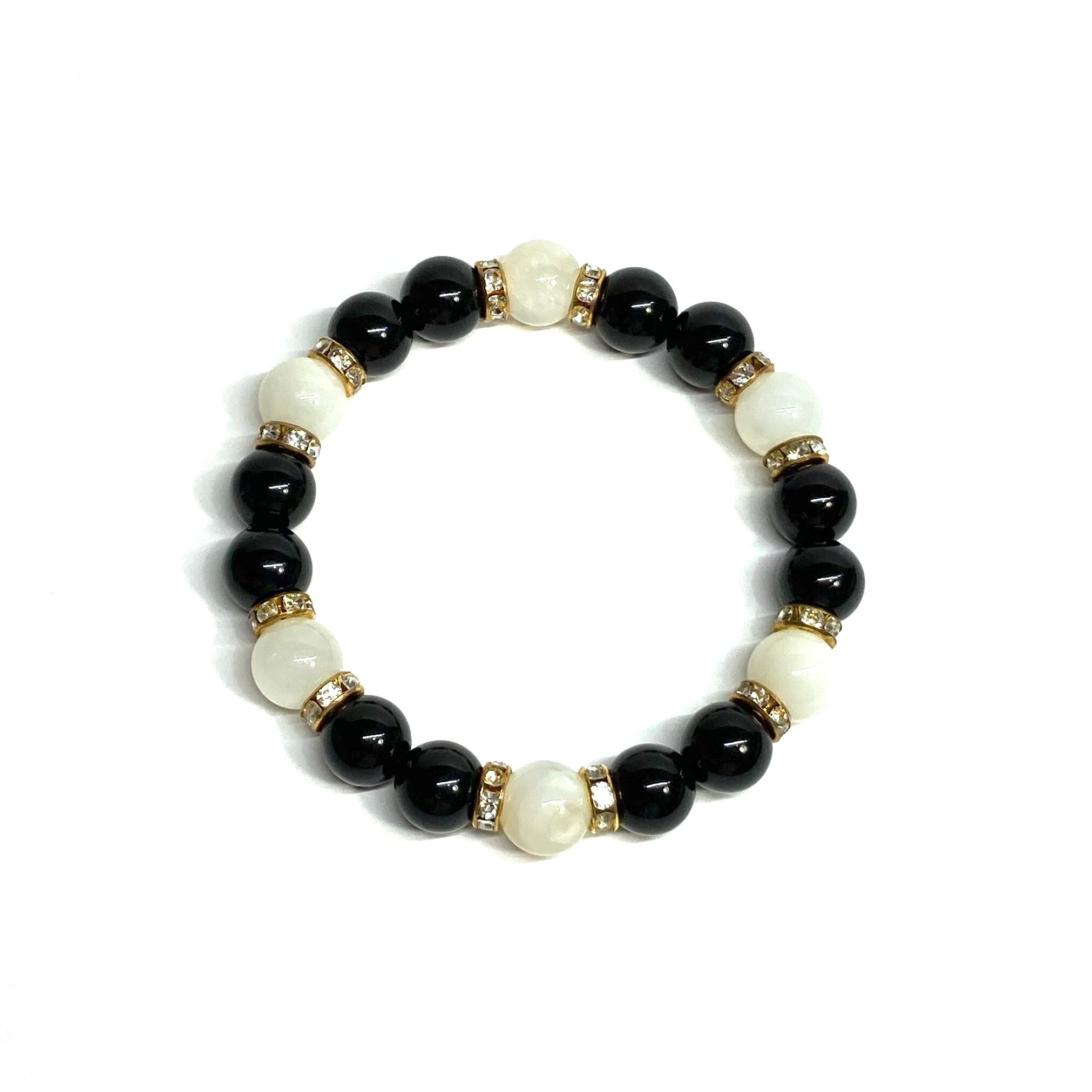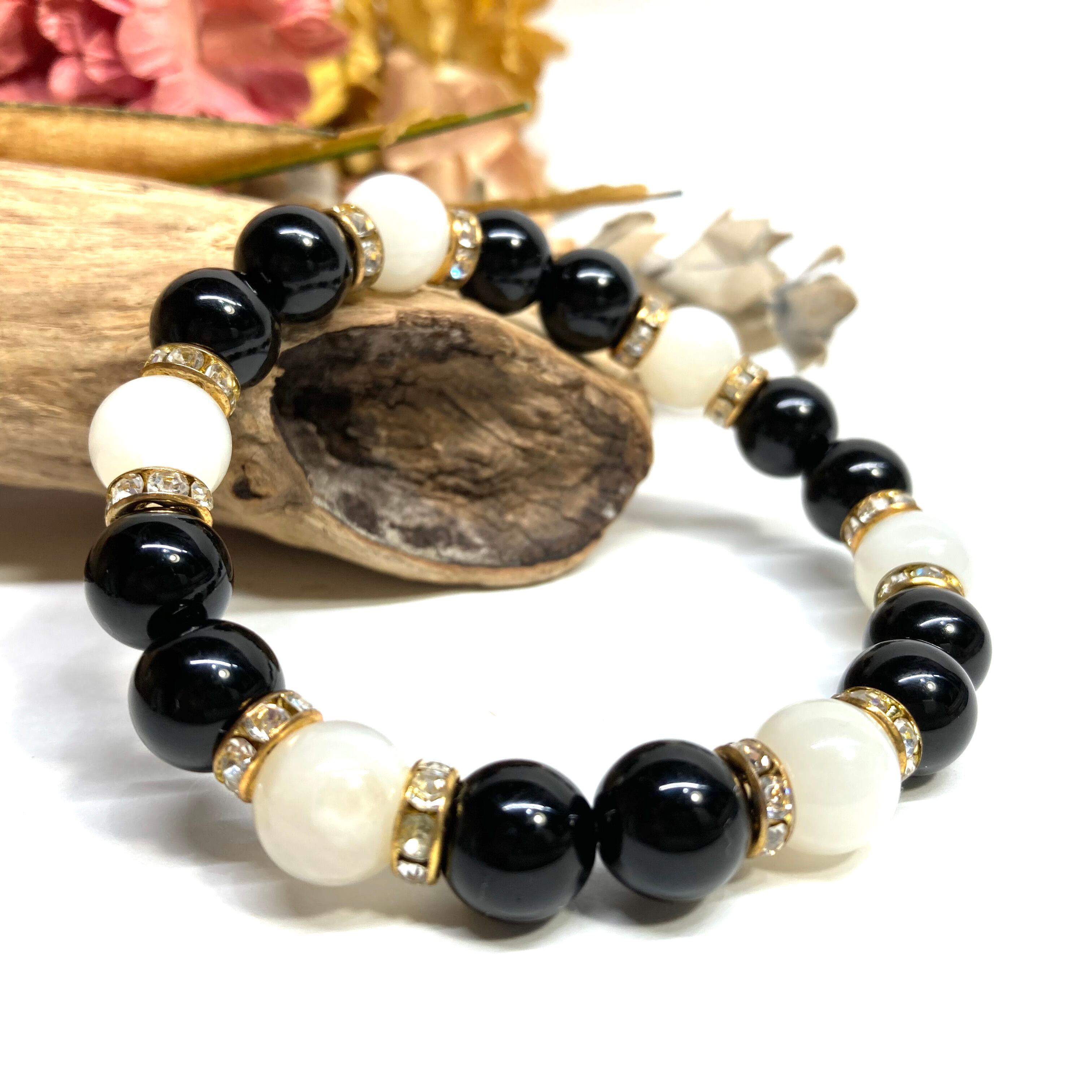 こちらは、モリオンとムーンストーンを組み合わせたパワーストーンブレスレットです。間にはロンデルを挟み高級感あるデザインに仕上げております。石大きさは腕にも馴染みやすいように10mm玉で内径約18cm(伸可能)です。 数に限りがございますので気になる方はお早めにどうぞ。