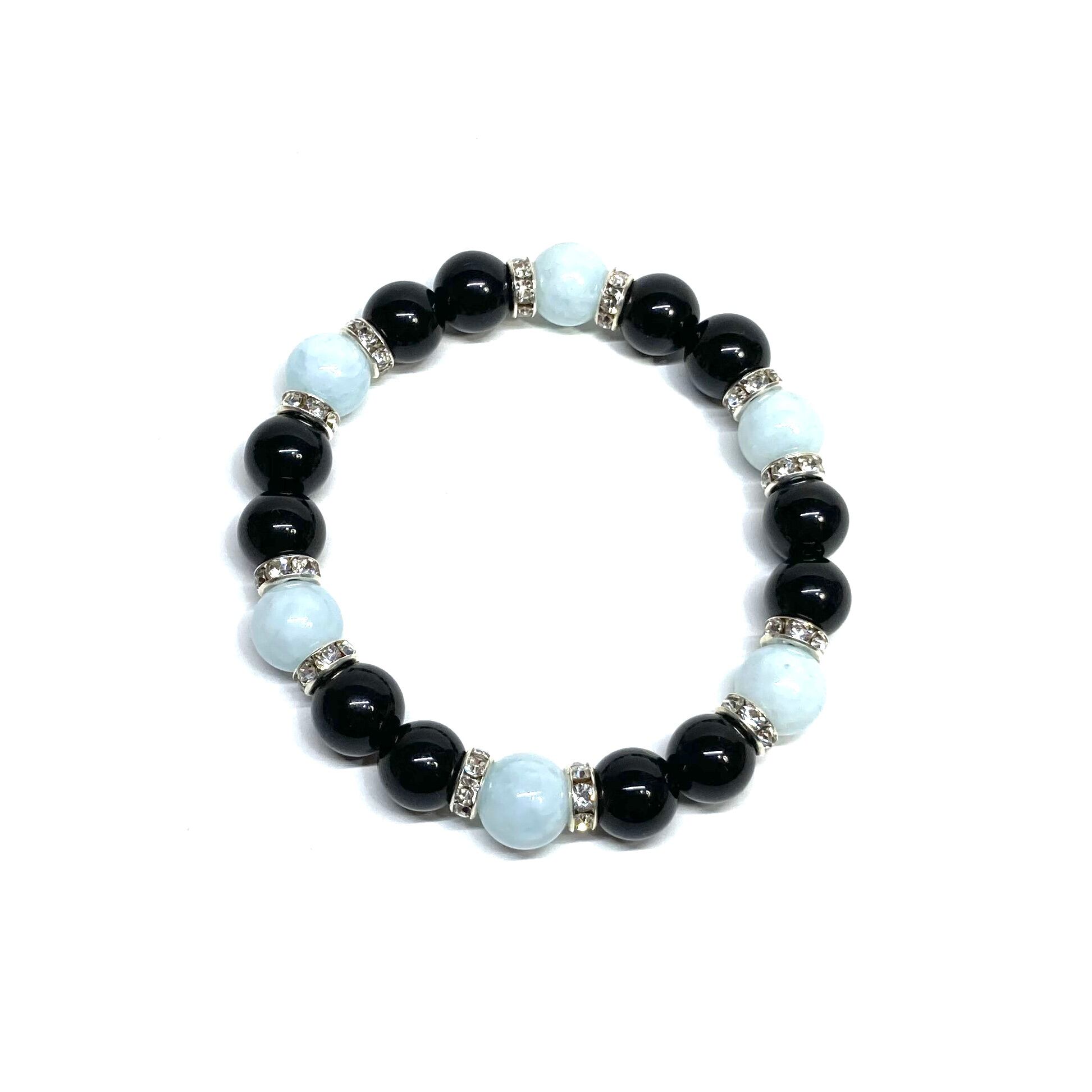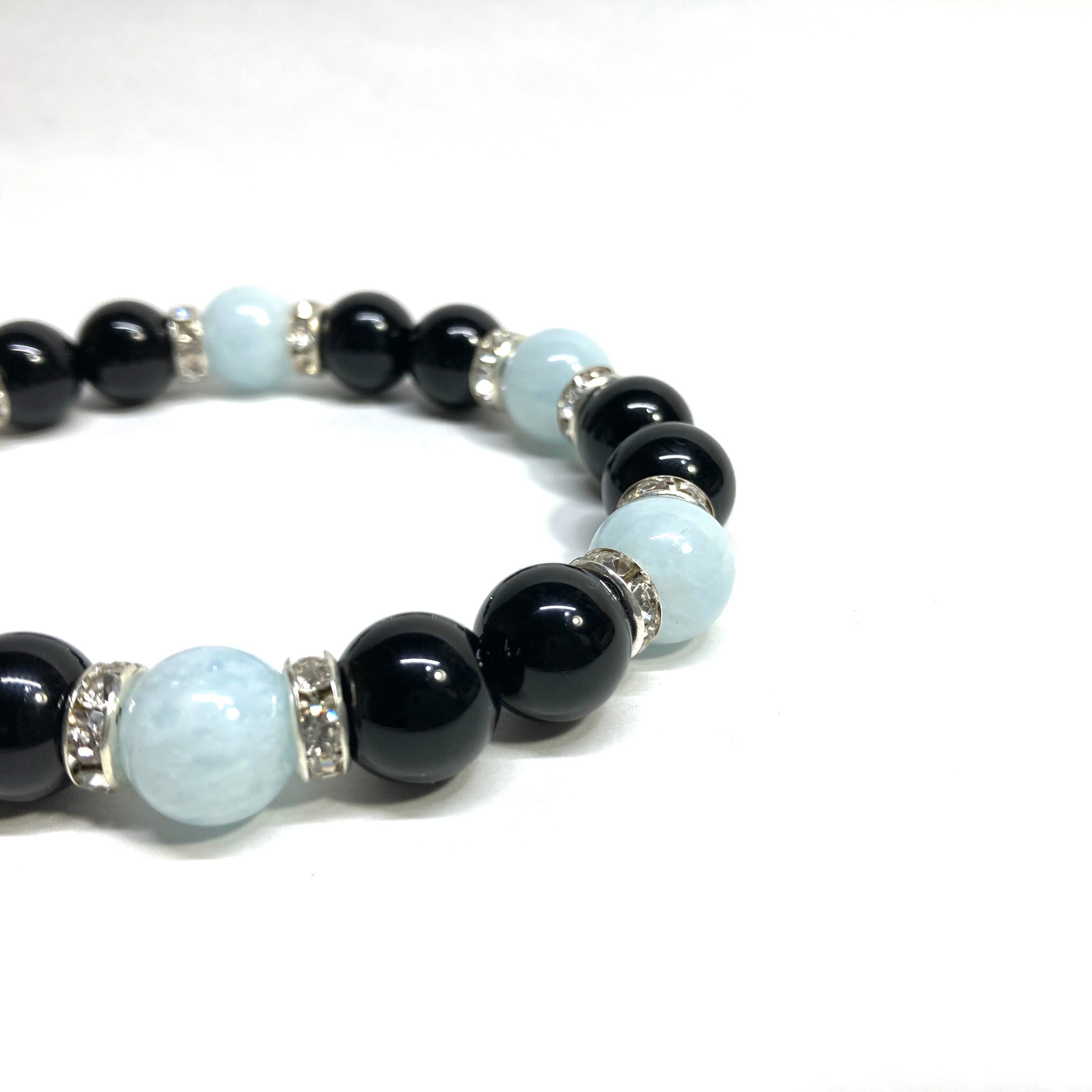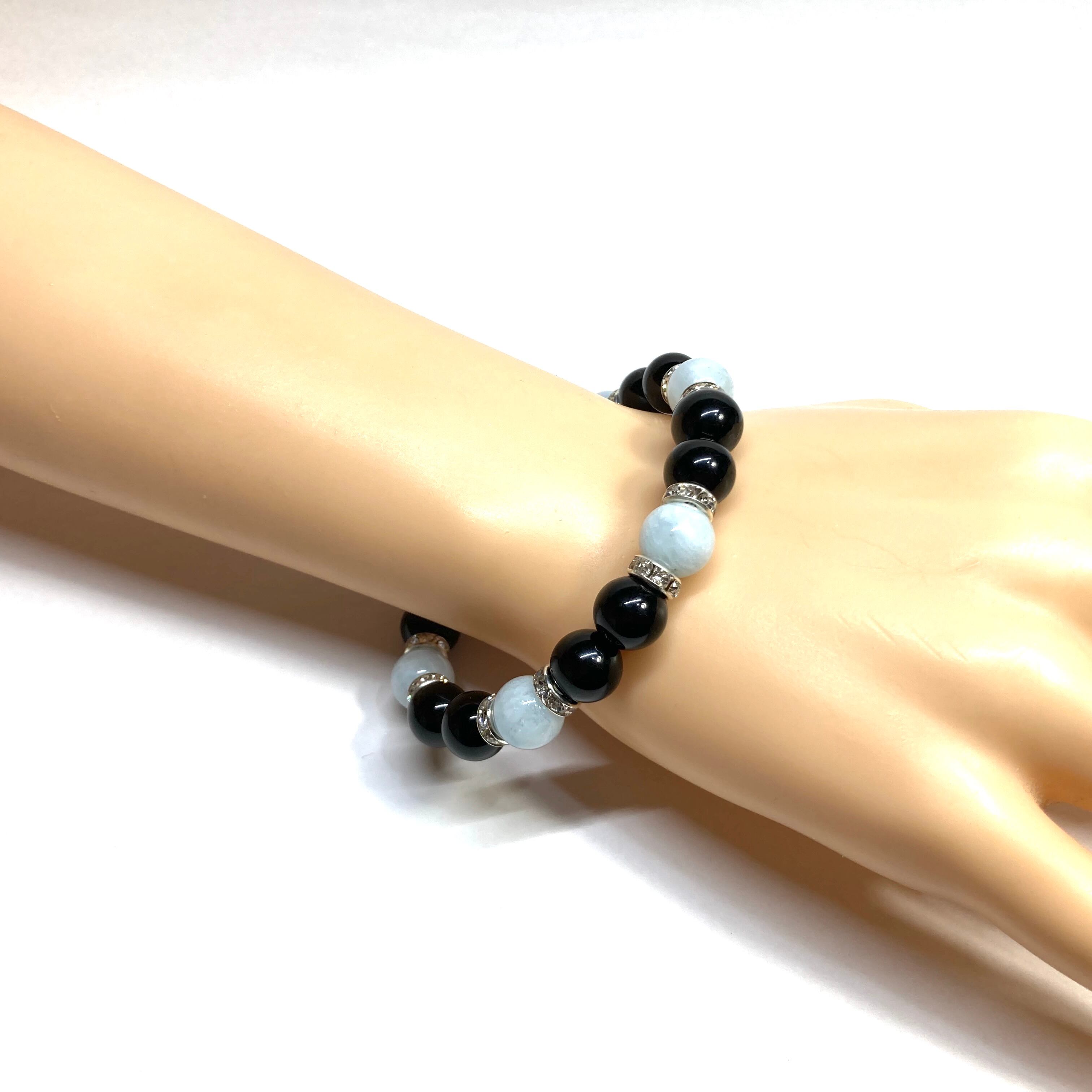 こちらは、モリオンとアクアマリンを組み合わせたパワーストーンブレスレットです。間にはロンデルを挟み高級感あるデザインに仕上げております。石大きさは腕にも馴染みやすいように10mm玉で内径約18cm(伸可能)です。 数に限りがございますので気になる方はお早めにどうぞ。