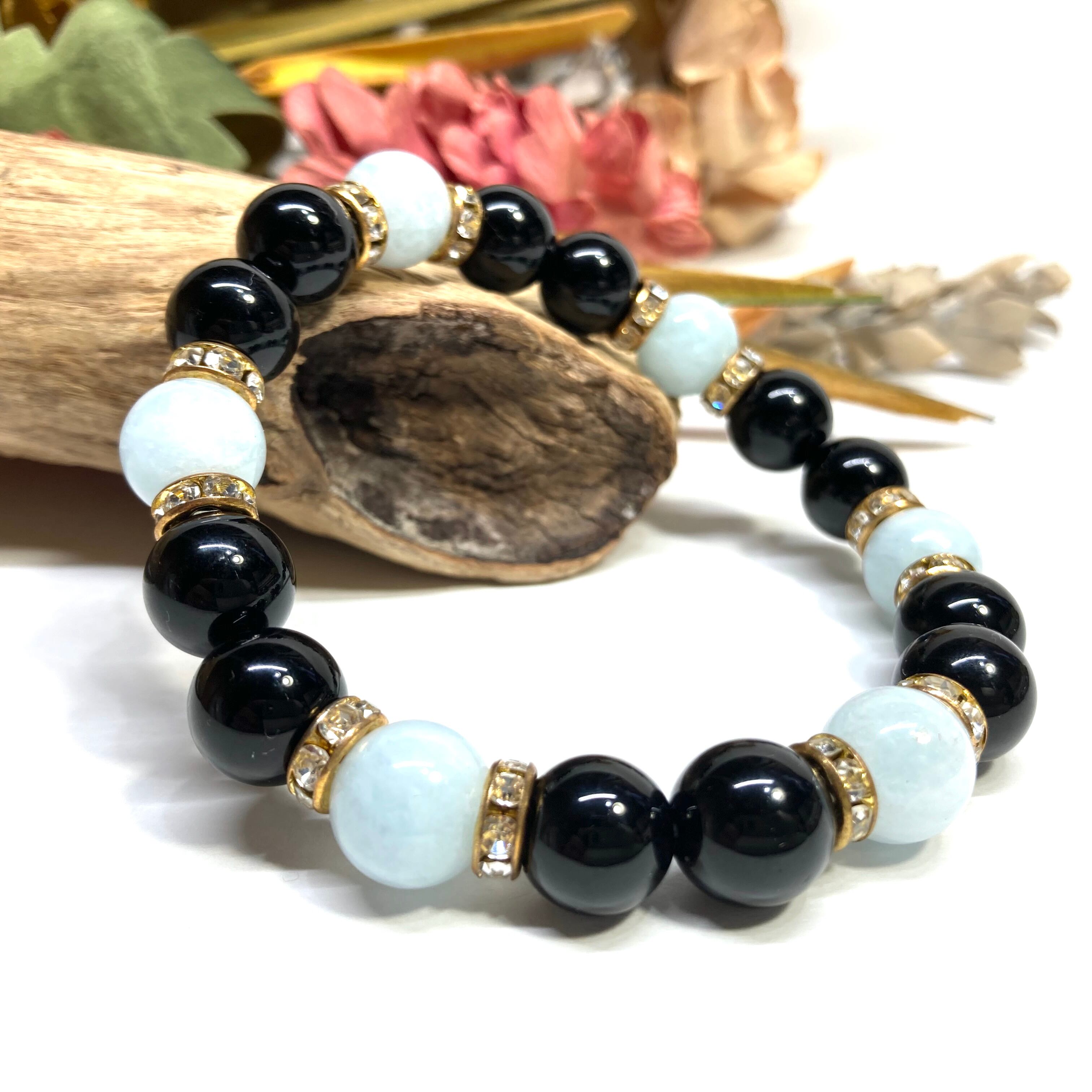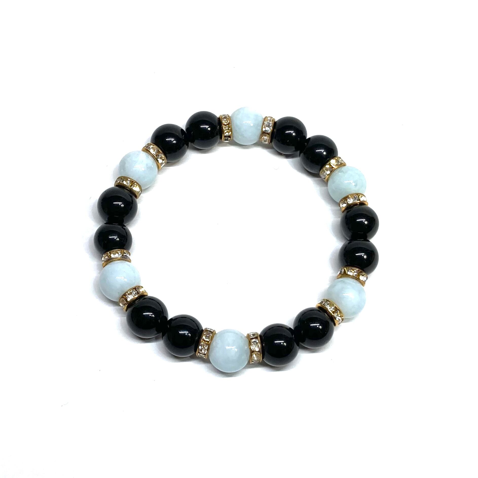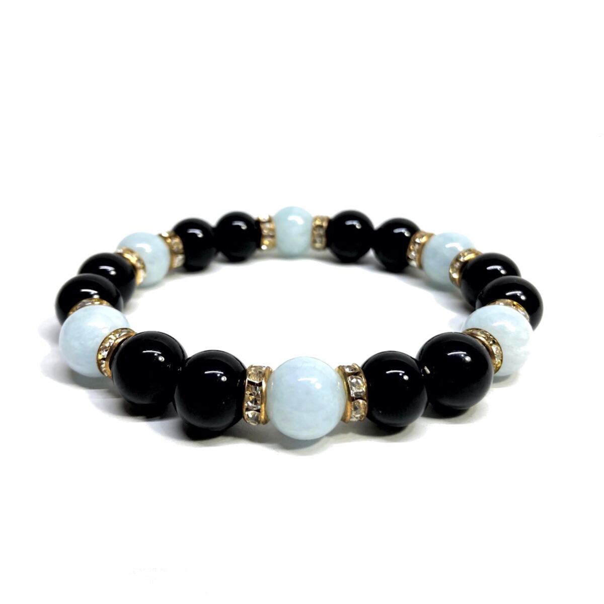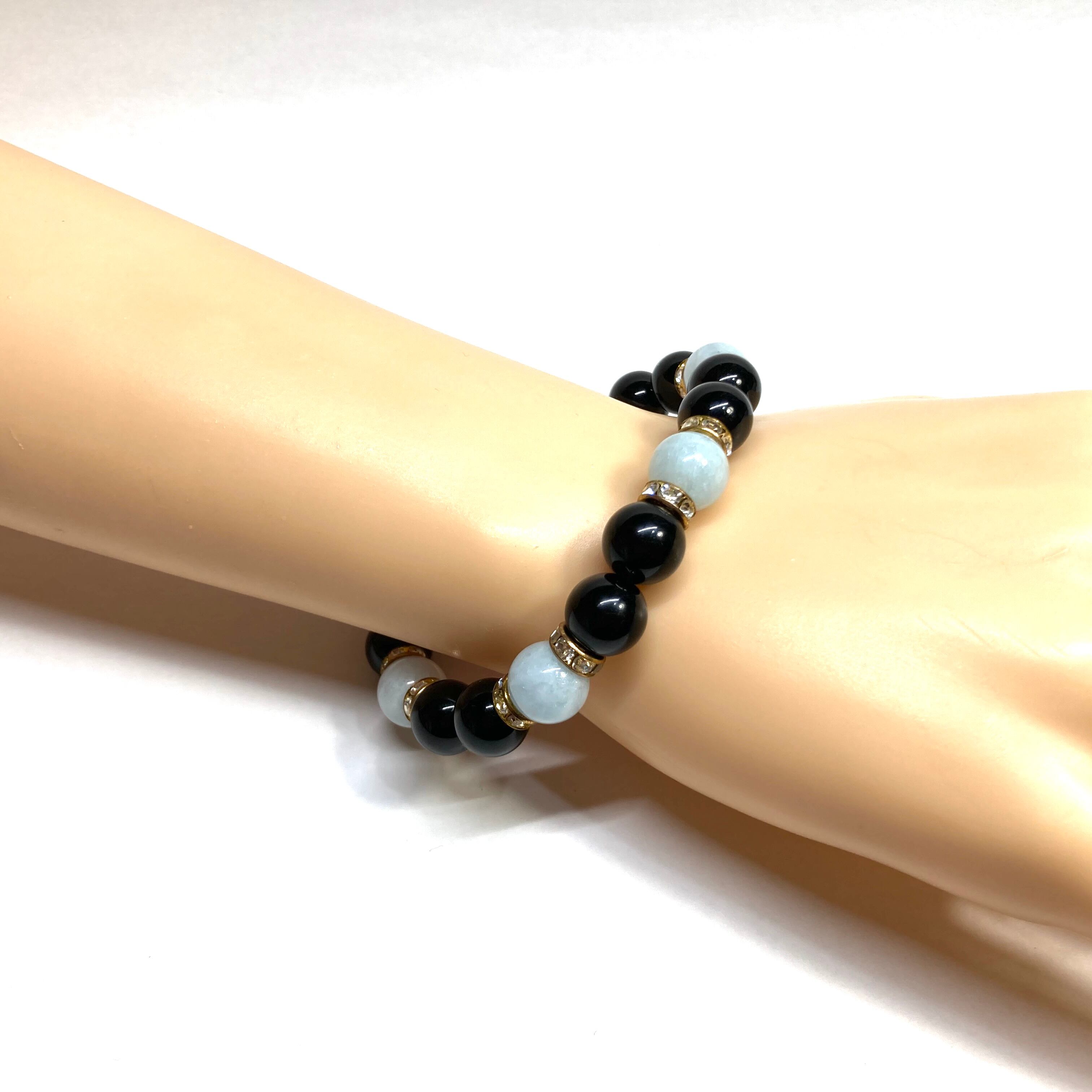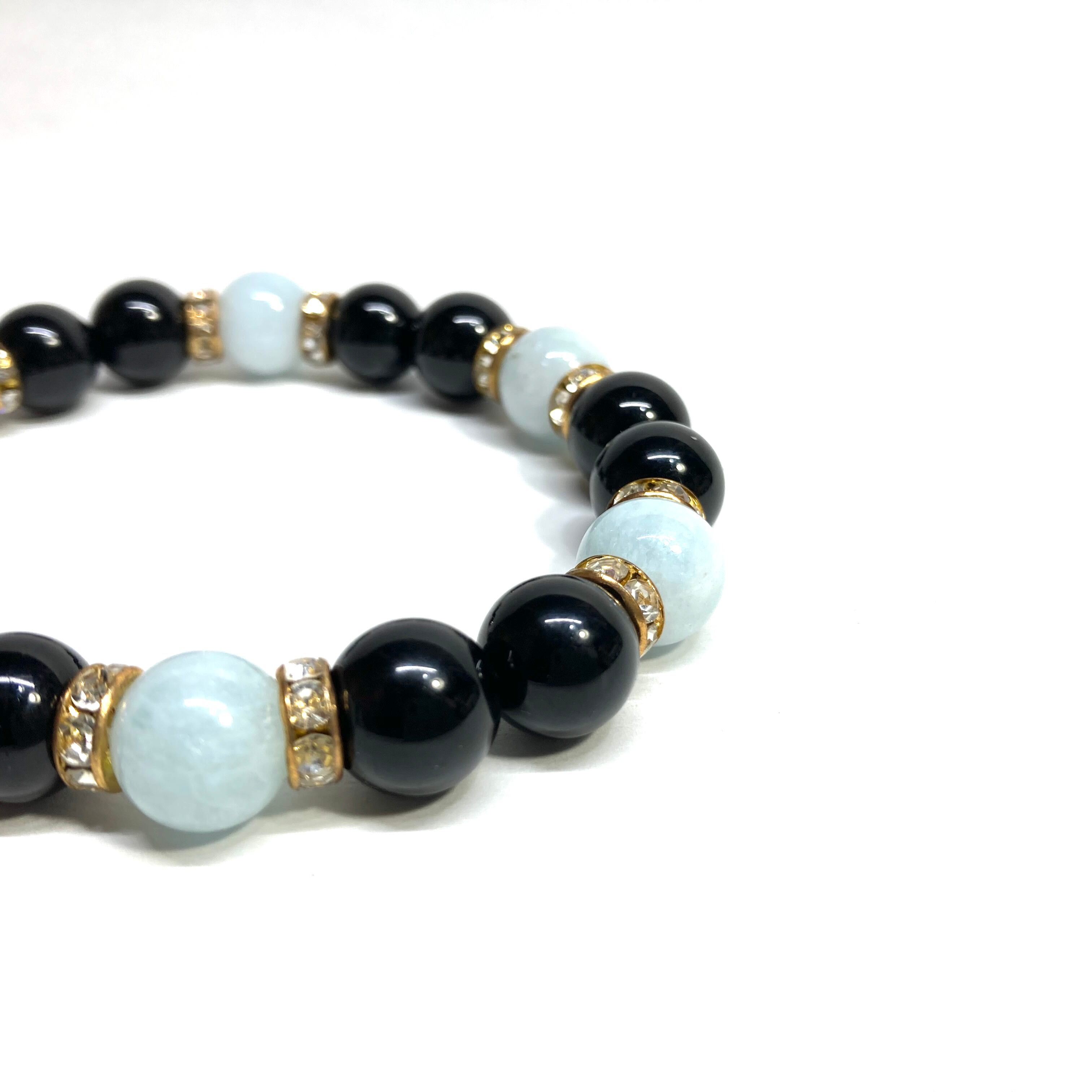 こちらは、モリオンとアクアマリンを組み合わせたパワーストーンブレスレットです。間にはロンデルを挟み高級感あるデザインに仕上げております。石大きさは腕にも馴染みやすいように10mm玉で内径約18cm(伸可能)です。 数に限りがございますので気になる方はお早めにどうぞ。