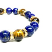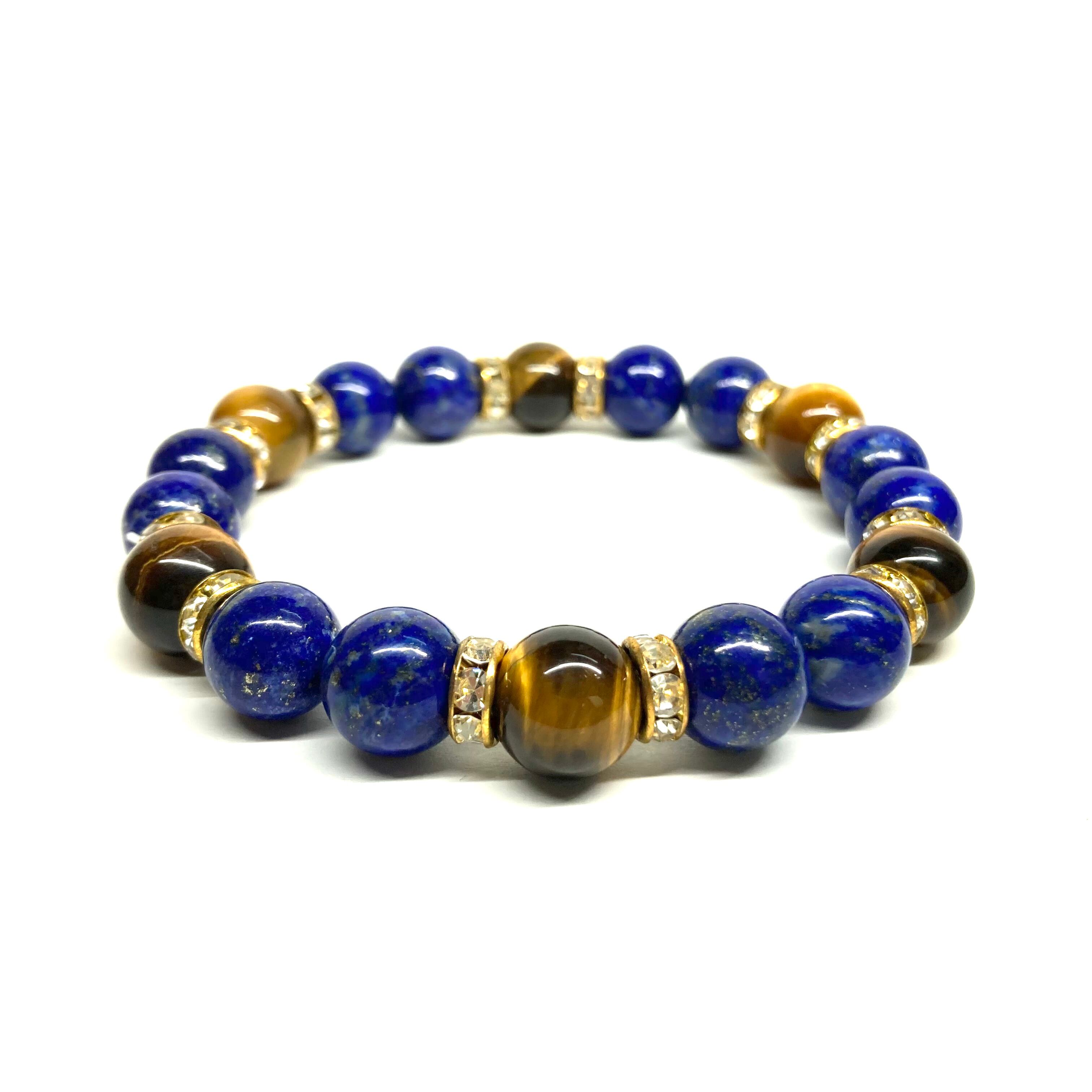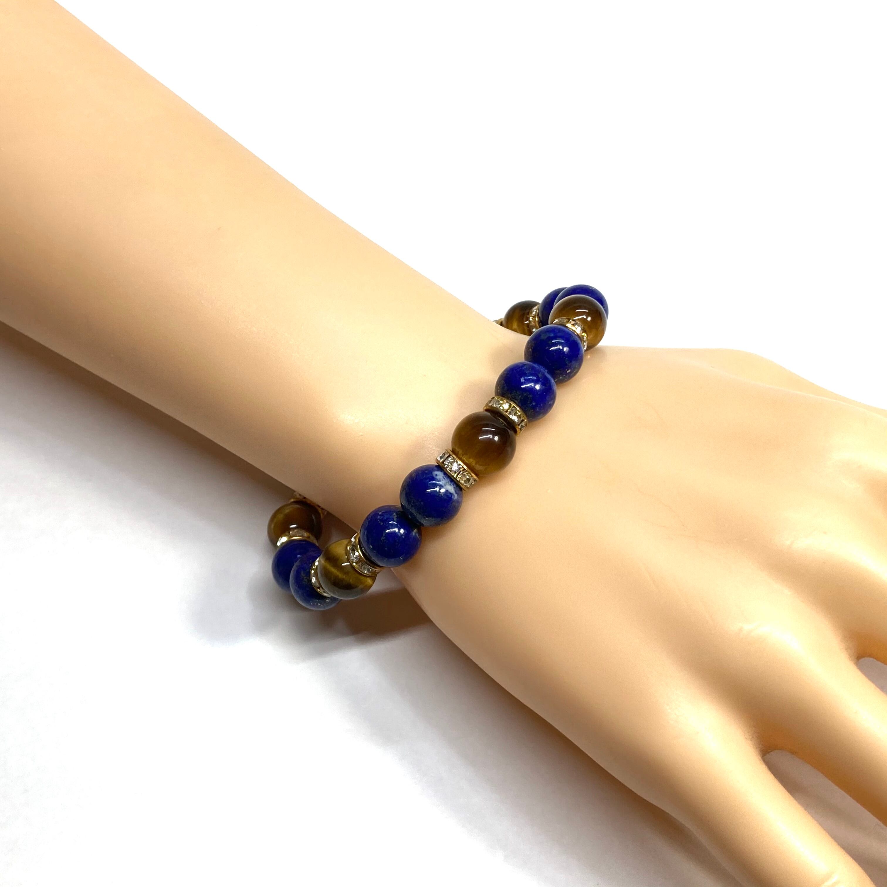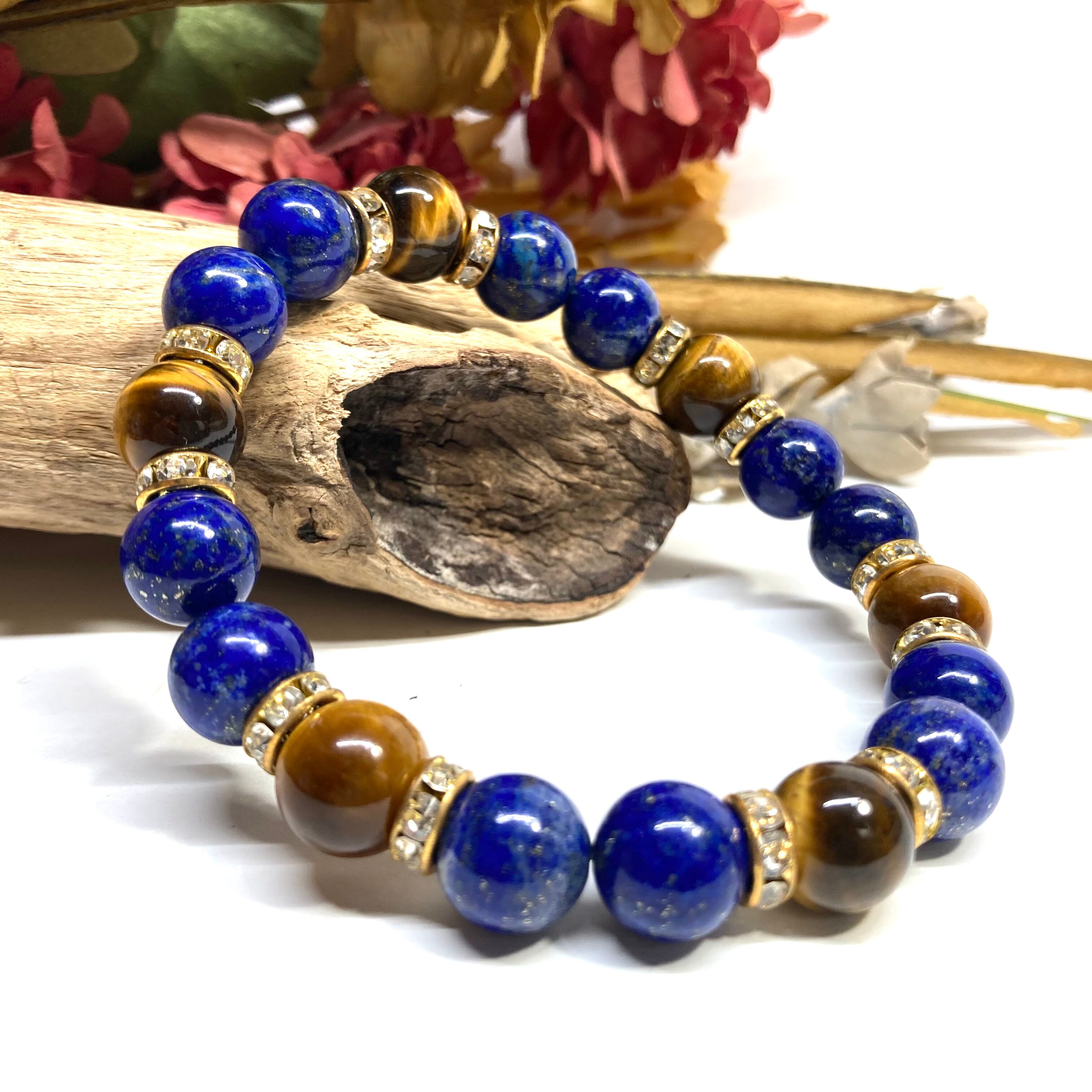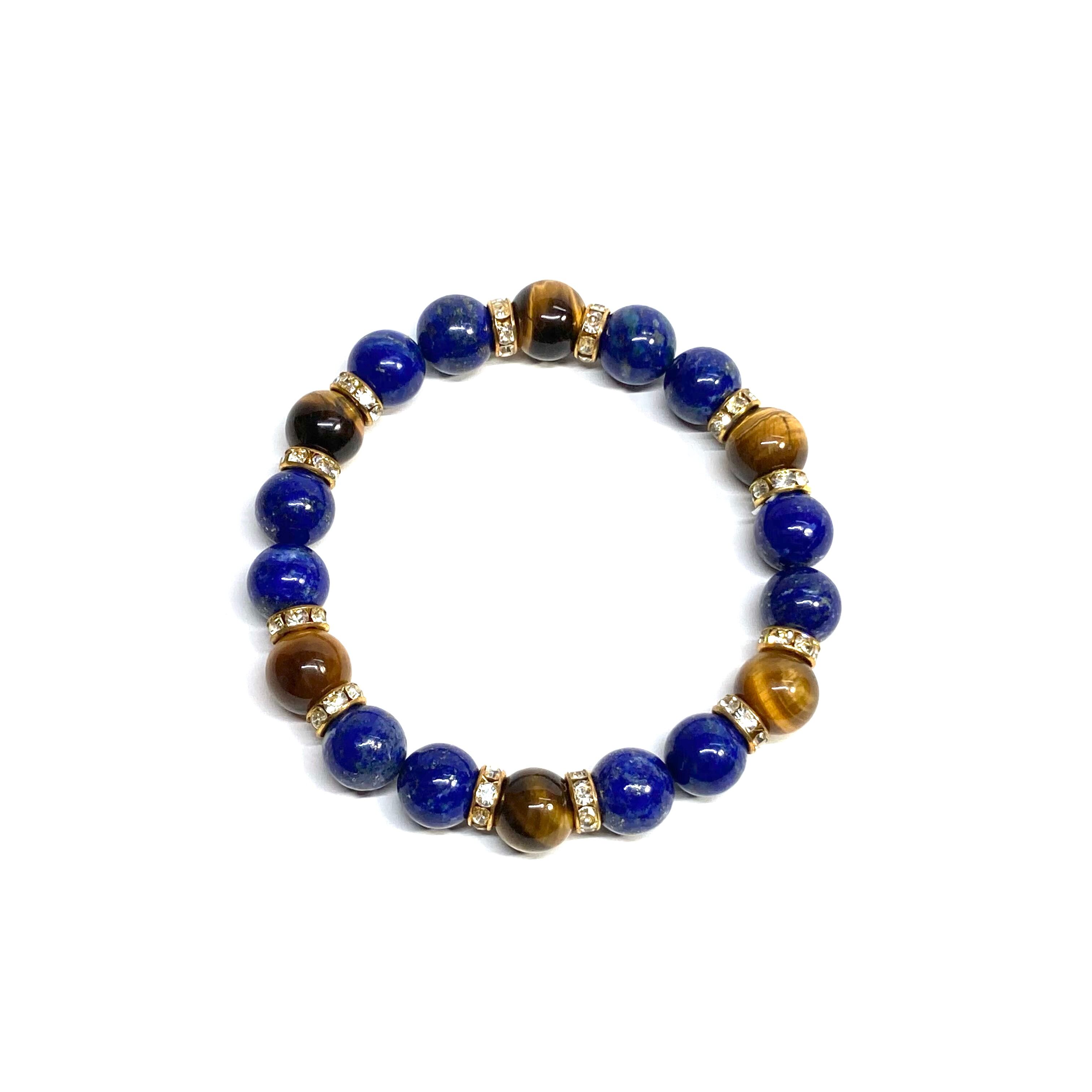 こちらは、ラピスラズリとタイガーアイを組み合わせたパワーストーンブレスレットです。間にはロンデルを挟み高級感あるデザインに仕上げております。石大きさは腕にも馴染みやすいように10mm玉で内周 約18cm(伸可能)です。 数に限りがございますので気になる方はお早めにどうぞ。