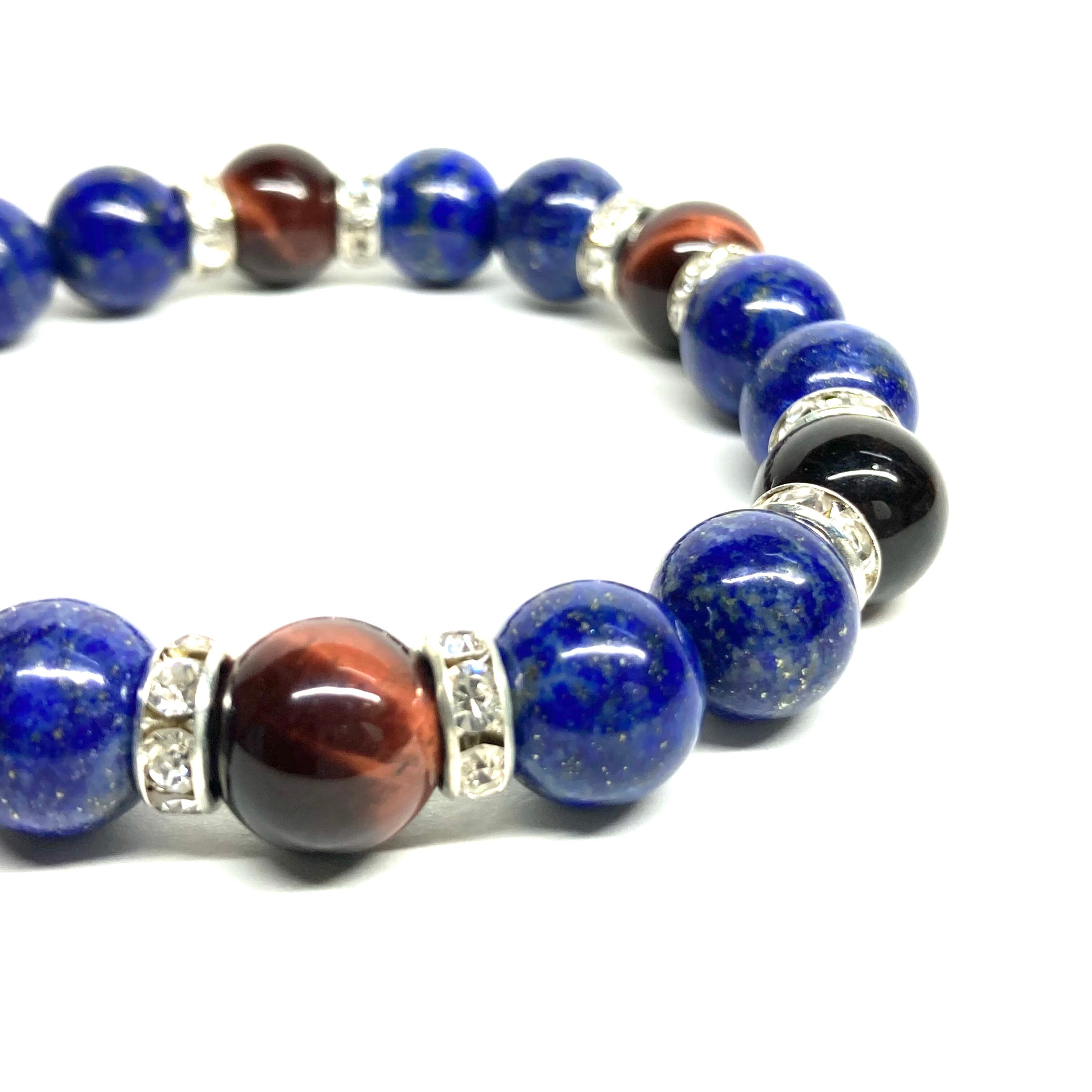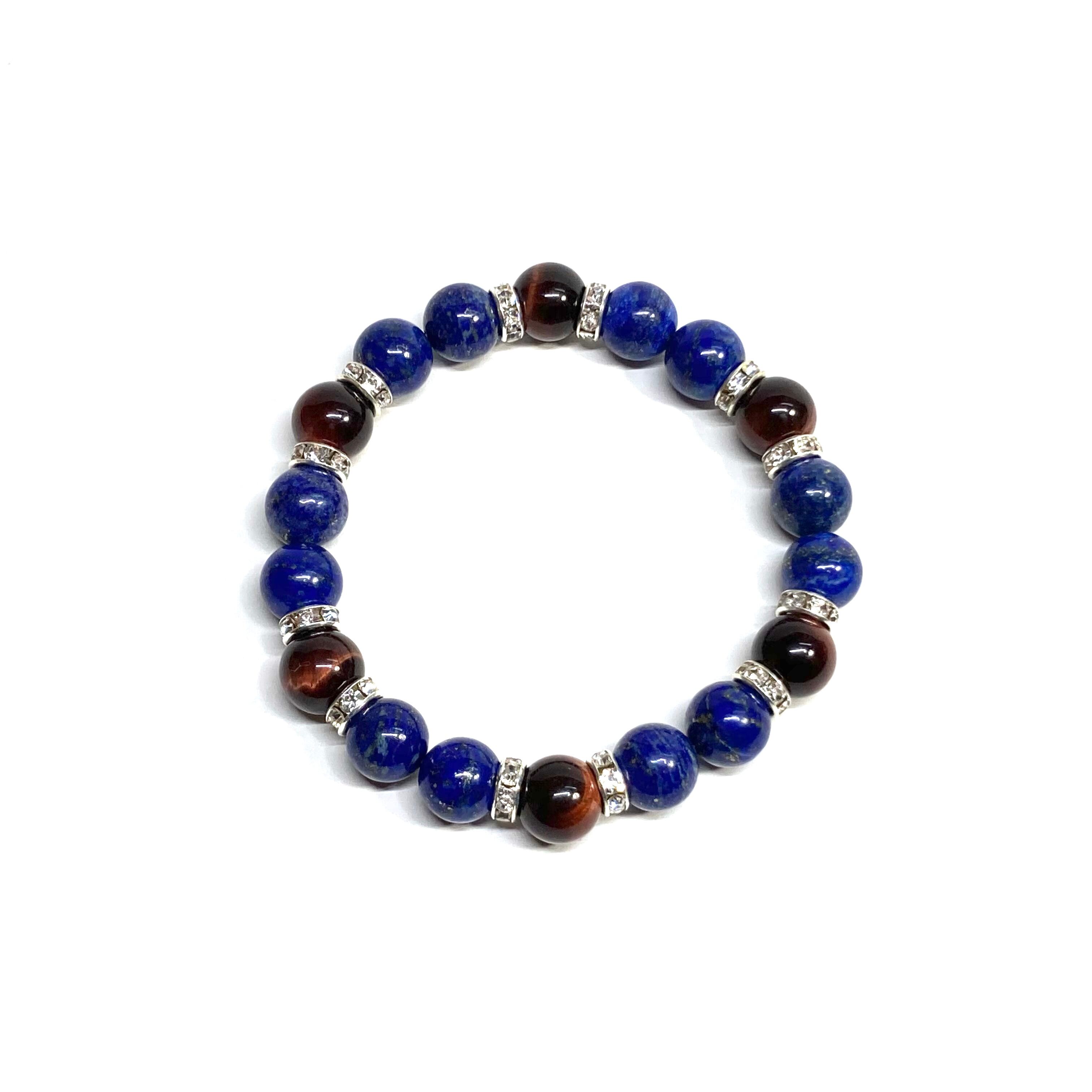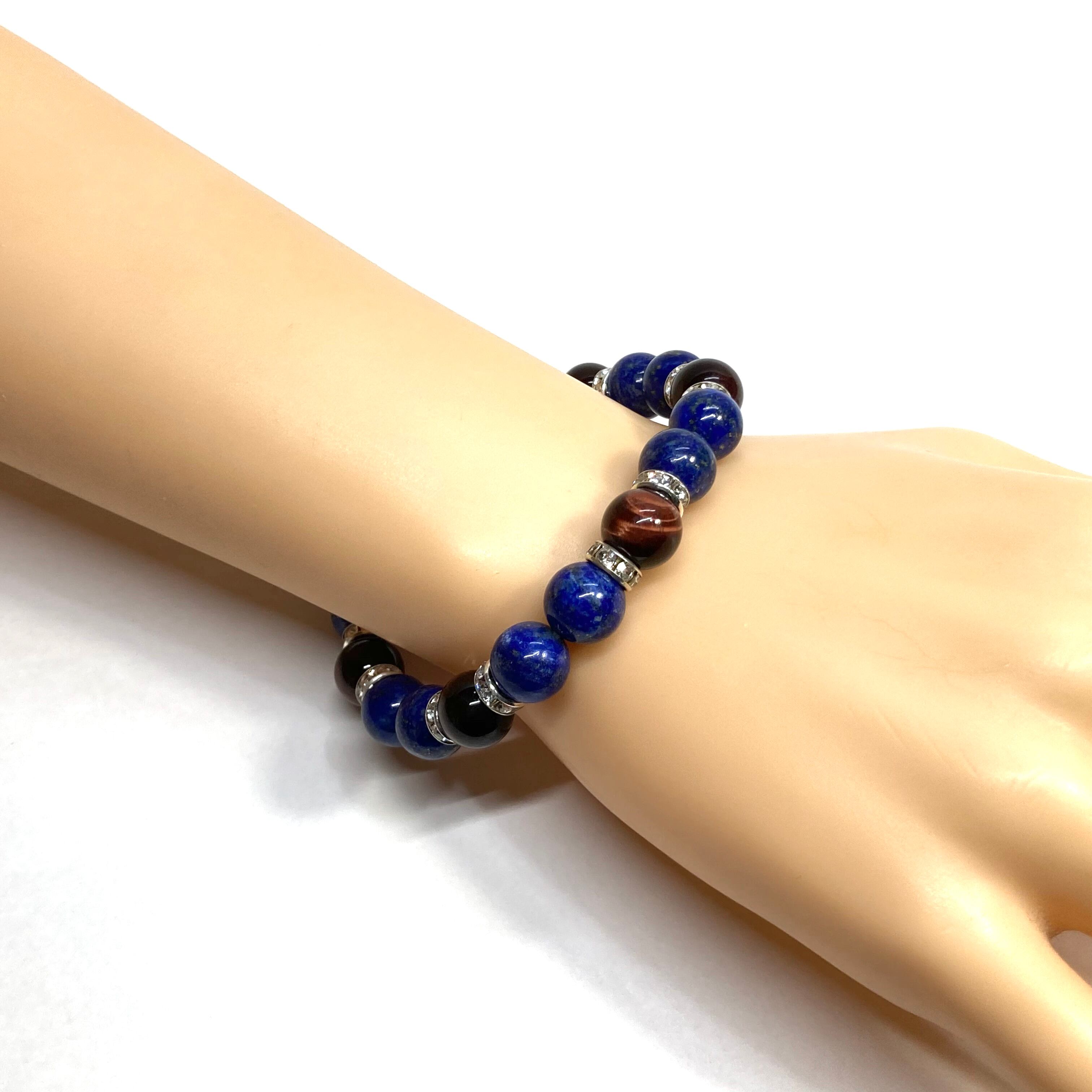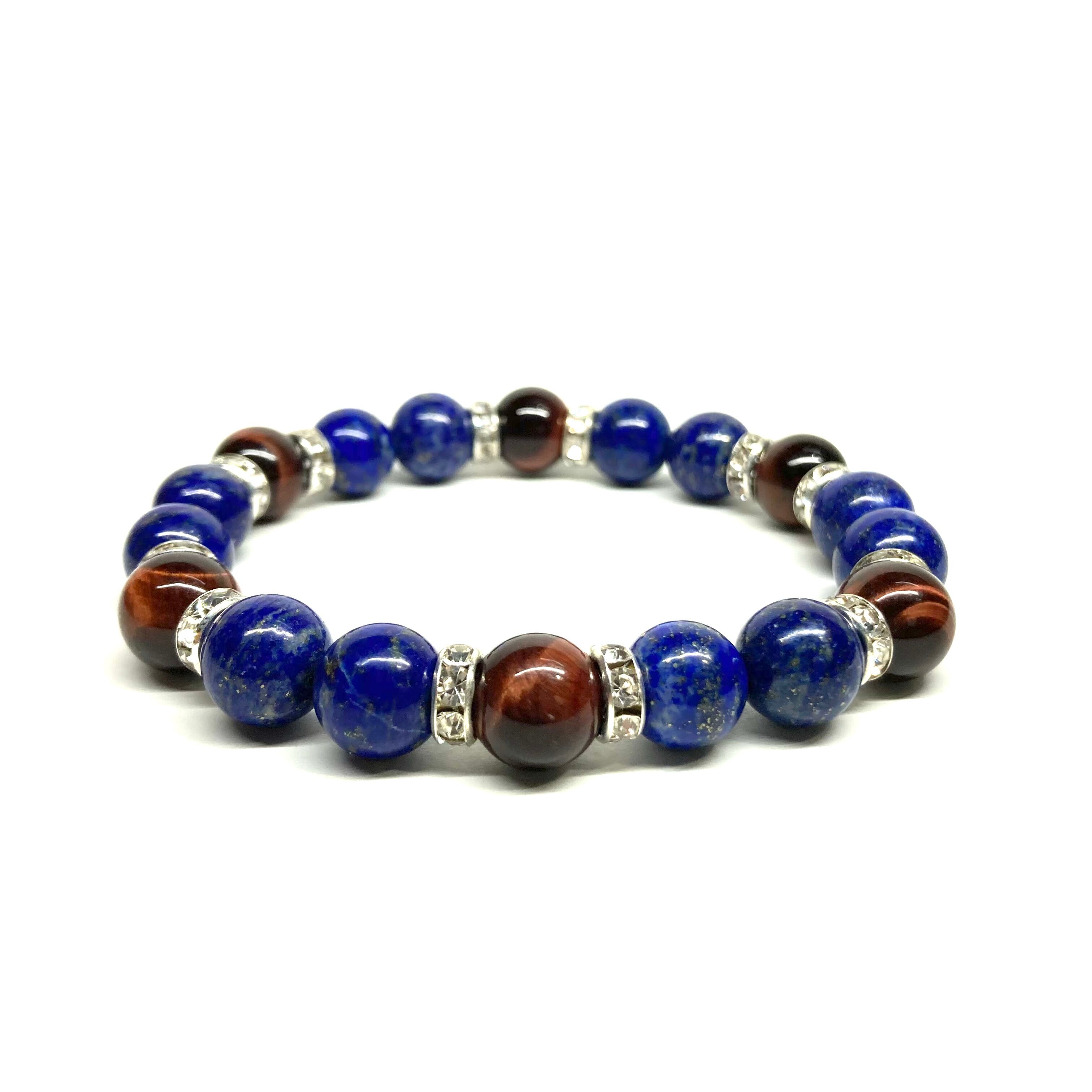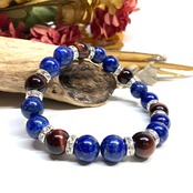 こちらは、ラピスラズリとレッドタイガーアイを組み合わせたパワーストーンブレスレットです。間にはロンデルを挟み高級感あるデザインに仕上げております。石大きさは腕にも馴染みやすいように10mm玉で内径約18cm(伸可能)です。 数に限りがございますので気になる方はお早めにどうぞ。
