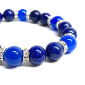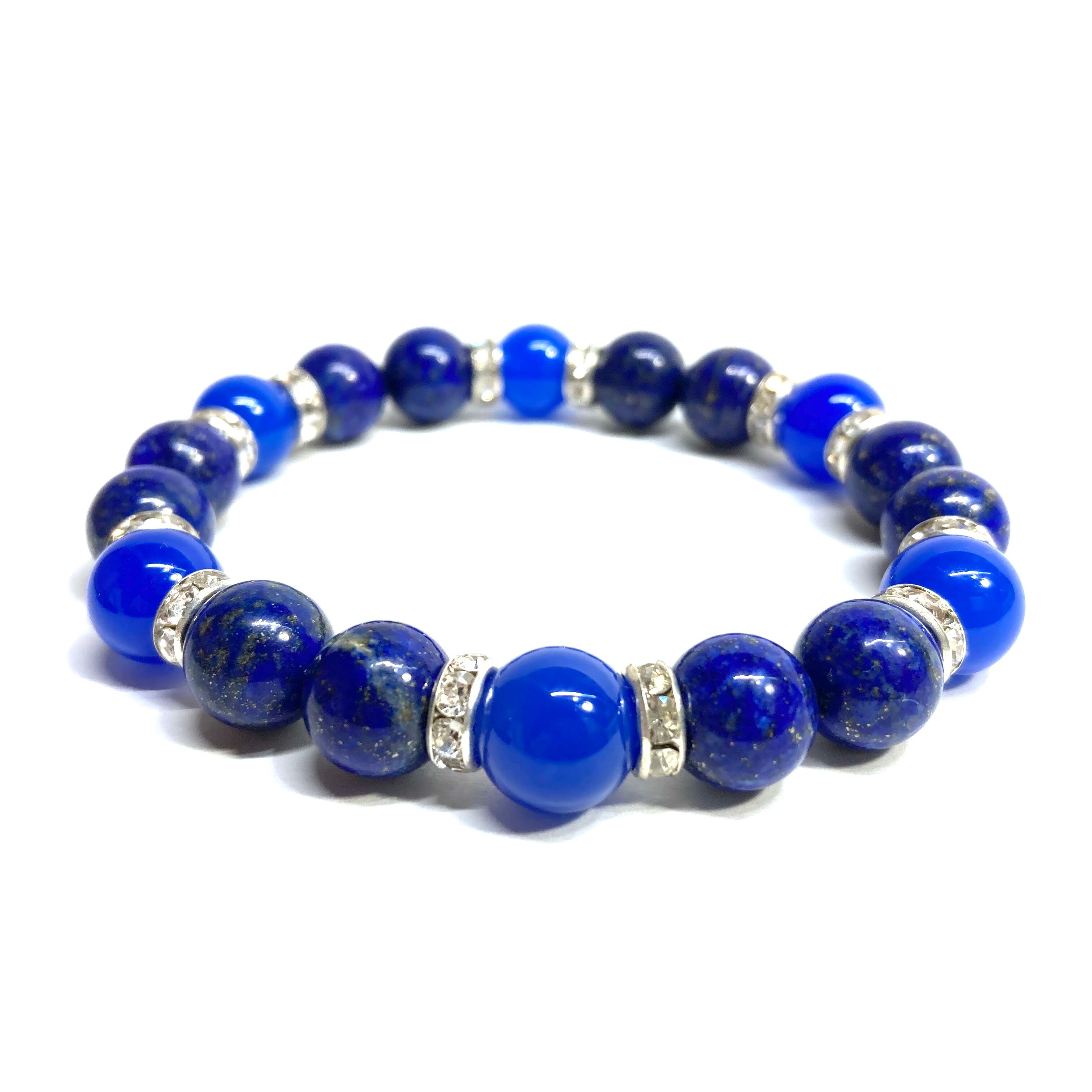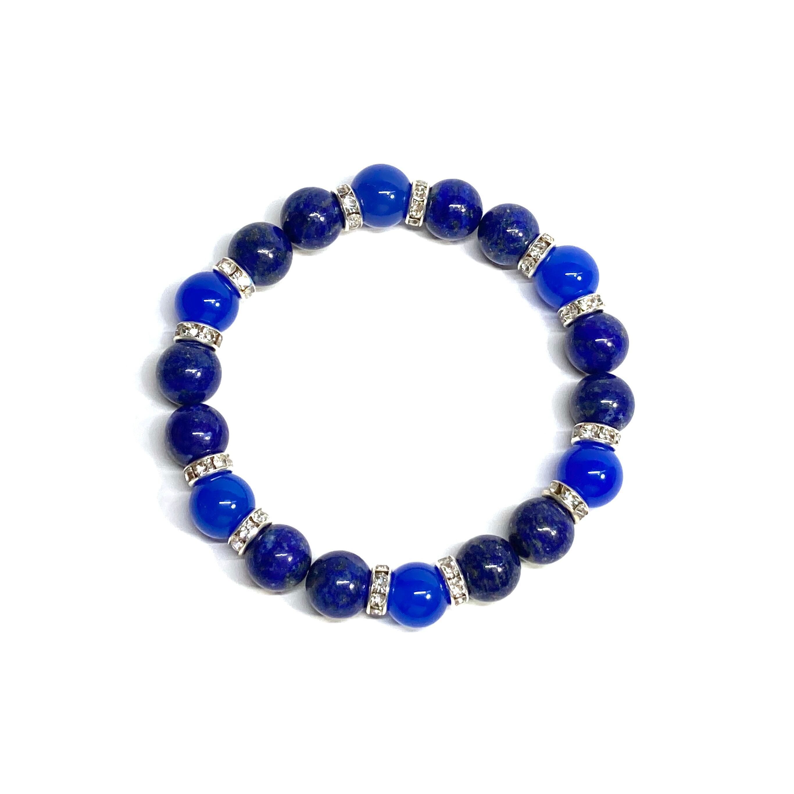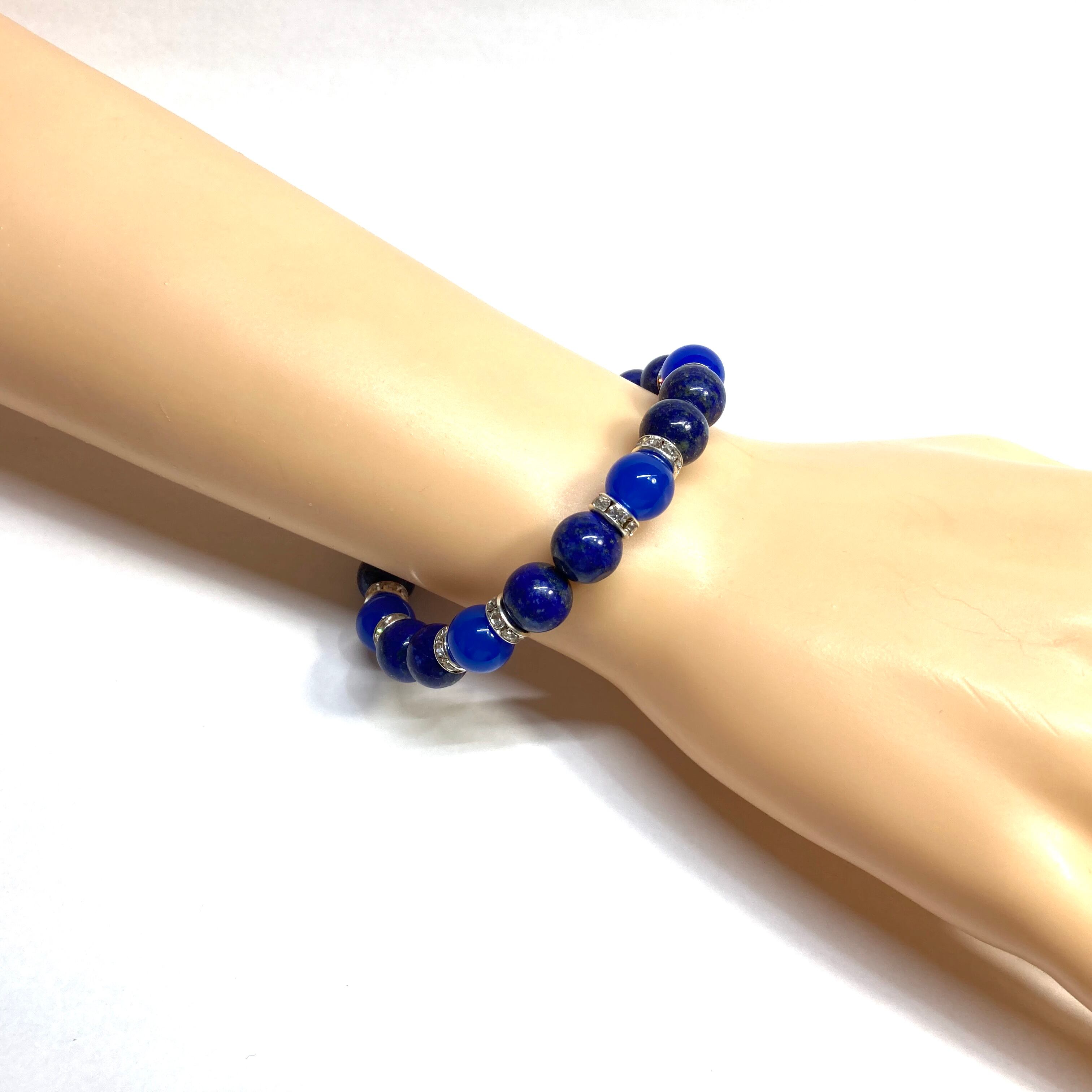 こちらは、ラピスラズリと青瑪瑙を組み合わせたパワーストーンブレスレットです。間にはロンデルを挟み高級感あるデザインに仕上げております。石大きさは腕にも馴染みやすいように10mm玉で内径約18cm(伸可能)です。 数に限りがございますので気になる方はお早めにどうぞ。