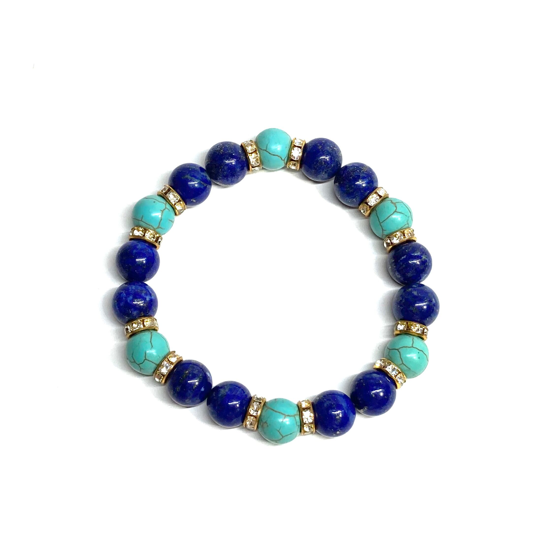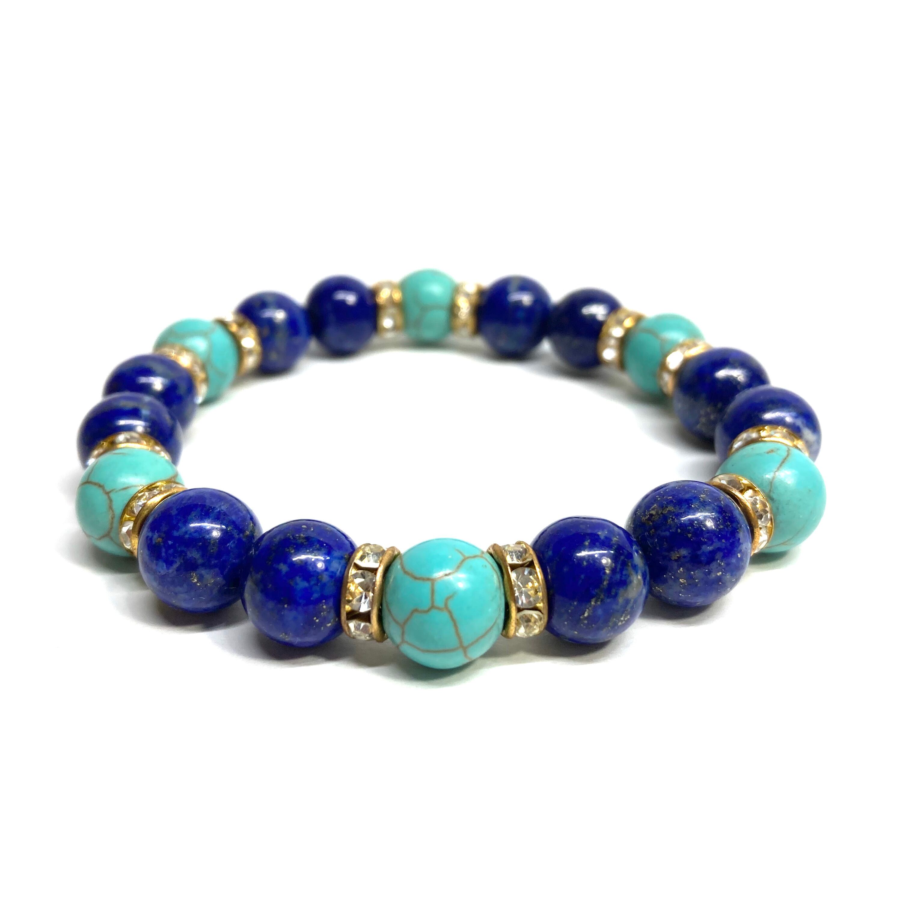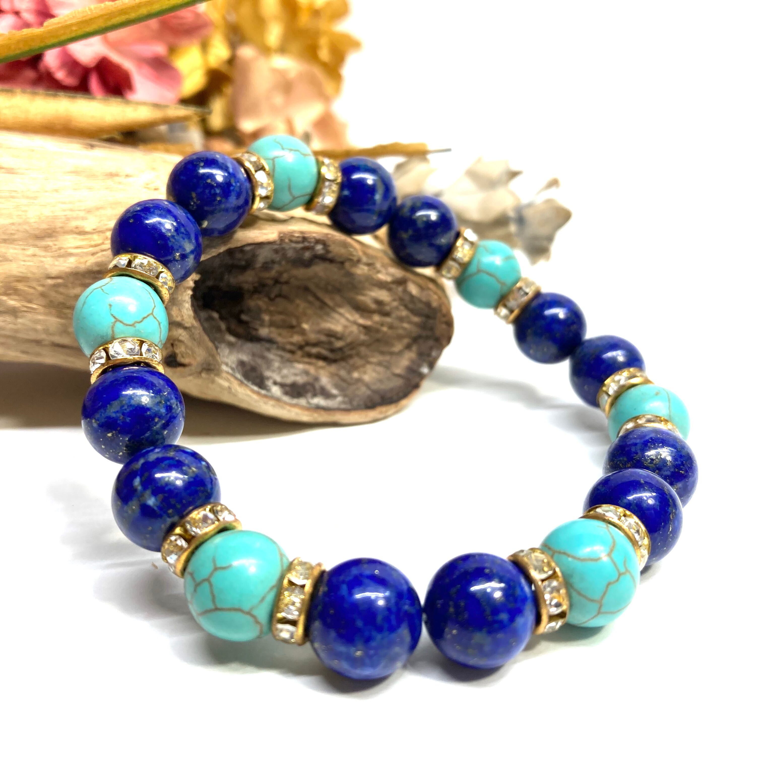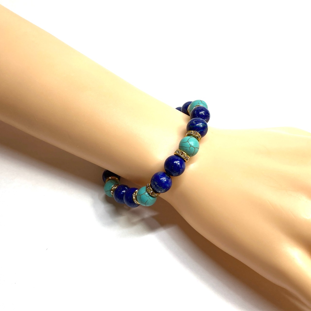 こちらは、ラピスラズリとターコイズを組み合わせたパワーストーンブレスレットです。間にはロンデルを挟み高級感あるデザインに仕上げております。石大きさは腕にも馴染みやすいように10mm玉で内径約18cm(伸可能)です。 数に限りがございますので気になる方はお早めにどうぞ。