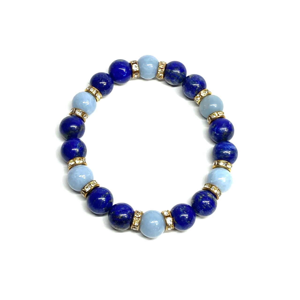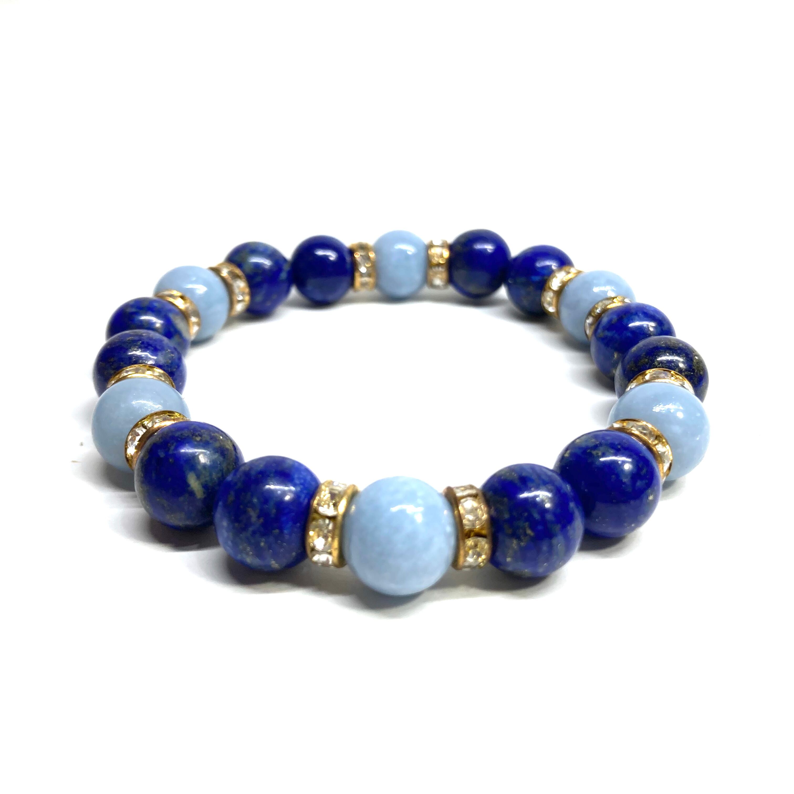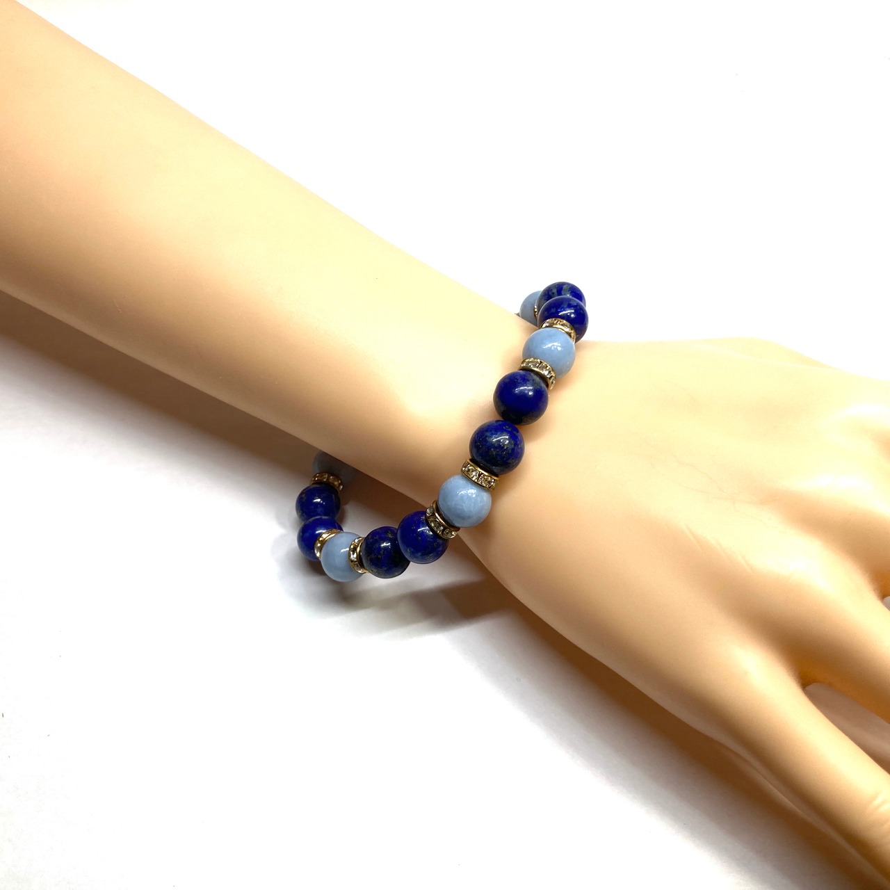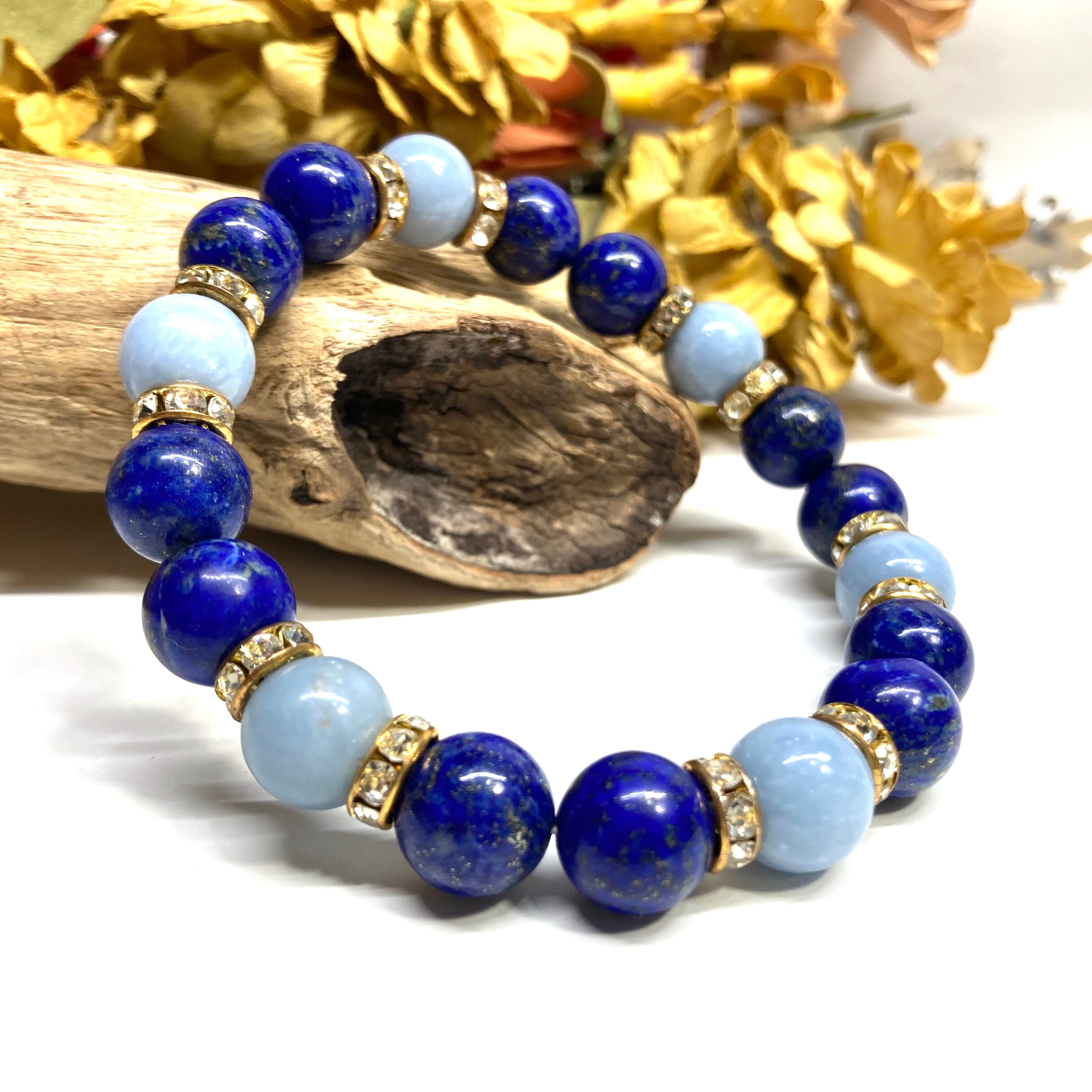 こちらは、ラピスラズリとエンジェライトを組み合わせたパワーストーンブレスレットです。間にはロンデルを挟み高級感あるデザインに仕上げております。石大きさは腕にも馴染みやすいように10mm玉で内径約18cm(伸可能)です。 数に限りがございますので気になる方はお早めにどうぞ。