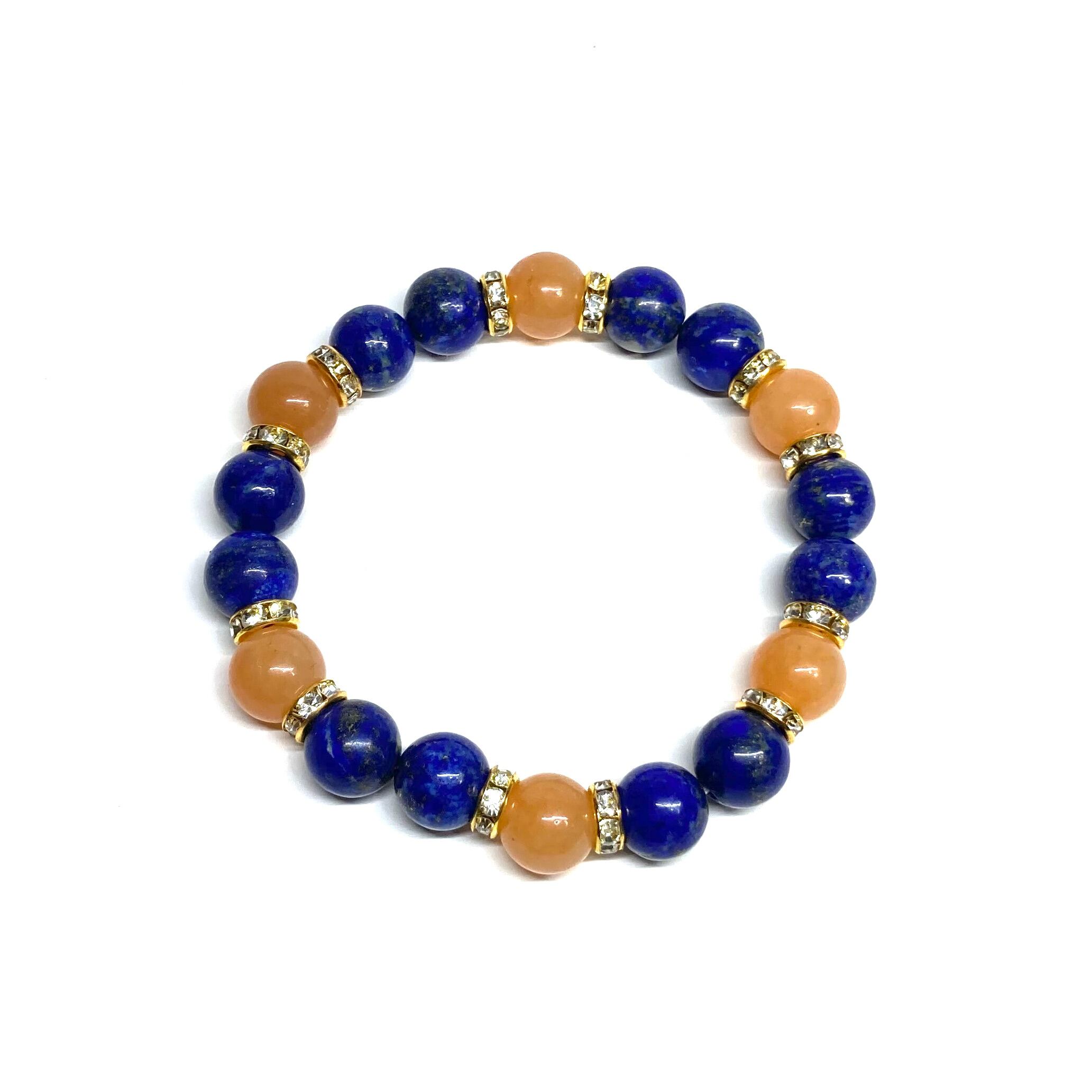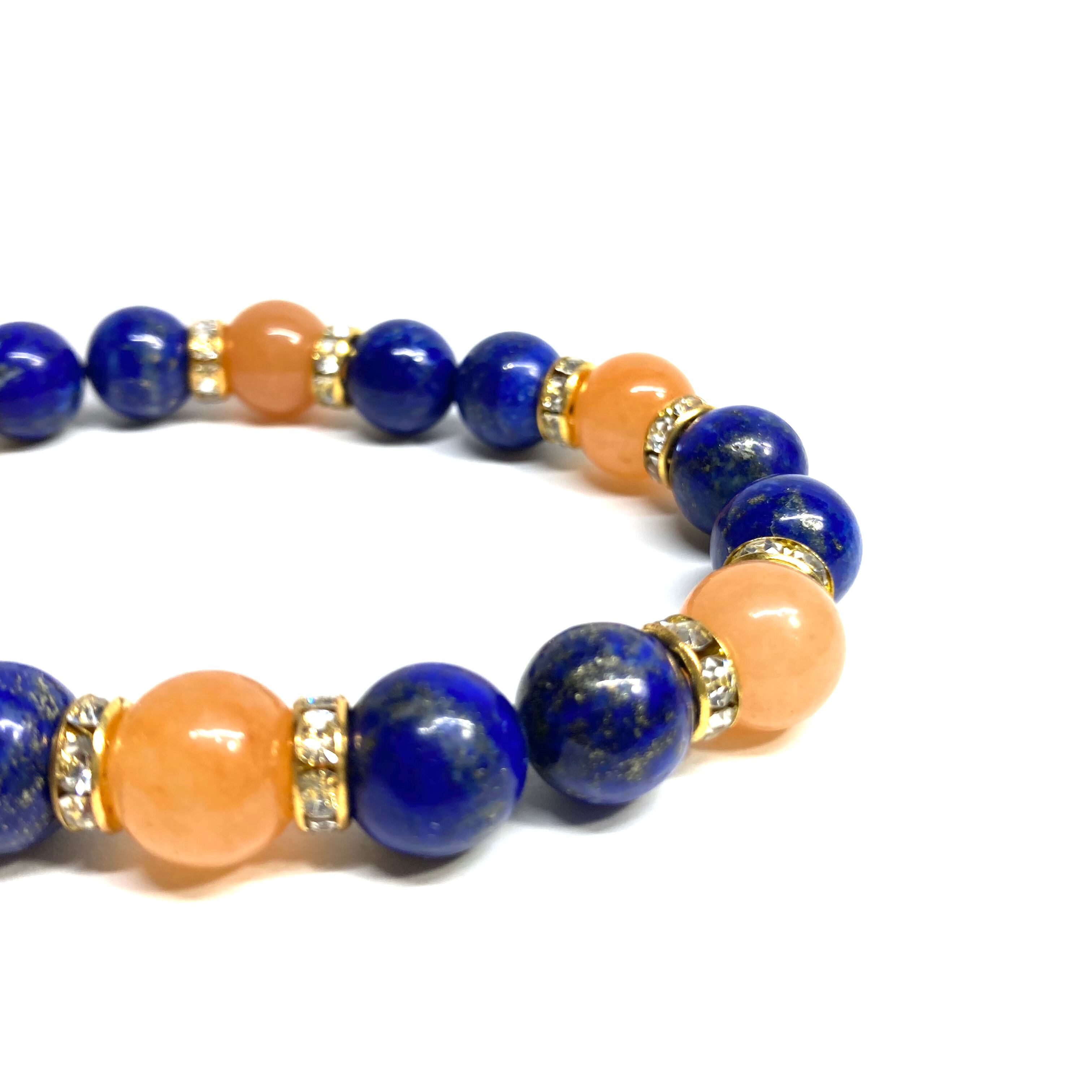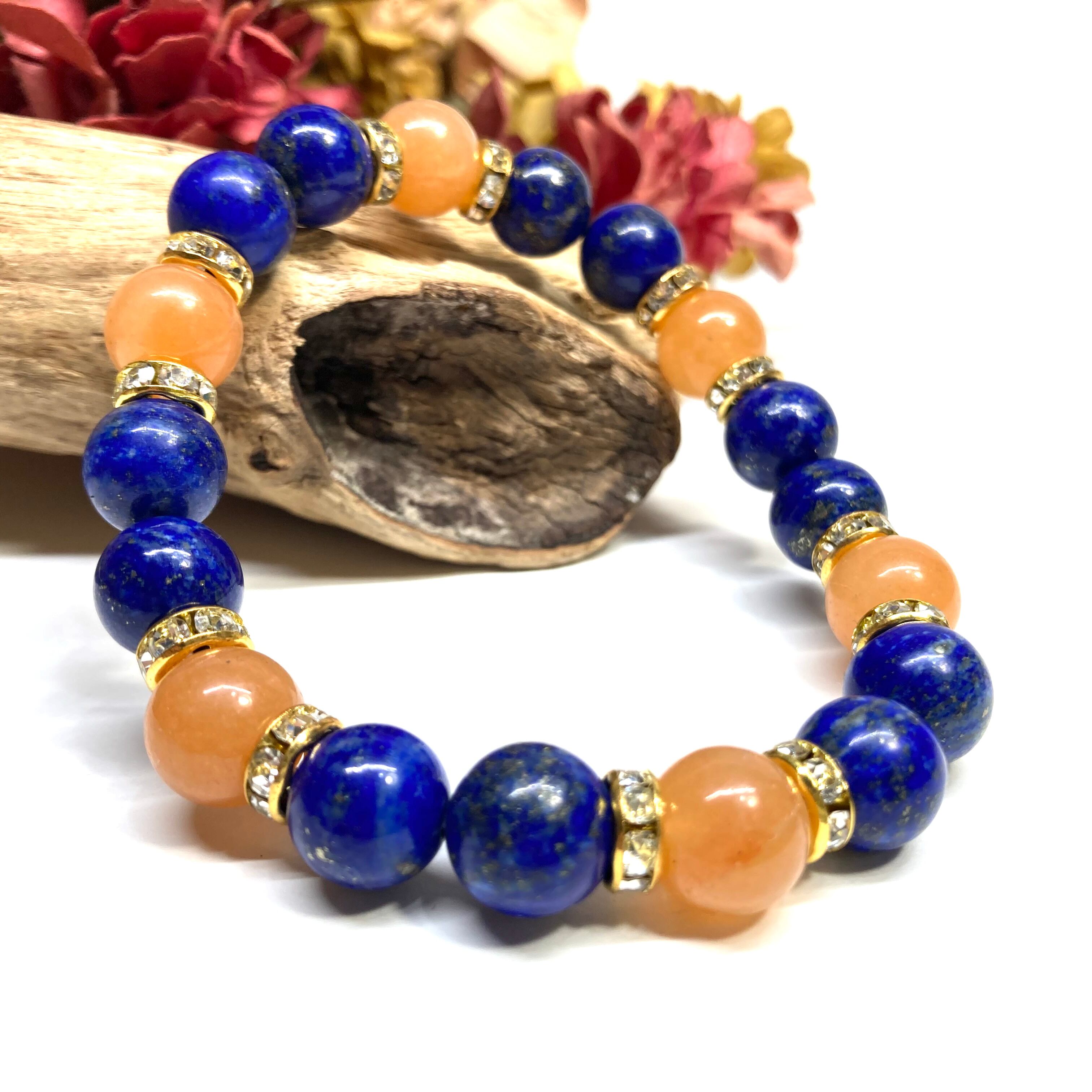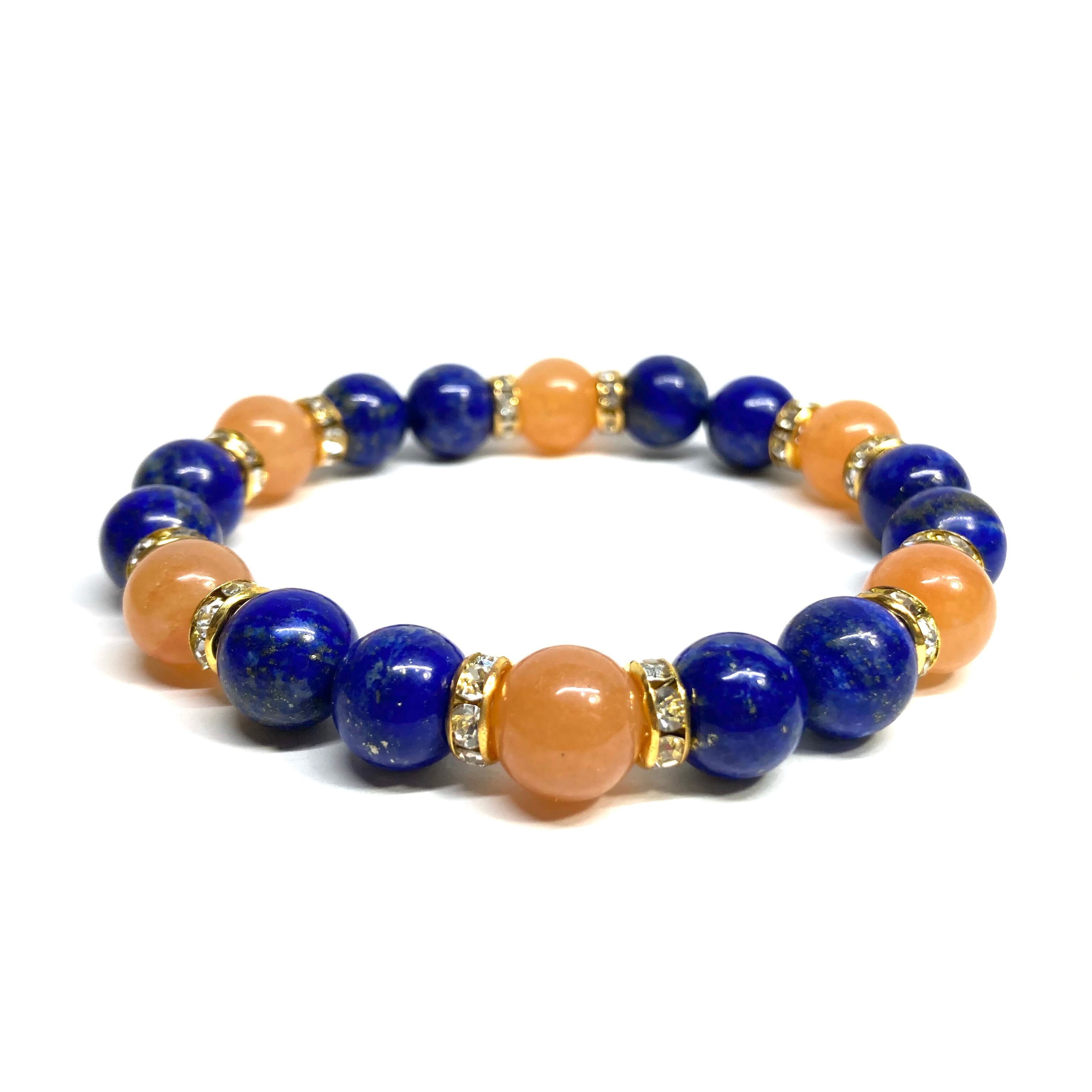 こちらは、ラピスラズリとレッドアベンチュリンを組み合わせたパワーストーンブレスレットです。間にはロンデルを挟み高級感あるデザインに仕上げております。石大きさは腕にも馴染みやすいように10mm玉で内径約18cm(伸可能)です。 数に限りがございますので気になる方はお早めにどうぞ。