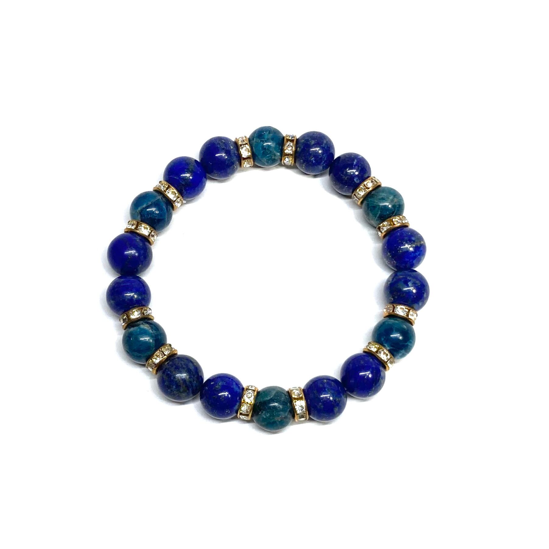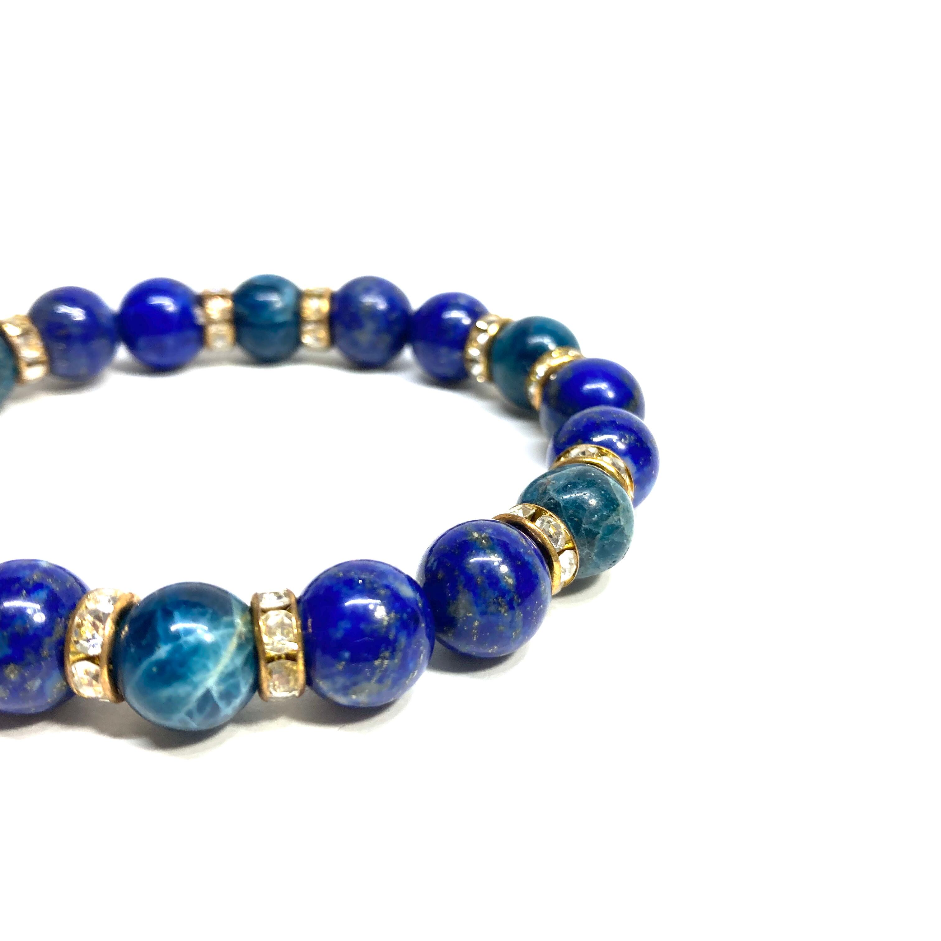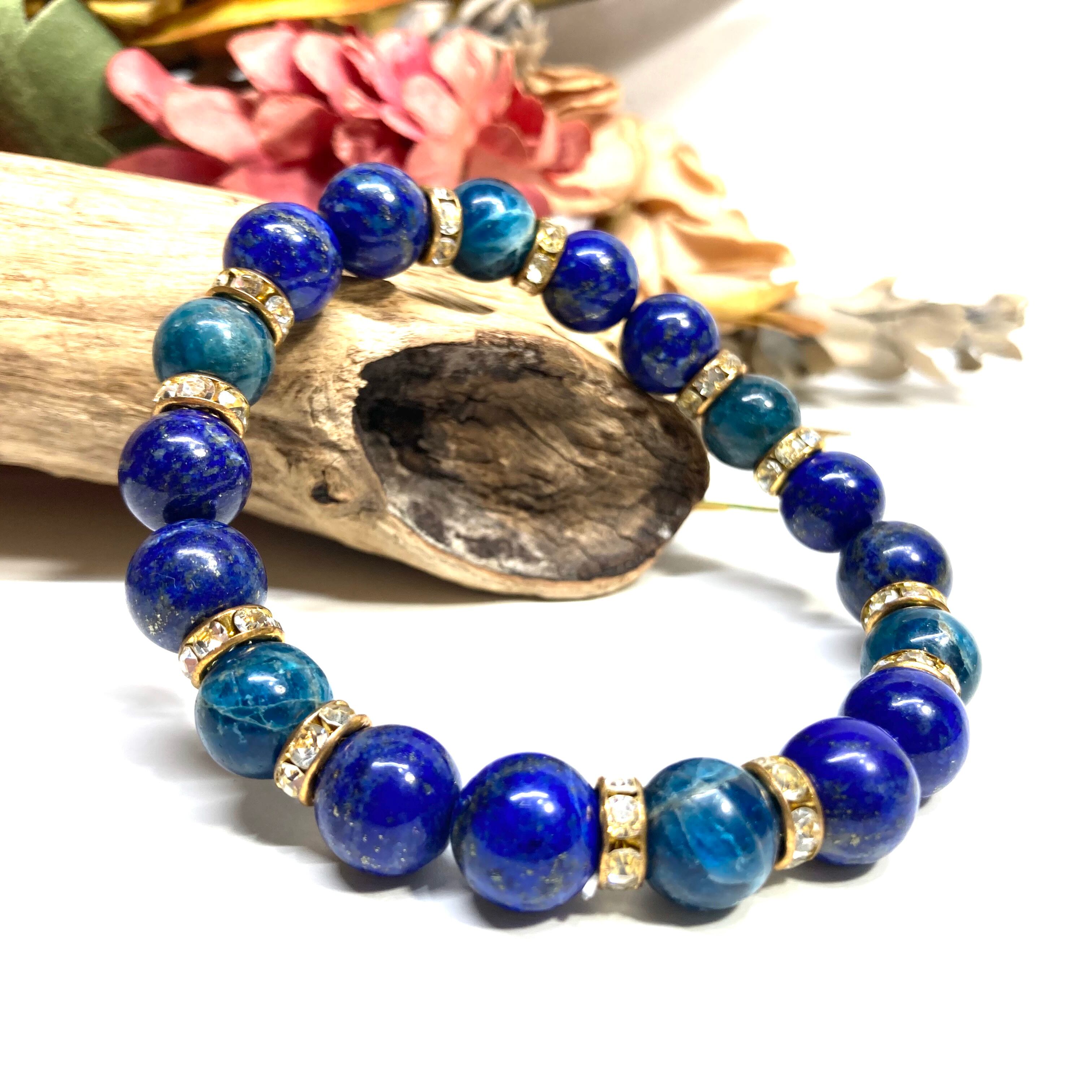 こちらは、ラピスラズリとアパタイトを組み合わせたパワーストーンブレスレットです。間にはロンデルを挟み高級感あるデザインに仕上げております。石大きさは腕にも馴染みやすいように10mm玉で内径約18cm(伸可能)です。 数に限りがございますので気になる方はお早めにどうぞ。