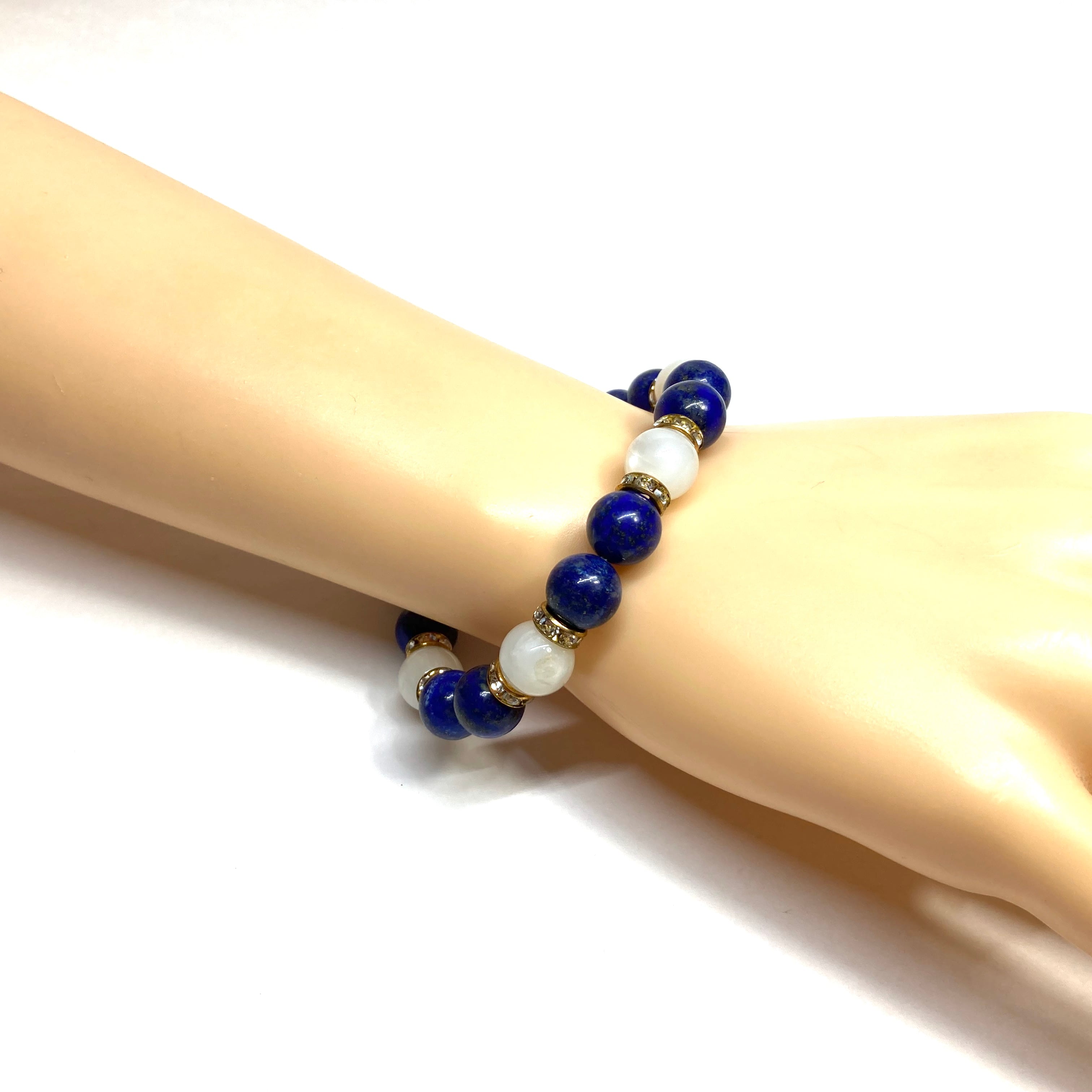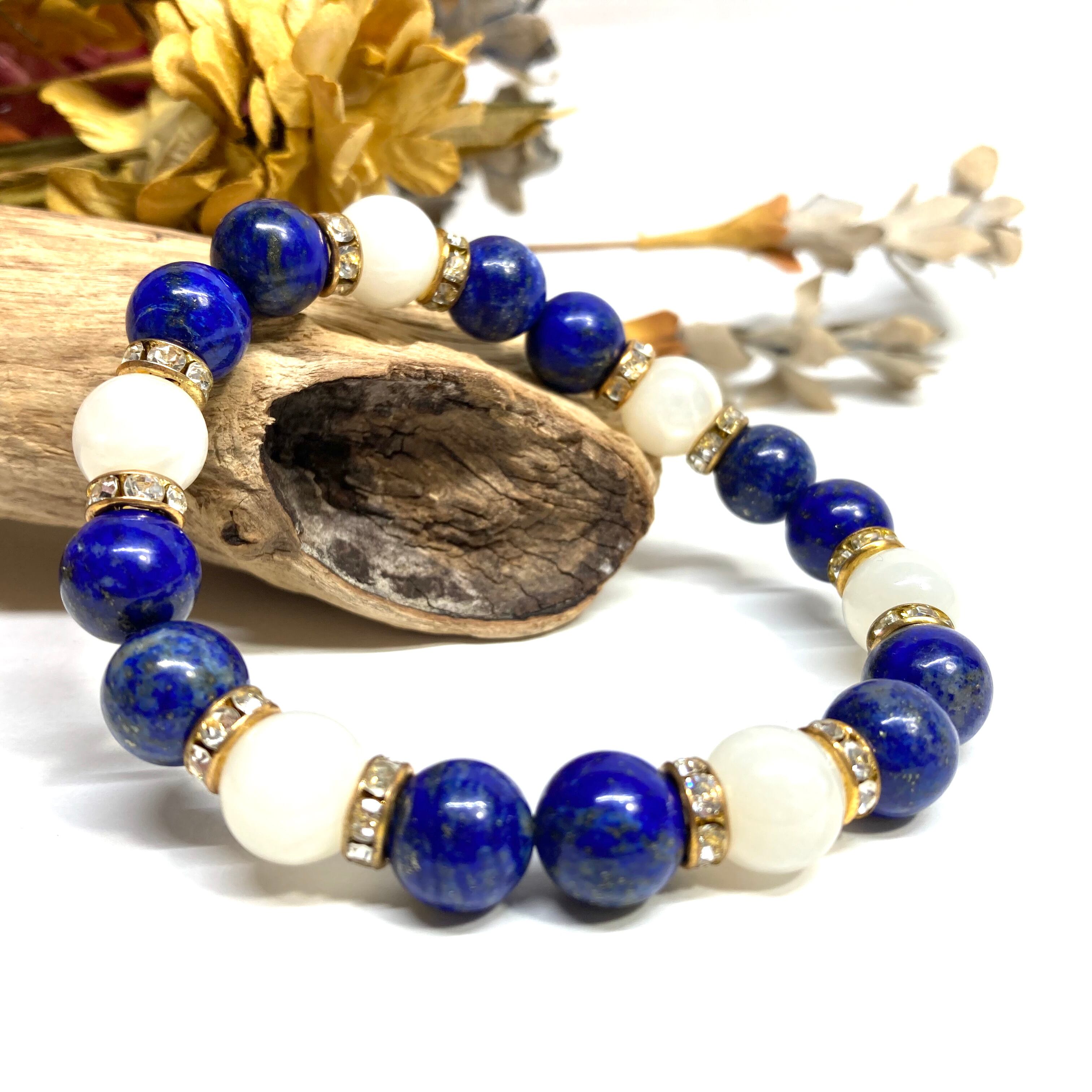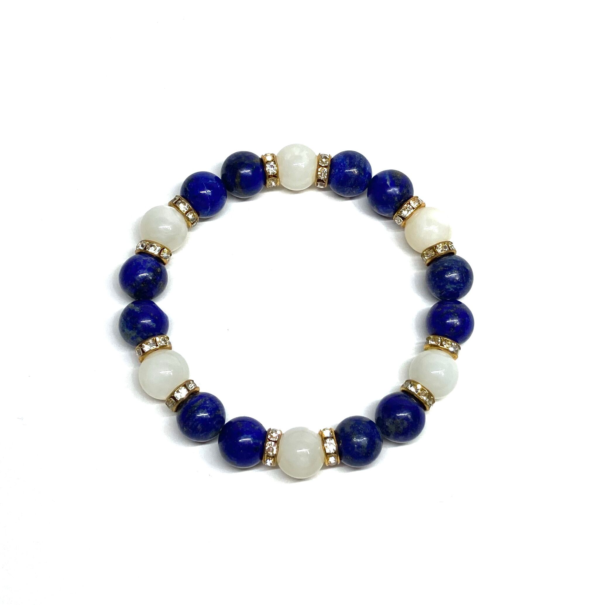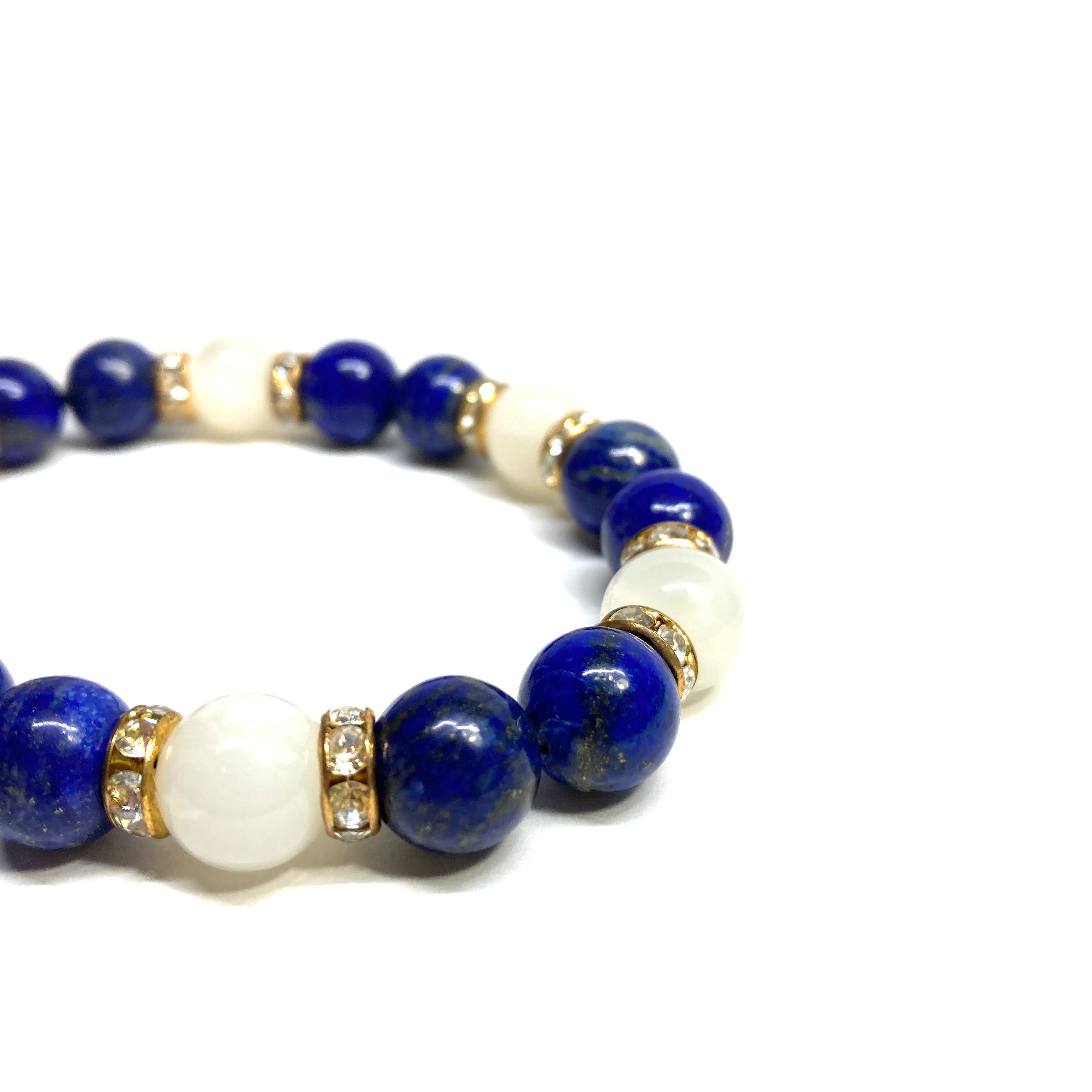 こちらは、ラピスラズリとムーンストーンを組み合わせたパワーストーンブレスレットです。間にはロンデルを挟み高級感あるデザインに仕上げております。石大きさは腕にも馴染みやすいように10mm玉で内径約18cm(伸可能)です。 数に限りがございますので気になる方はお早めにどうぞ。