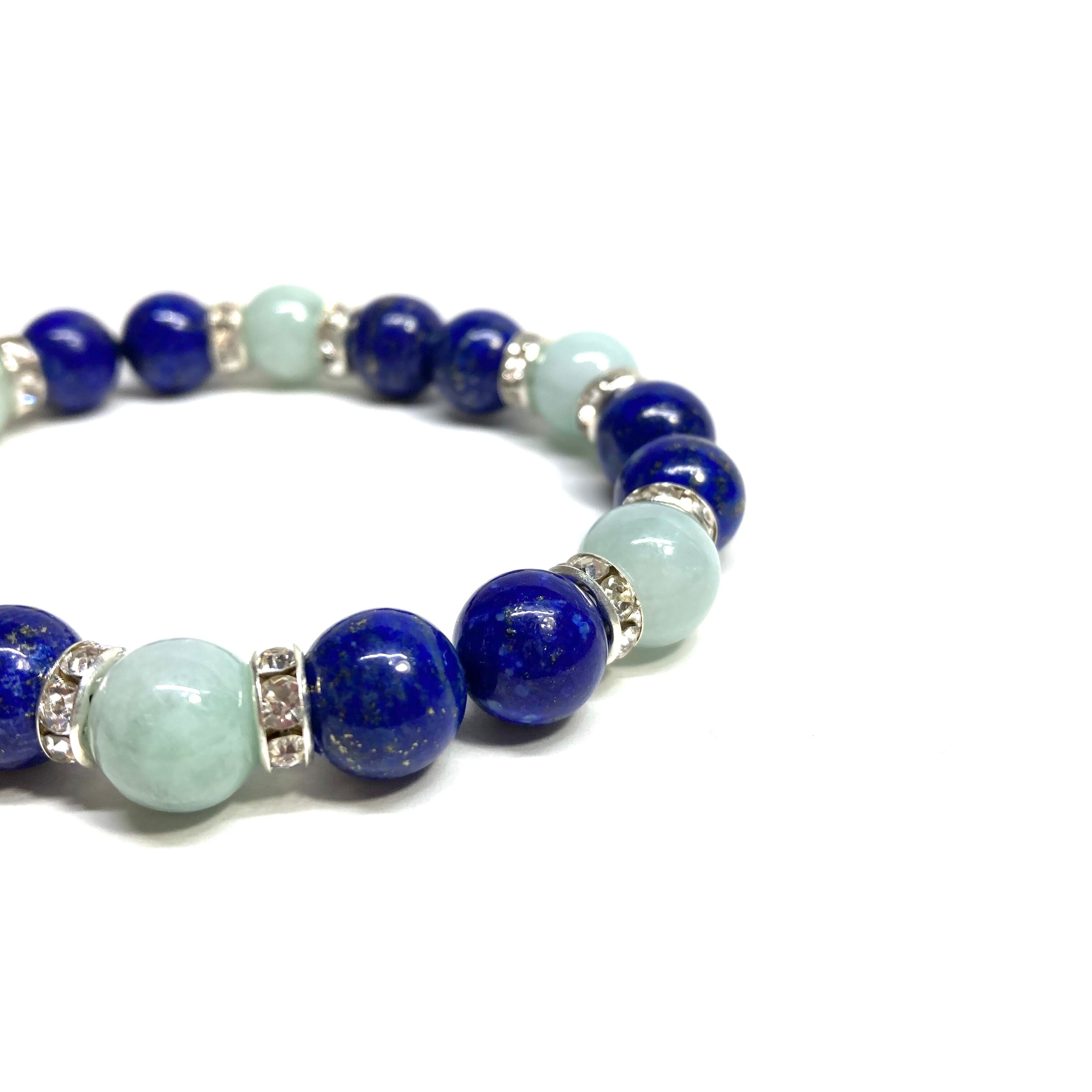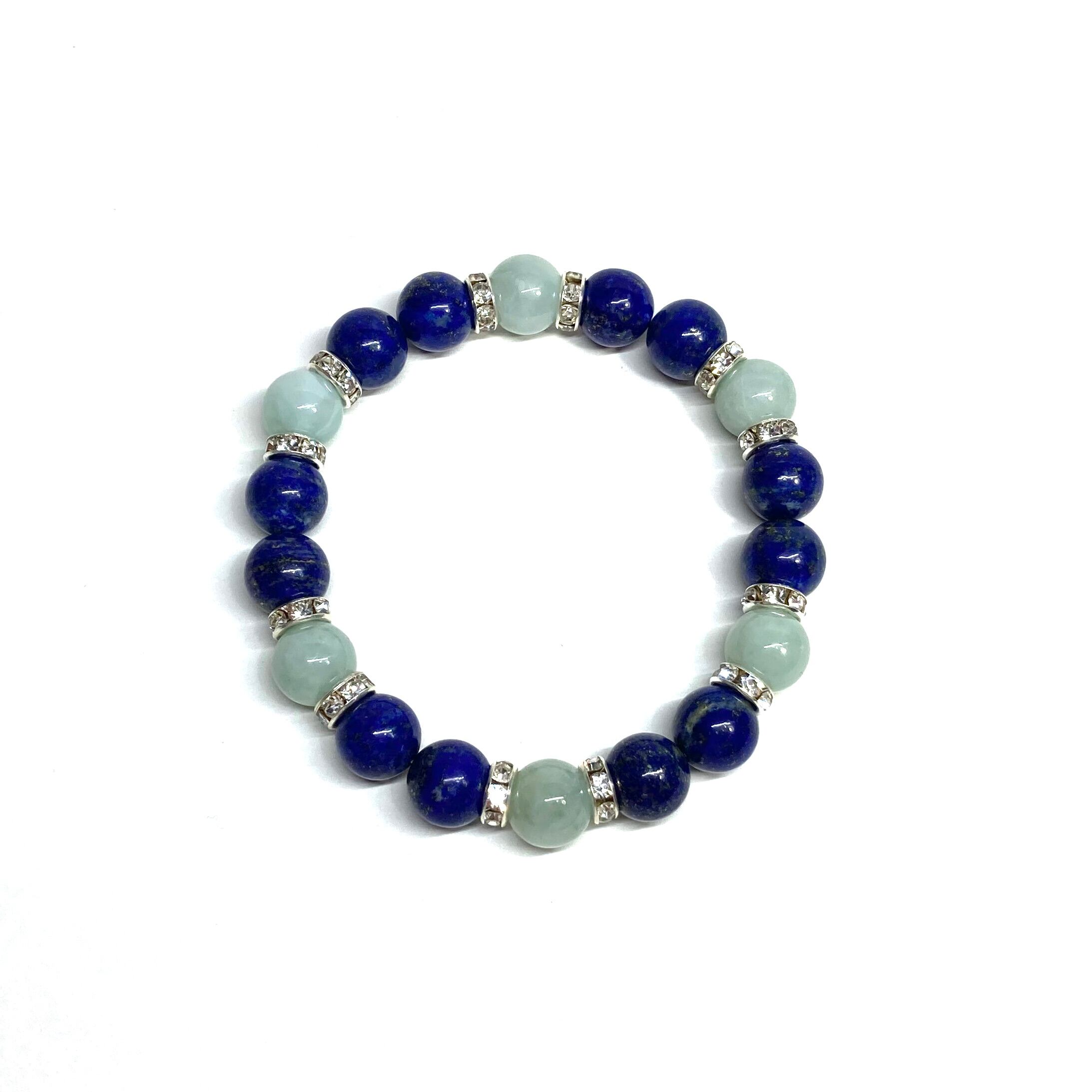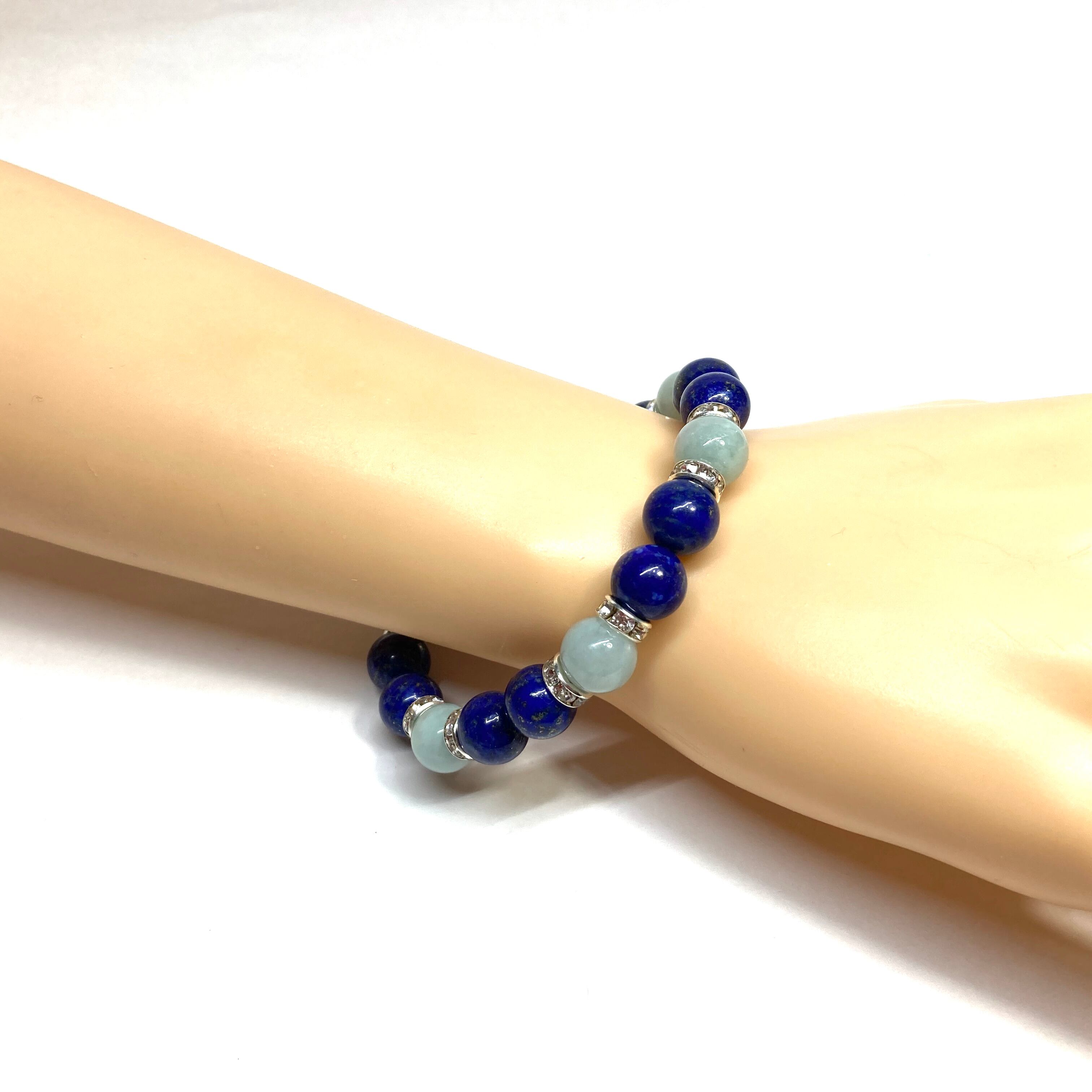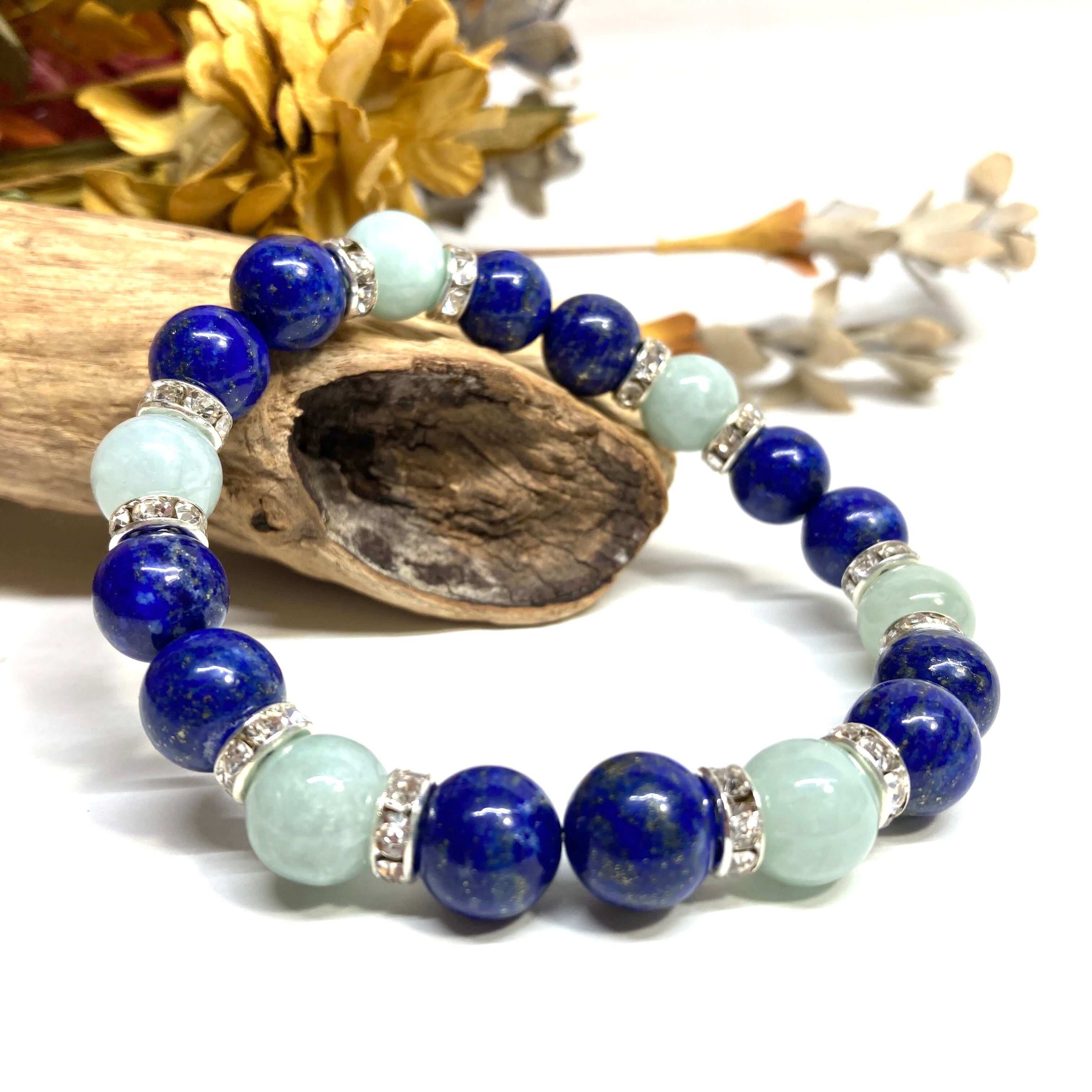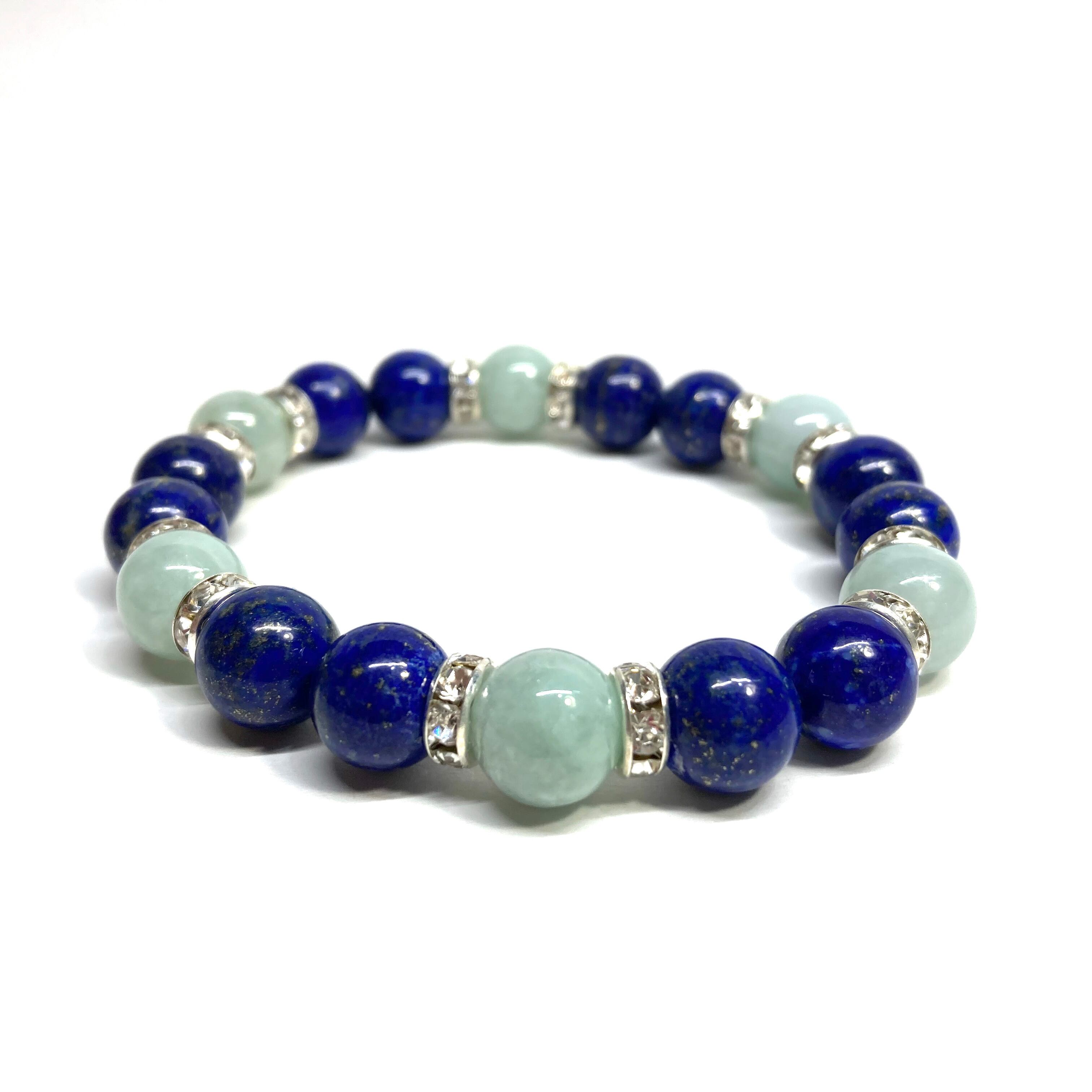 こちらは、ラピスラズリとビルマ翡翠を組み合わせたパワーストーンブレスレットです。間にはロンデルを挟み高級感あるデザインに仕上げております。石大きさは腕にも馴染みやすいように10mm玉で内径約18cm(伸可能)です。 数に限りがございますので気になる方はお早めにどうぞ。