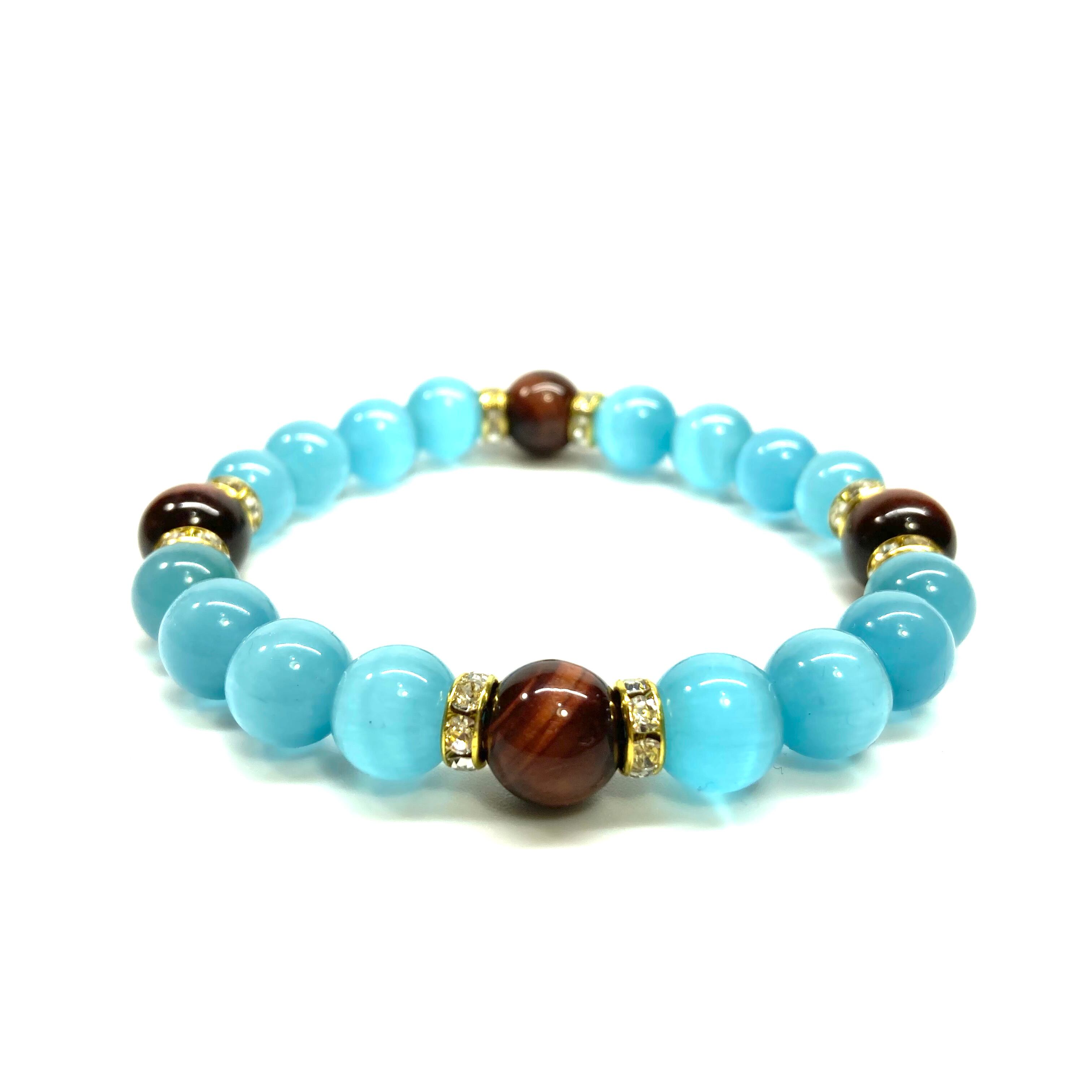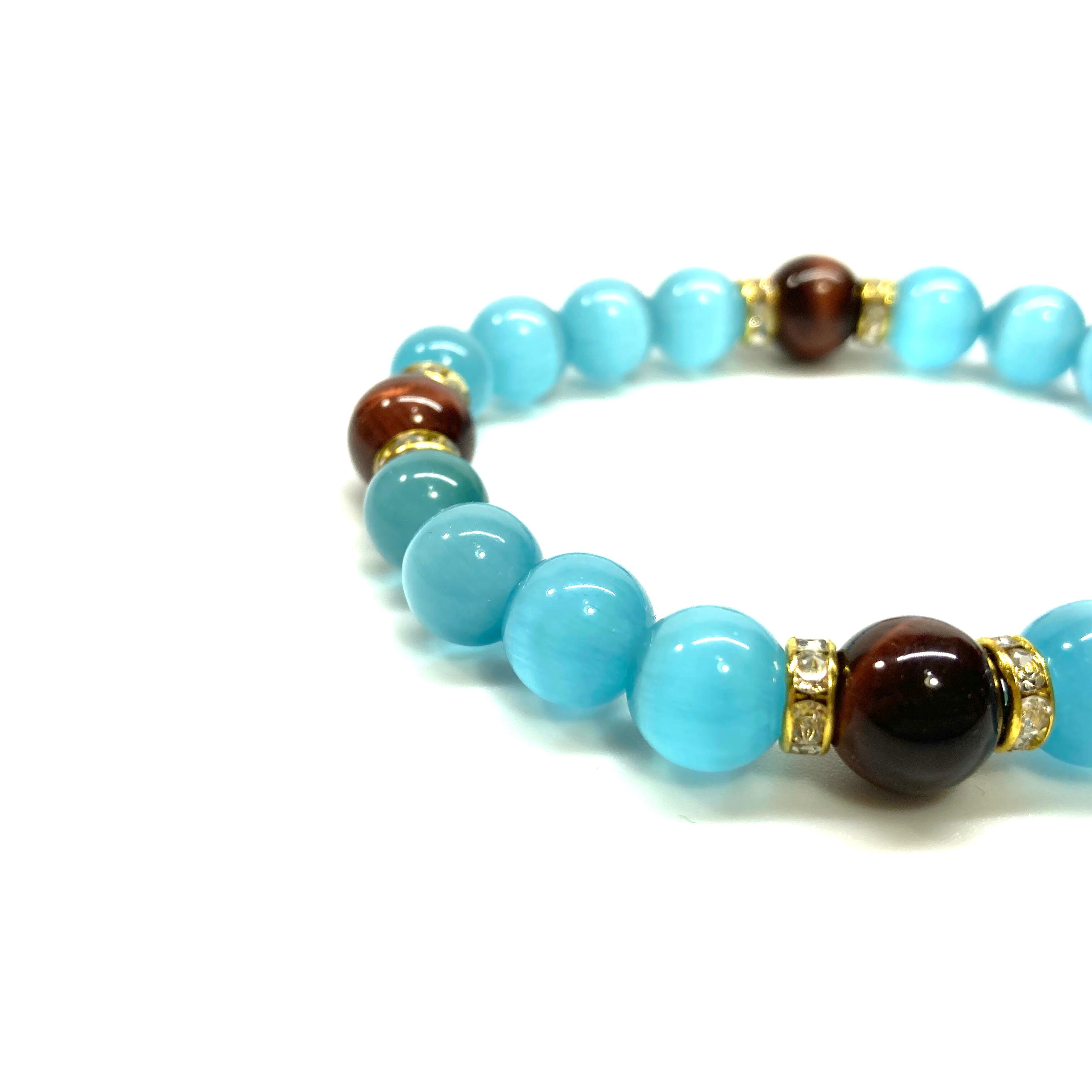 キャッツアイ(ライトブルー)×レッドタイガーアイ パワーストーン ブレスレット (ゴールド) メンズ・レディース 男性・女性 数珠ブレス 開運