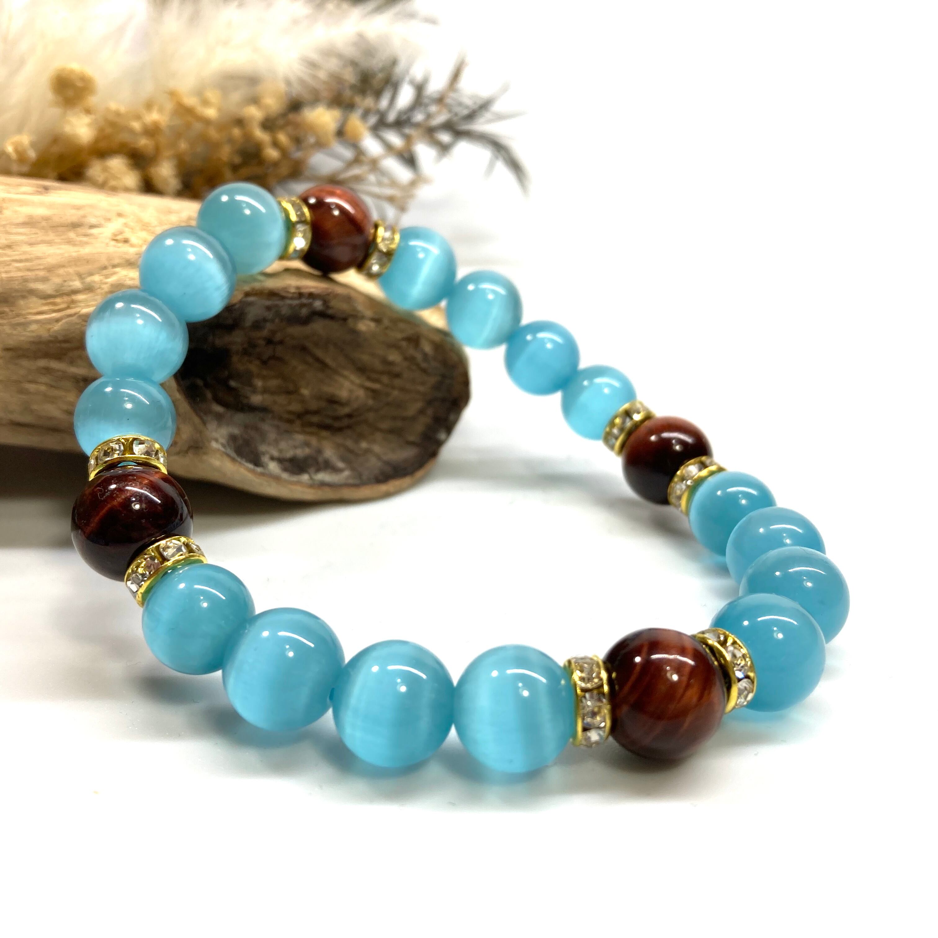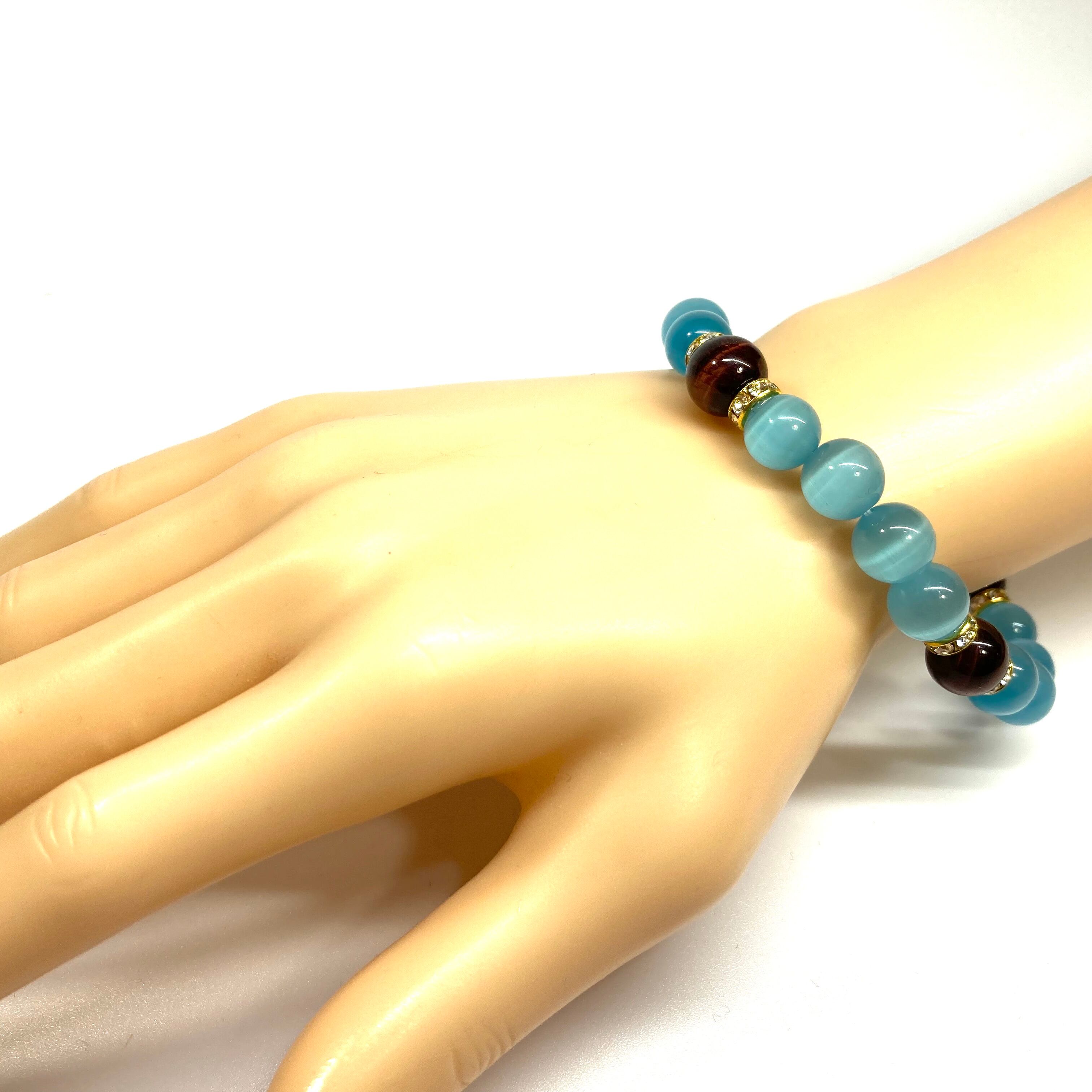 こちらは、キャッツアイとレッドタイガーアイを組み合わせたブレスレットです。間にはロンデルを挟み高級感あるデザインに仕上がっています。石大きさは腕にも馴染みやすいように10mm玉で内周約17cm(伸可能)です。数に限りがございますので気になる方はお早めにどうぞ。