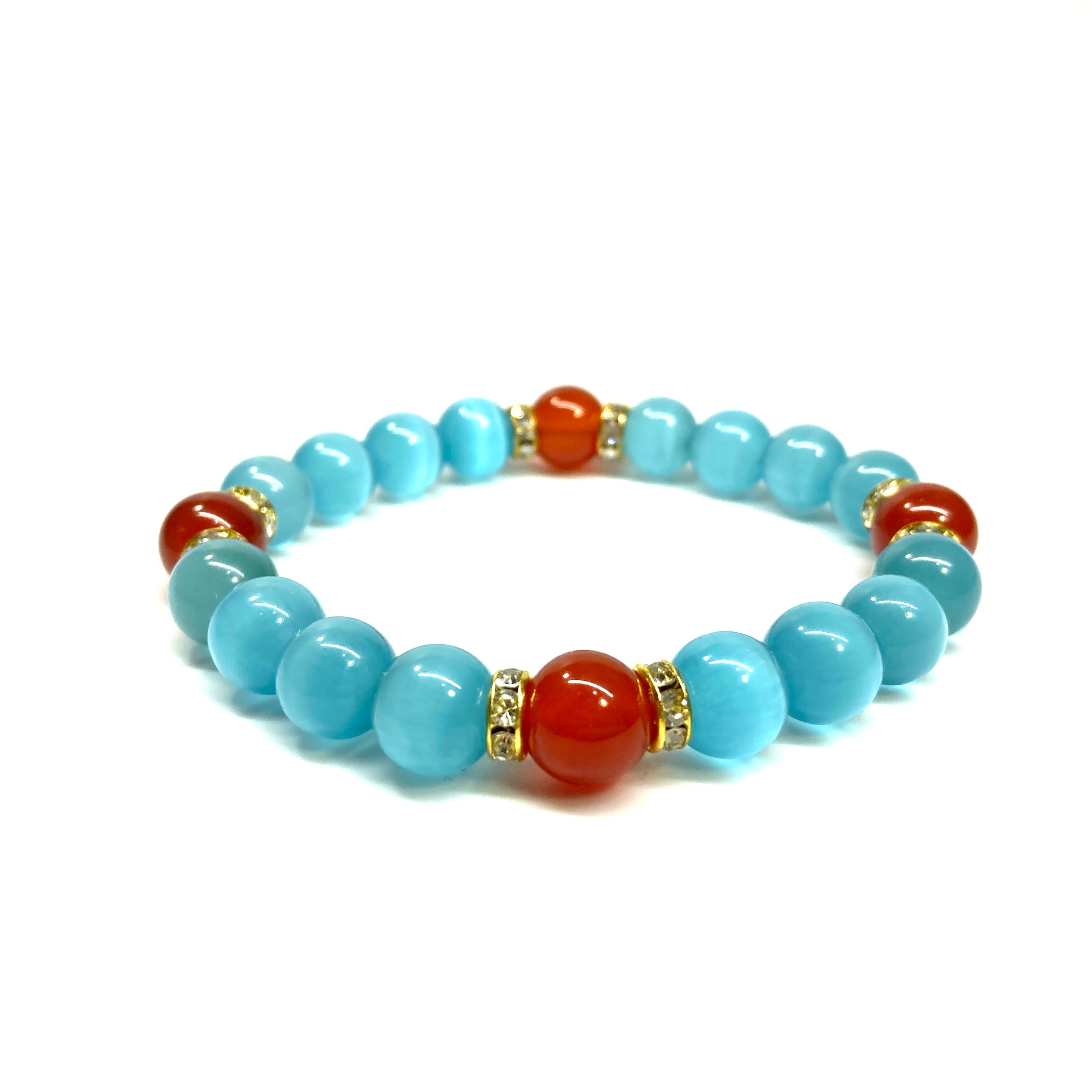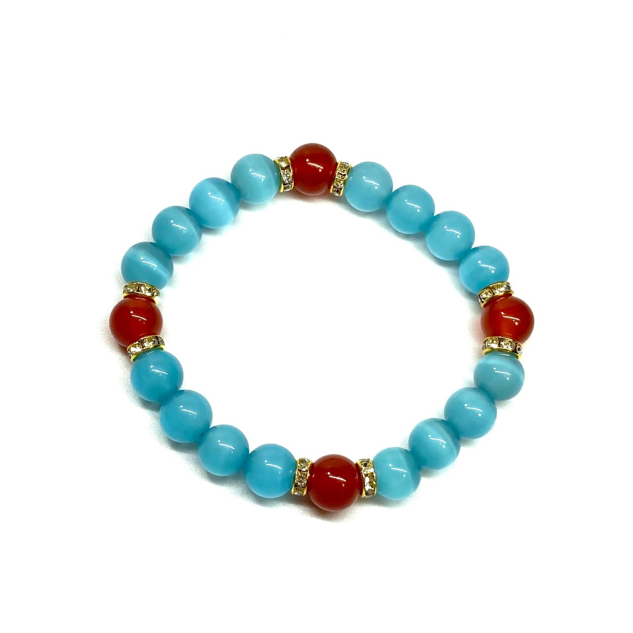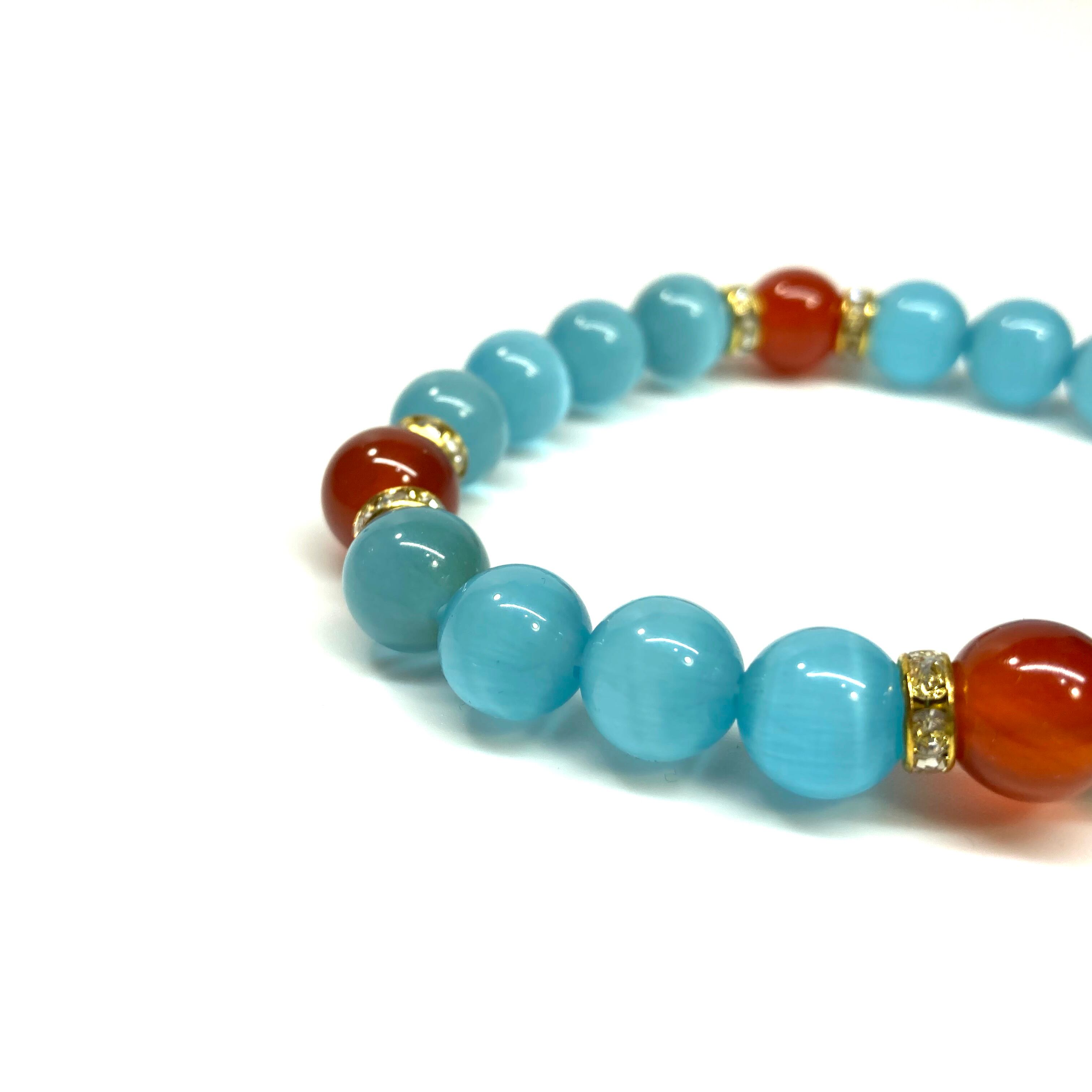 キャッツアイ(ライトブルー)×赤瑪瑙 パワーストーン ブレスレット (ゴールド) メンズ・レディース 男性・女性 数珠ブレス 開運