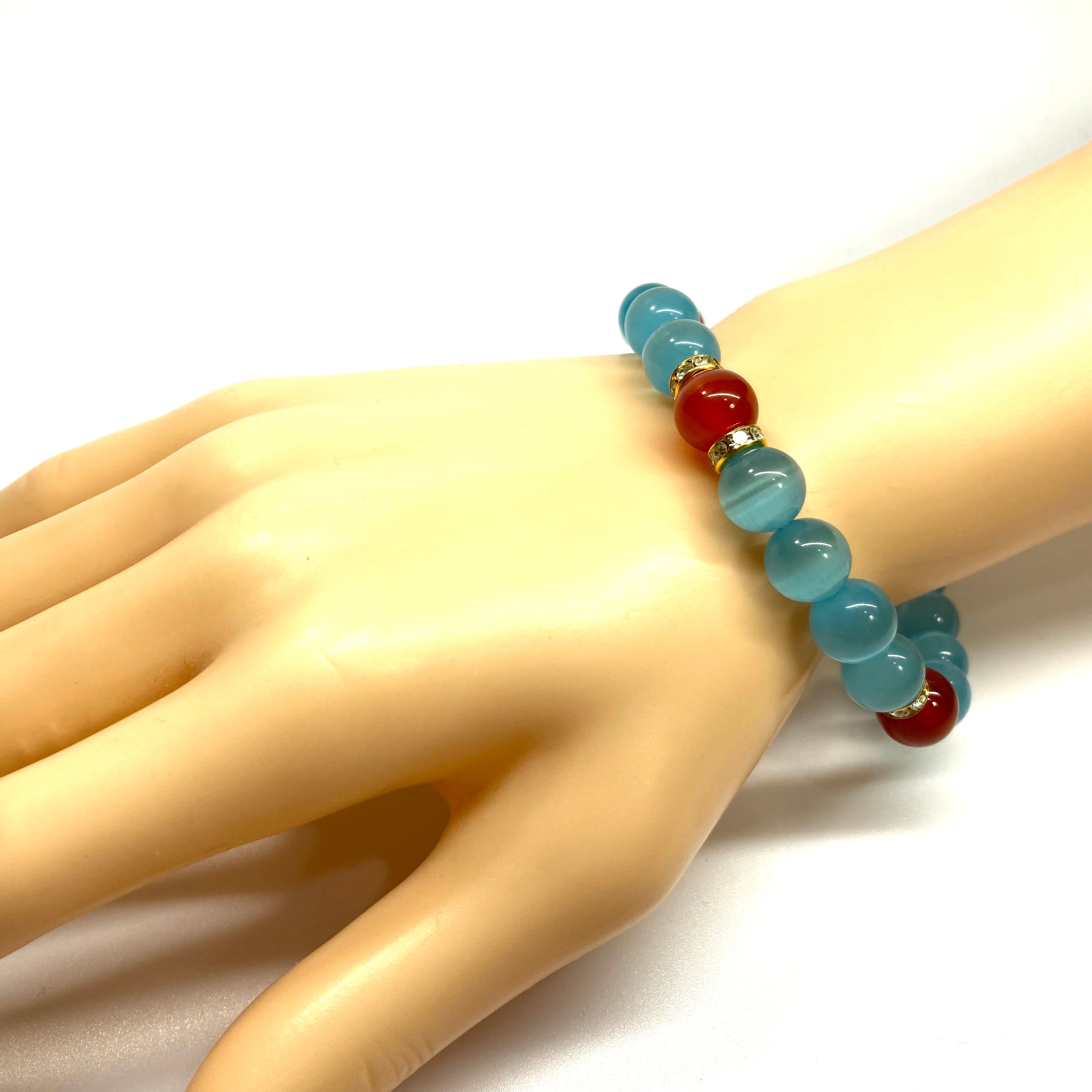こちらは、キャッツアイと赤瑪瑙を組み合わせたブレスレットです。間にはロンデルを挟み高級感あるデザインに仕上がっています。石大きさは腕にも馴染みやすいように10mm玉で内周約17cm(伸可能)です。数に限りがございますので気になる方はお早めにどうぞ。