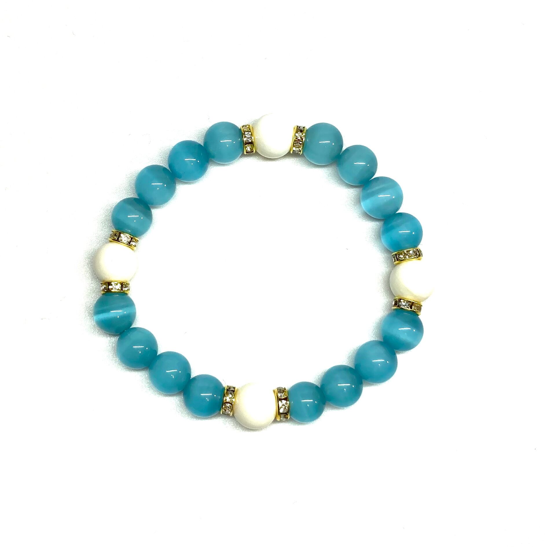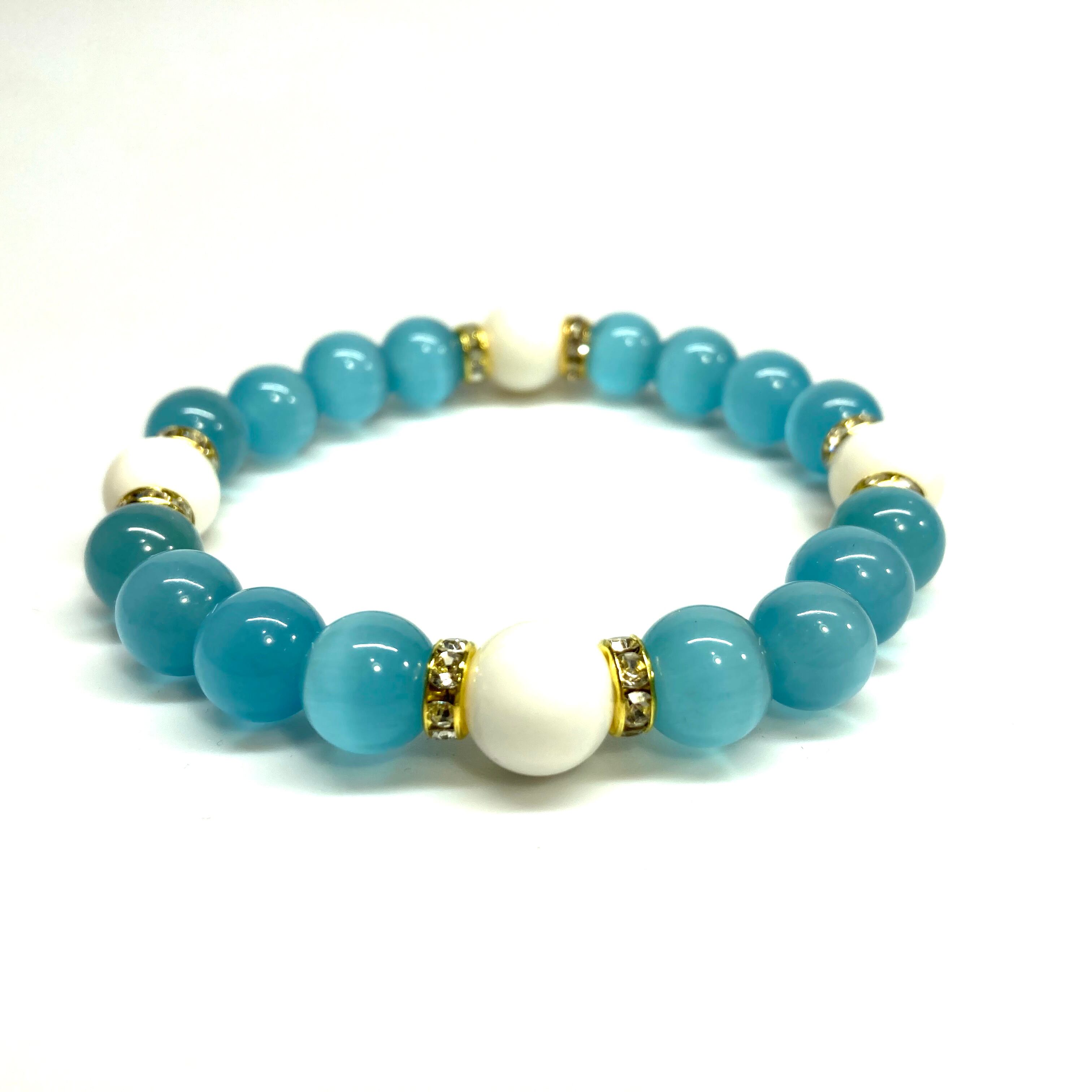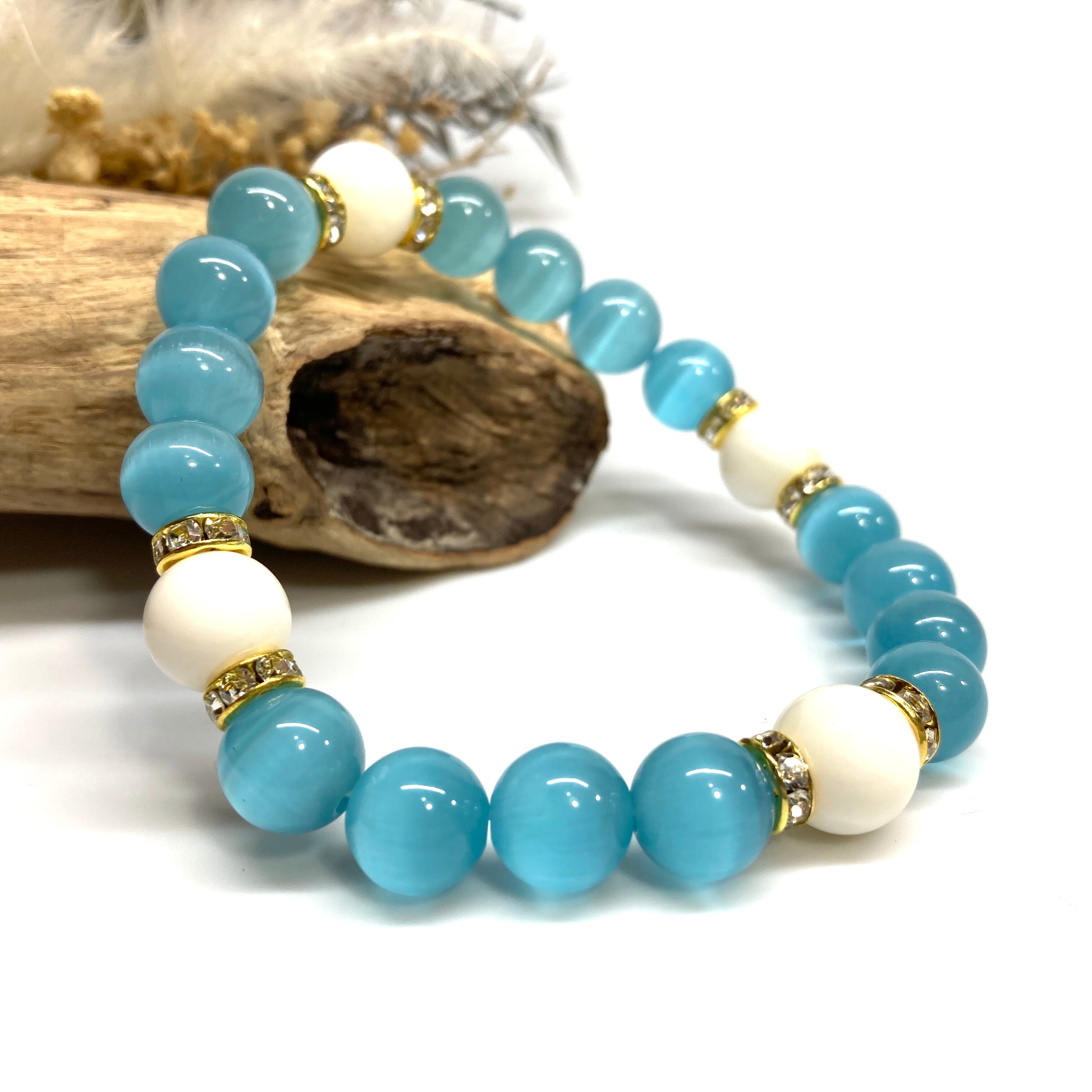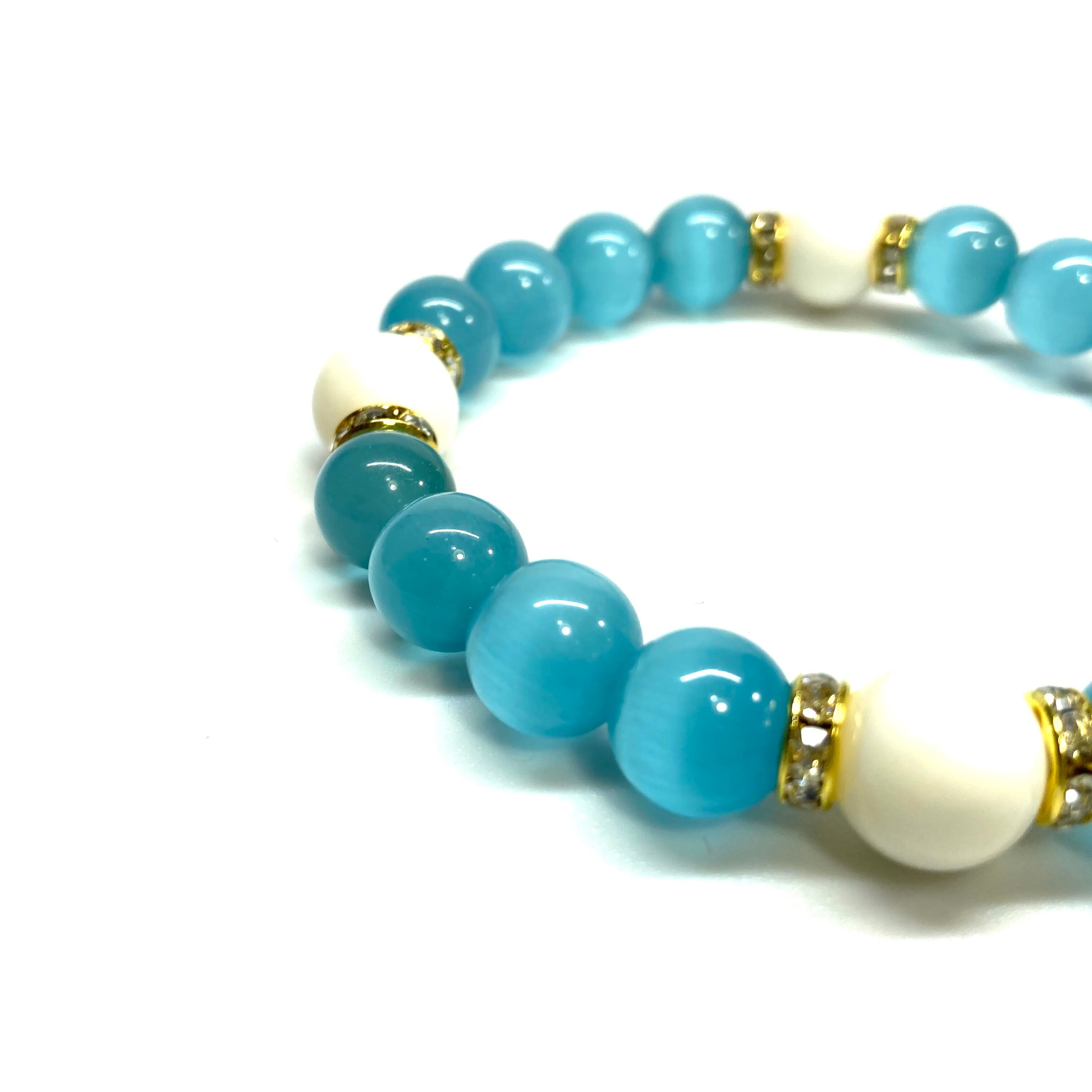 キャッツアイ(ライトブルー)×ホワイトオニキス パワーストーン ブレスレット (ゴールド) メンズ・レディース 男性・女性 数珠ブレス 開運