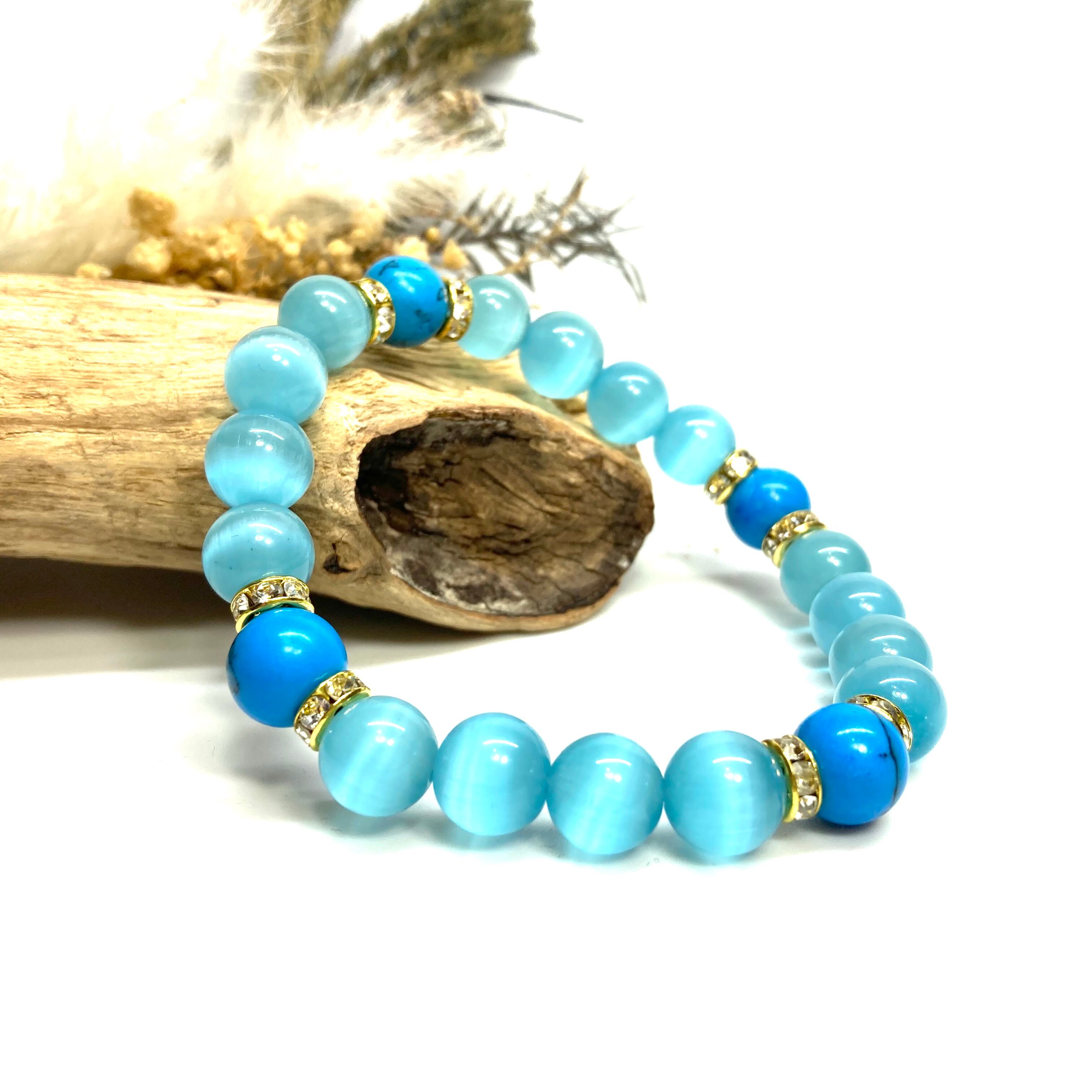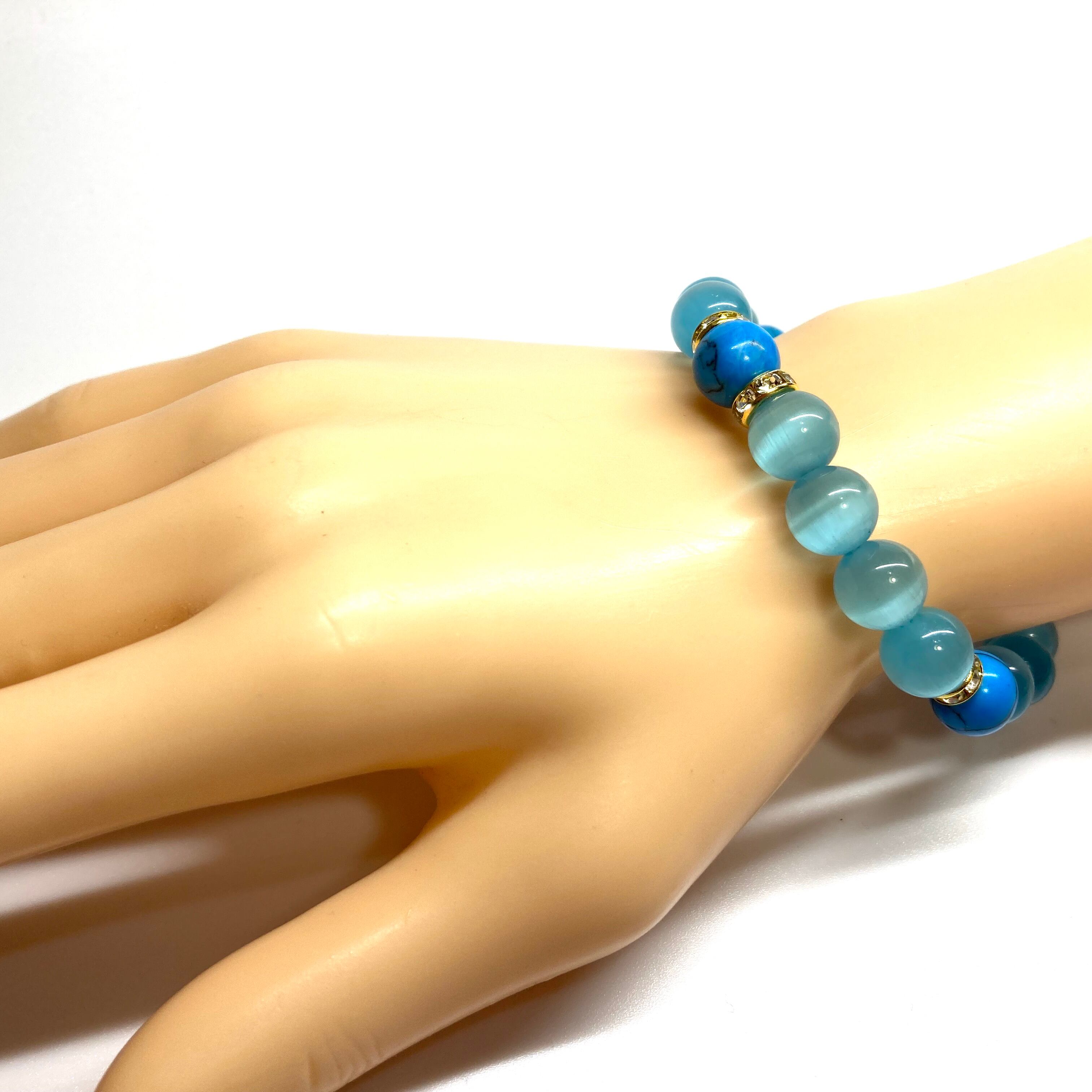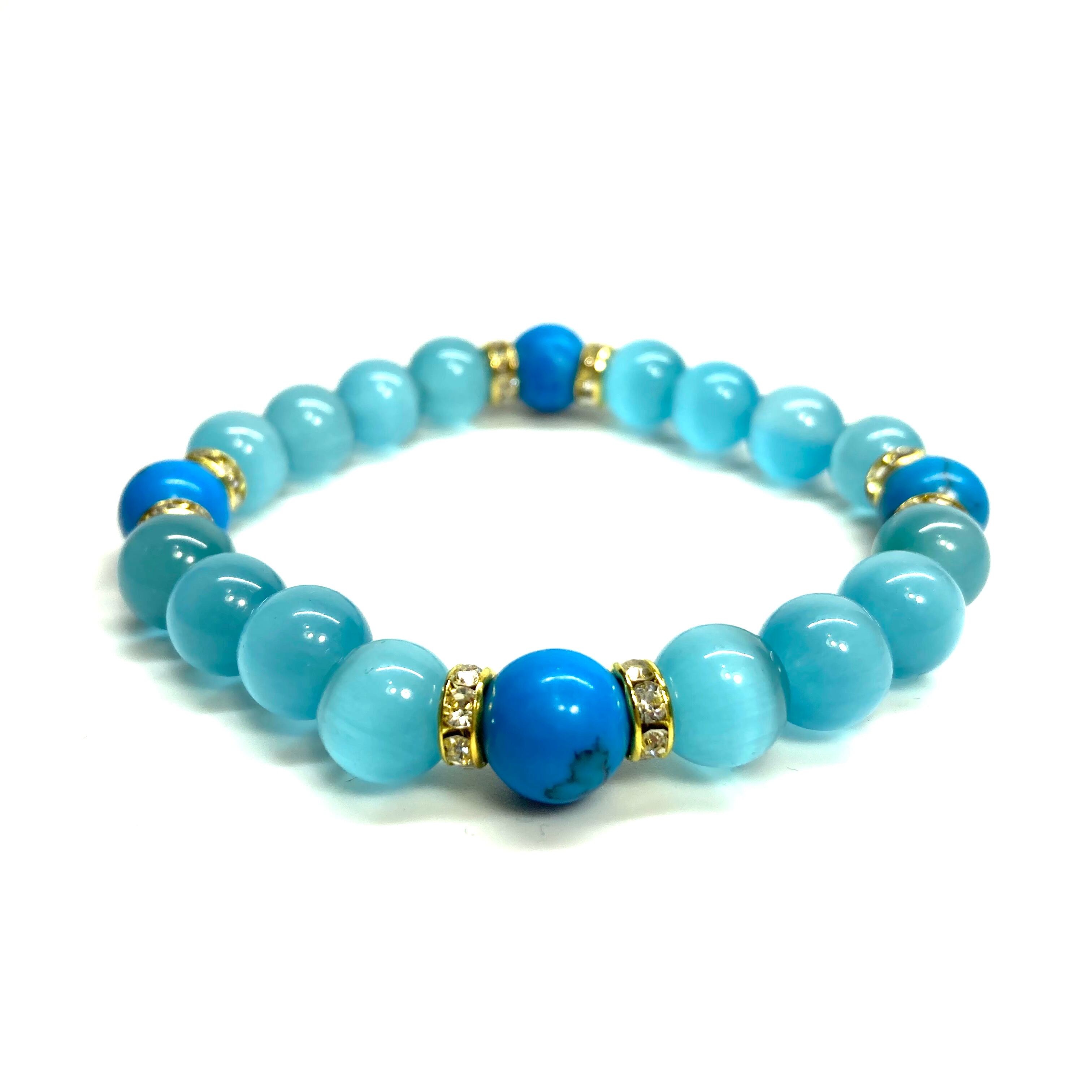 こちらは、キャッツアイとターコイズを組み合わせたブレスレットです。間にはロンデルを挟み高級感あるデザインに仕上がっています。石大きさは腕にも馴染みやすいように10mm玉で内周約17cm(伸可能)です。数に限りがございますので気になる方はお早めにどうぞ。