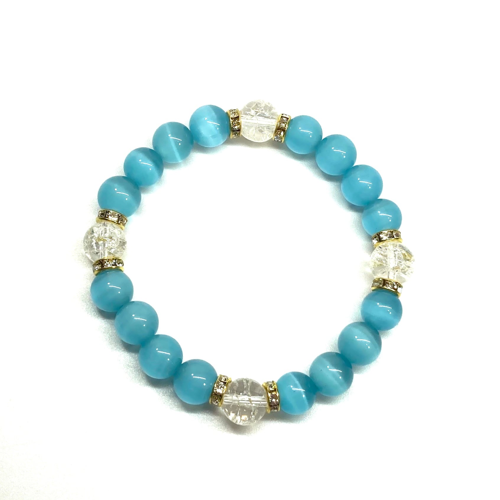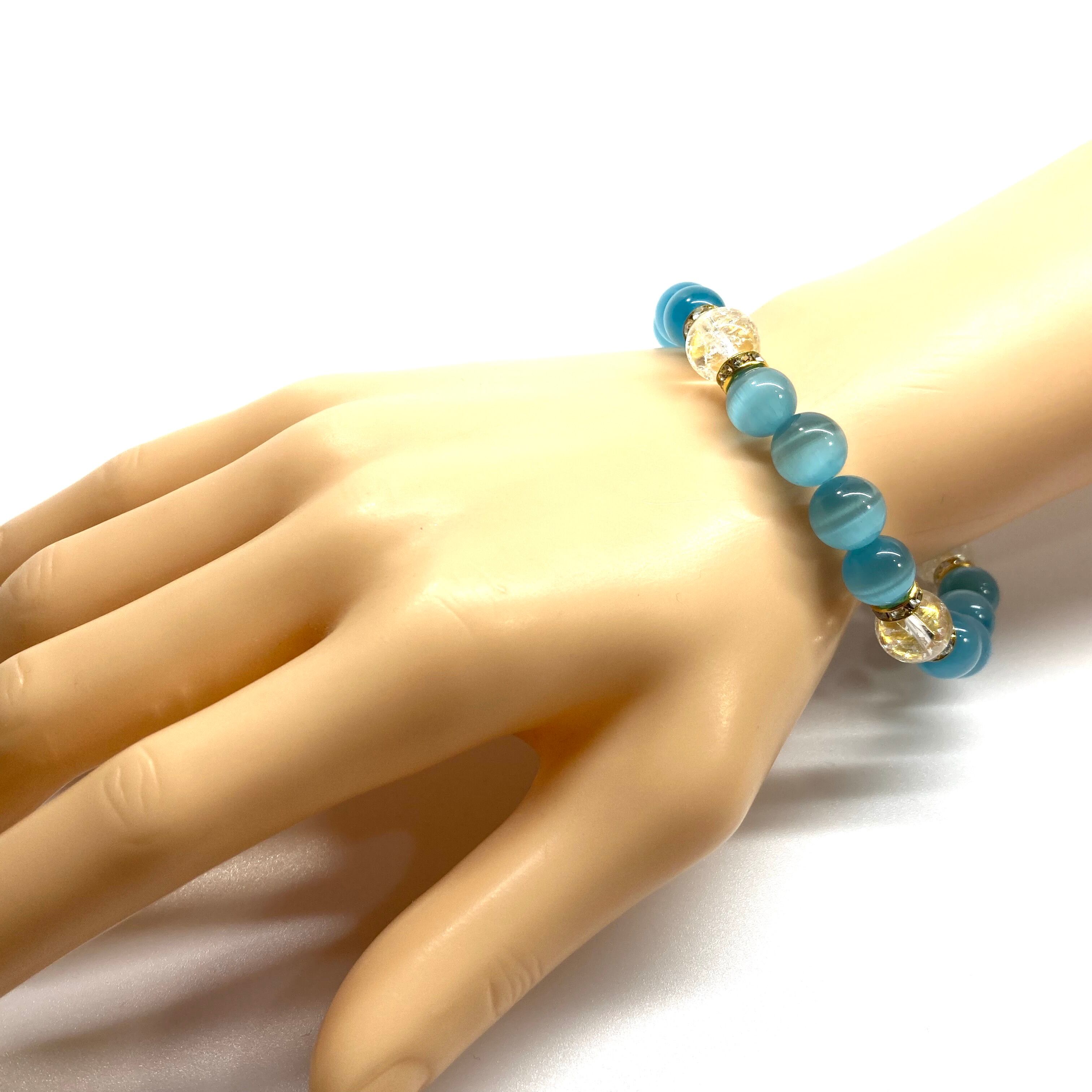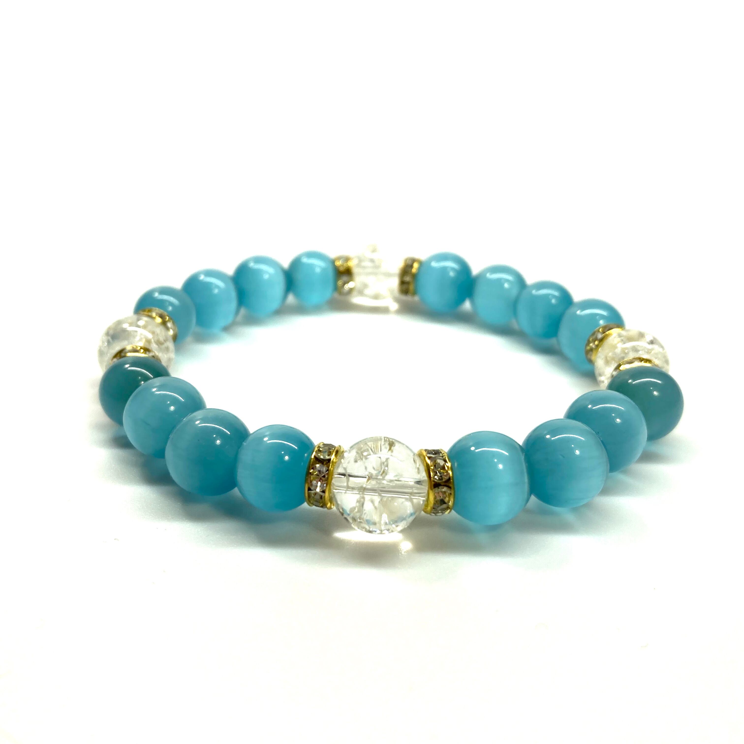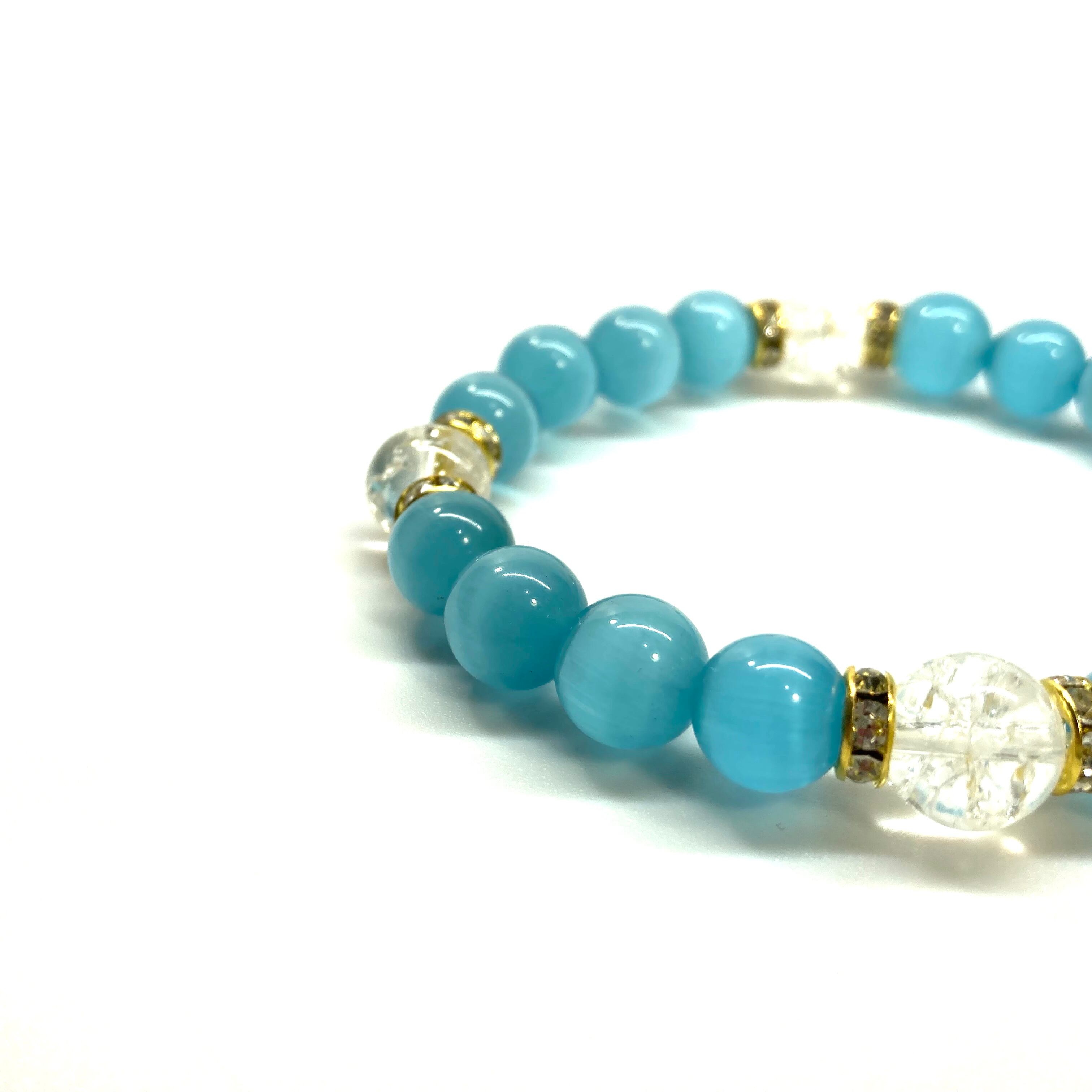 キャッツアイ(ライトブルー)×クラック水晶パワーストーン ブレスレット (ゴールド) メンズ・レディース 男性・女性 数珠ブレス 開運
