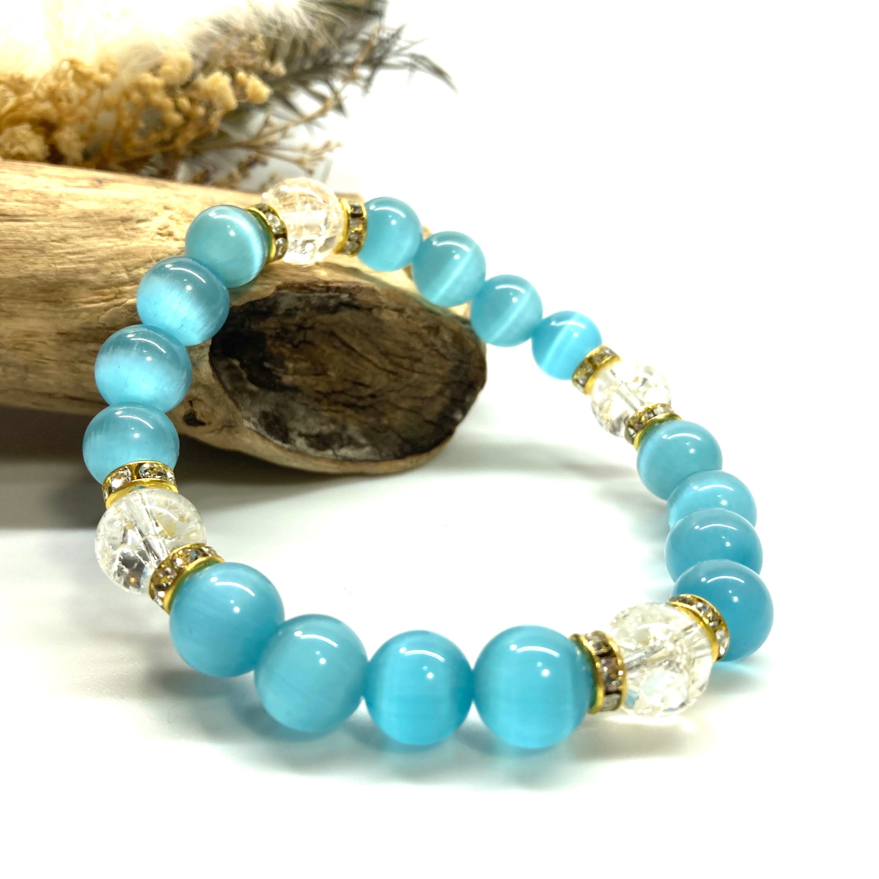 こちらは、キャッツアイとクラック水晶を組み合わせたブレスレットです。間にはロンデルを挟み高級感あるデザインに仕上がっています。石大きさは腕にも馴染みやすいように10mm玉で内周約17cm(伸可能)です。数に限りがございますので気になる方はお早めにどうぞ。
