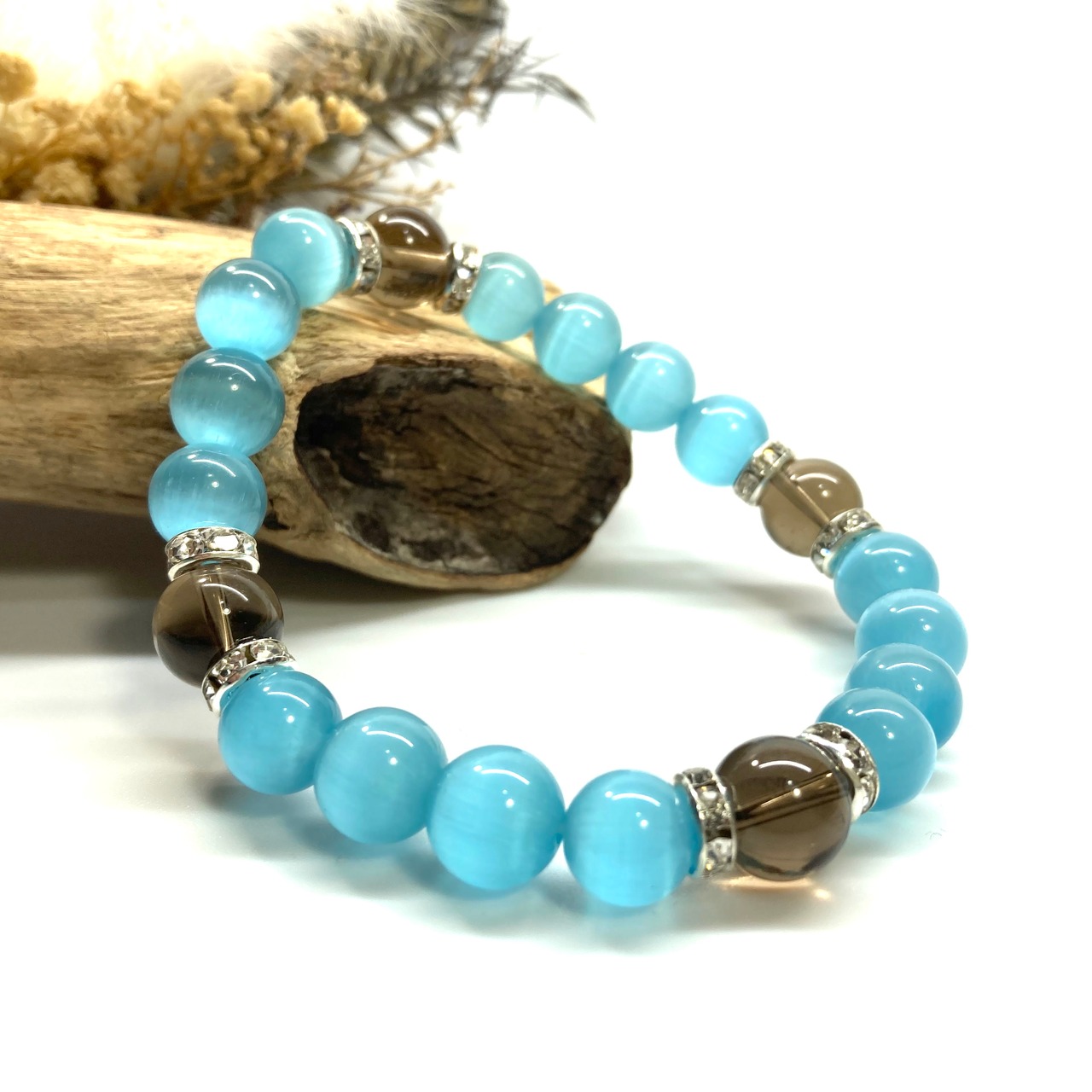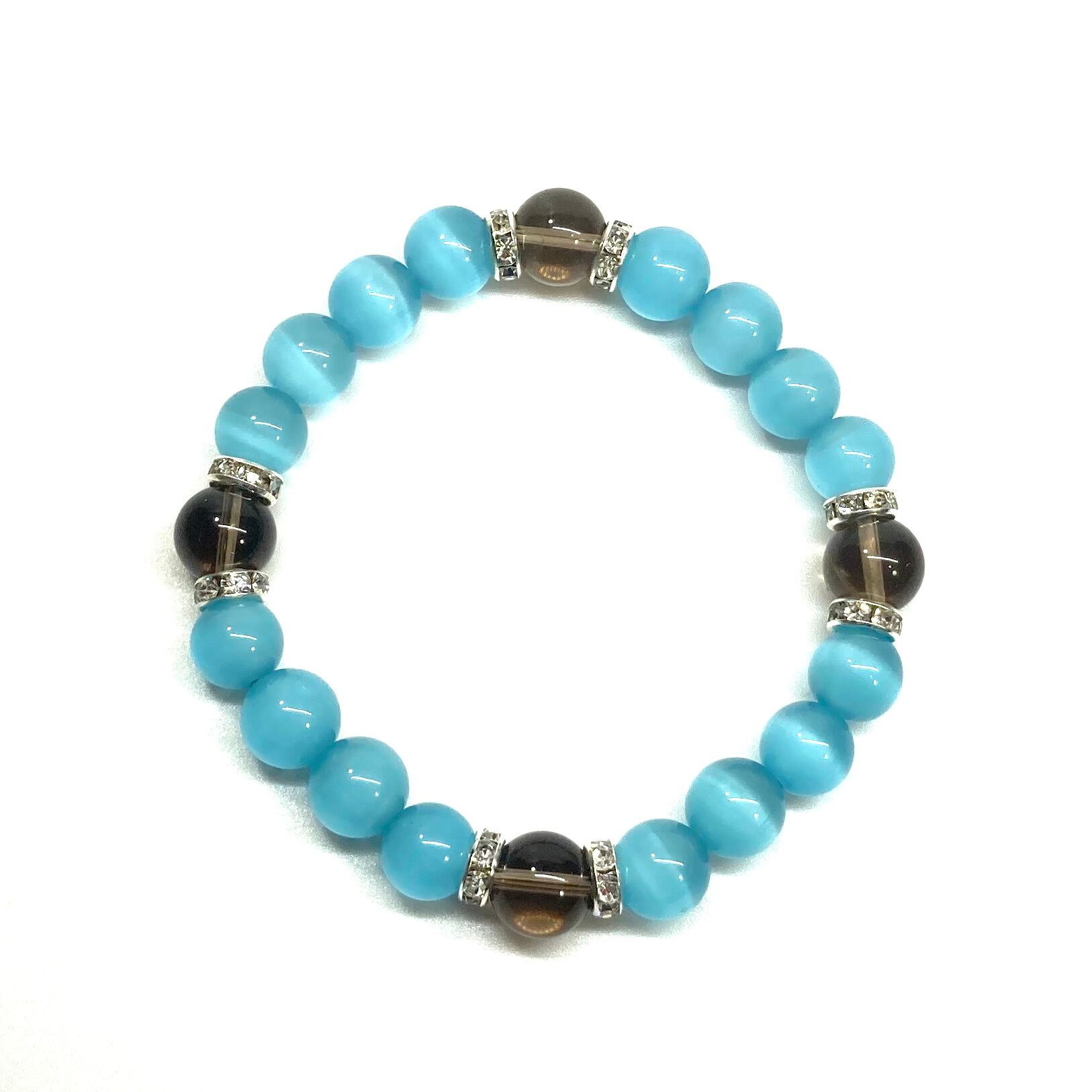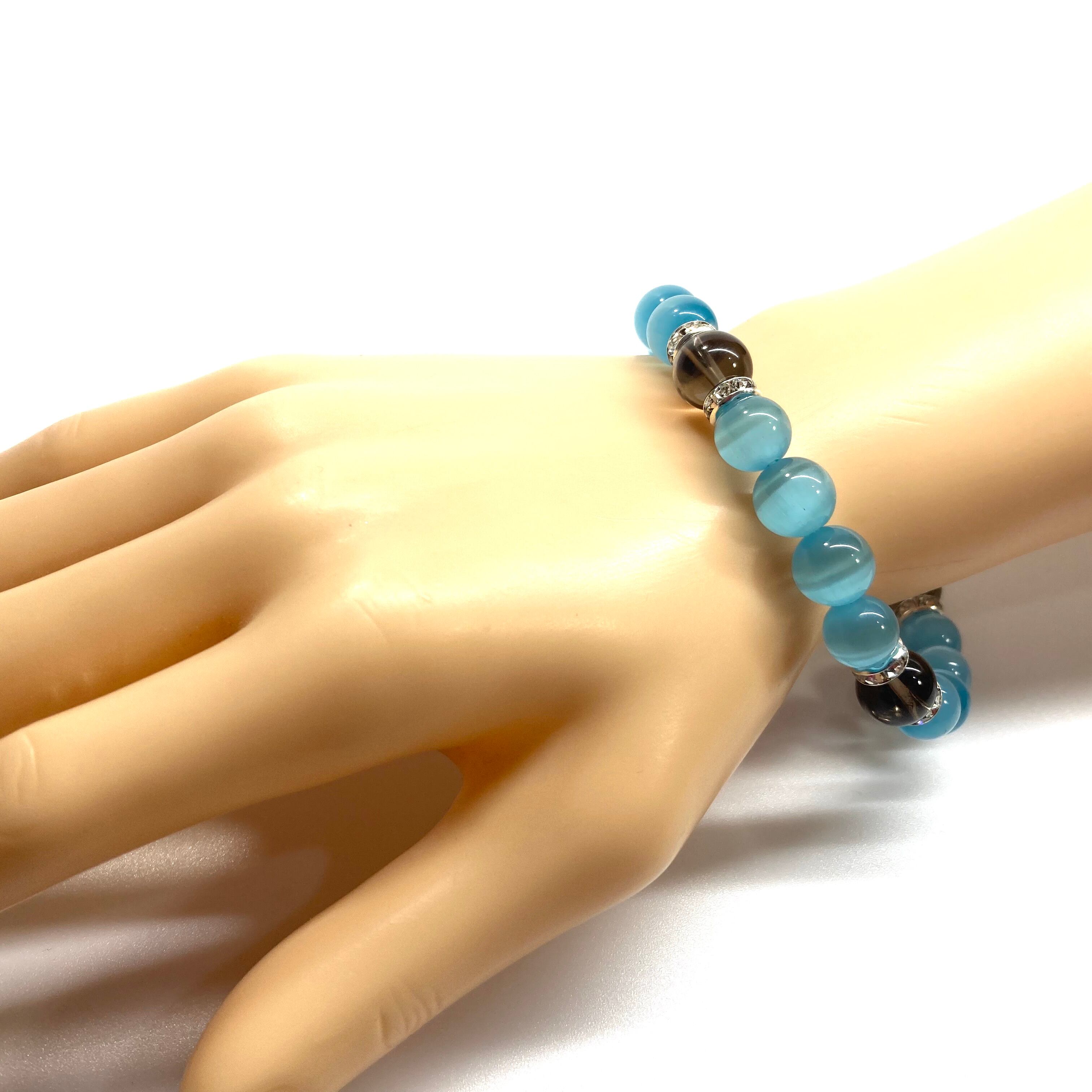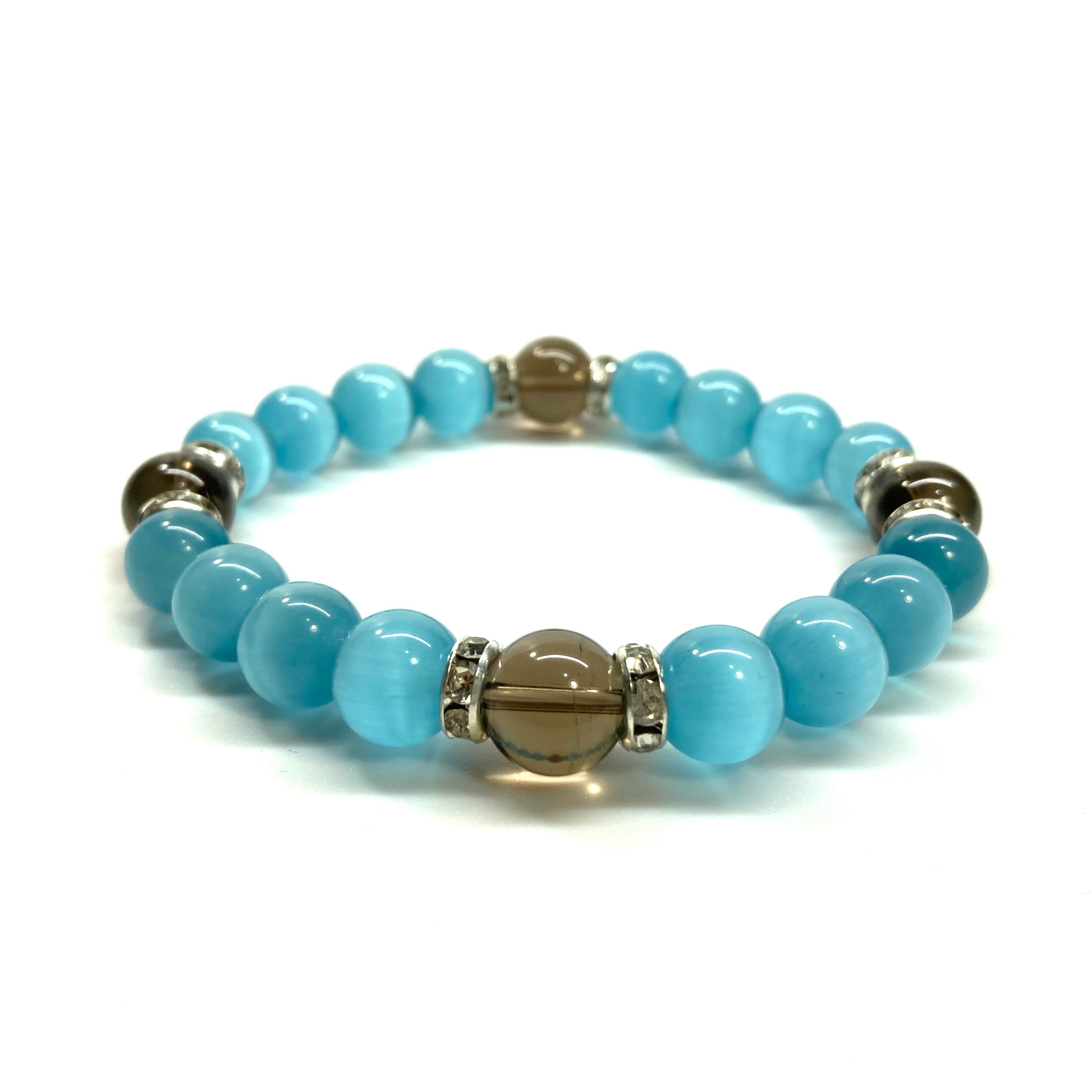 キャッツアイ(ライトブルー)×スモーキークォーツ パワーストーン ブレスレット (シルバー) メンズ・レディース 男性・女性 数珠ブレス 開運
