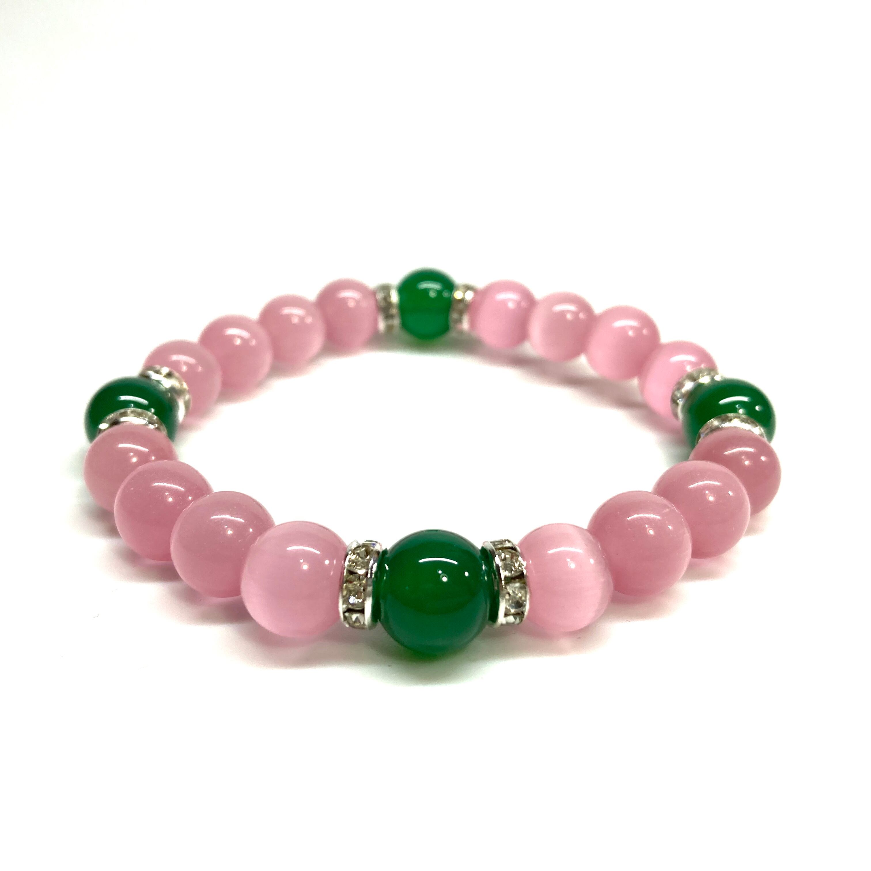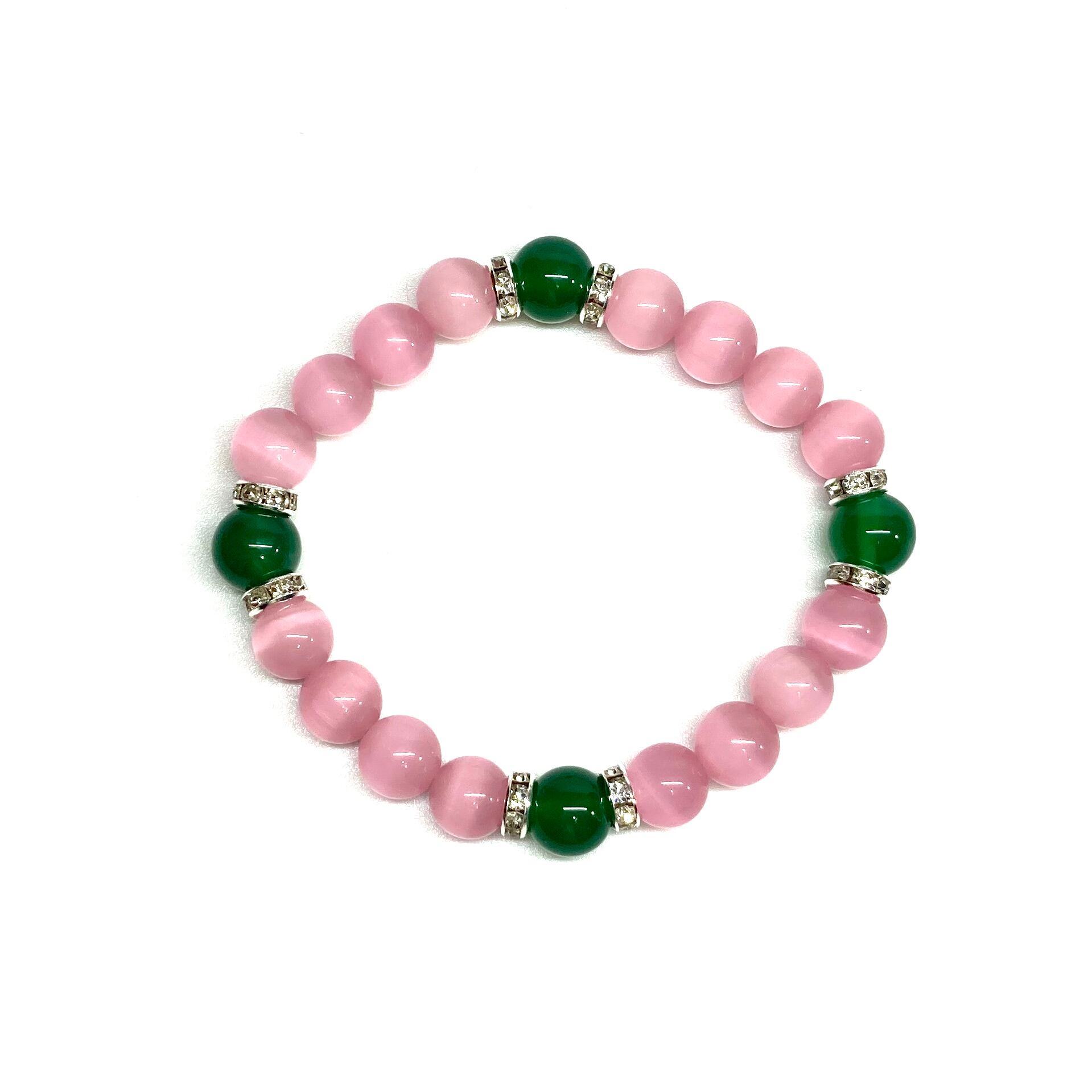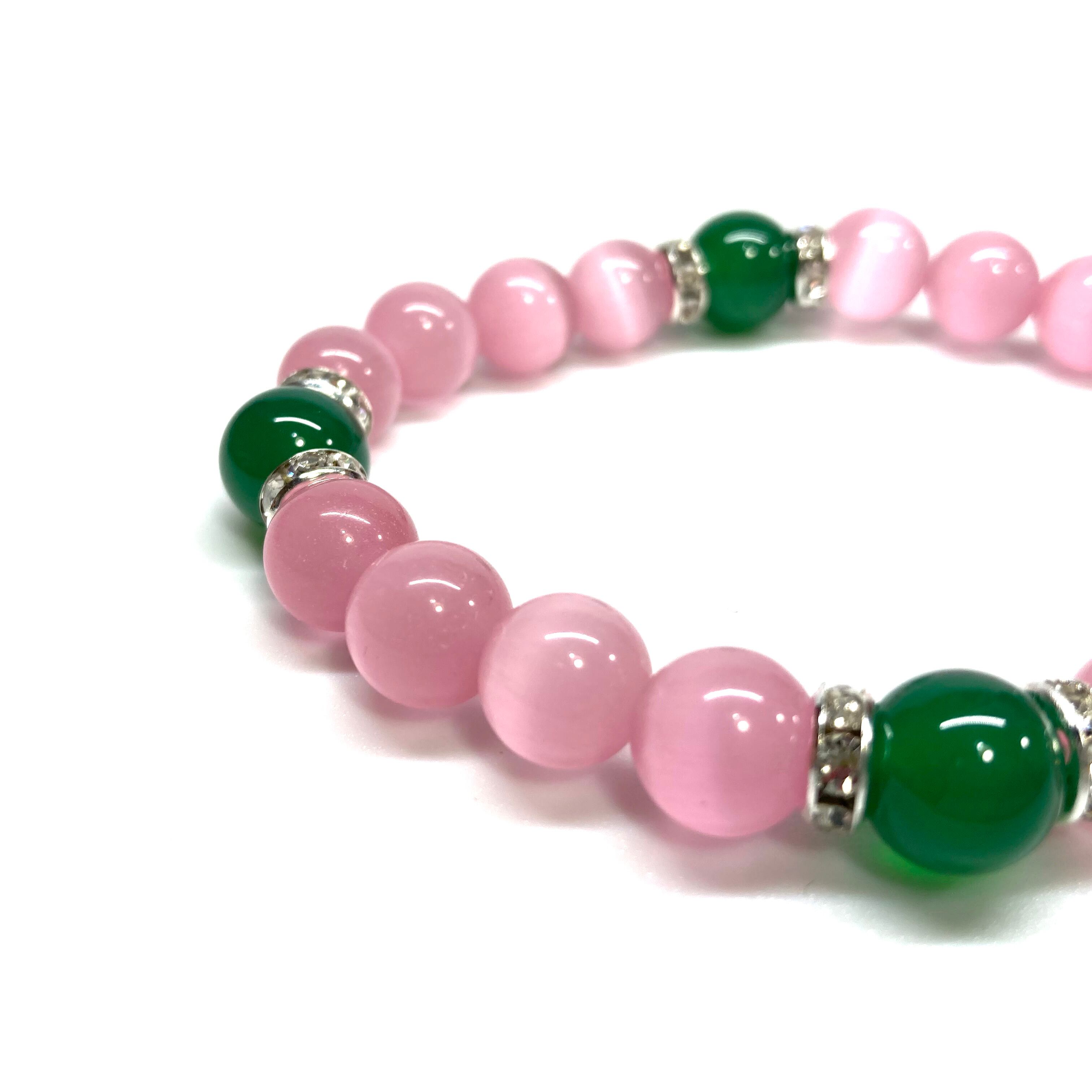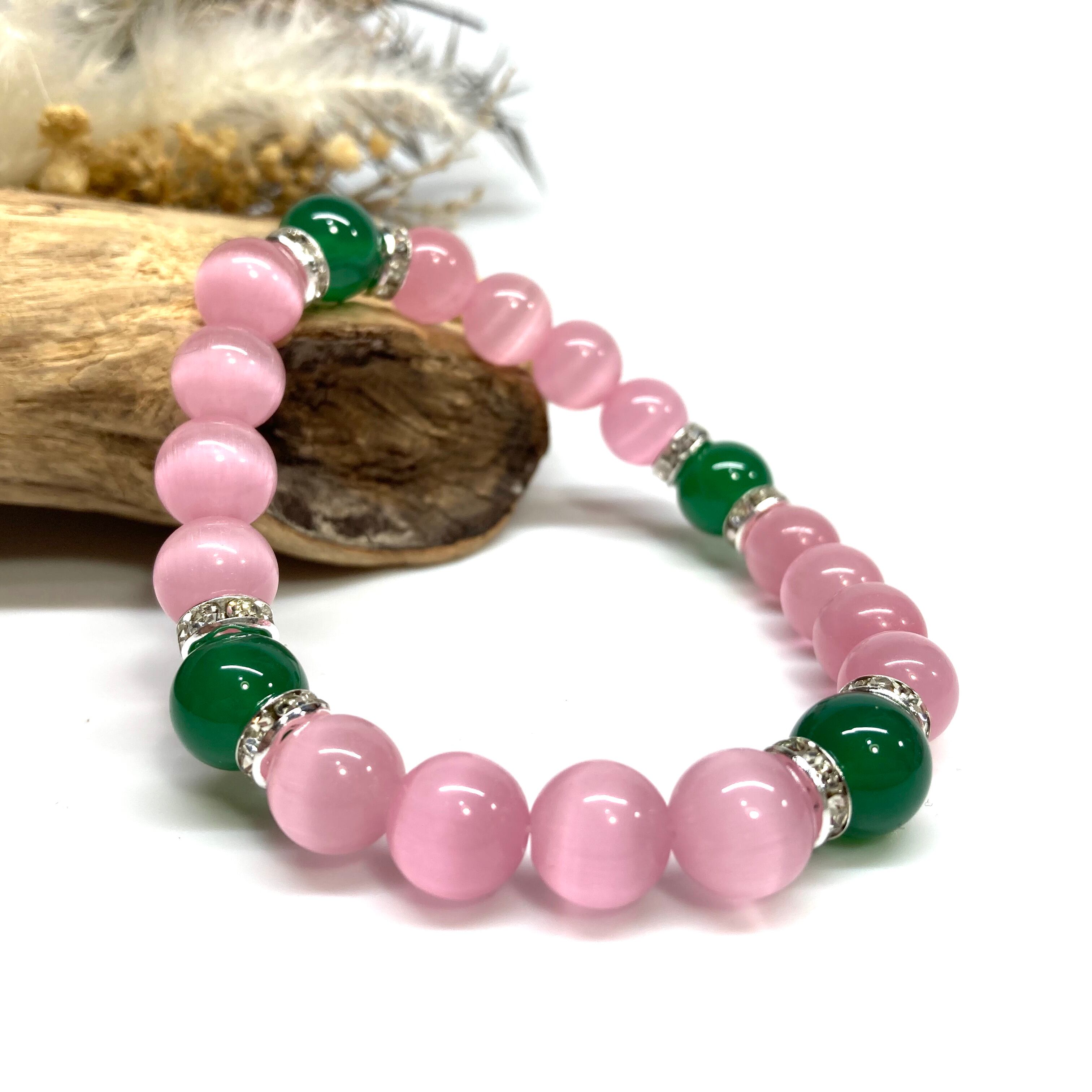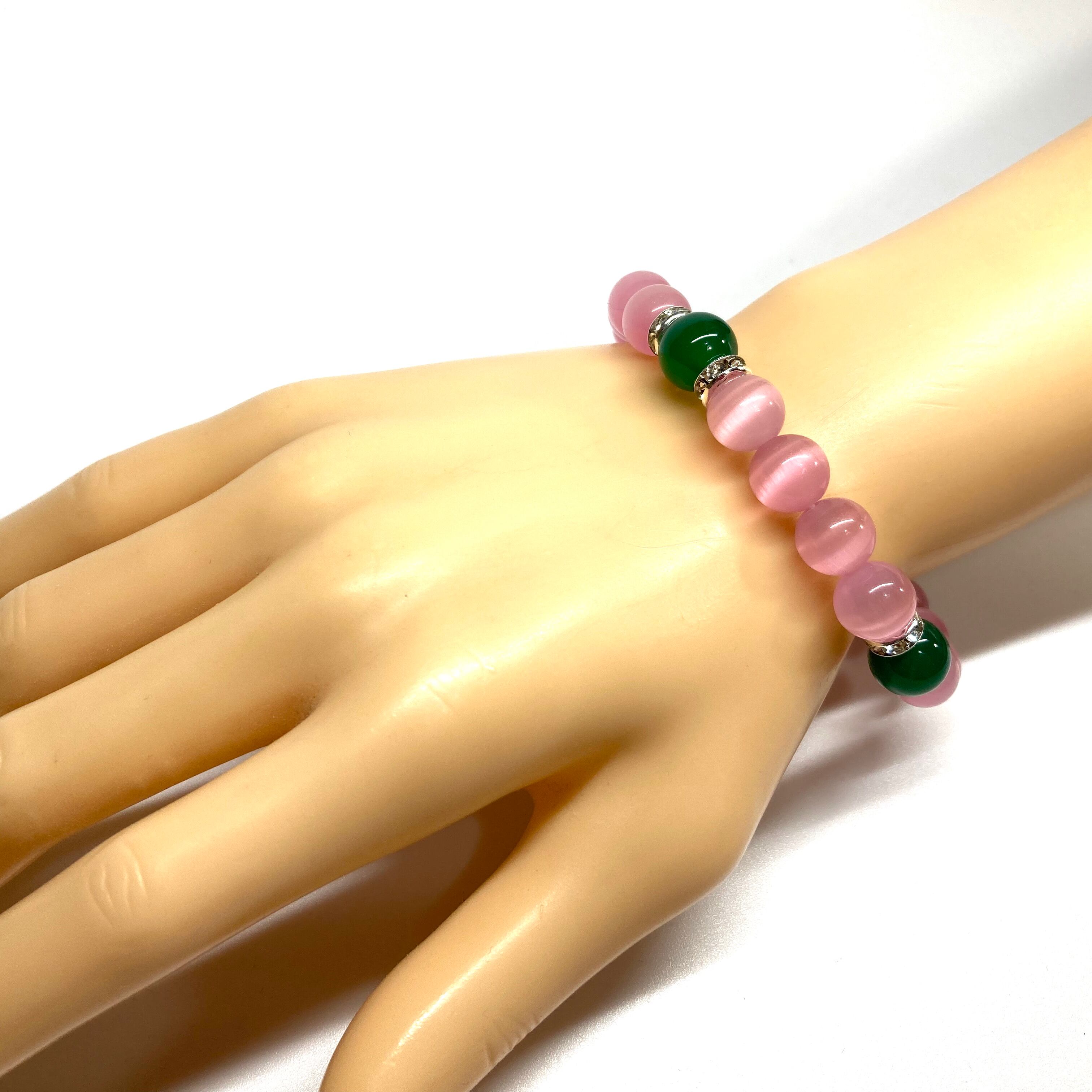キャッツアイ(ピンク)×緑瑪瑙 パワーストーン ブレスレット (シルバー) メンズ・レディース 男性・女性 数珠ブレス 開運