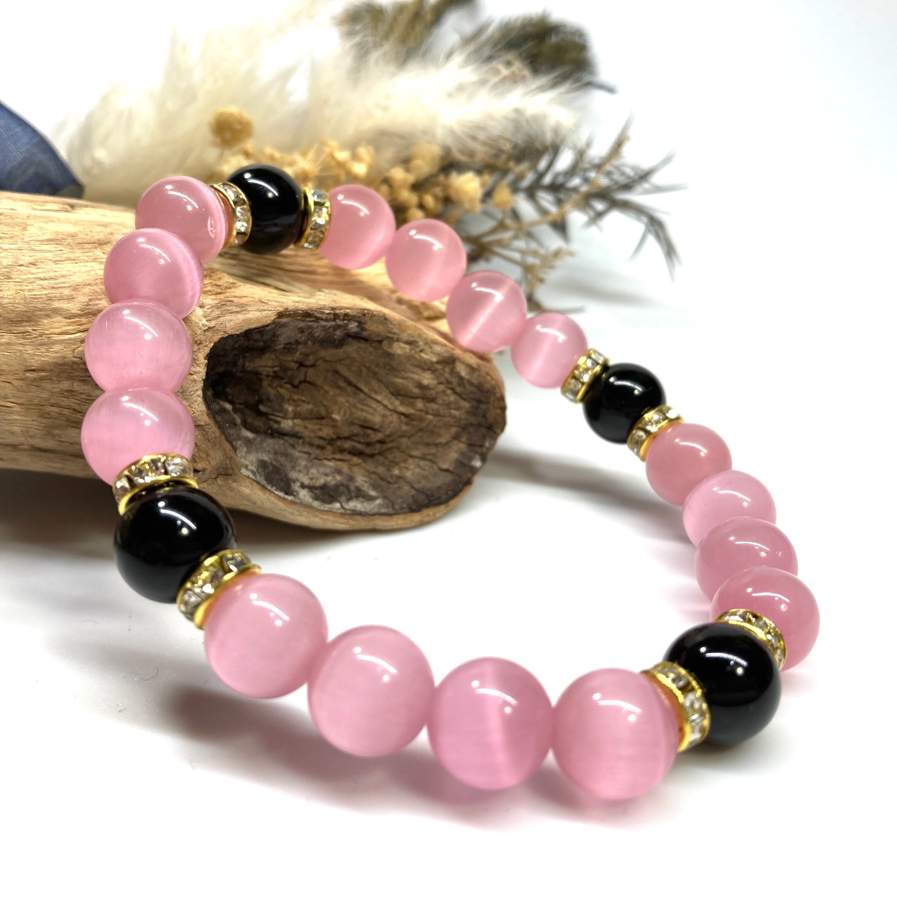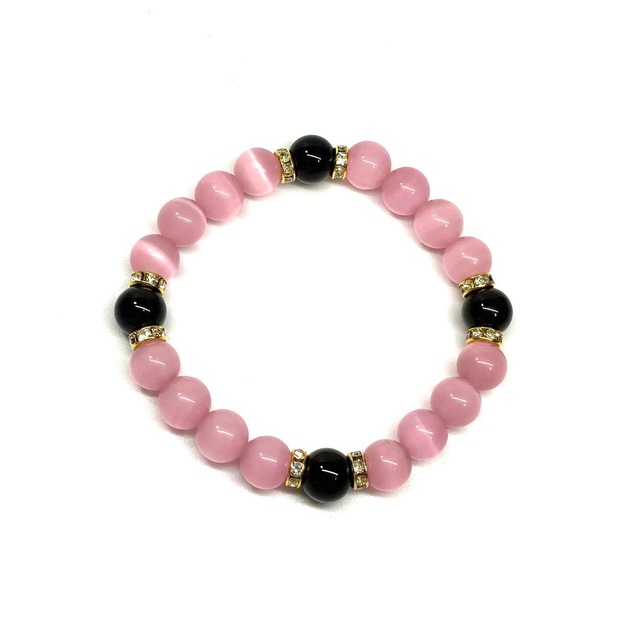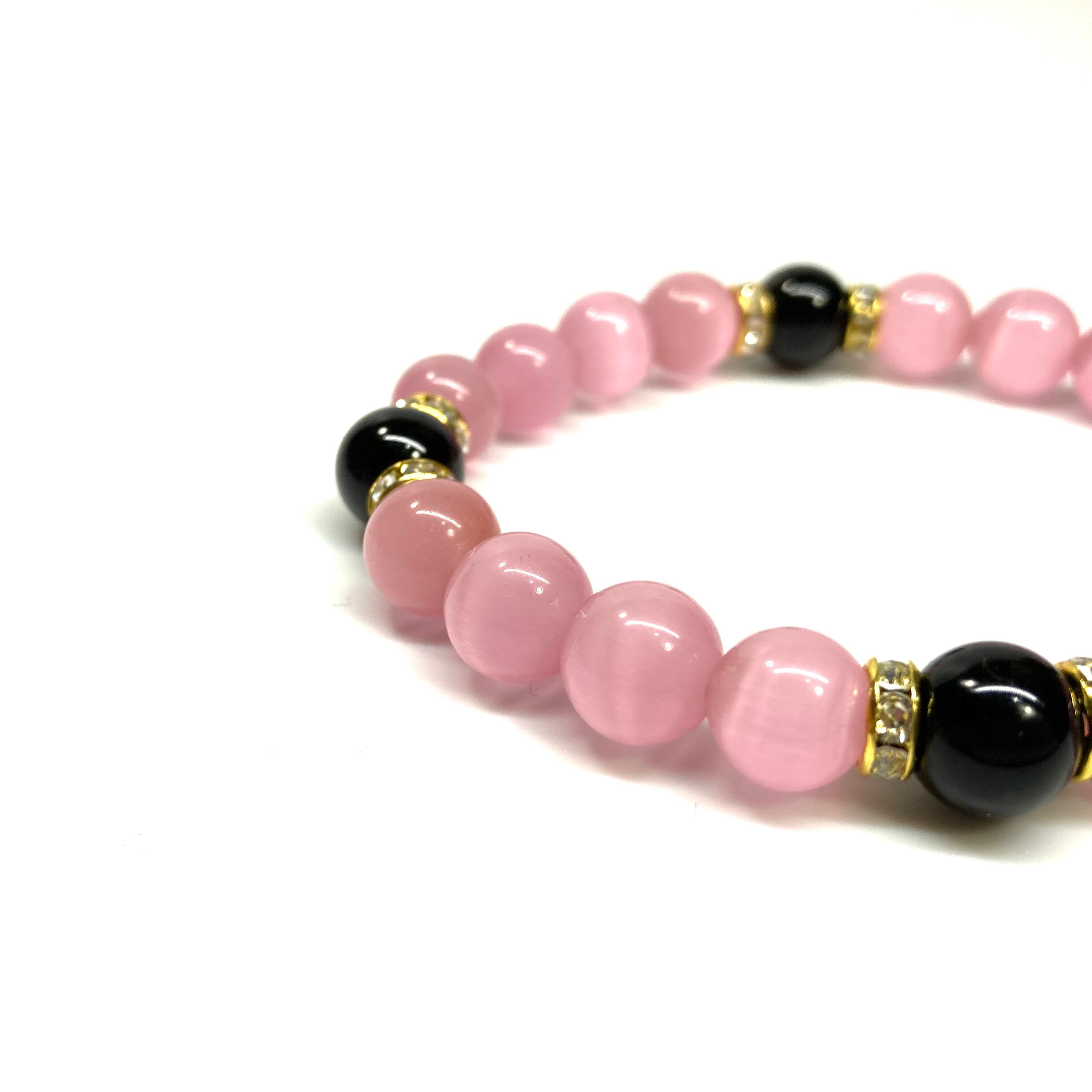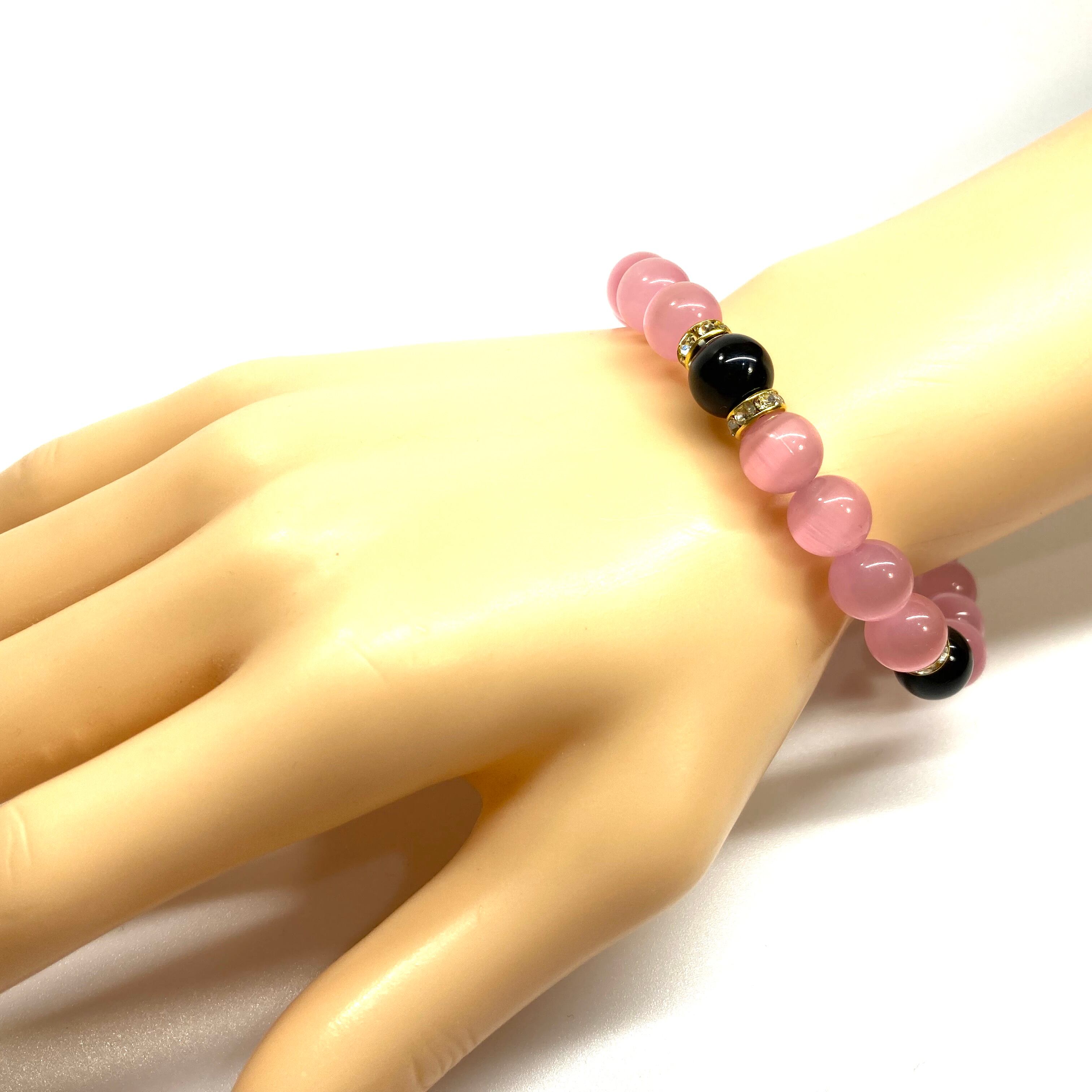 キャッツアイ(ピンク)×オニキス パワーストーン ブレスレット (ゴールド) メンズ・レディース 男性・女性 数珠ブレス 開運