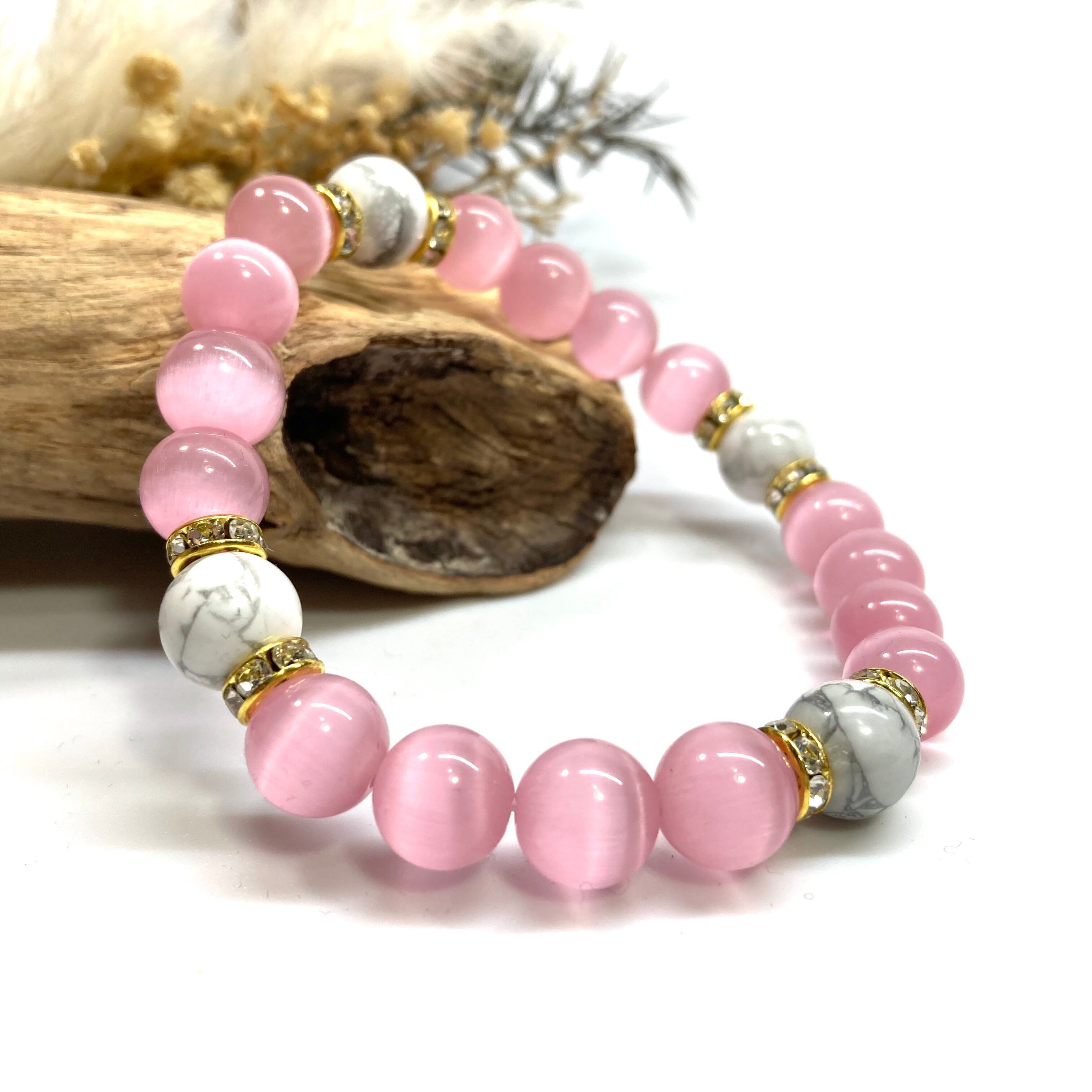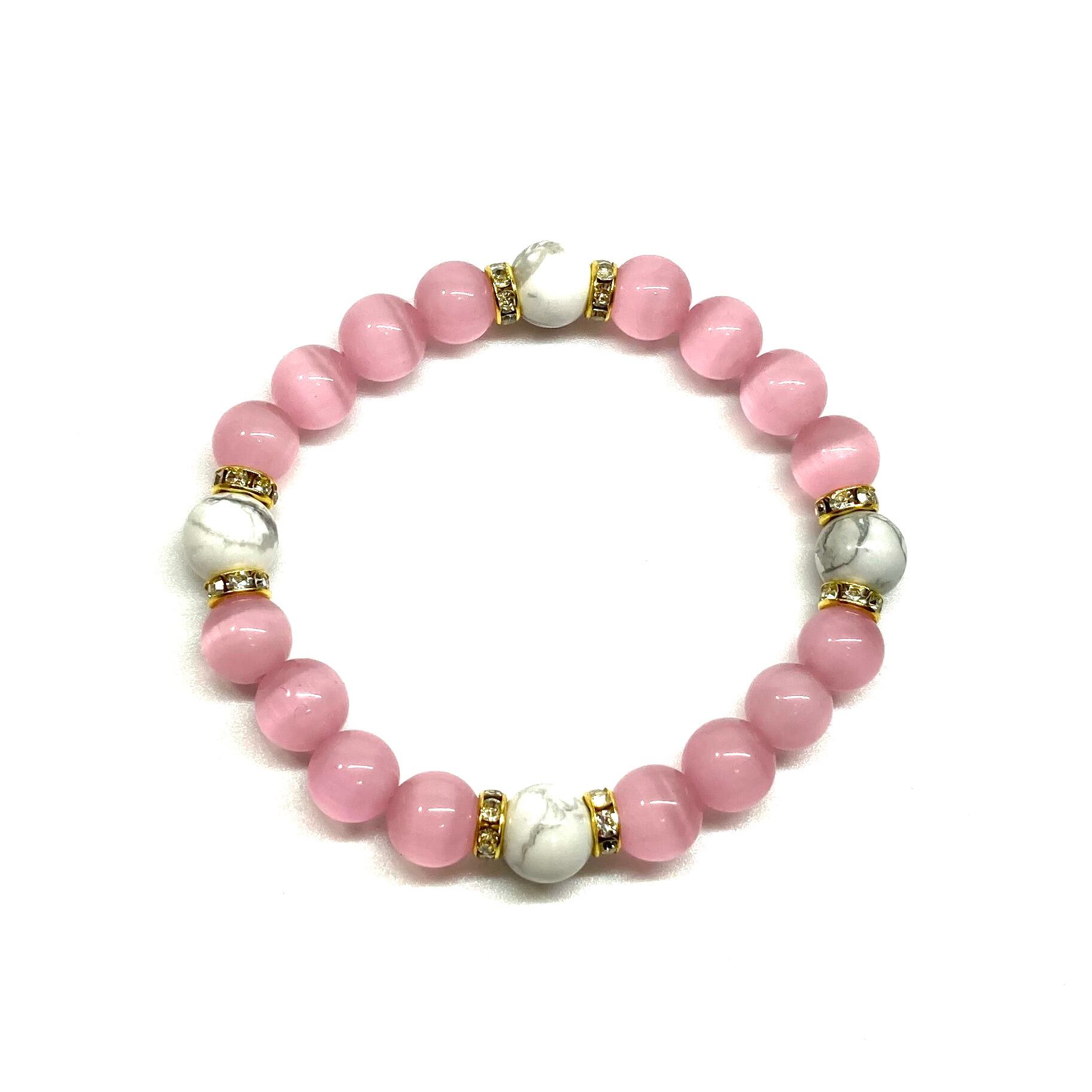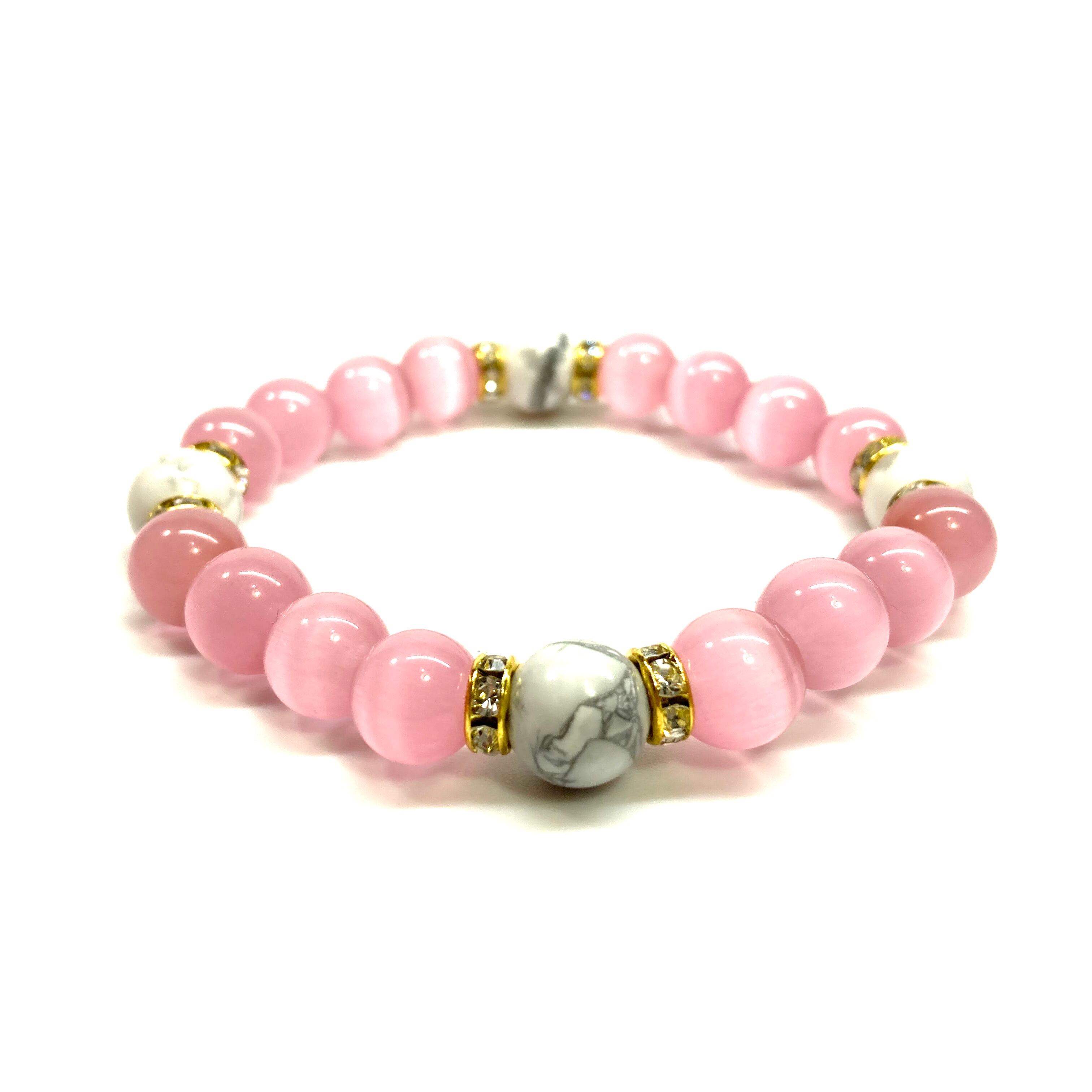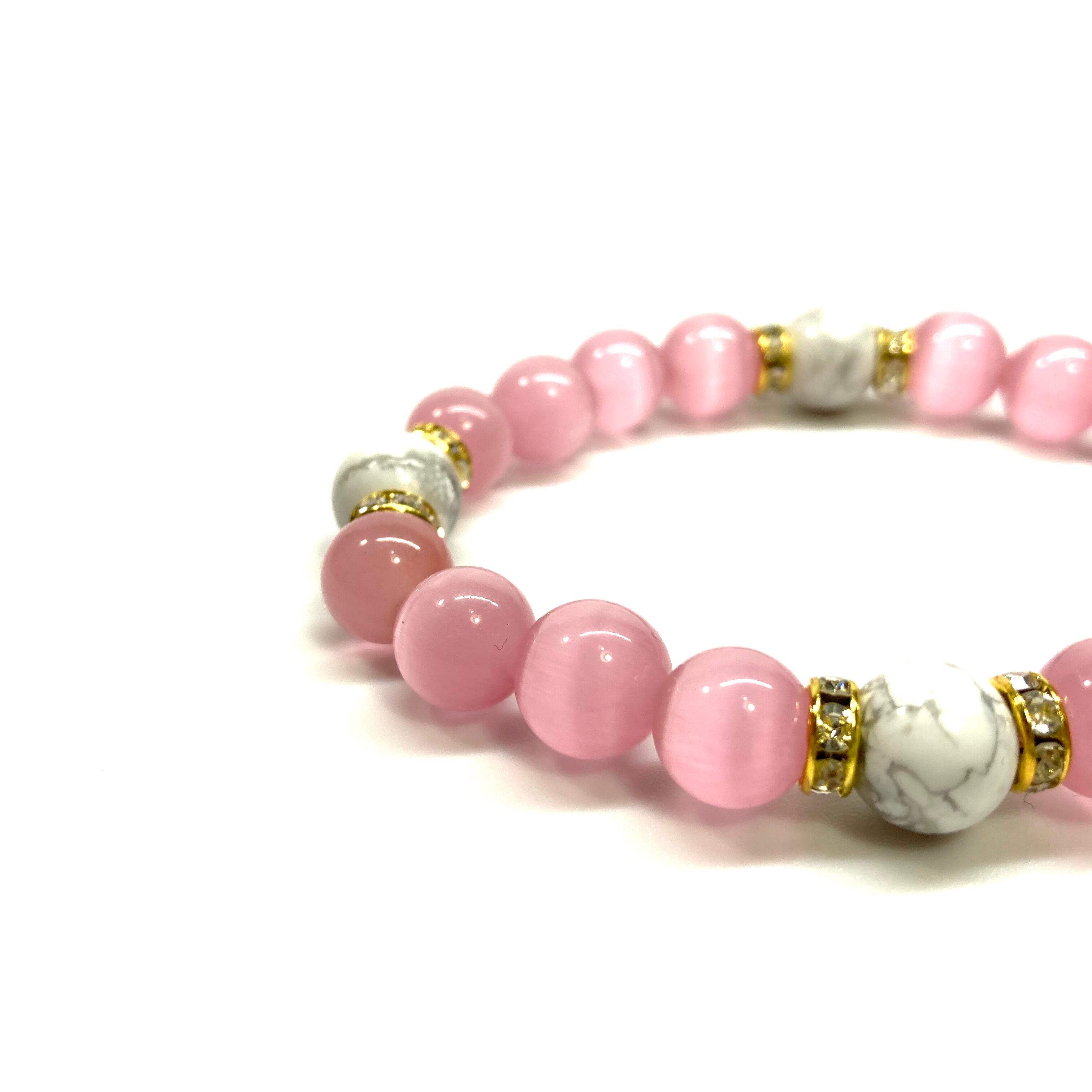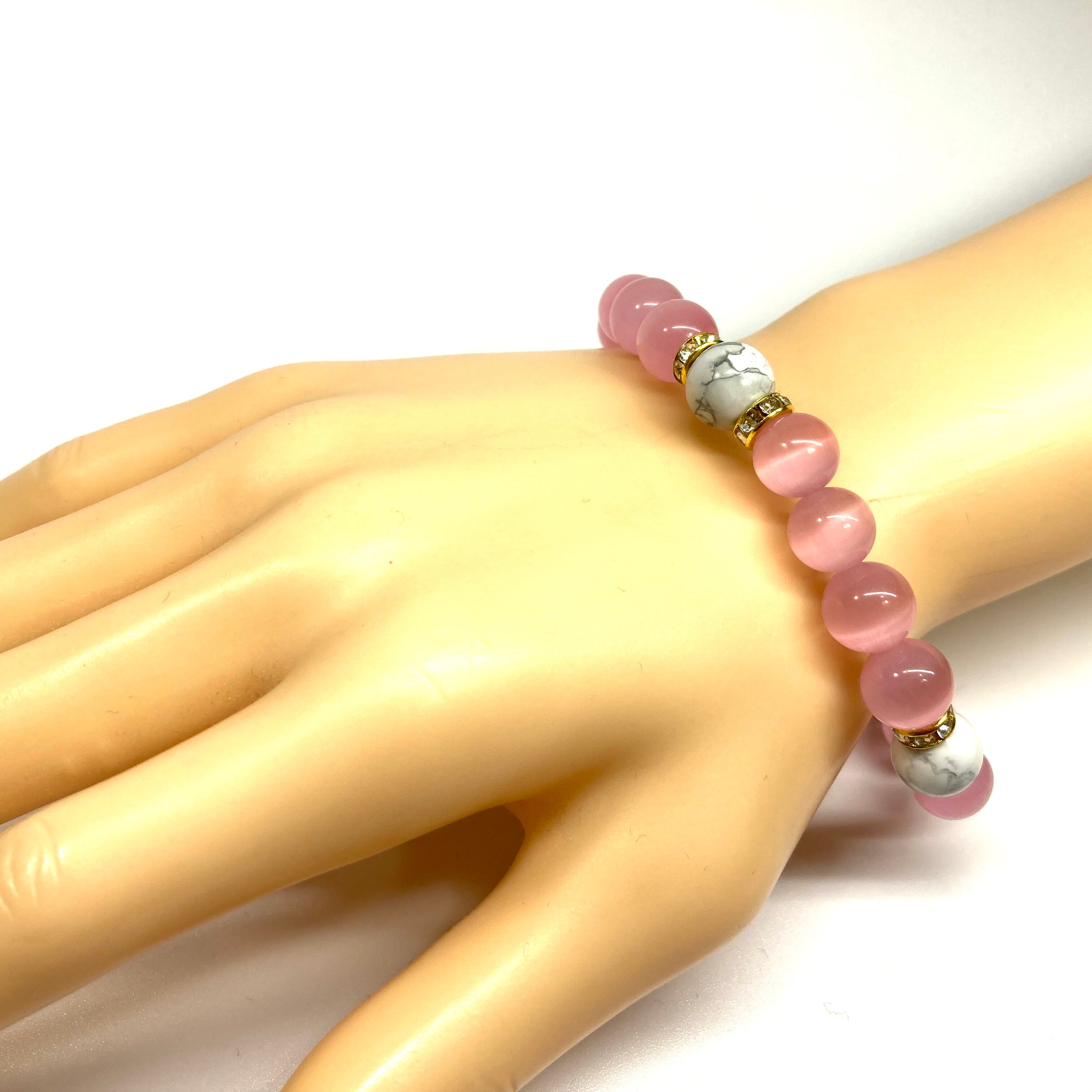 キャッツアイ(ピンク)×ハウライト パワーストーン ブレスレット (ゴールド) メンズ・レディース 男性・女性 数珠ブレス 開運