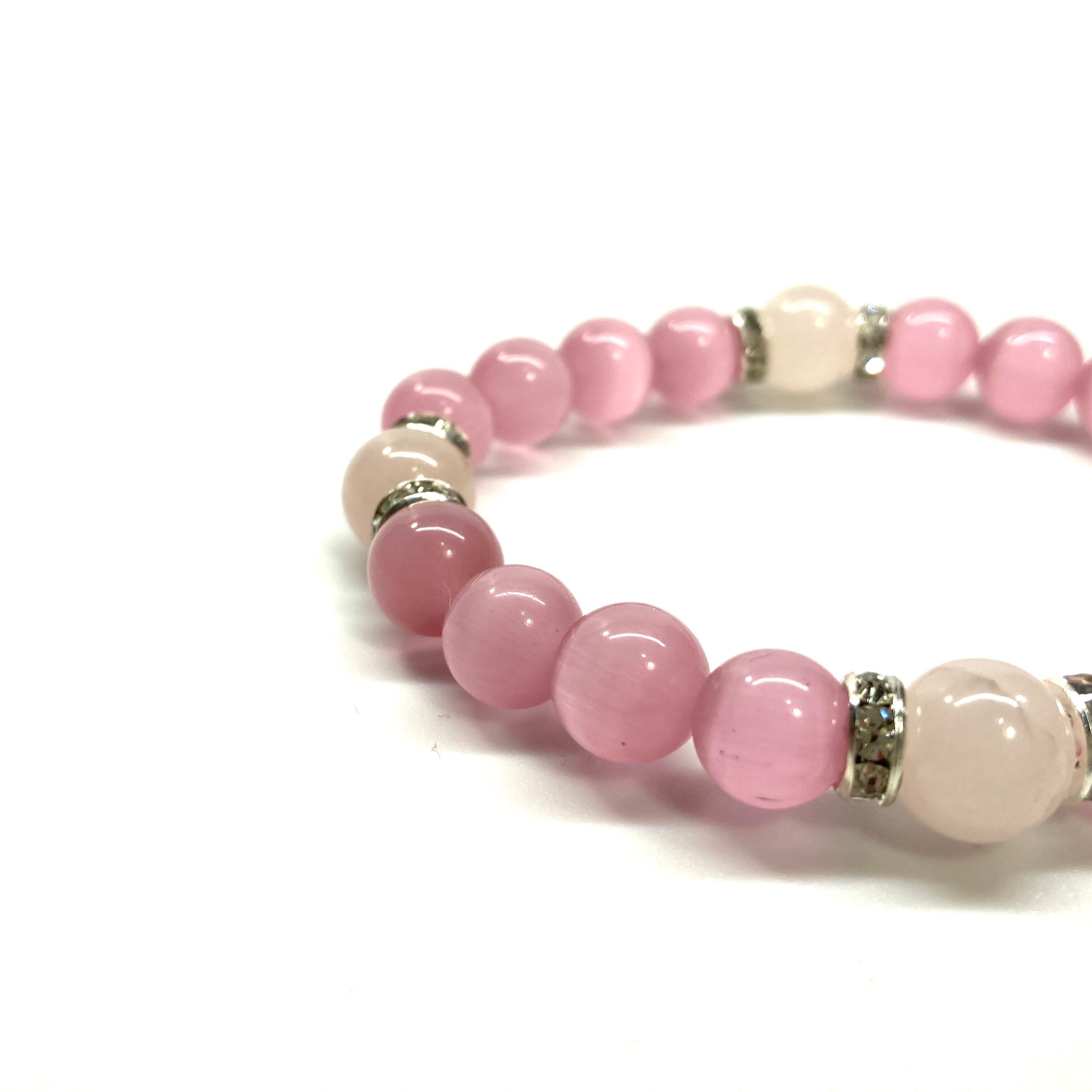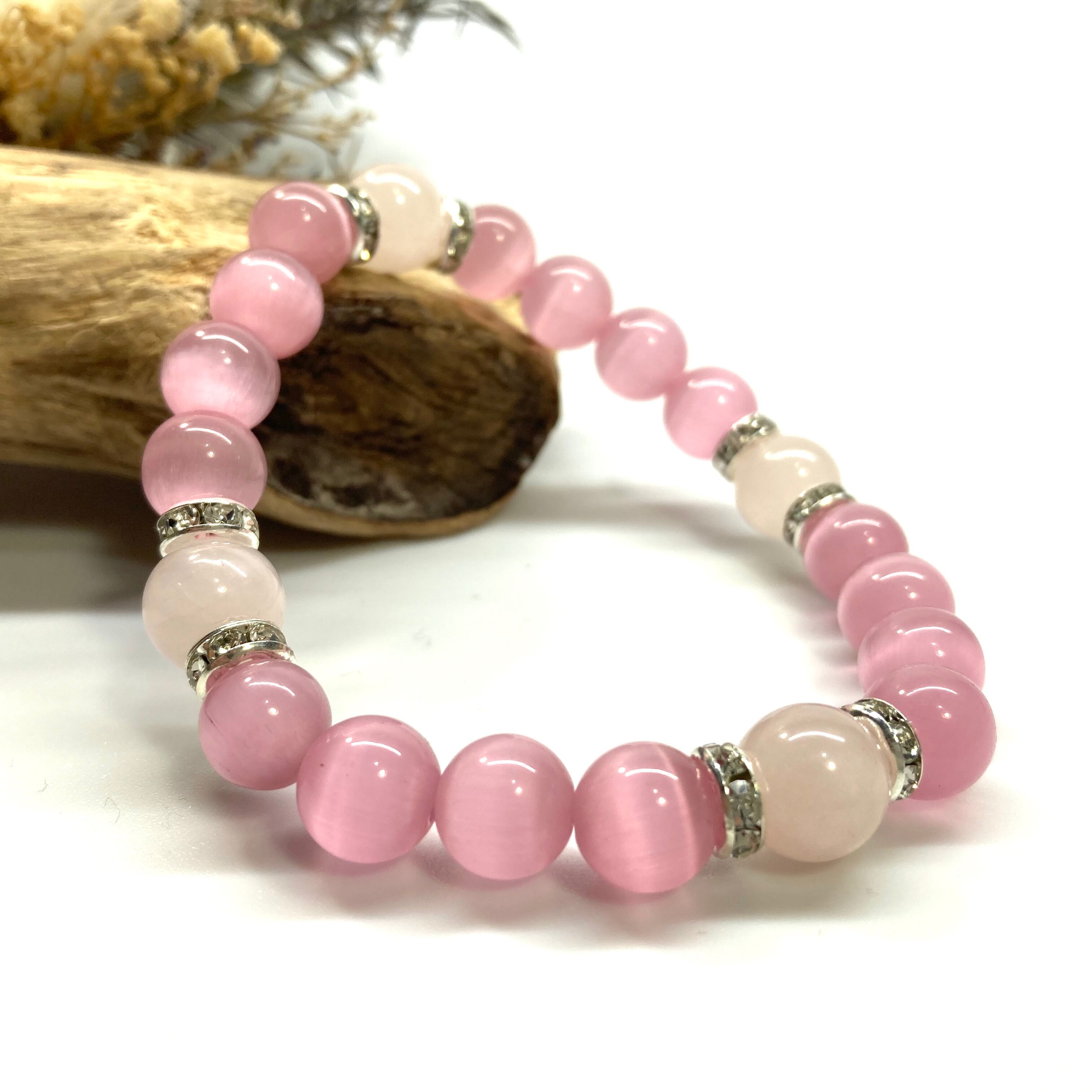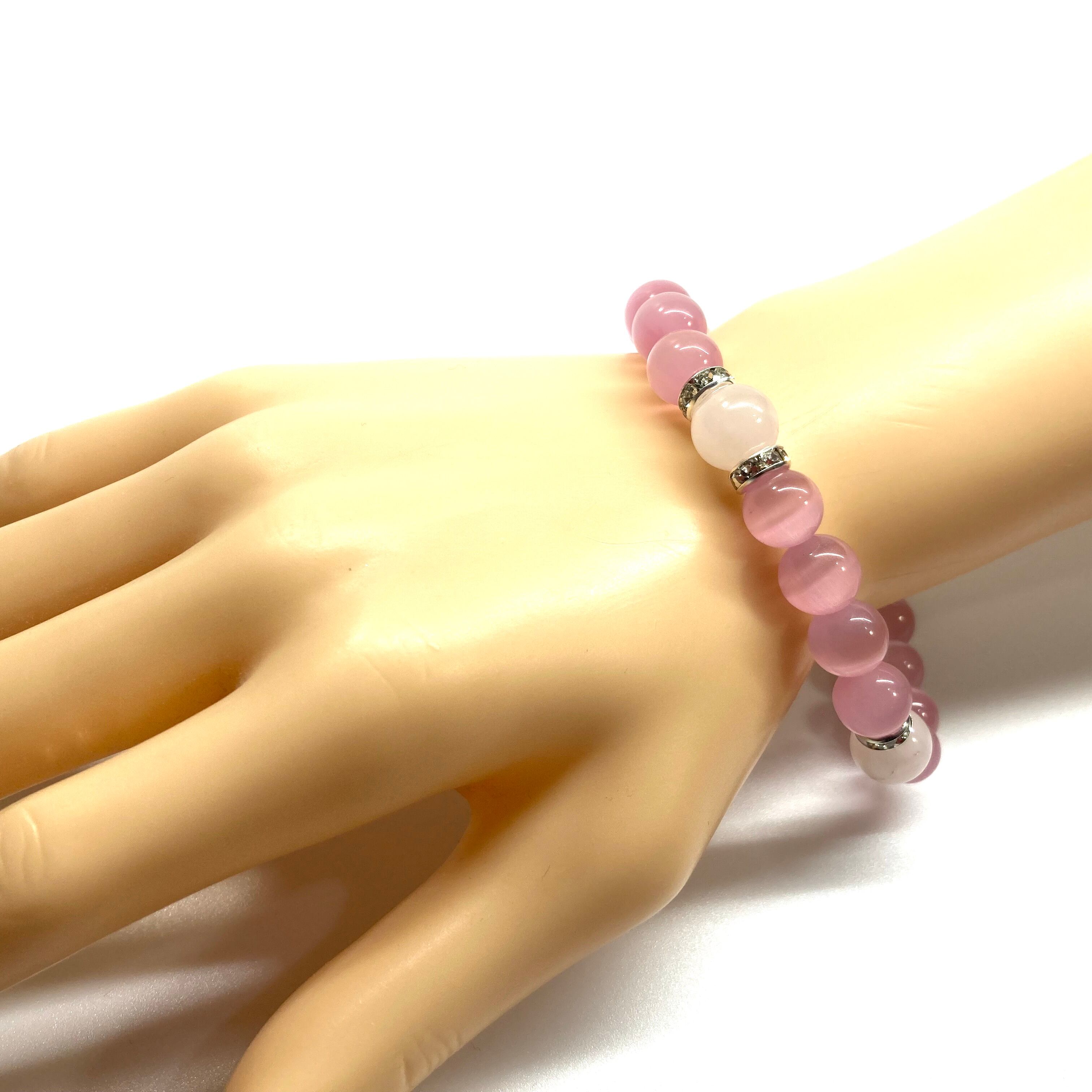 こちらは、キャッツアイとローズクォーツを組み合わせたブレスレットです。間にはロンデルを挟み高級感あるデザインに仕上がっています。石大きさは腕にも馴染みやすいように10mm玉で内周約17cm(伸可能)です。数に限りがございますので気になる方はお早めにどうぞ。