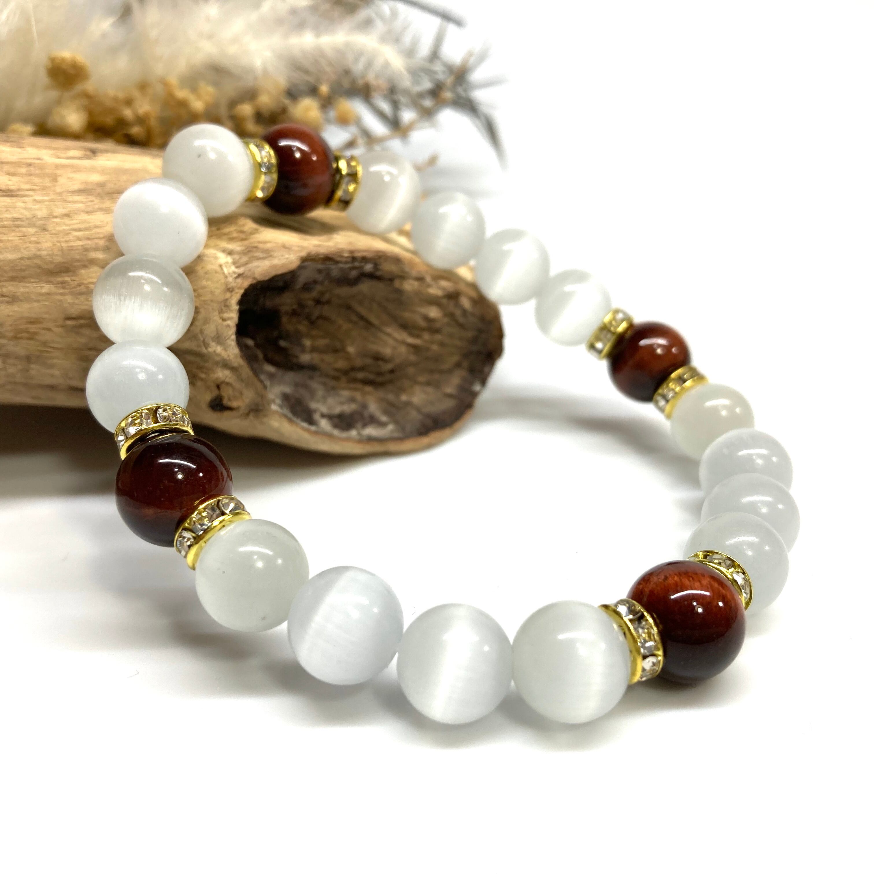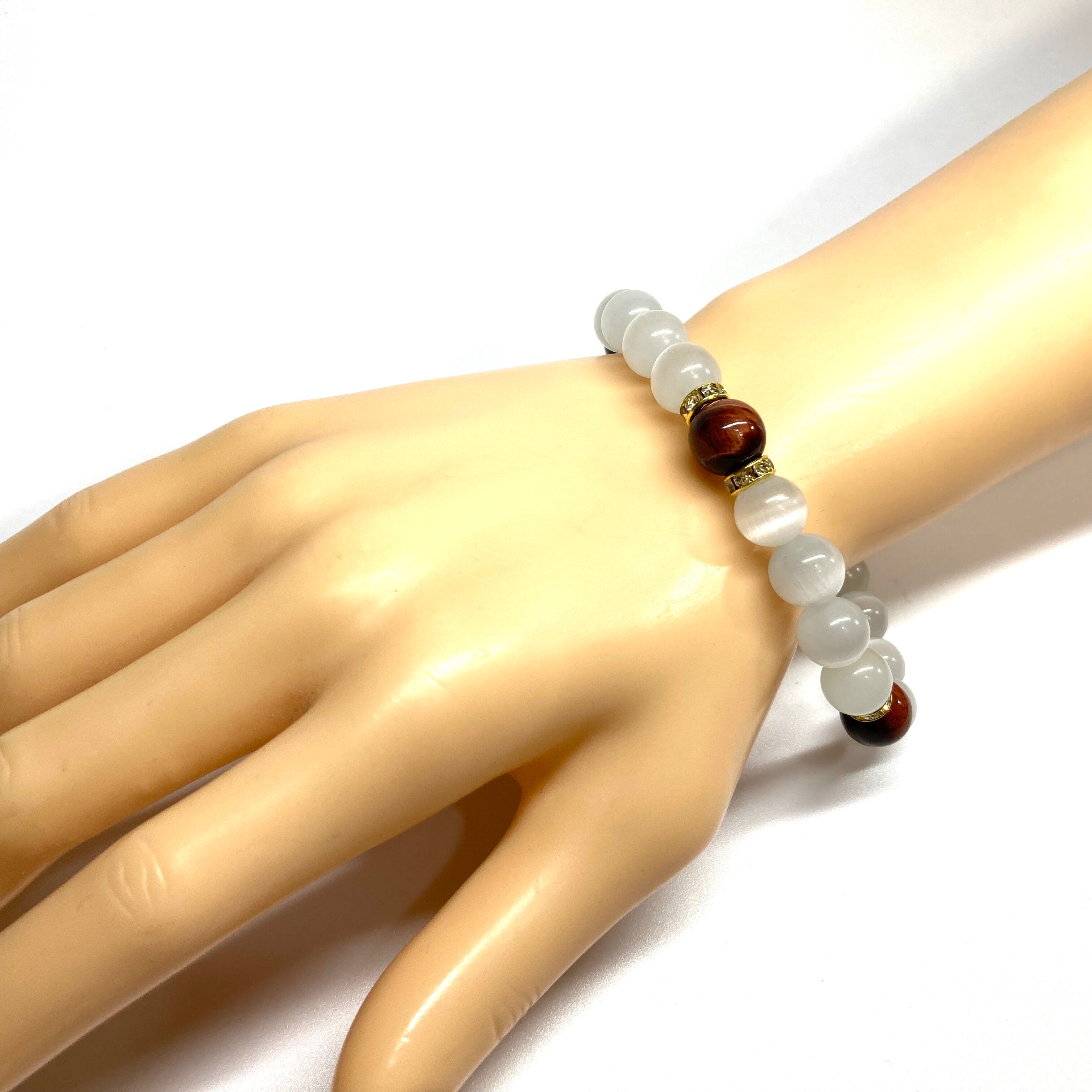 こちらは、キャッツアイとレッドタイガーアイを組み合わせたブレスレットです。間にはロンデルを挟み高級感あるデザインに仕上がっています。石大きさは腕にも馴染みやすいように10mm玉で内周約17cm(伸可能)です。数に限りがございますので気になる方はお早めにどうぞ。
