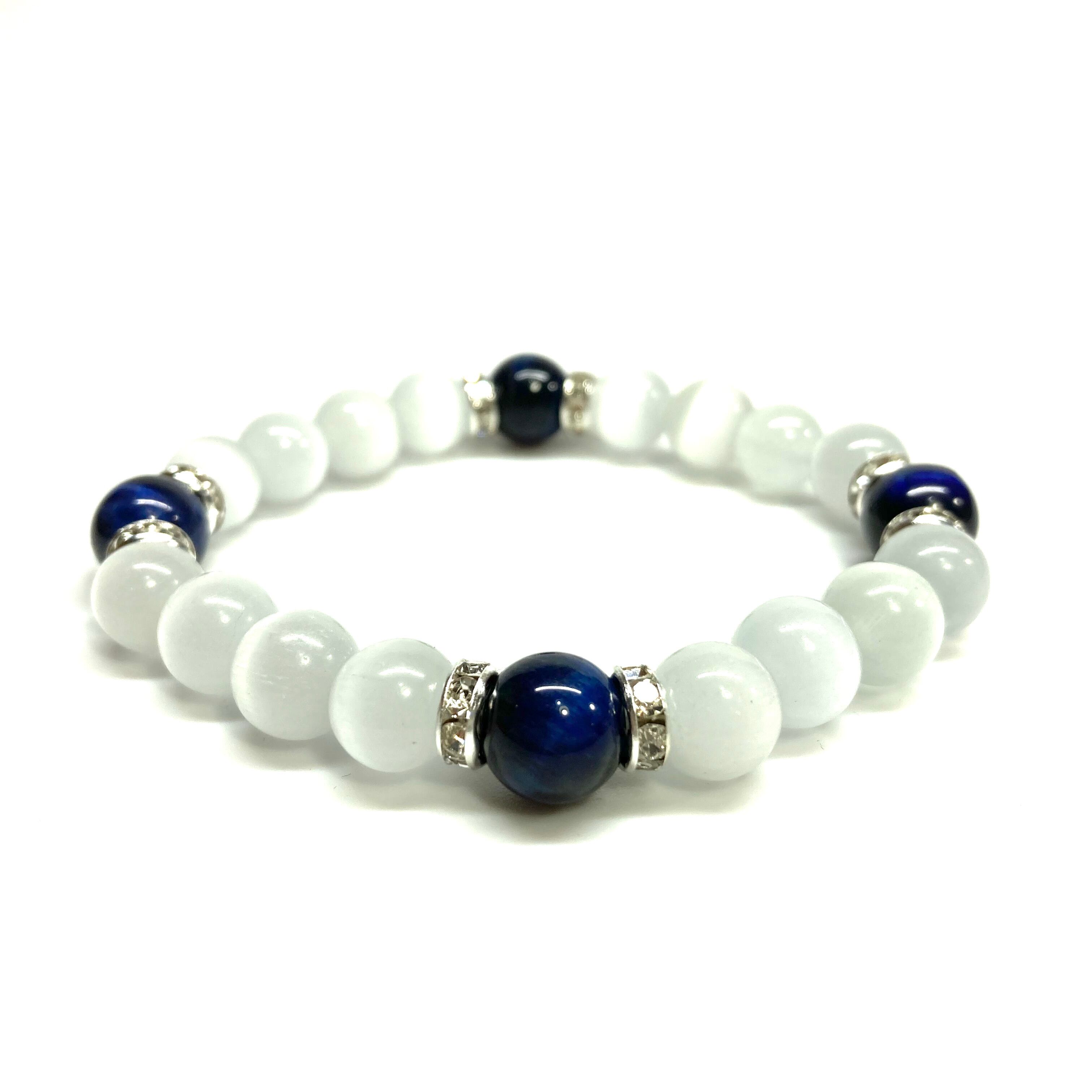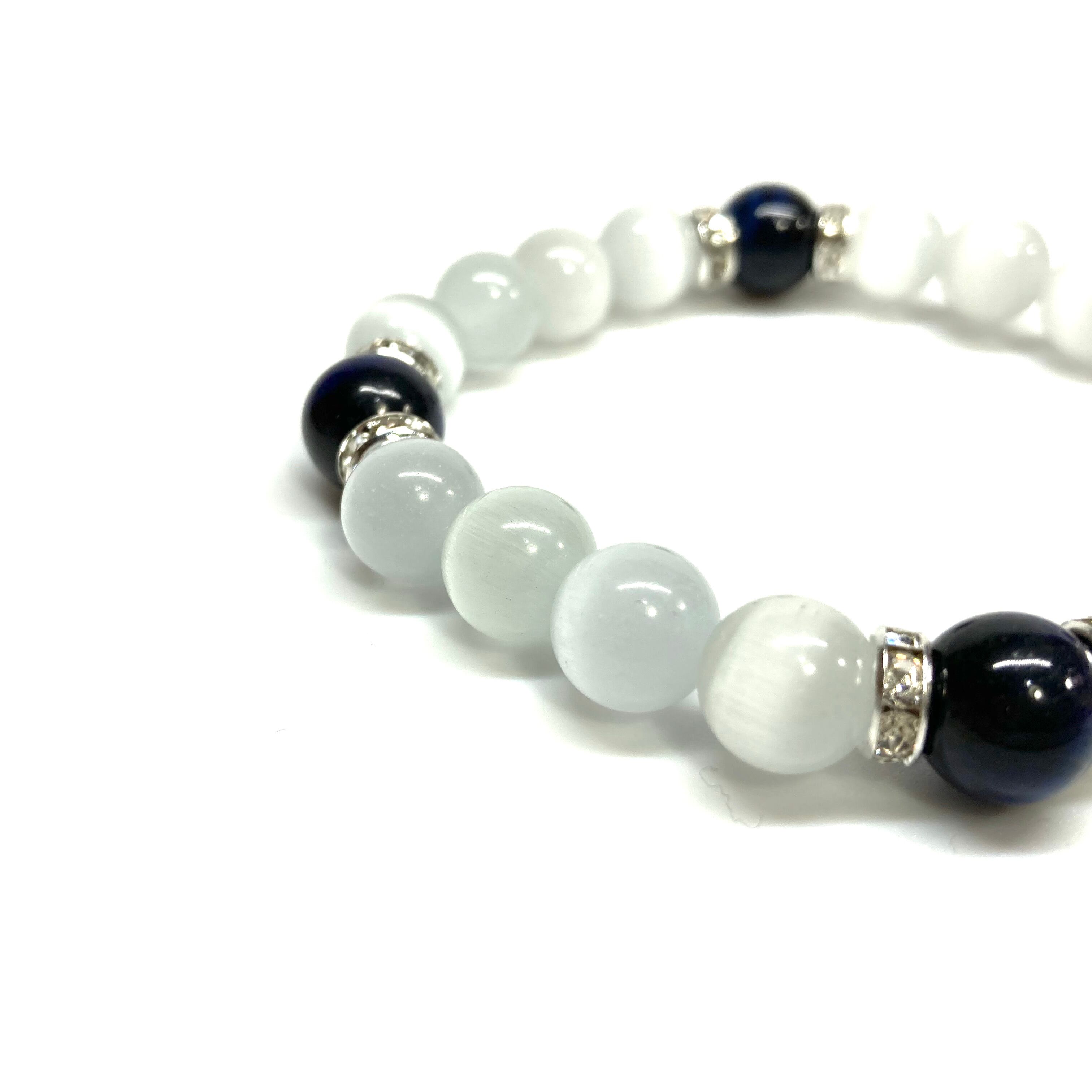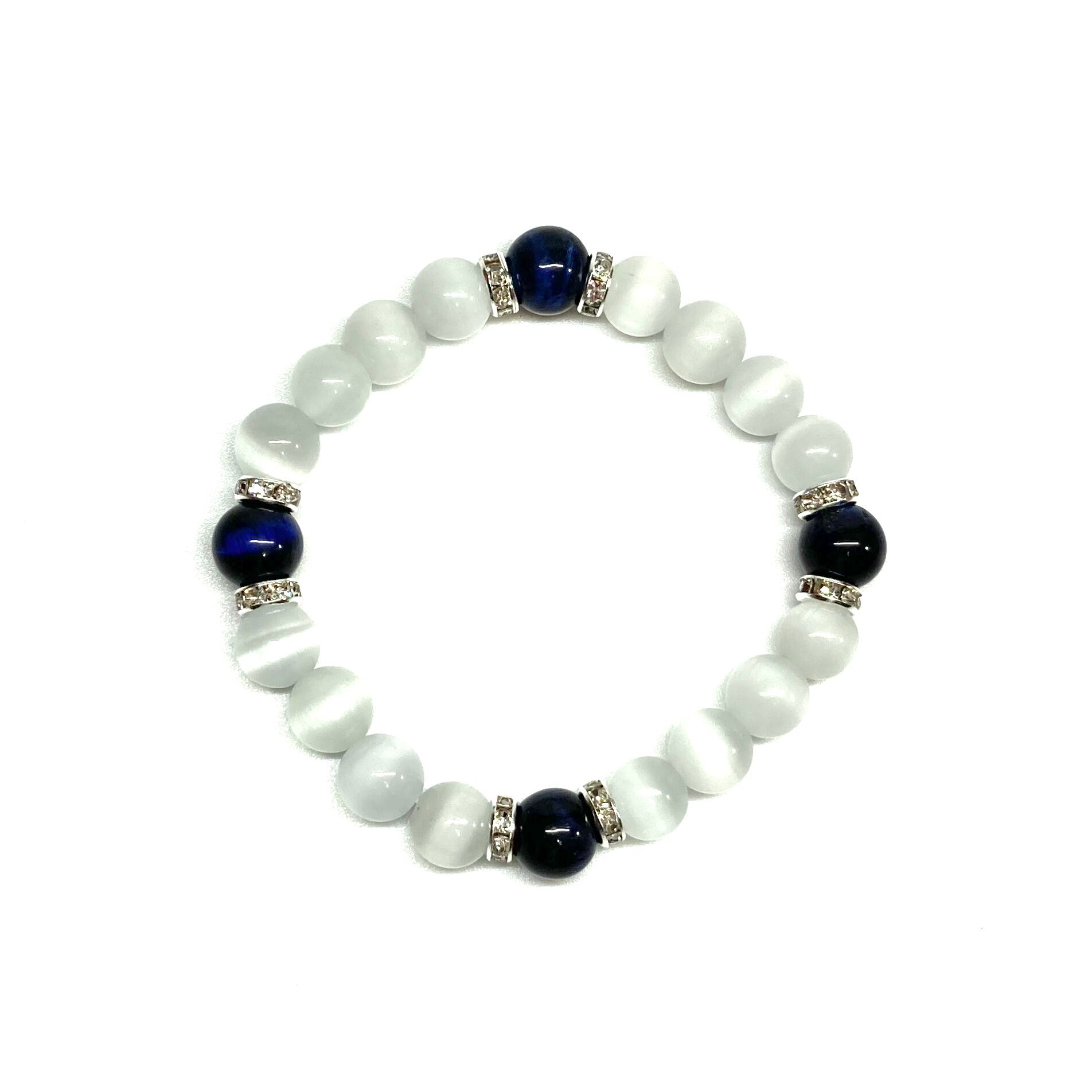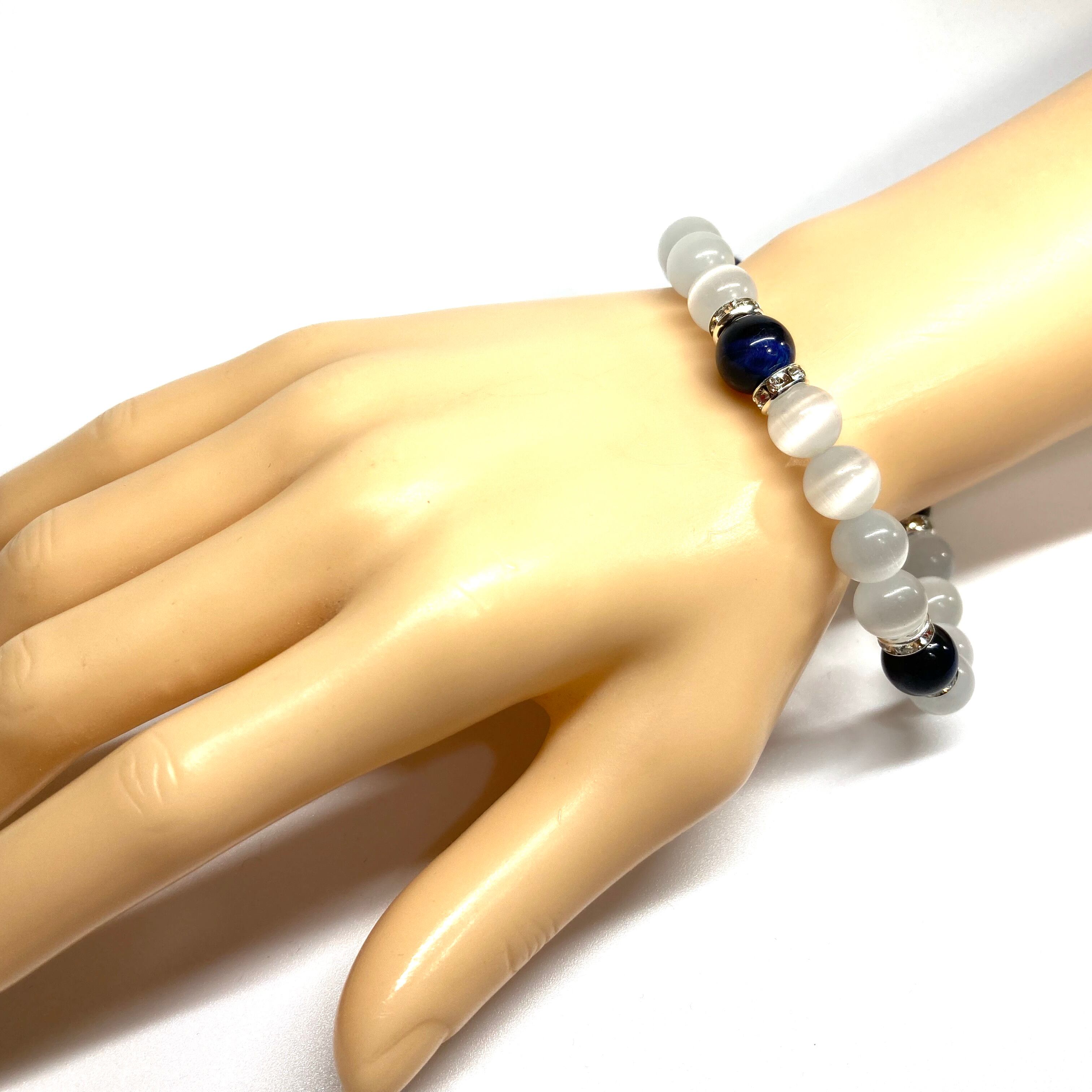 こちらは、キャッツアイとブルータイガーアイを組み合わせたブレスレットです。間にはロンデルを挟み高級感あるデザインに仕上がっています。石大きさは腕にも馴染みやすいように10mm玉で内周約17cm(伸可能)です。数に限りがございますので気になる方はお早めにどうぞ。