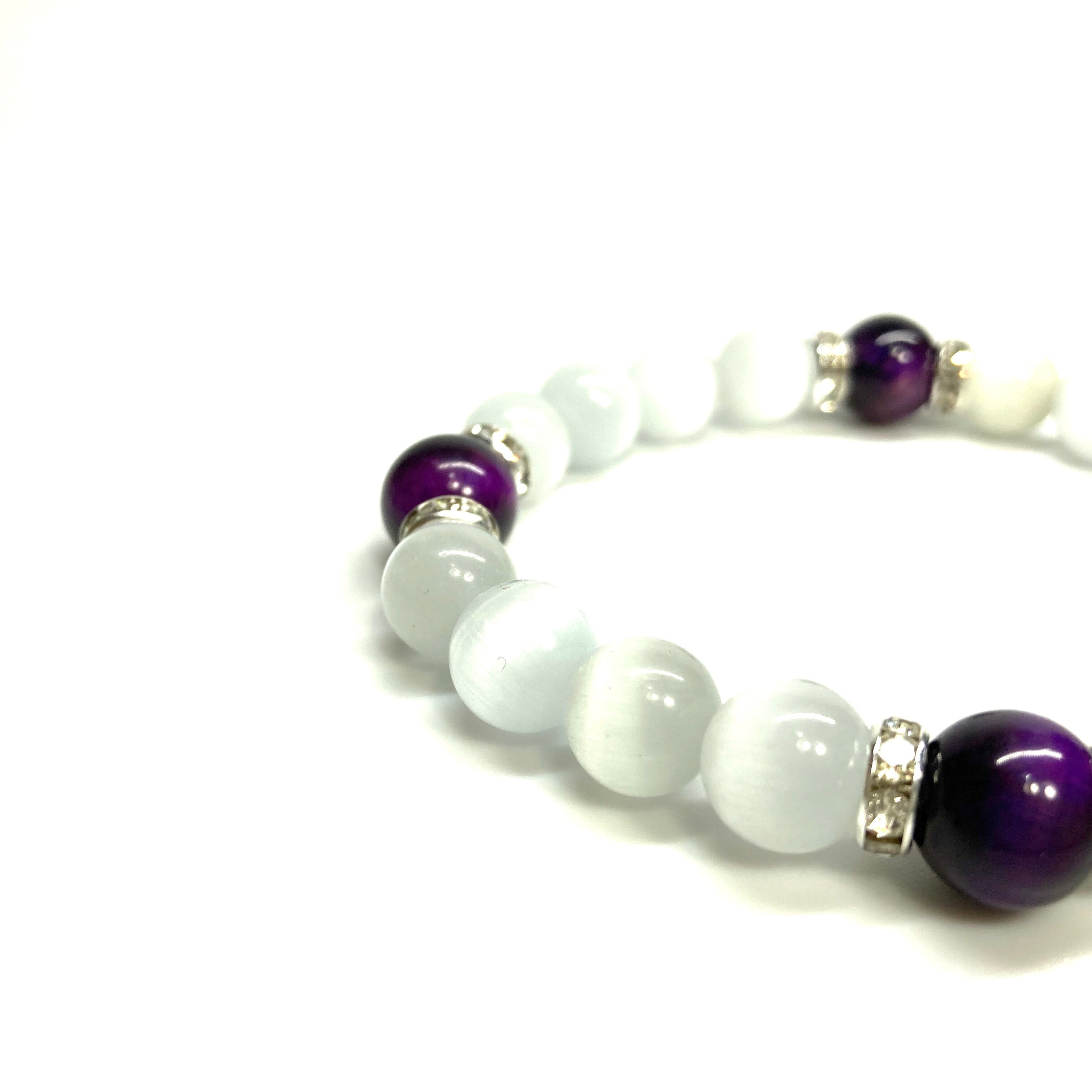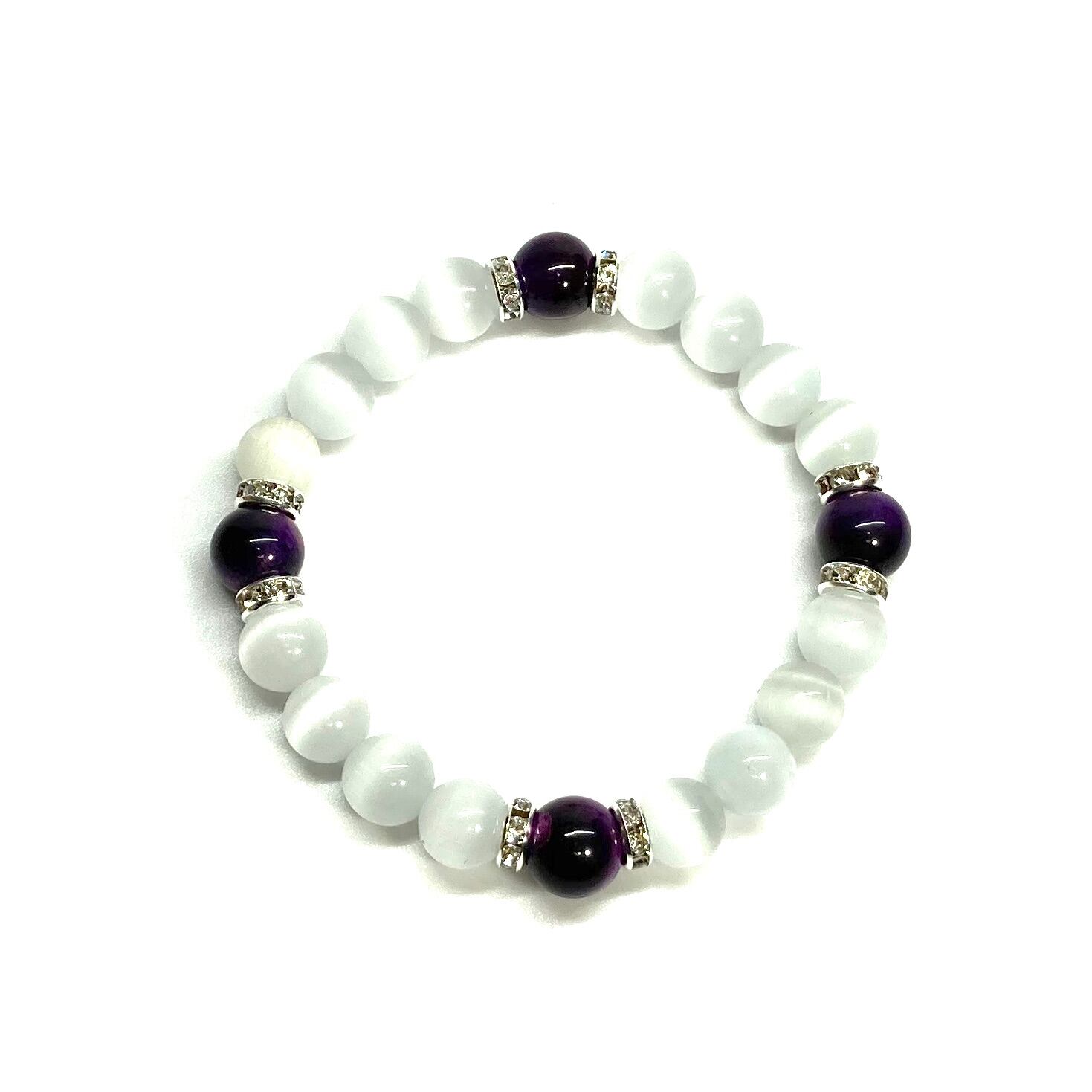 キャッツアイ(ホワイト)×パープルタイガーアイ パワーストーン ブレスレット (シルバー) メンズ・レディース 男性・女性 数珠ブレス 開運