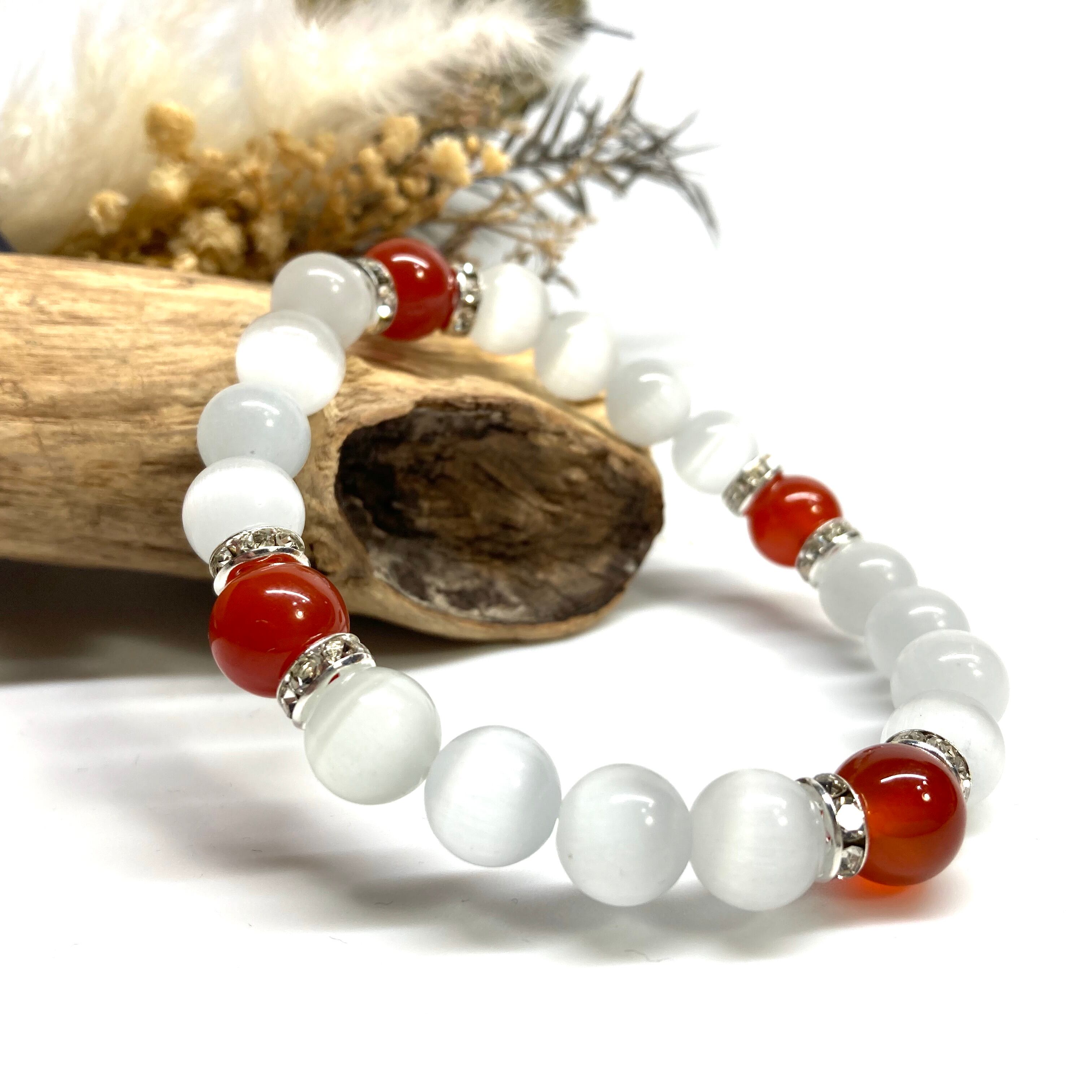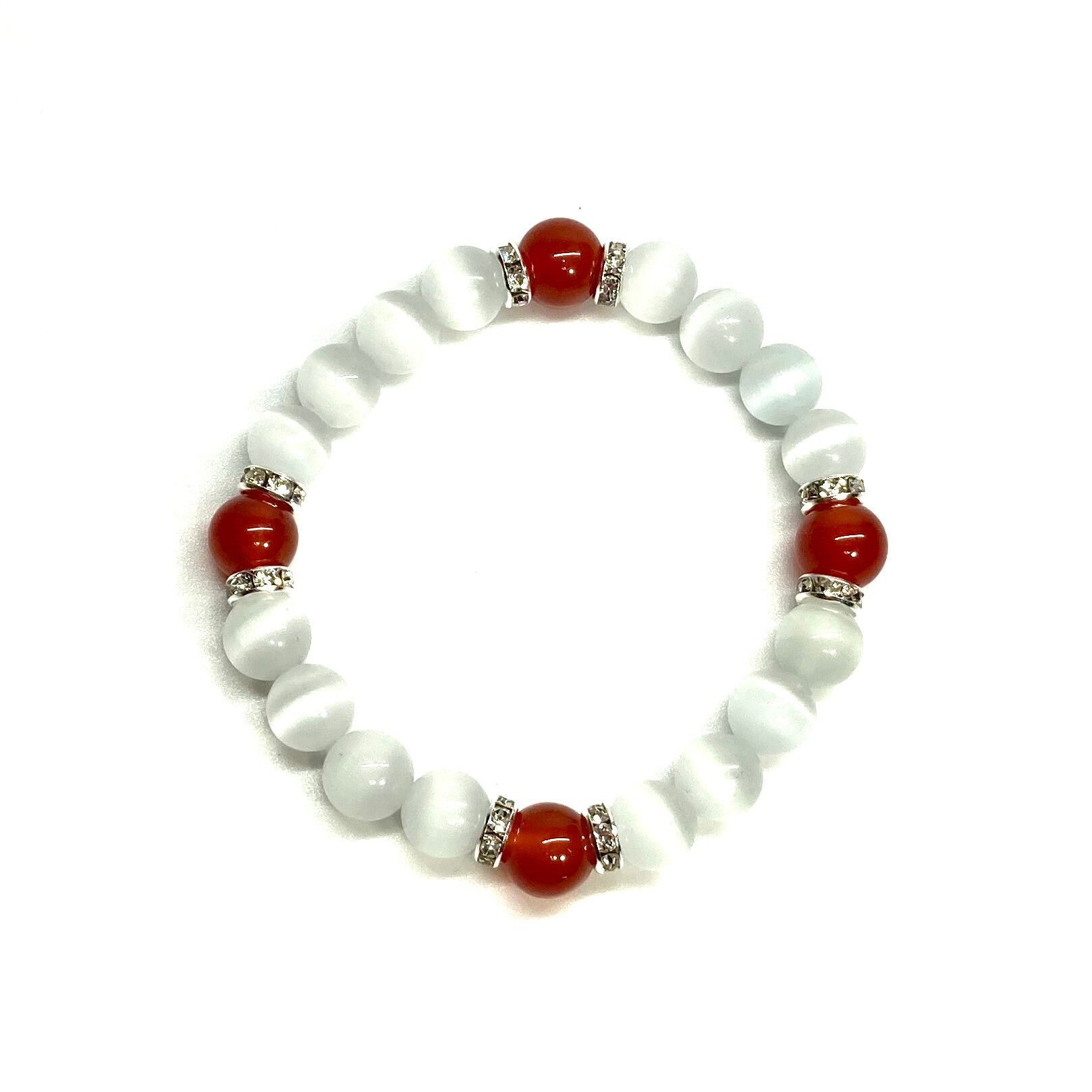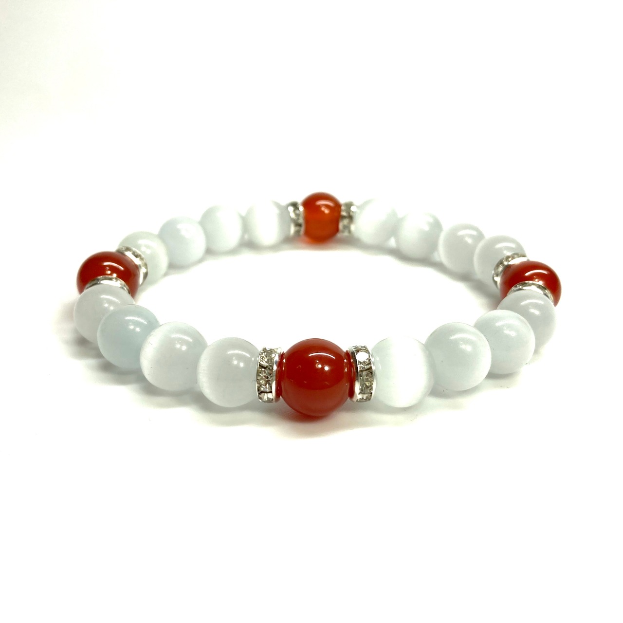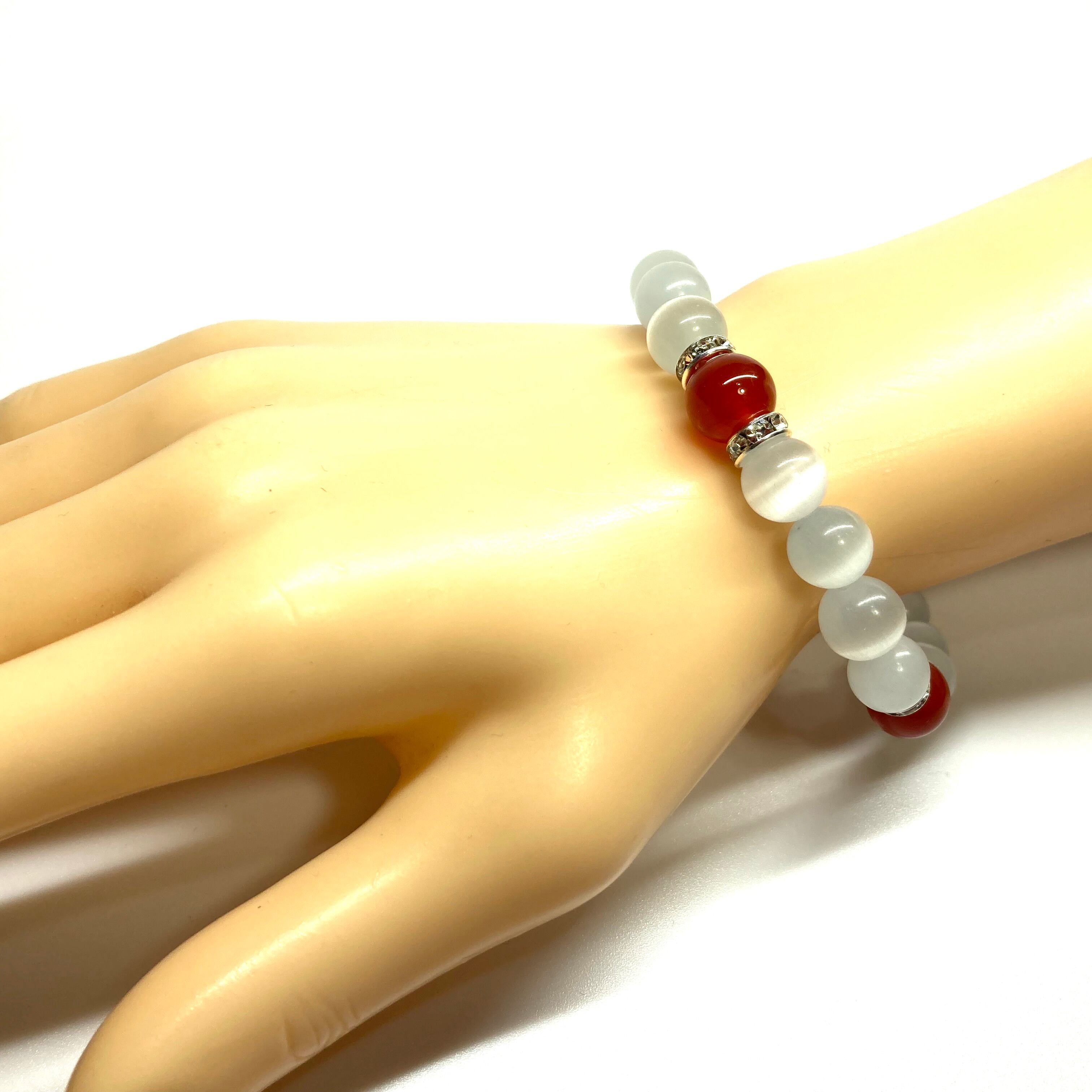 キャッツアイ(ホワイト)×赤瑪瑙 パワーストーン ブレスレット (シルバー) メンズ・レディース 男性・女性 数珠ブレス 開運