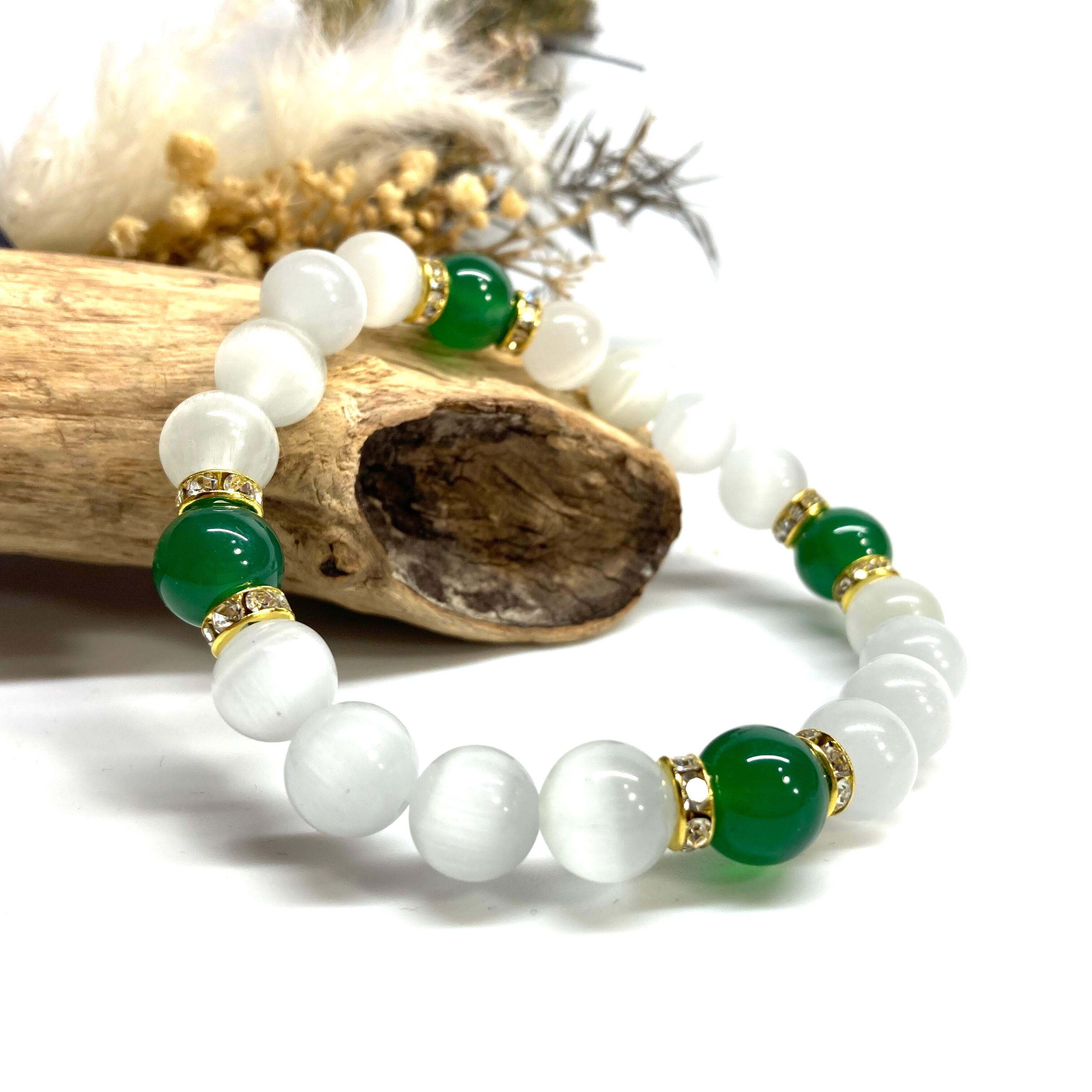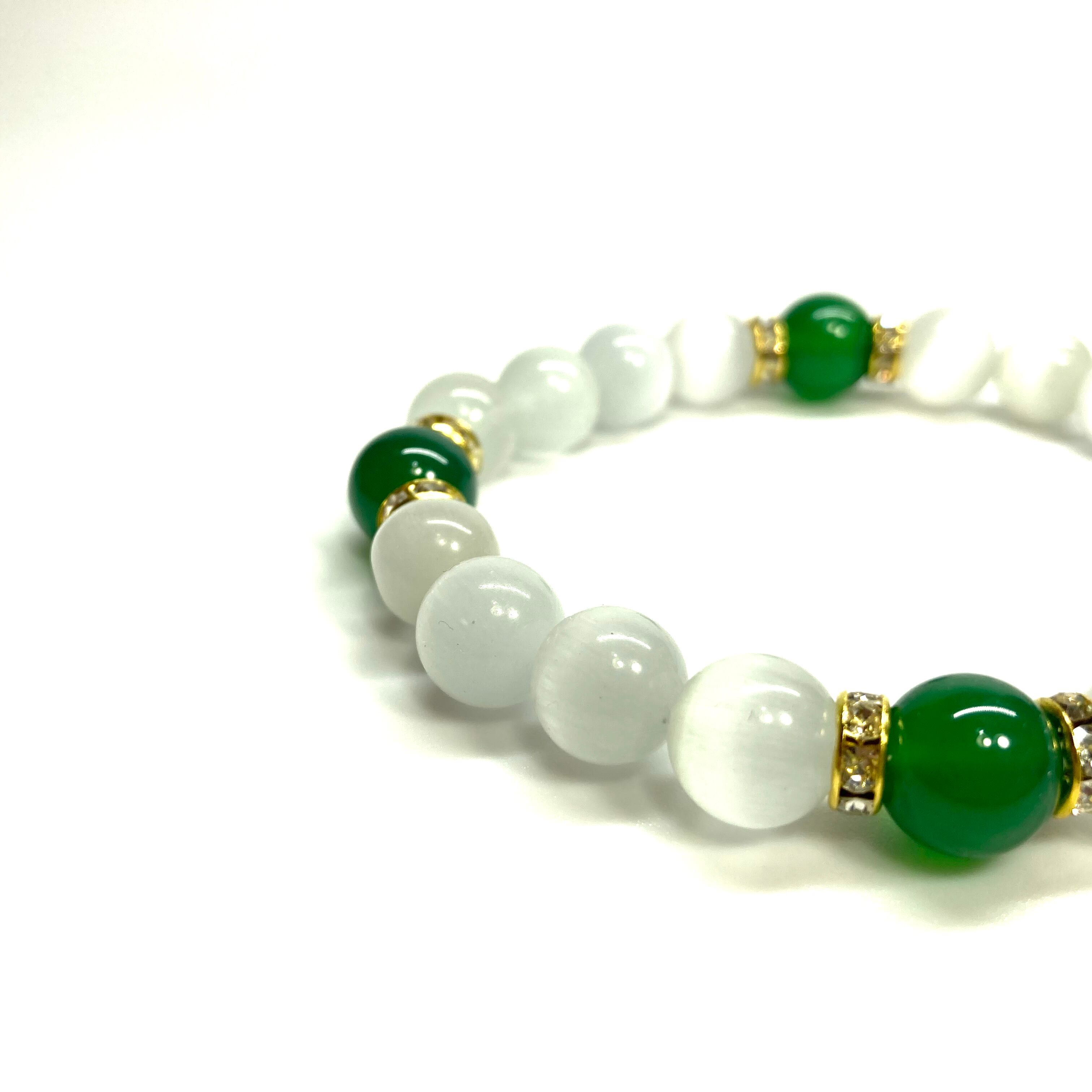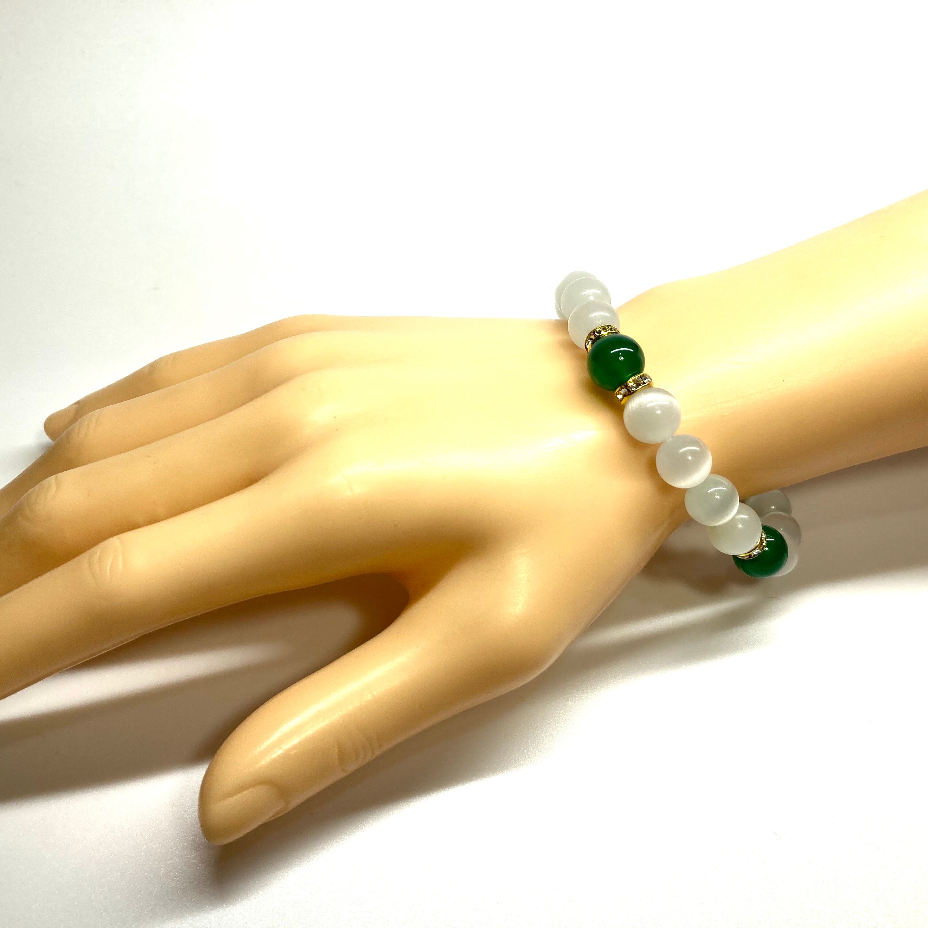 こちらは、キャッツアイと緑瑪瑙を組み合わせたブレスレットです。間にはロンデルを挟み高級感あるデザインに仕上がっています。石大きさは腕にも馴染みやすいように10mm玉で内周約17cm(伸可能)です。数に限りがございますので気になる方はお早めにどうぞ。