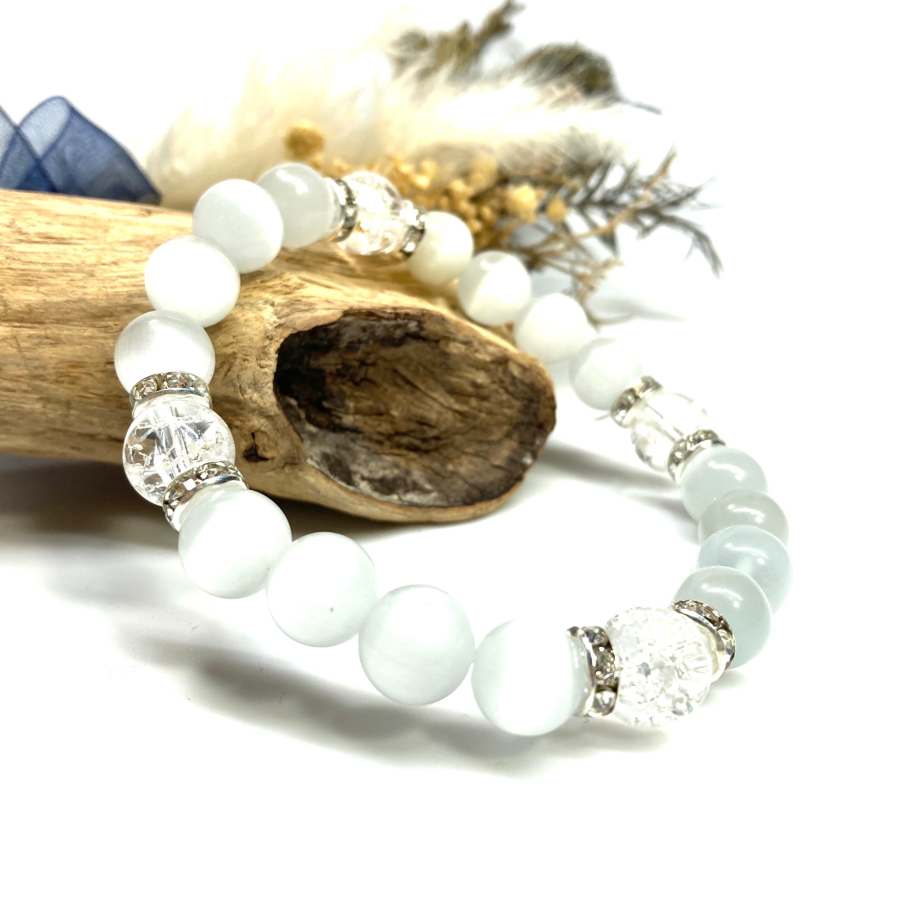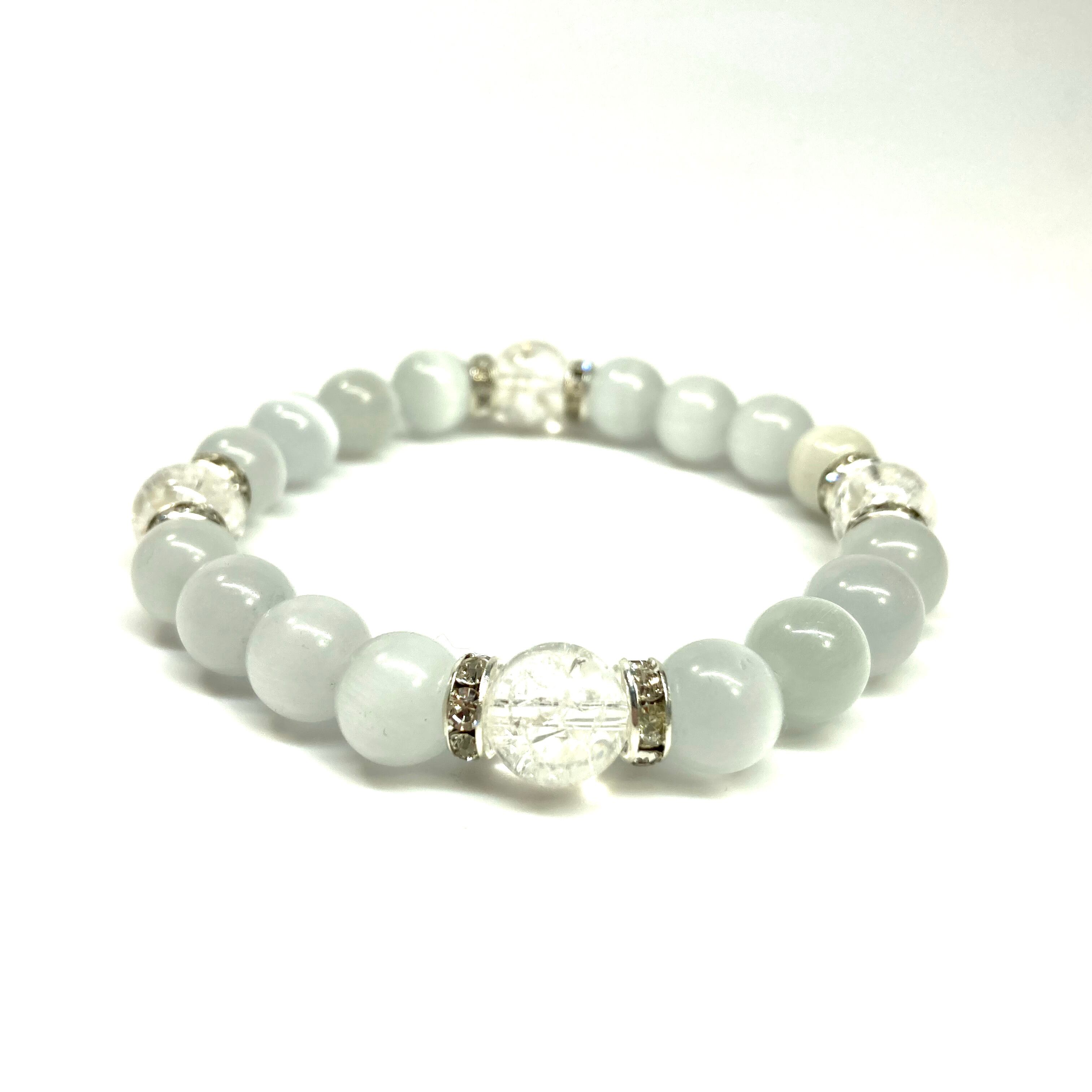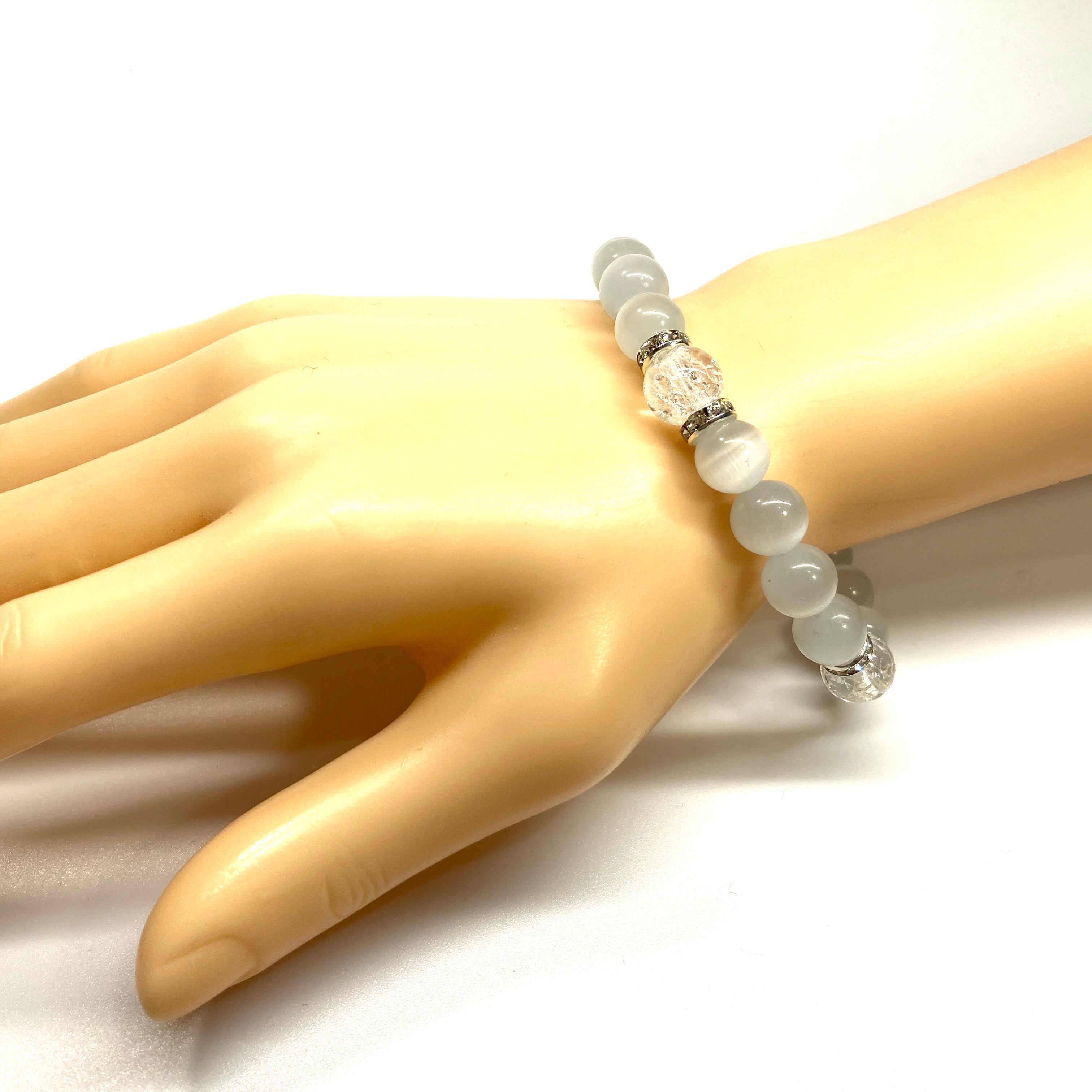 こちらは、キャッツアイとクラック水晶を組み合わせたブレスレットです。間にはロンデルを挟み高級感あるデザインに仕上がっています。石大きさは腕にも馴染みやすいように10mm玉で内周約17cm(伸可能)です。数に限りがございますので気になる方はお早めにどうぞ。