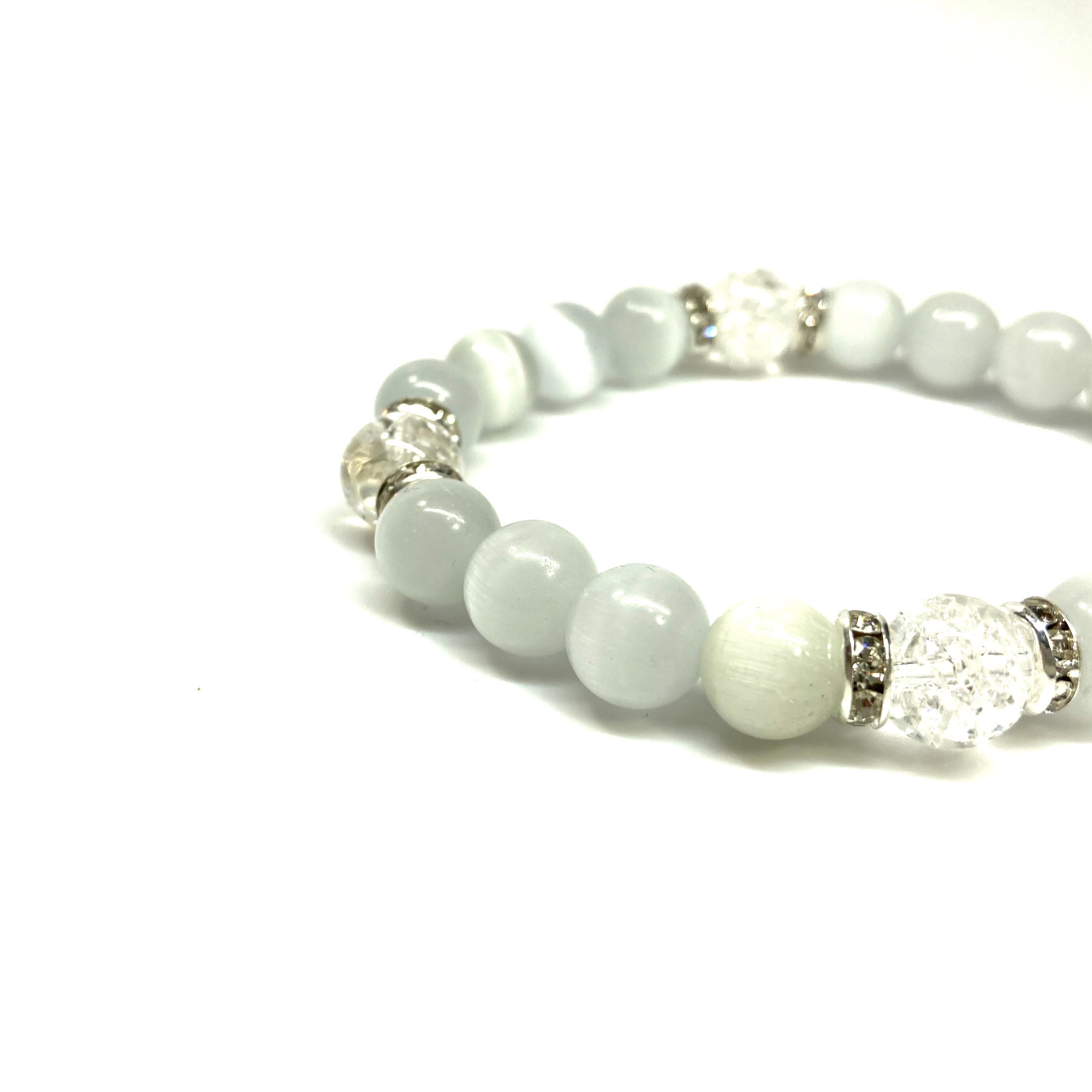 キャッツアイ(ホワイト)×クラック水晶パワーストーン ブレスレット (シルバー) メンズ・レディース 男性・女性 数珠ブレス 開運