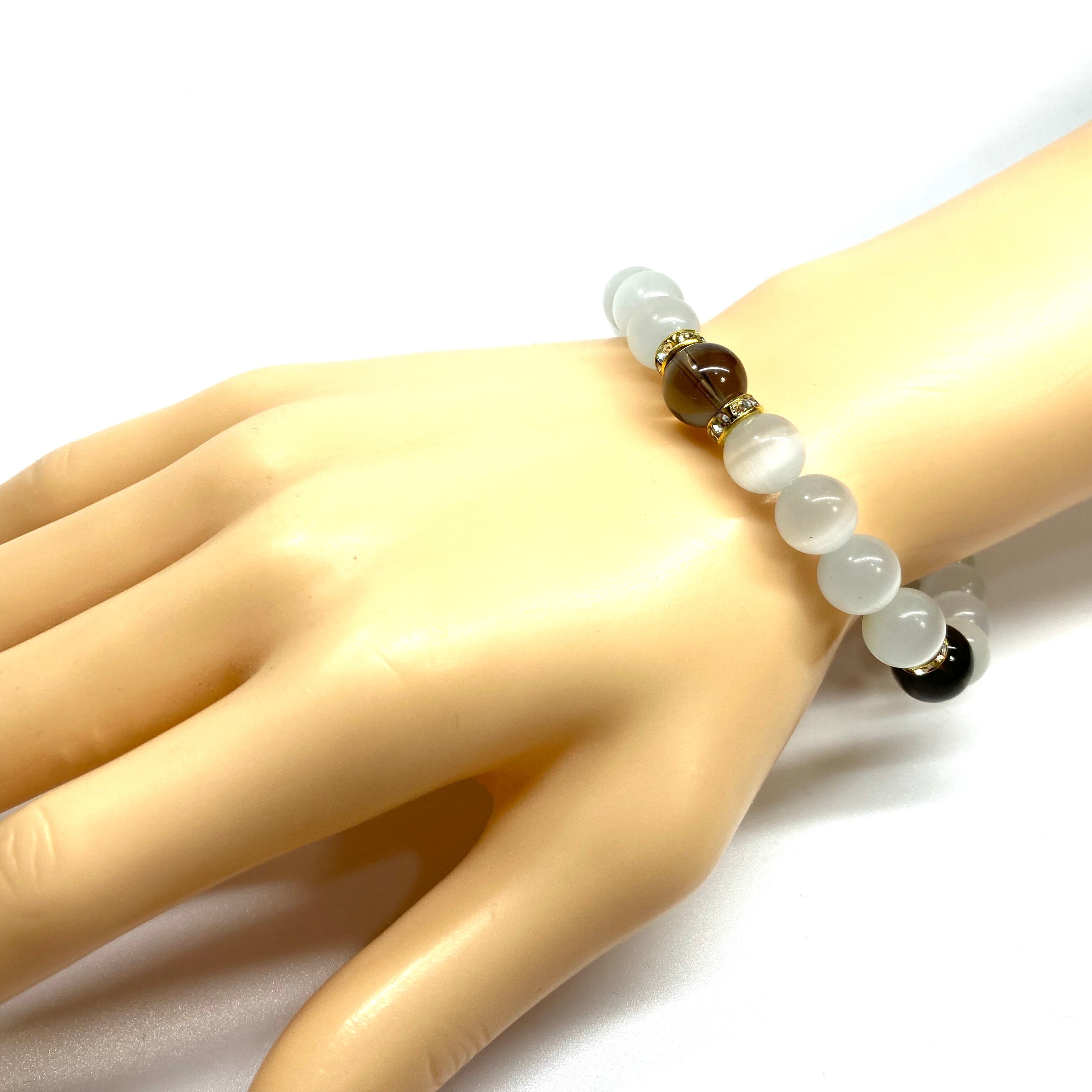 こちらは、キャッツアイとスモーキークォーツを組み合わせたブレスレットです。間にはロンデルを挟み高級感あるデザインに仕上がっています。石大きさは腕にも馴染みやすいように10mm玉で内周約17cm(伸可能)です。数に限りがございますので気になる方はお早めにどうぞ。