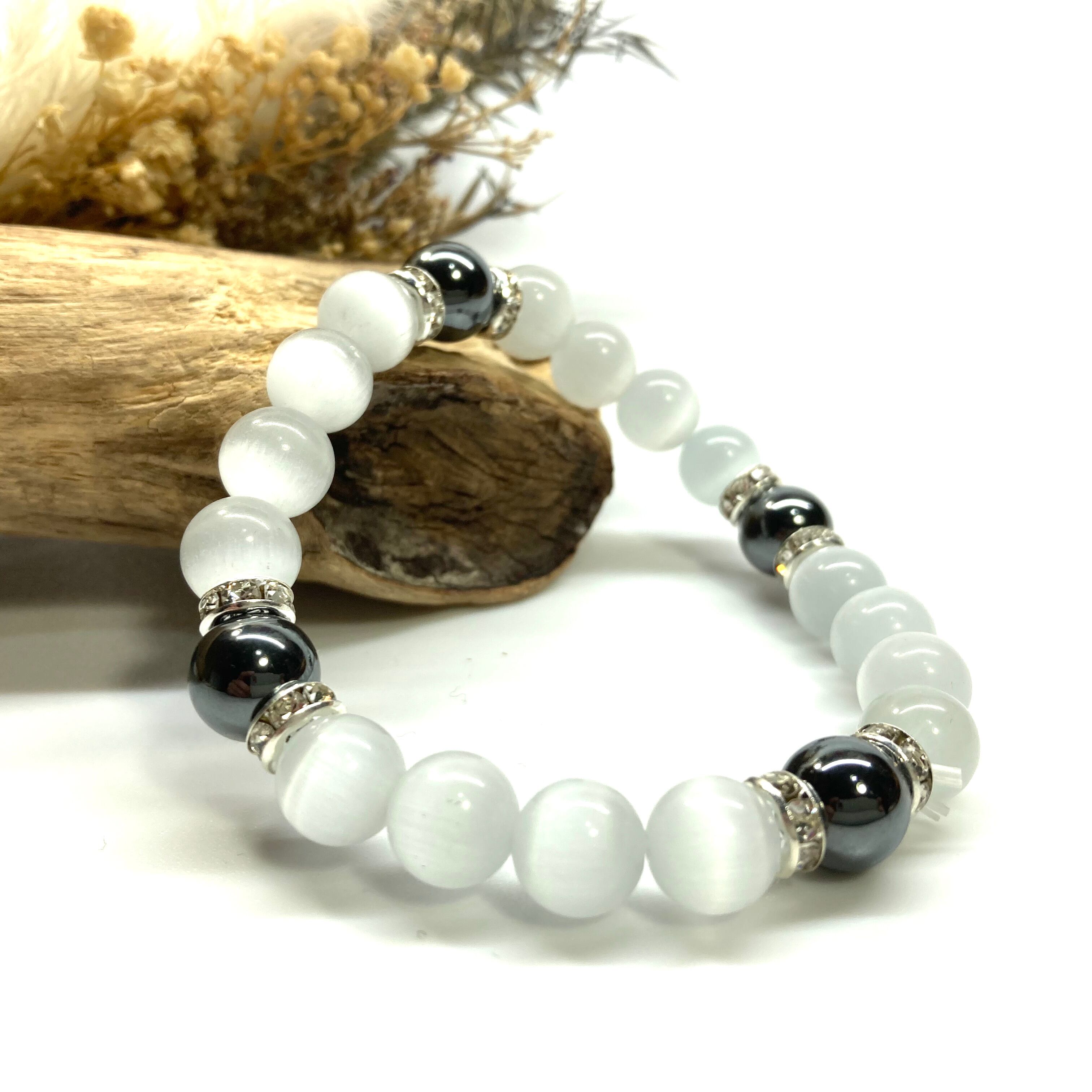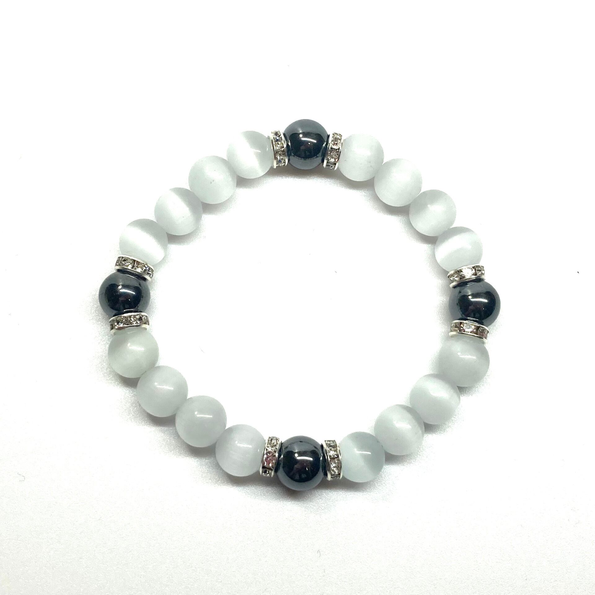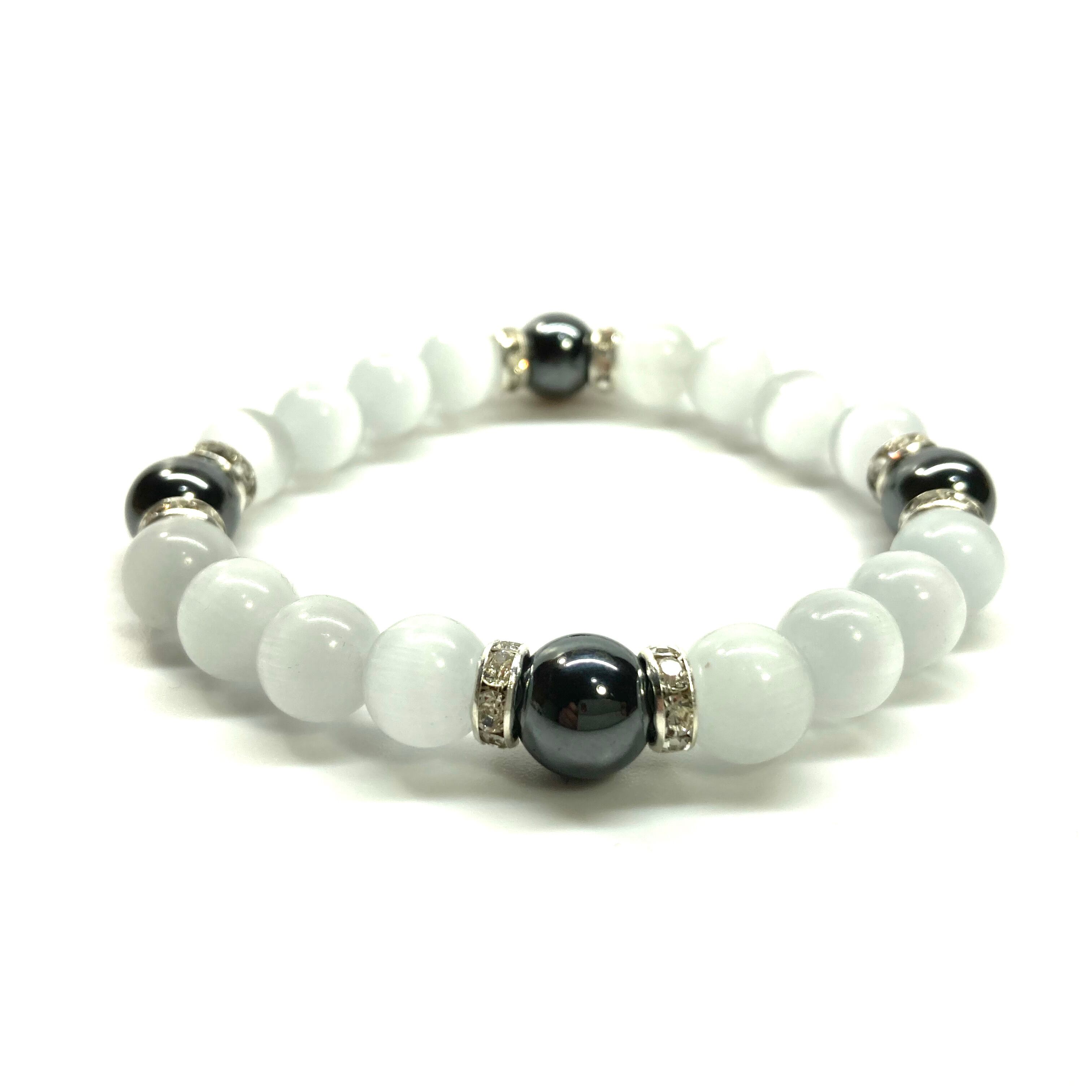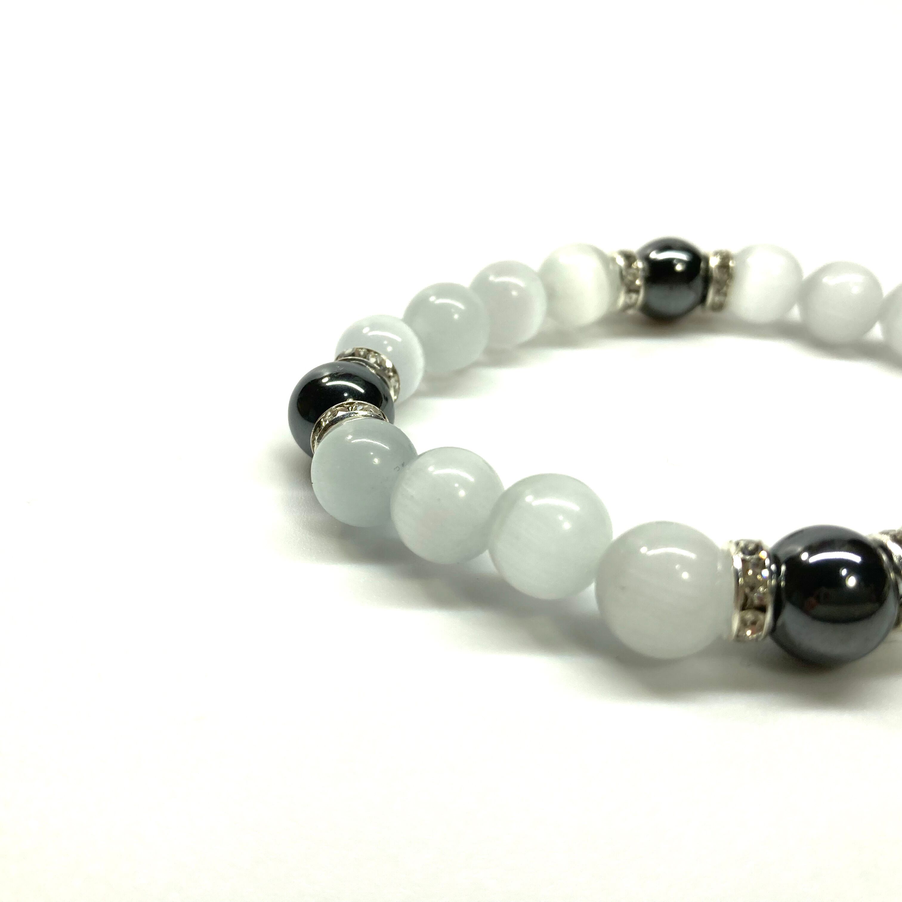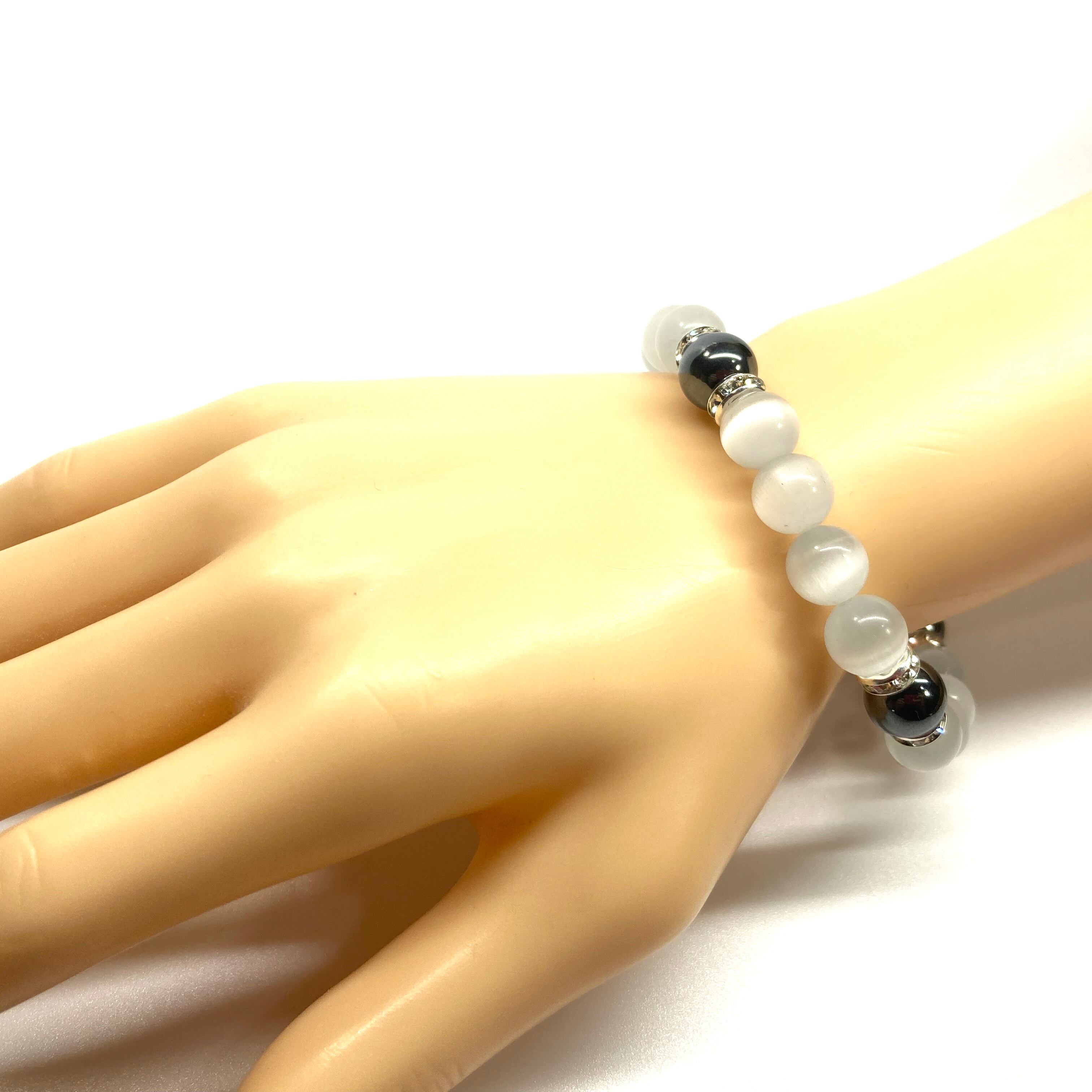 キャッツアイ(ホワイト)×ヘマタイト パワーストーン ブレスレット (シルバー) メンズ・レディース 男性・女性 数珠ブレス 開運