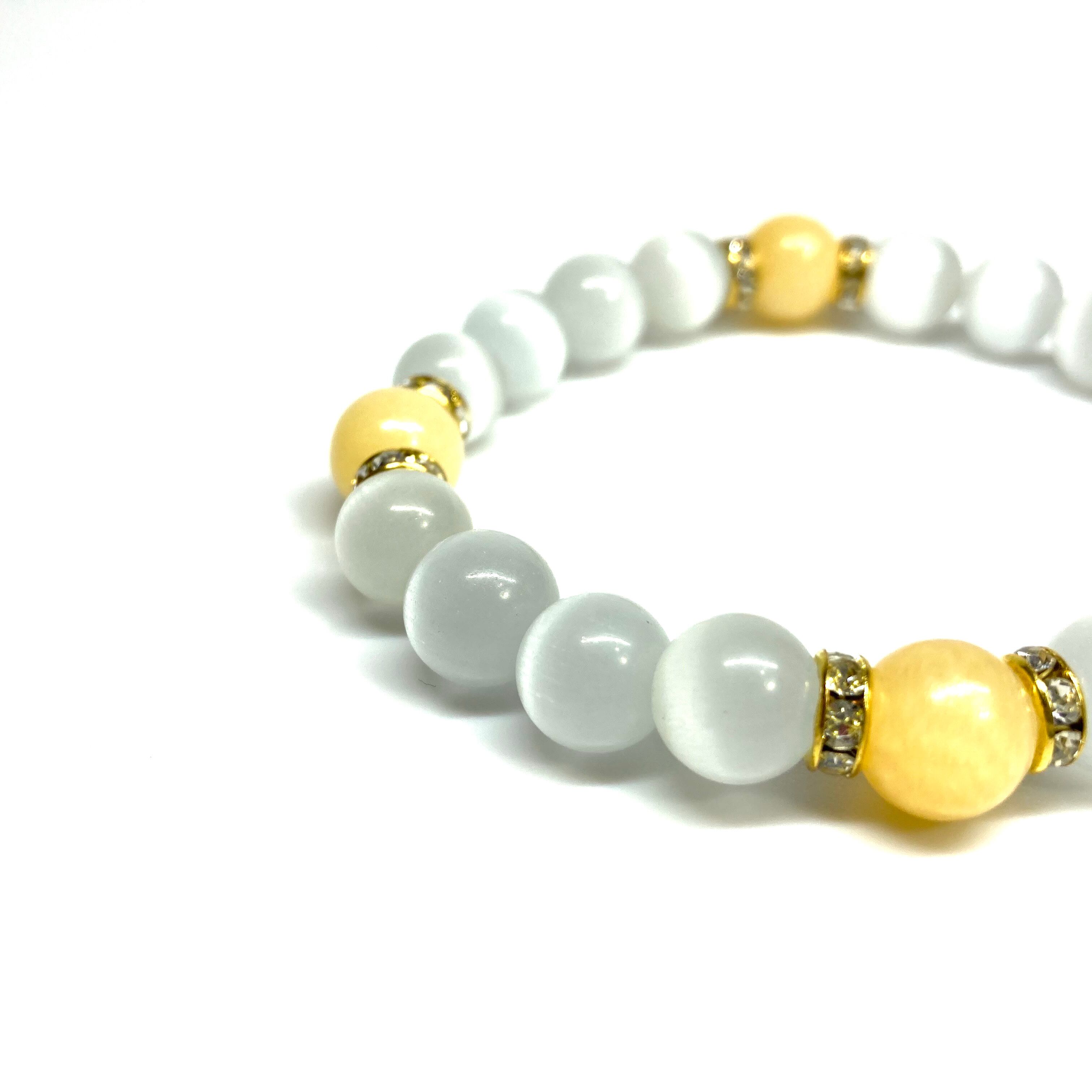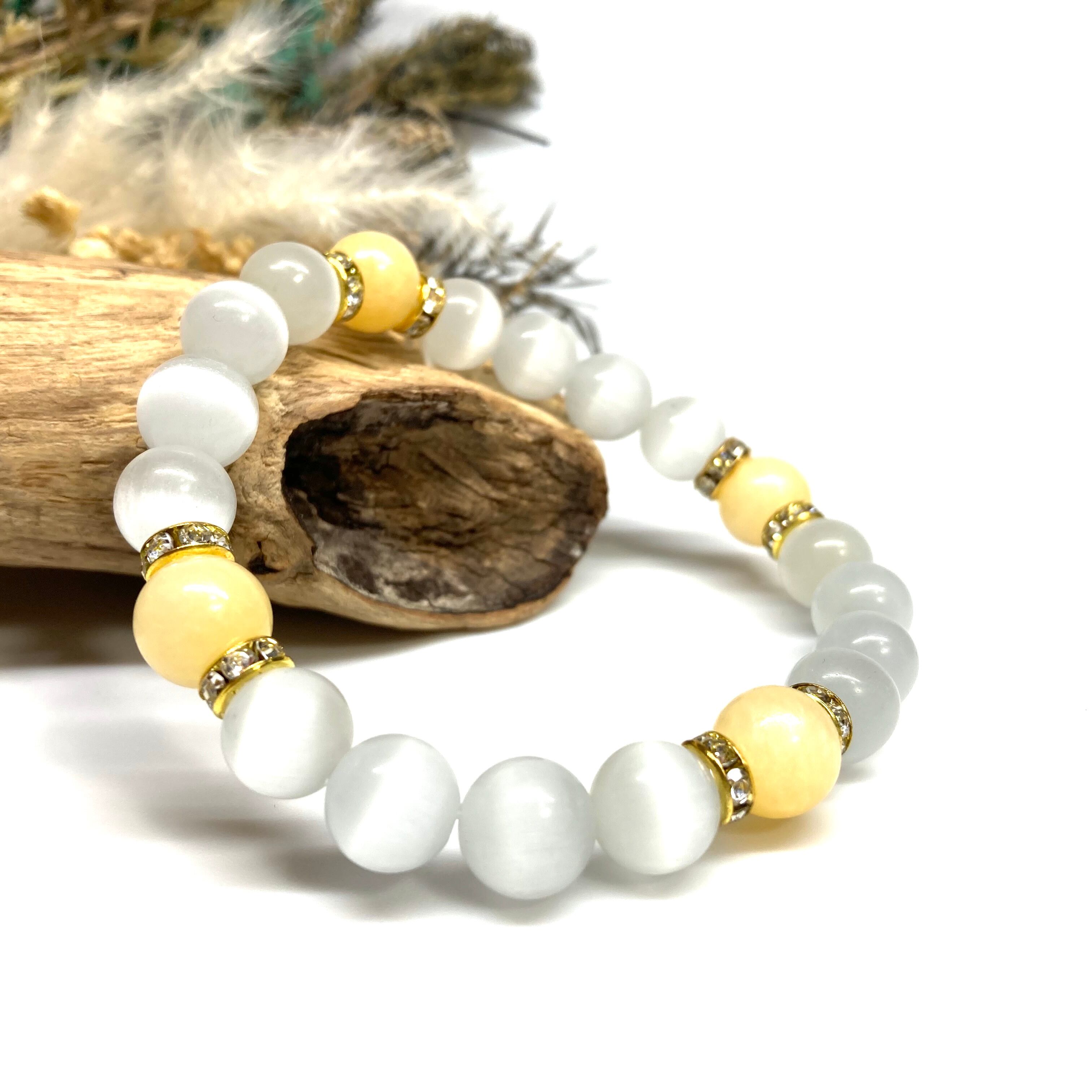 こちらは、キャッツアイとアラゴナイトを組み合わせたブレスレットです。間にはロンデルを挟み高級感あるデザインに仕上がっています。石大きさは腕にも馴染みやすいように10mm玉で内周約17cm(伸可能)です。数に限りがございますので気になる方はお早めにどうぞ。