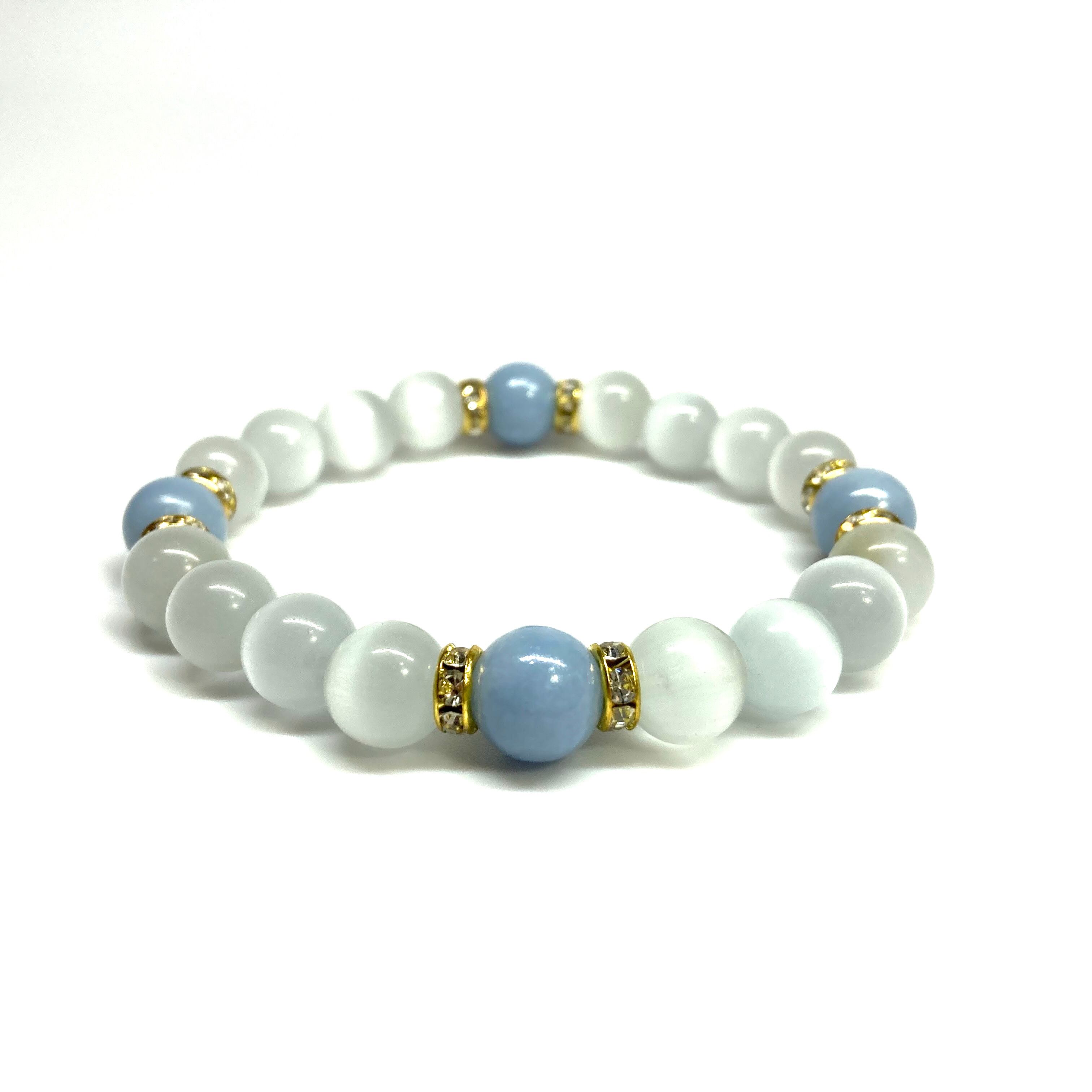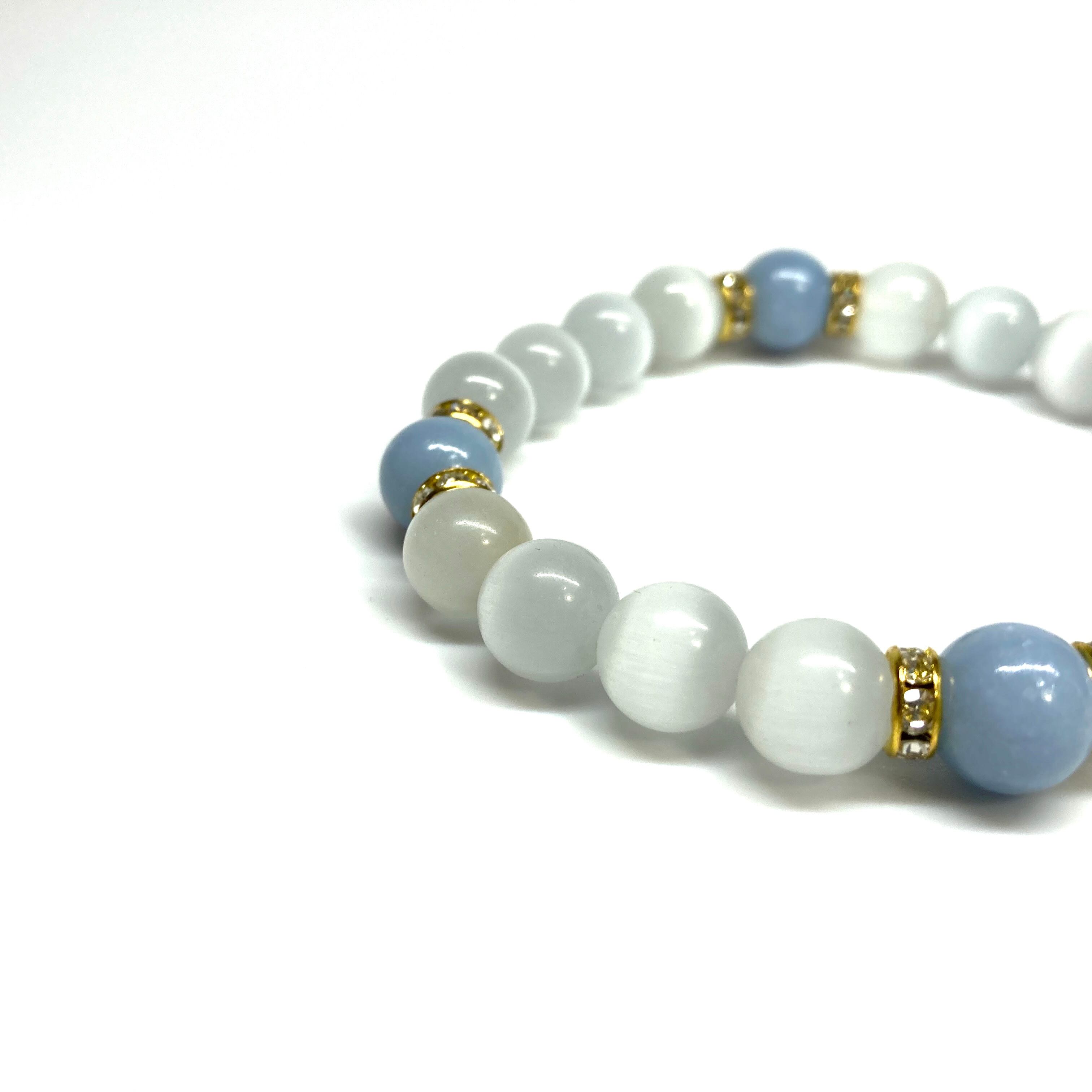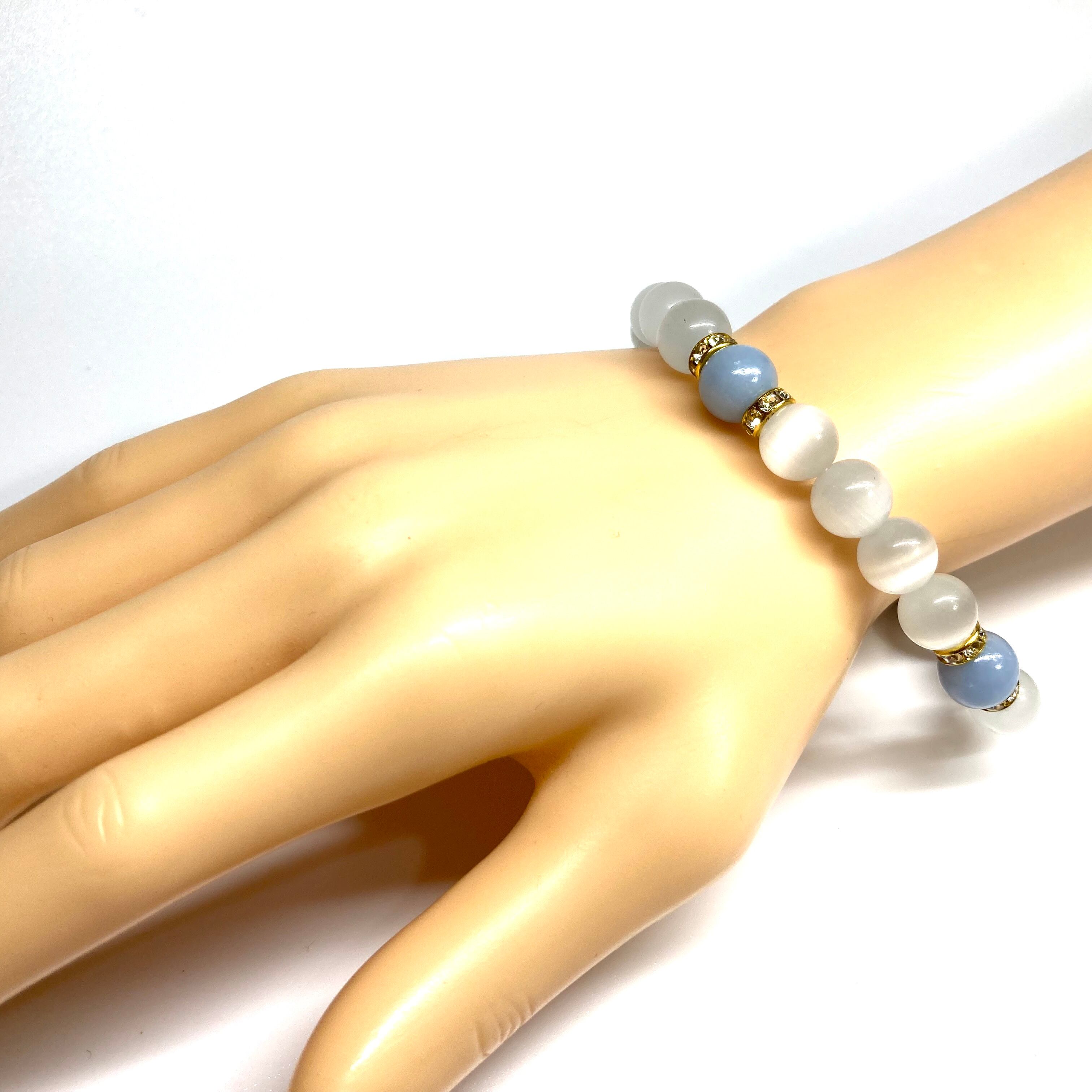 こちらは、キャッツアイとエンジェライトを組み合わせたブレスレットです。間にはロンデルを挟み高級感あるデザインに仕上がっています。石大きさは腕にも馴染みやすいように10mm玉で内周約17cm(伸可能)です。数に限りがございますので気になる方はお早めにどうぞ。