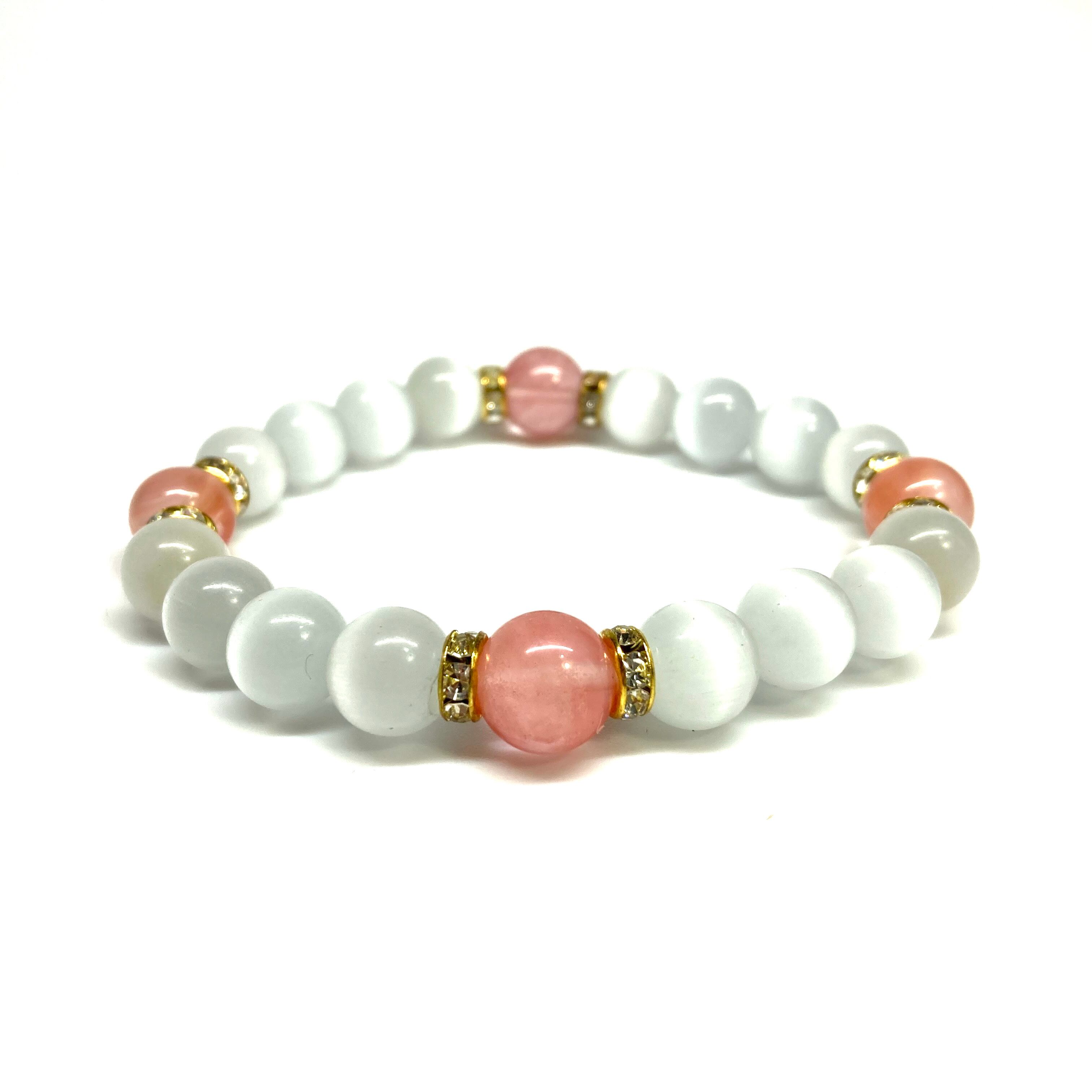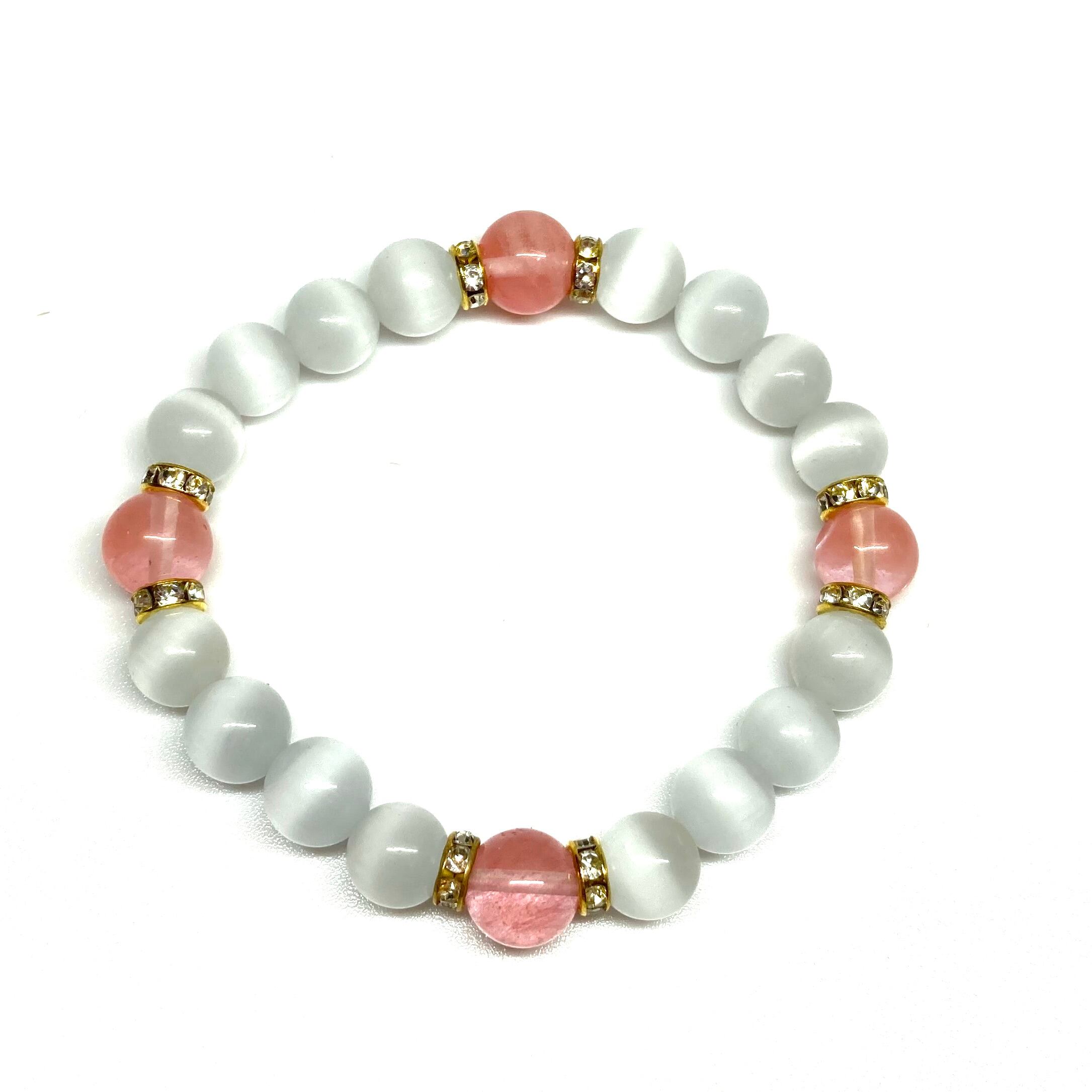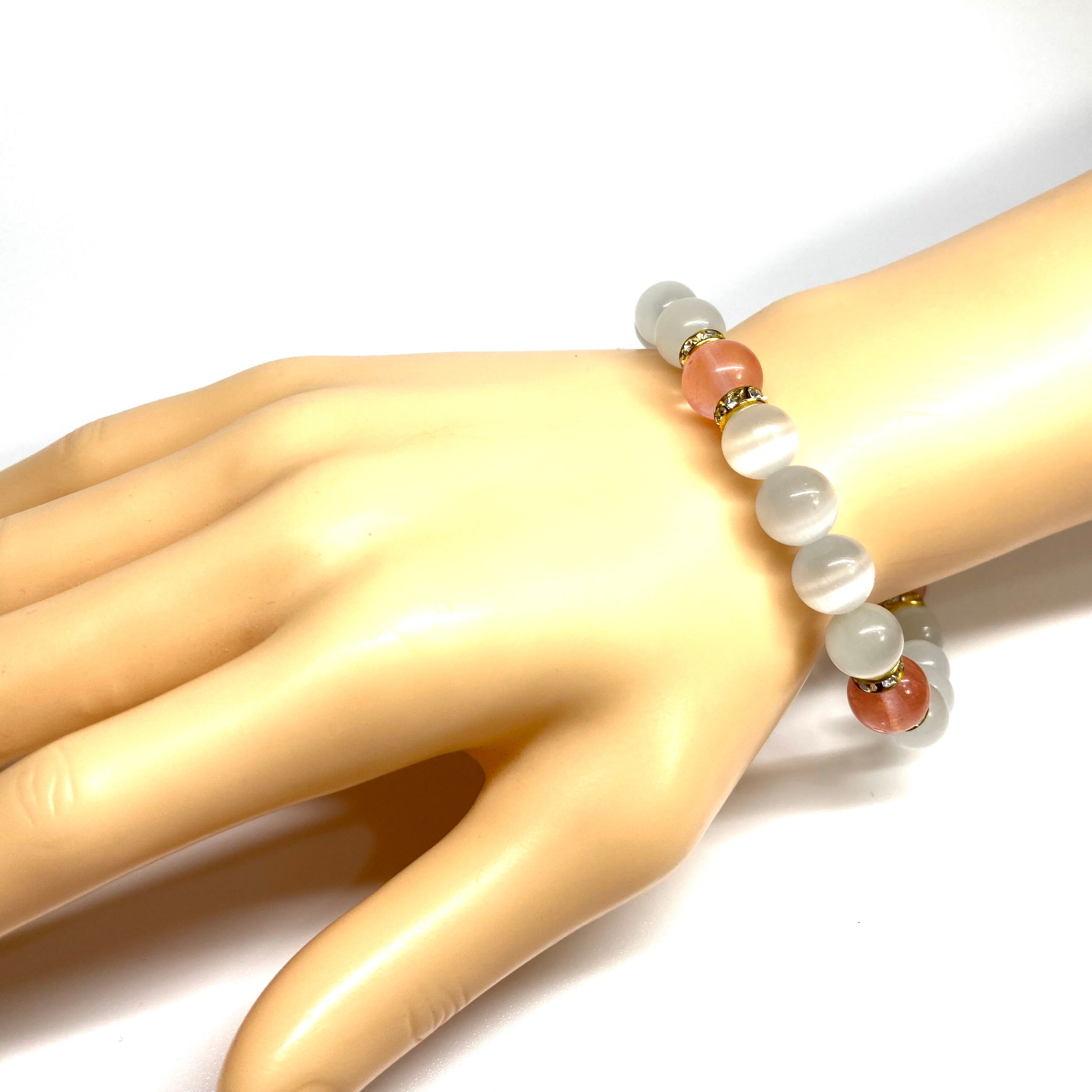 こちらは、キャッツアイとチェリークォーツを組み合わせたブレスレットです。間にはロンデルを挟み高級感あるデザインに仕上がっています。石大きさは腕にも馴染みやすいように10mm玉で内周約17cm(伸可能)です。数に限りがございますので気になる方はお早めにどうぞ。