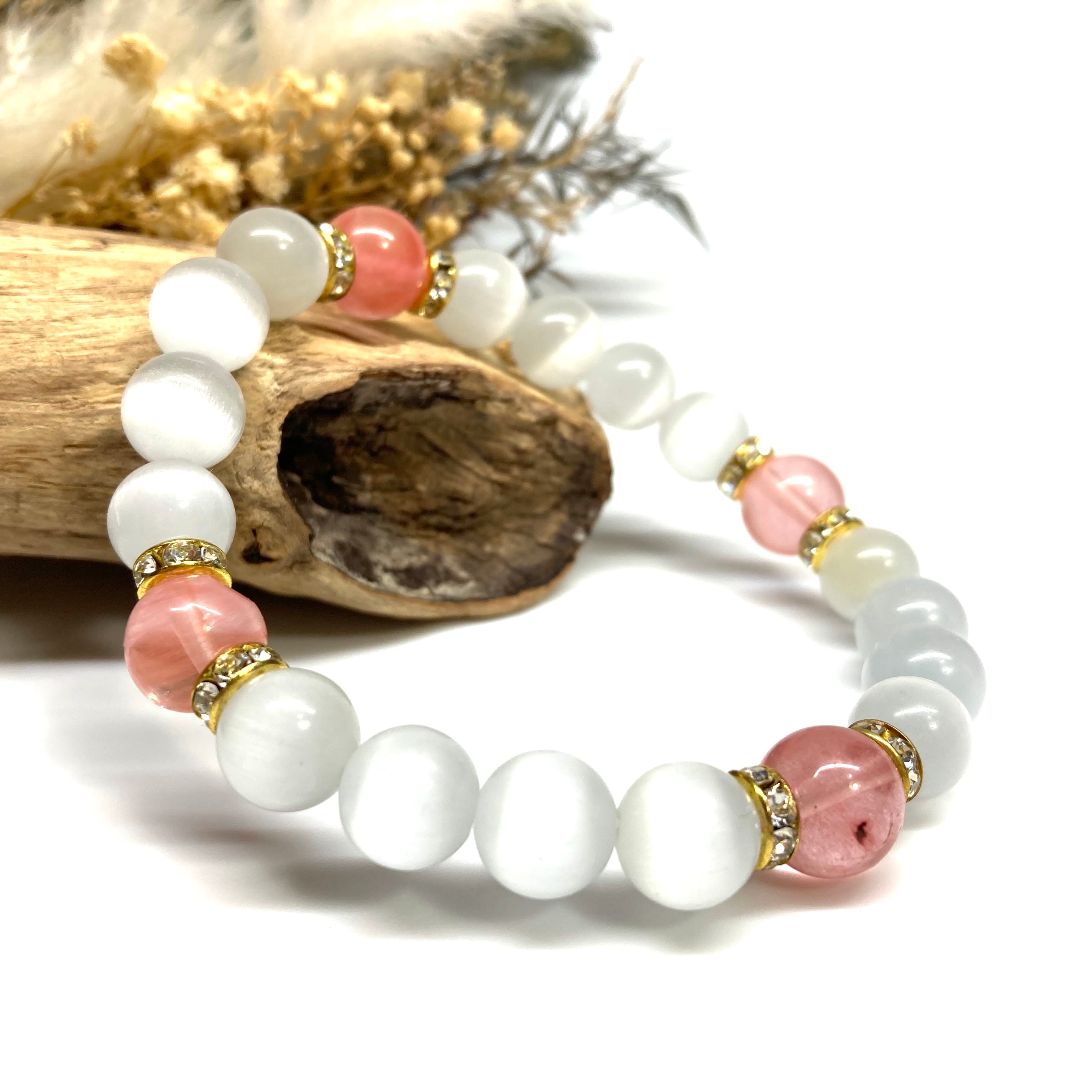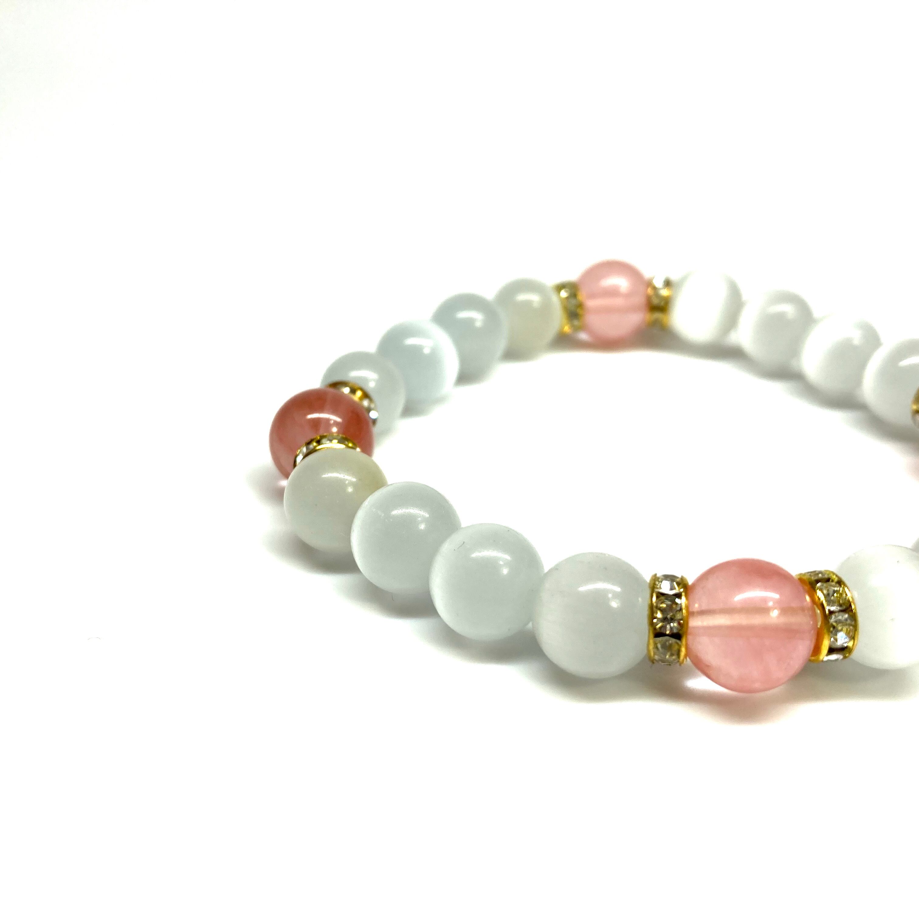キャッツアイ(ホワイト)×チェリークォーツ パワーストーン ブレスレット (ゴールド) メンズ・レディース 男性・女性 数珠ブレス 開運