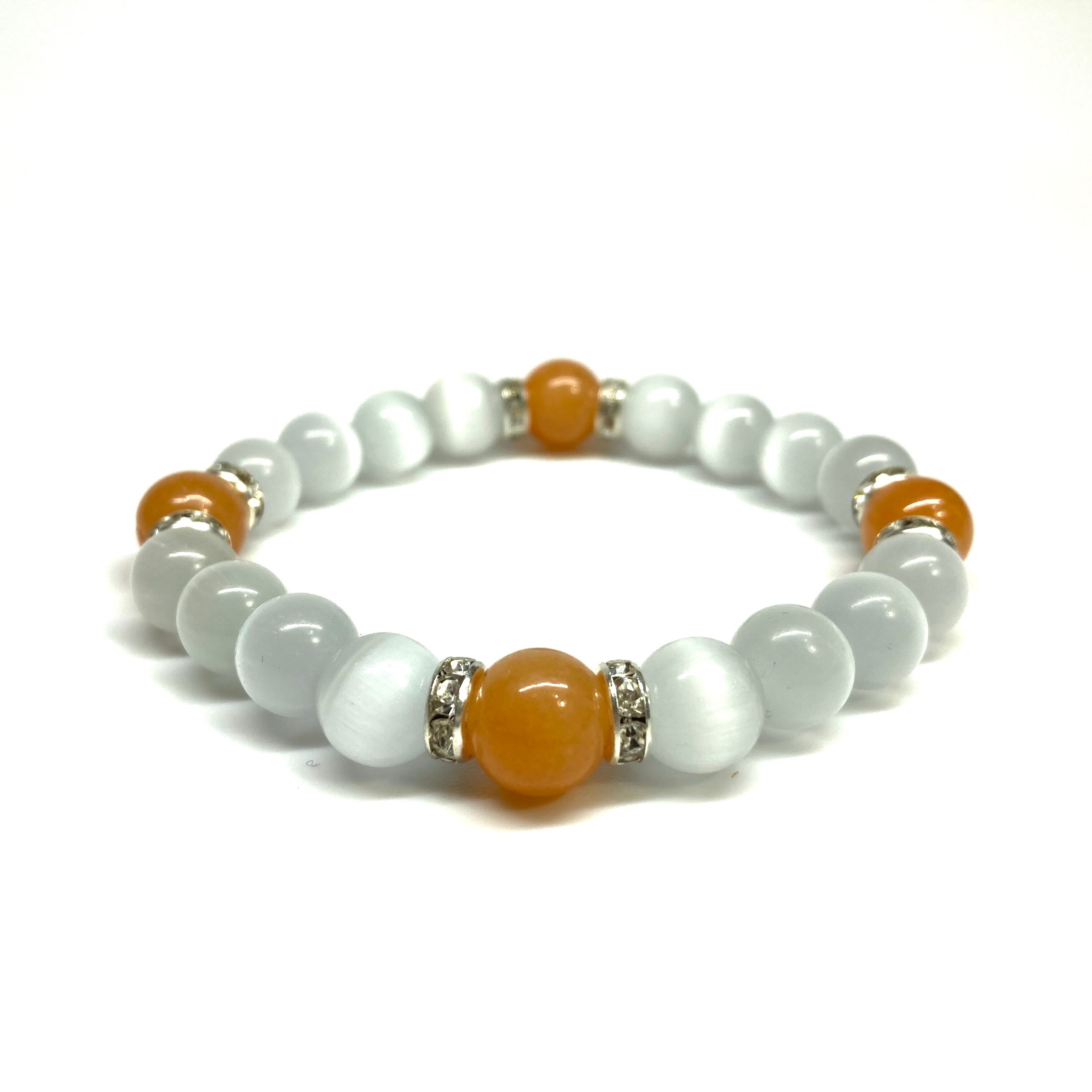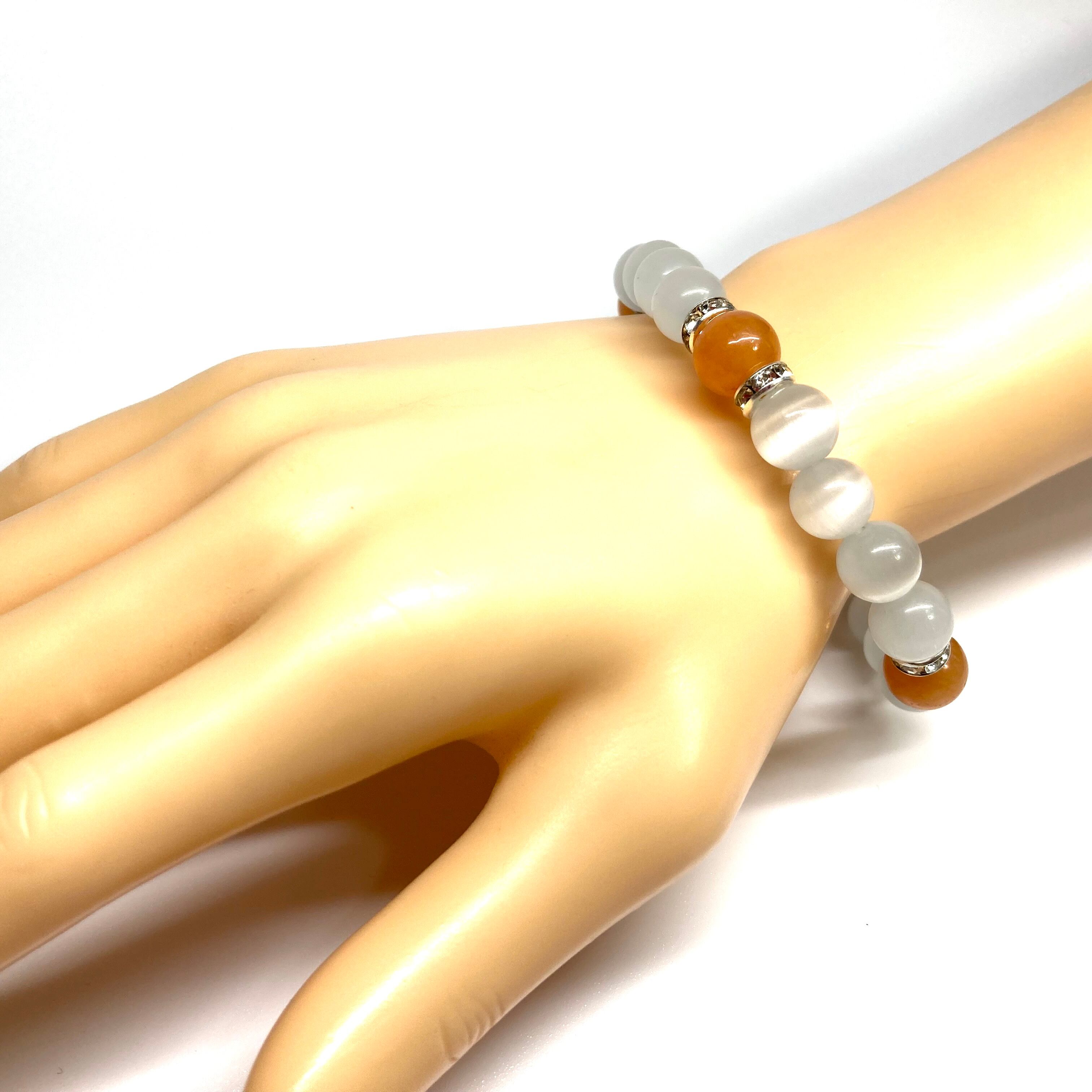 こちらは、キャッツアイとレッドアベンチュリンを組み合わせたブレスレットです。間にはロンデルを挟み高級感あるデザインに仕上がっています。石大きさは腕にも馴染みやすいように10mm玉で内周約17cm(伸可能)です。数に限りがございますので気になる方はお早めにどうぞ。
