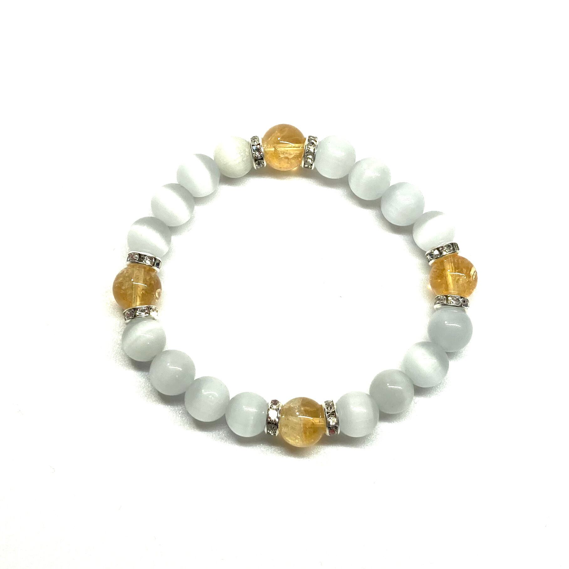 こちらは、キャッツアイとファントムシトリンを組み合わせたブレスレットです。間にはロンデルを挟み高級感あるデザインに仕上がっています。石大きさは腕にも馴染みやすいように10mm玉で内周約17cm(伸可能)です。数に限りがございますので気になる方はお早めにどうぞ。