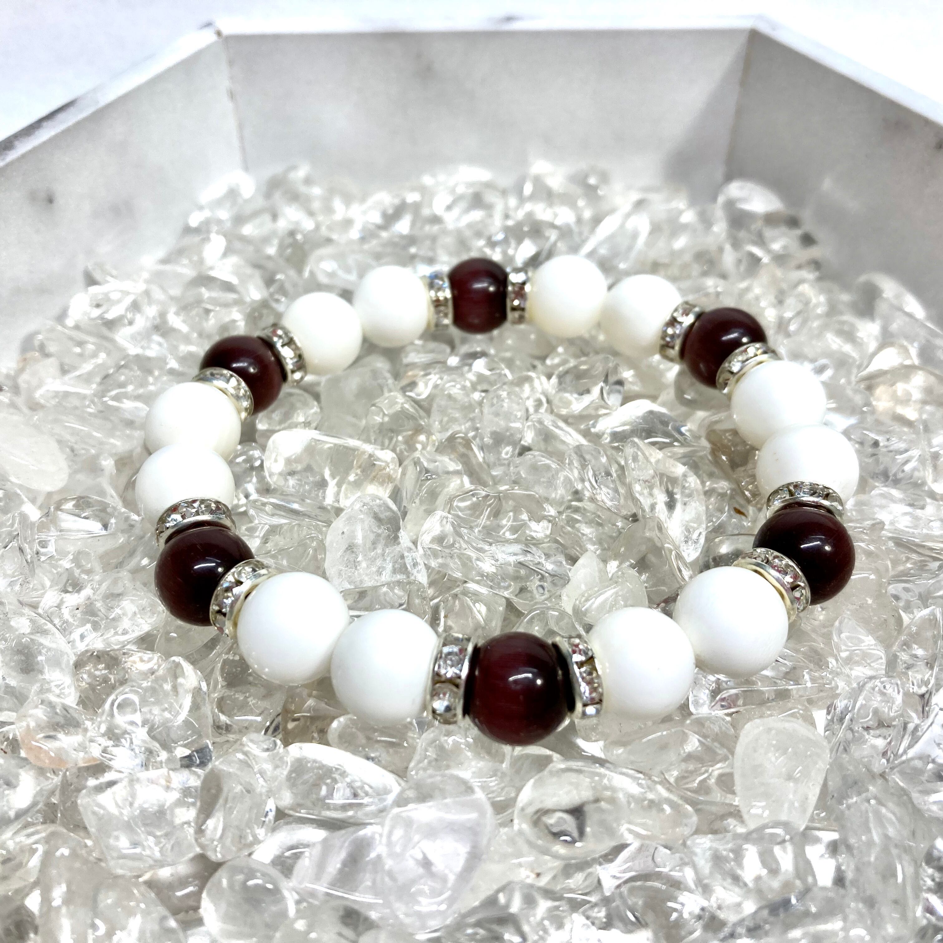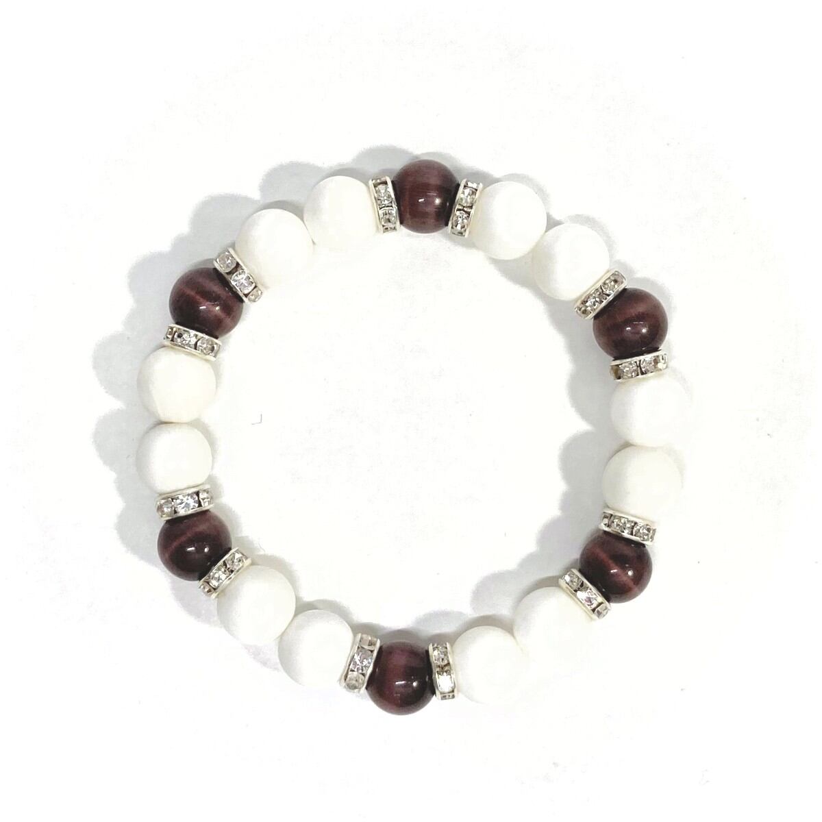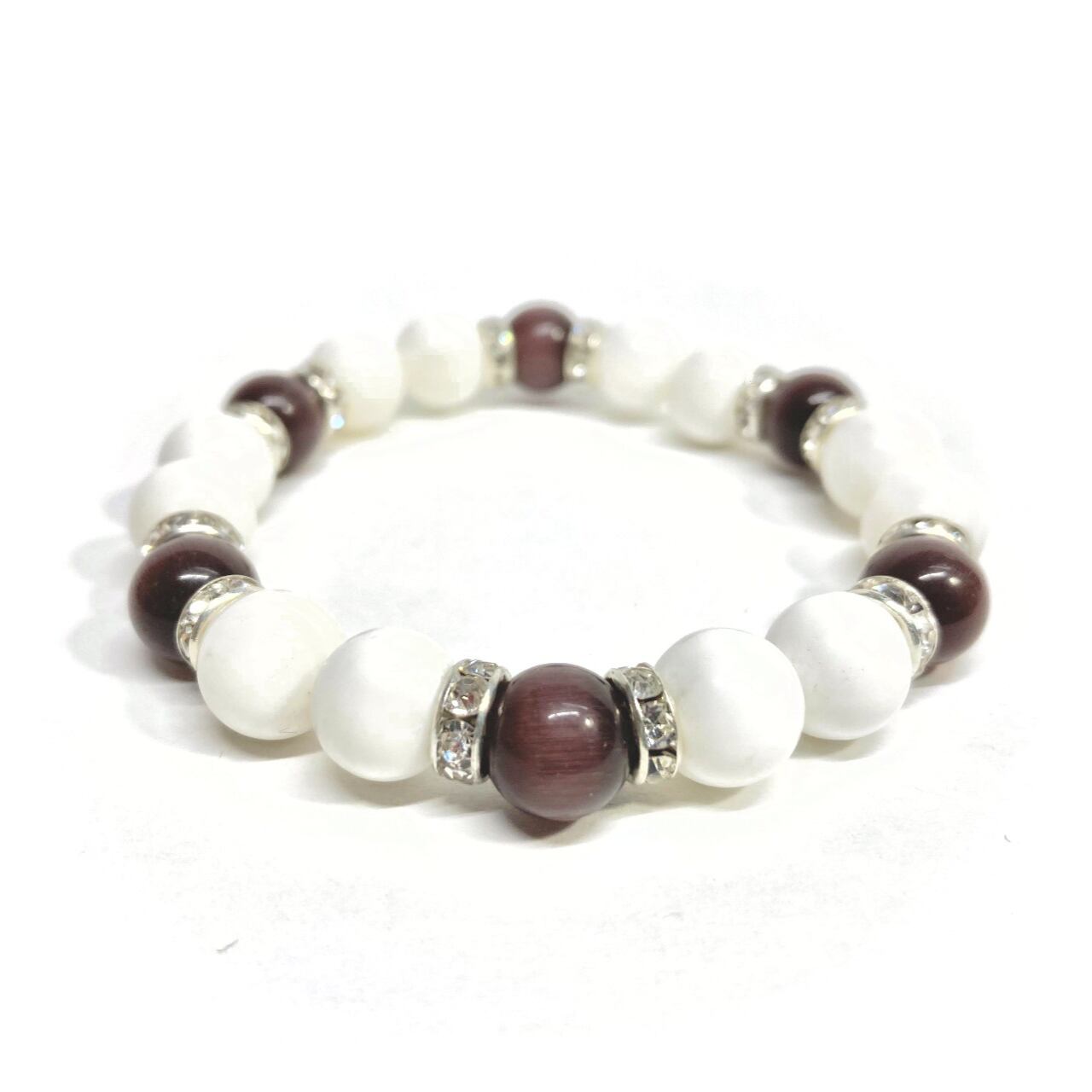こちらは、キャッツアイとホワイトオニキスを組み合わせたブレスレットです。間にはロンデルを挟み高級感あるデザインに仕上がっています。石大きさは腕にも馴染みやすいように10mm玉で内周約16cm(伸可能)です。数に限りがございますので気になる方はお早めにどうぞ。