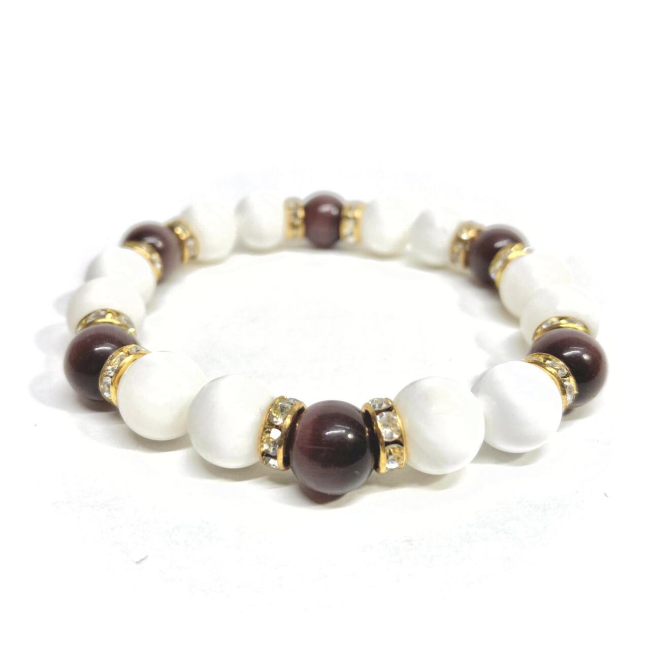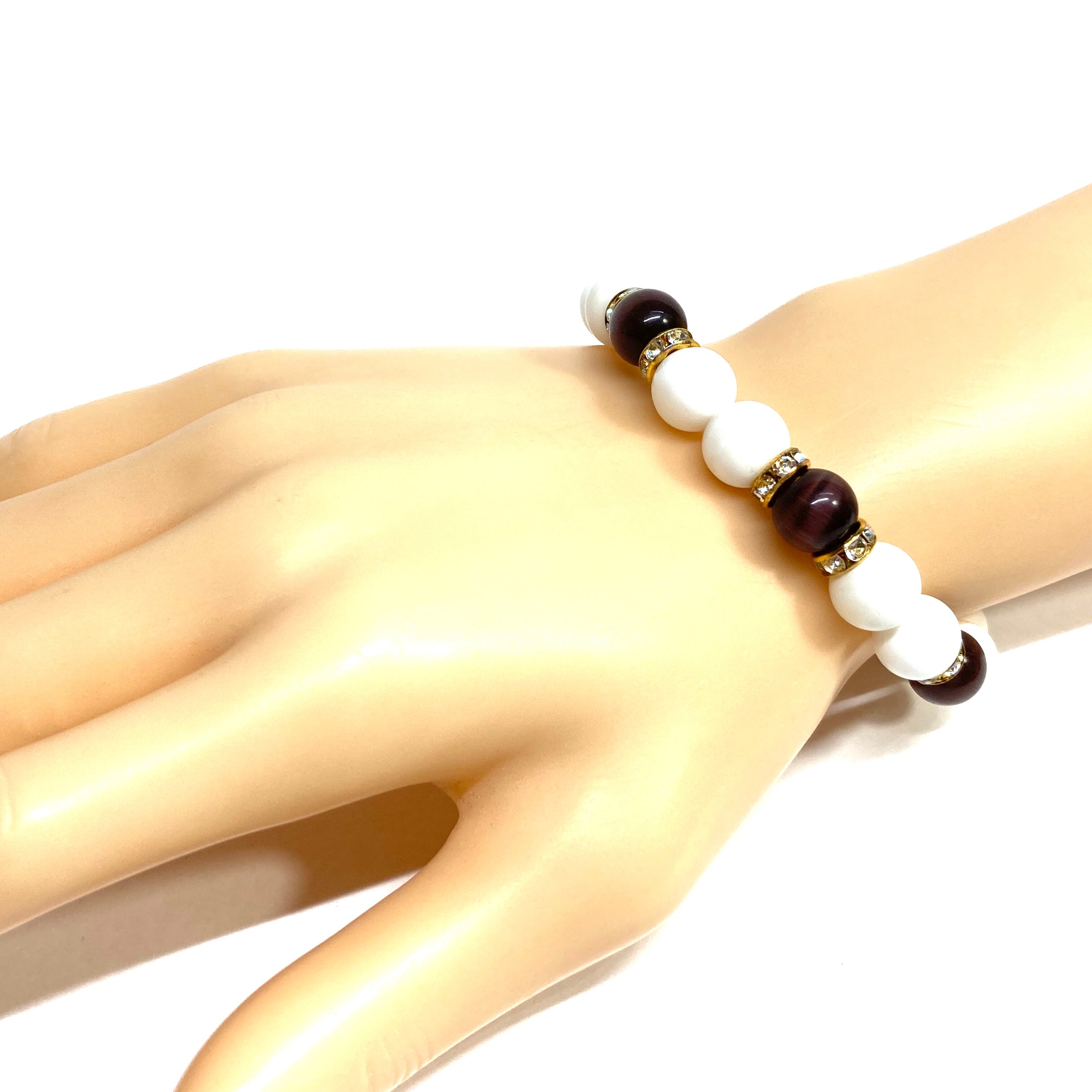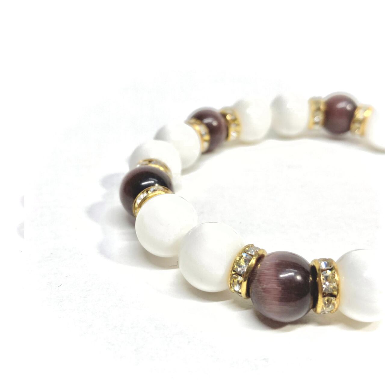 こちらは、キャッツアイとホワイトオニキスを組み合わせたブレスレットです。間にはロンデルを挟み高級感あるデザインに仕上がっています。石大きさは腕にも馴染みやすいように10mm玉で内周約16cm(伸可能)です。数に限りがございますので気になる方はお早めにどうぞ。