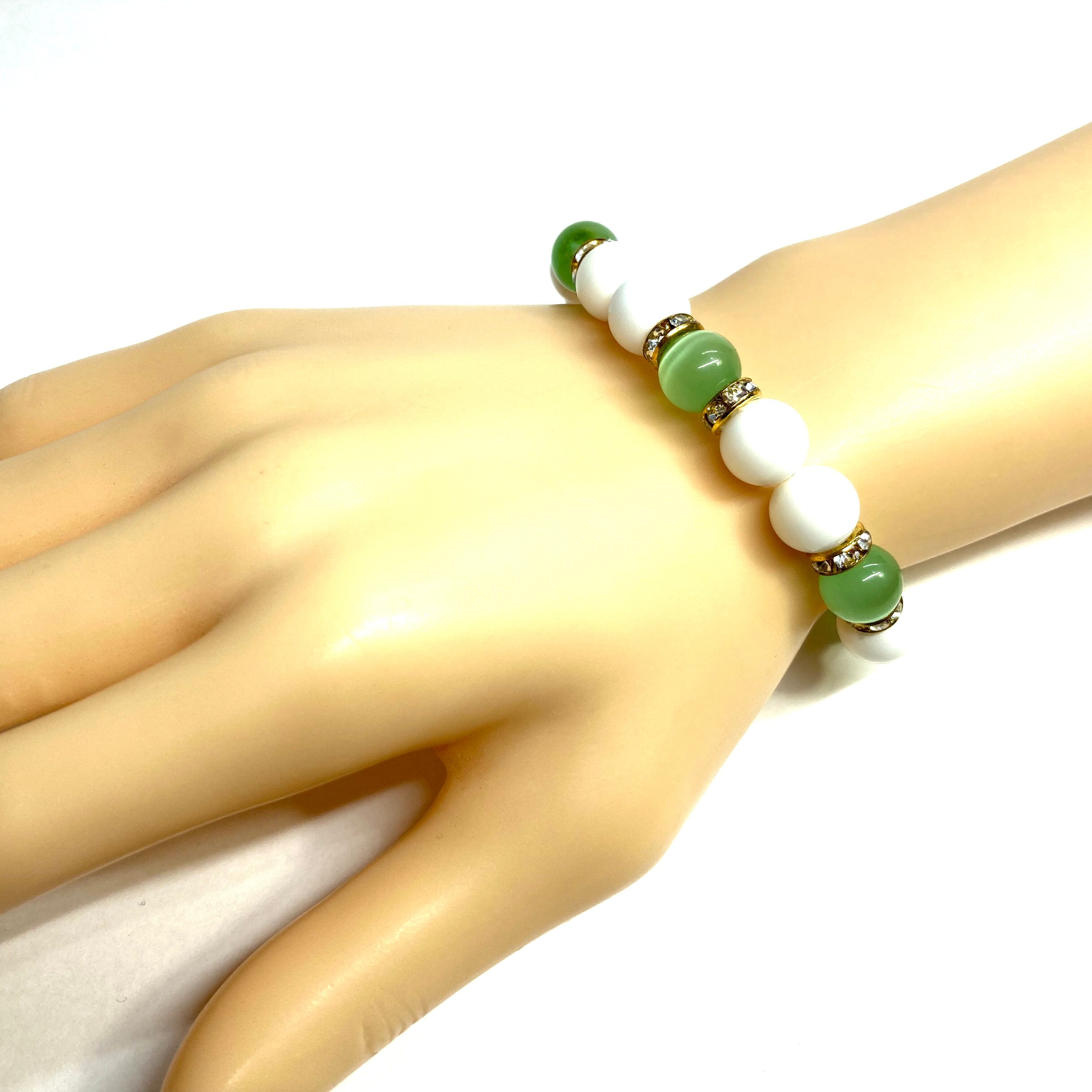 こちらは、キャッツアイとホワイトオニキスを組み合わせたブレスレットです。間にはロンデルを挟み高級感あるデザインに仕上がっています。石大きさは腕にも馴染みやすいように10mm玉で内周約16cm(伸可能)です。数に限りがございますので気になる方はお早めにどうぞ。