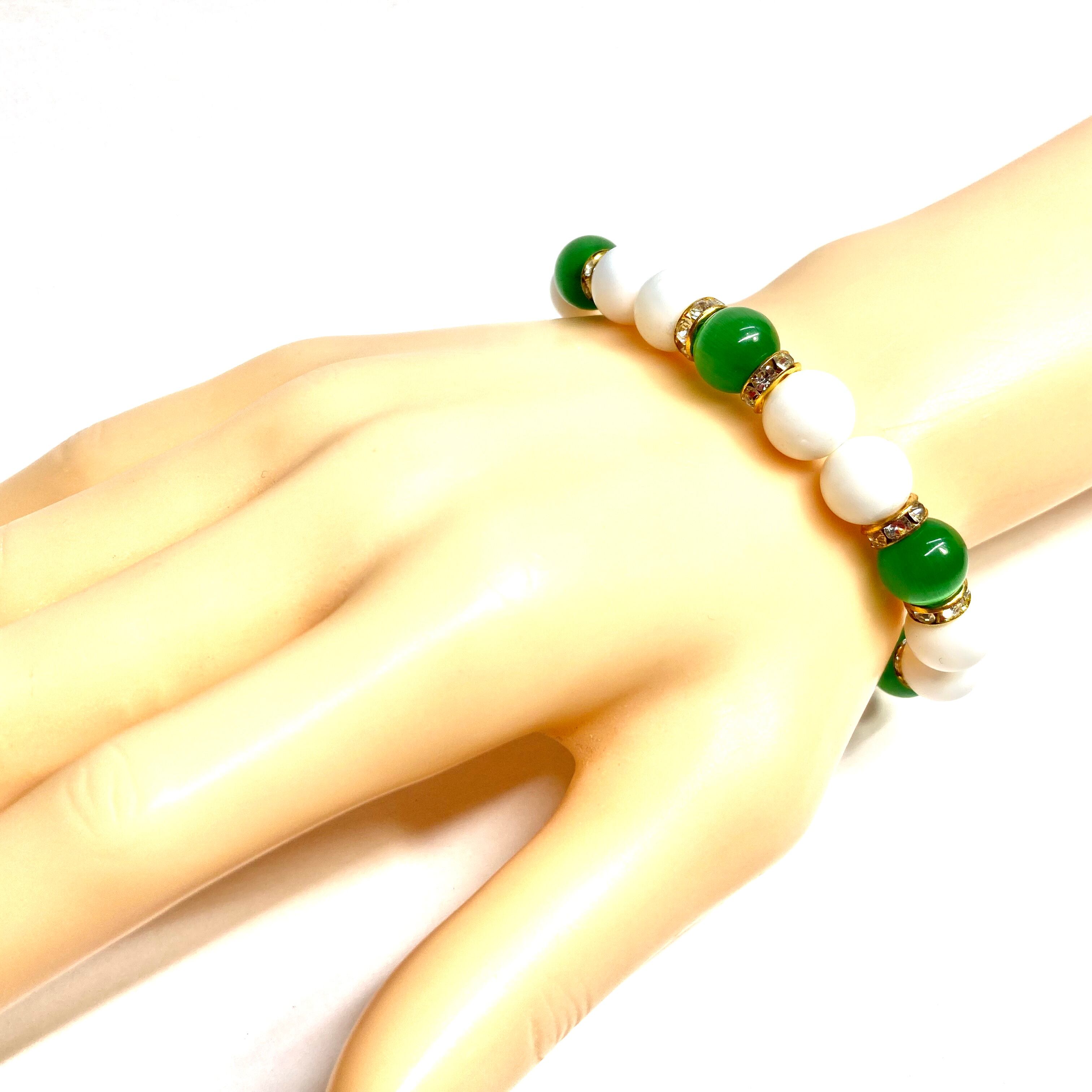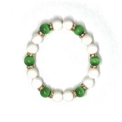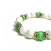 こちらは、キャッツアイとホワイトオニキスを組み合わせたブレスレットです。間にはロンデルを挟み高級感あるデザインに仕上がっています。石大きさは腕にも馴染みやすいように10mm玉で内周約16cm(伸可能)です。数に限りがございますので気になる方はお早めにどうぞ。