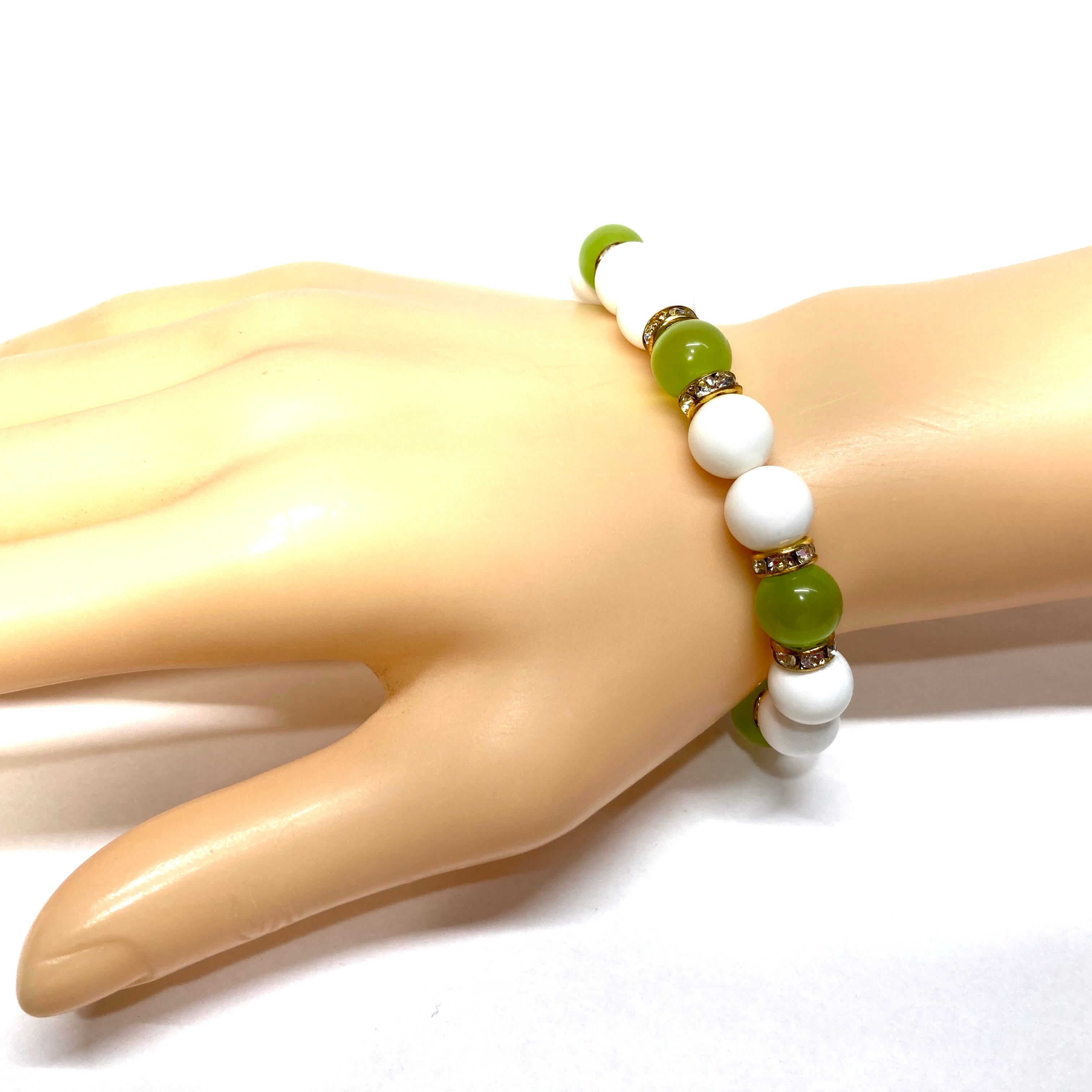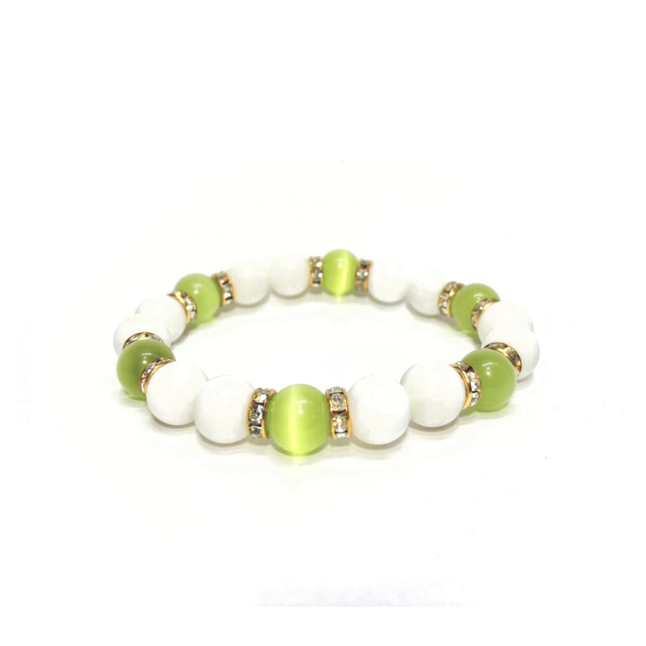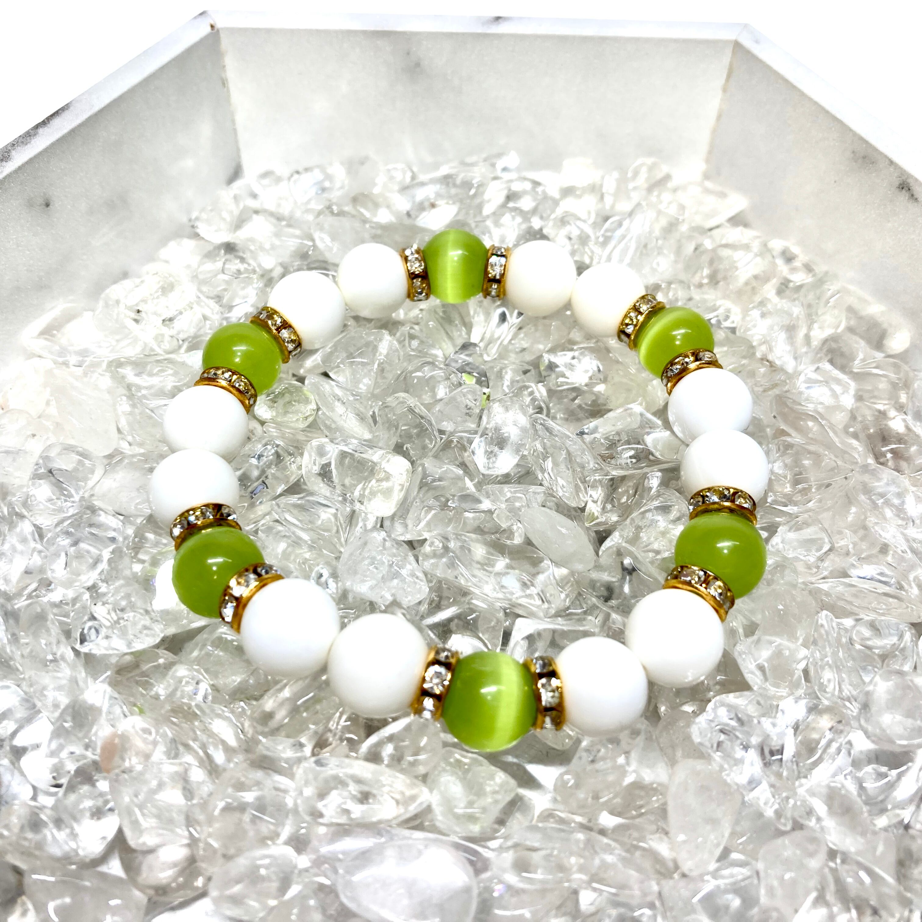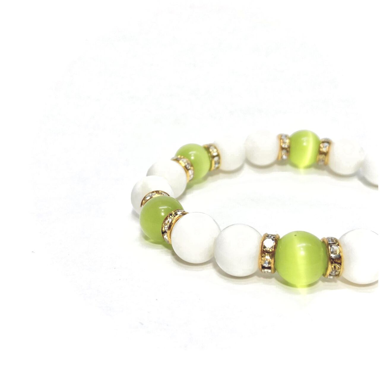 こちらは、キャッツアイとホワイトオニキスを組み合わせたブレスレットです。間にはロンデルを挟み高級感あるデザインに仕上がっています。石大きさは腕にも馴染みやすいように10mm玉で内周約16cm(伸可能)です。数に限りがございますので気になる方はお早めにどうぞ。