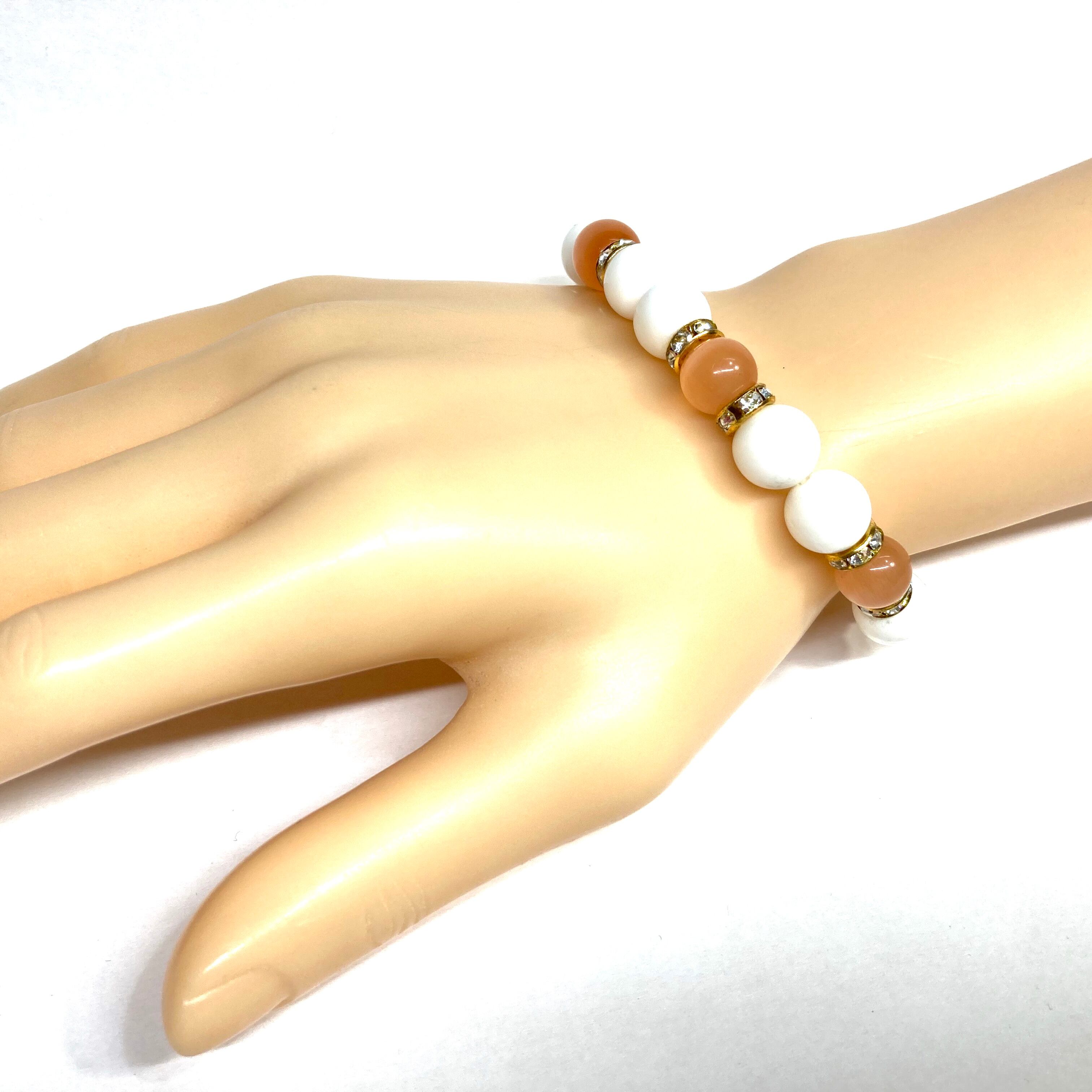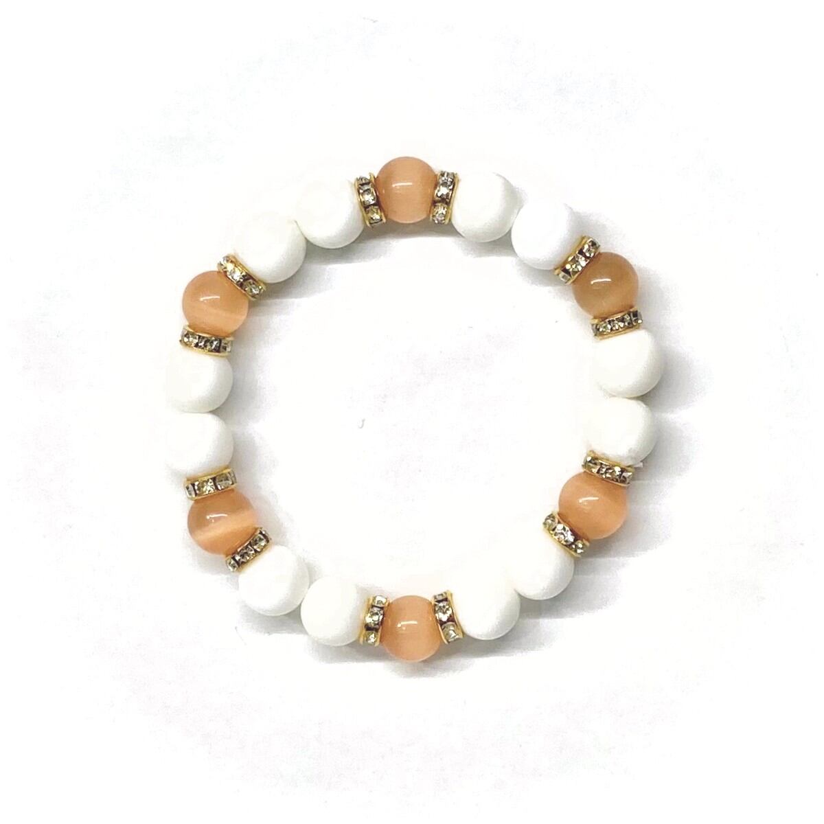 こちらは、キャッツアイとホワイトオニキスを組み合わせたブレスレットです。間にはロンデルを挟み高級感あるデザインに仕上がっています。石大きさは腕にも馴染みやすいように10mm玉で内周約16cm(伸可能)です。数に限りがございますので気になる方はお早めにどうぞ。