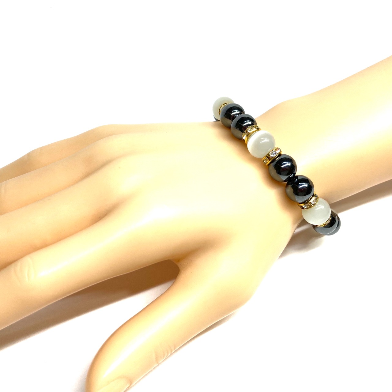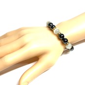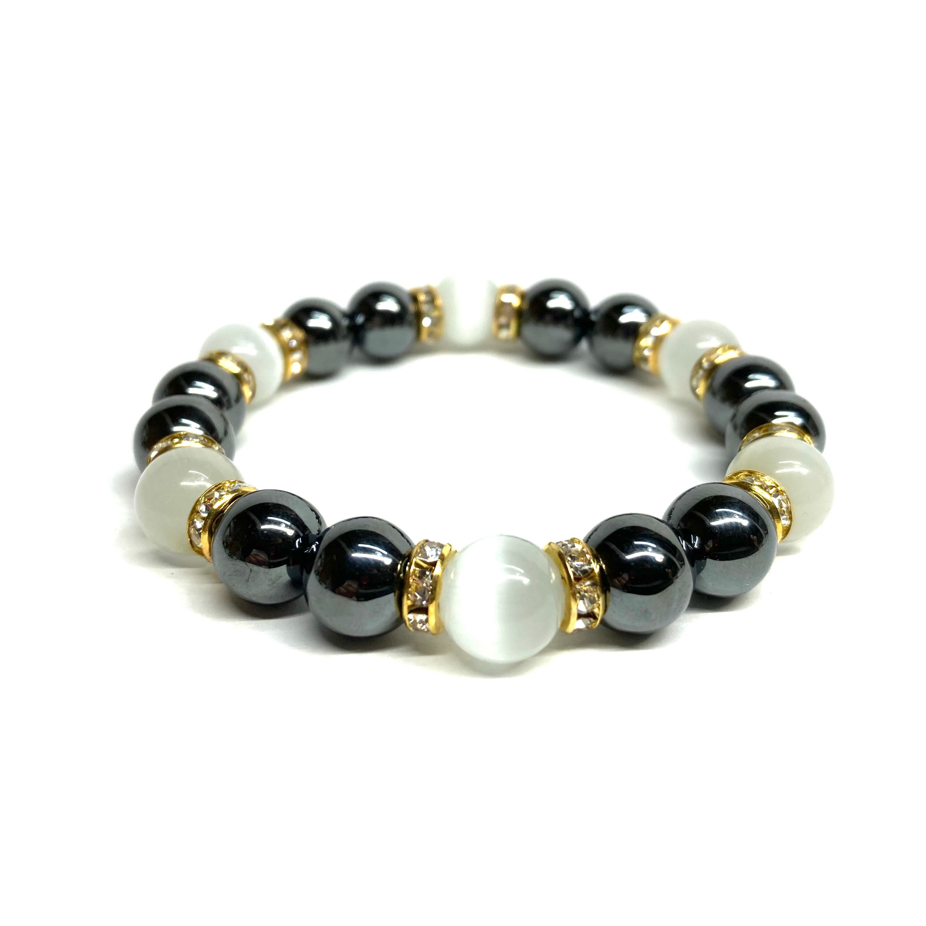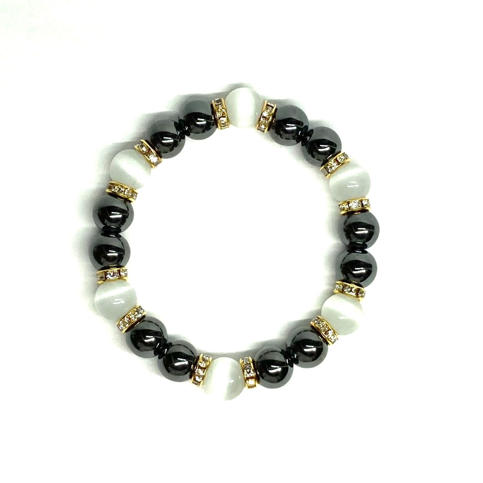 こちらは、キャッツアイとヘマタイトを組み合わせたブレスレットです。間にはロンデルを挟み高級感あるデザインに仕上がっています。石大きさは腕にも馴染みやすいように10mm玉で内周約16cm(伸可能)です。数に限りがございますので気になる方はお早めにどうぞ。