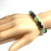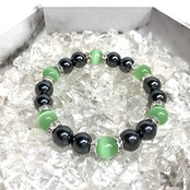 こちらは、キャッツアイとヘマタイトを組み合わせたブレスレットです。間にはロンデルを挟み高級感あるデザインに仕上がっています。石大きさは腕にも馴染みやすいように10mm玉で内周約16cm(伸可能)です。数に限りがございますので気になる方はお早めにどうぞ。